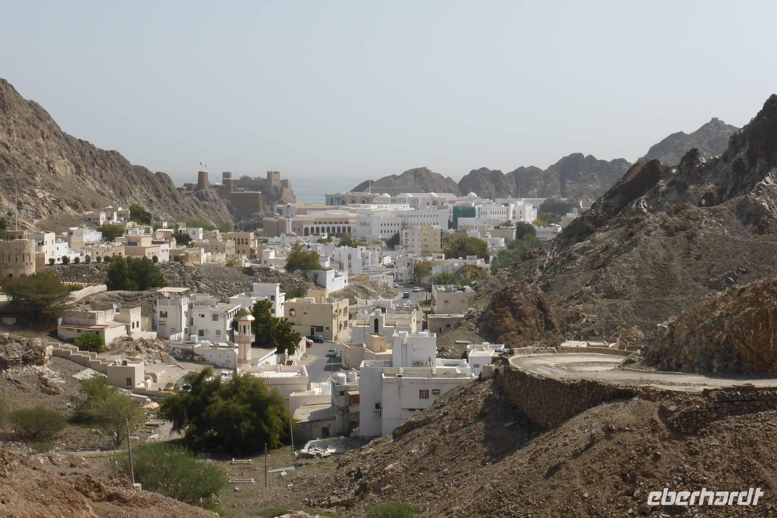 Der letzte Küstenort auf unserer heutigen Route heißt Quriyat. Hier rasten wir an einem schattigen Plätzchen am Strand für unser Mittagspicknick. Die Weiterfahrt nach Maskat führt uns nochmals durch eine beeindruckende Bergwelt mit dunklen Felsgestein. Kurz vor Maskat öffnen sich die Berge und ermöglichen einen weiten Blick auf die omanische Hauptstadt.
