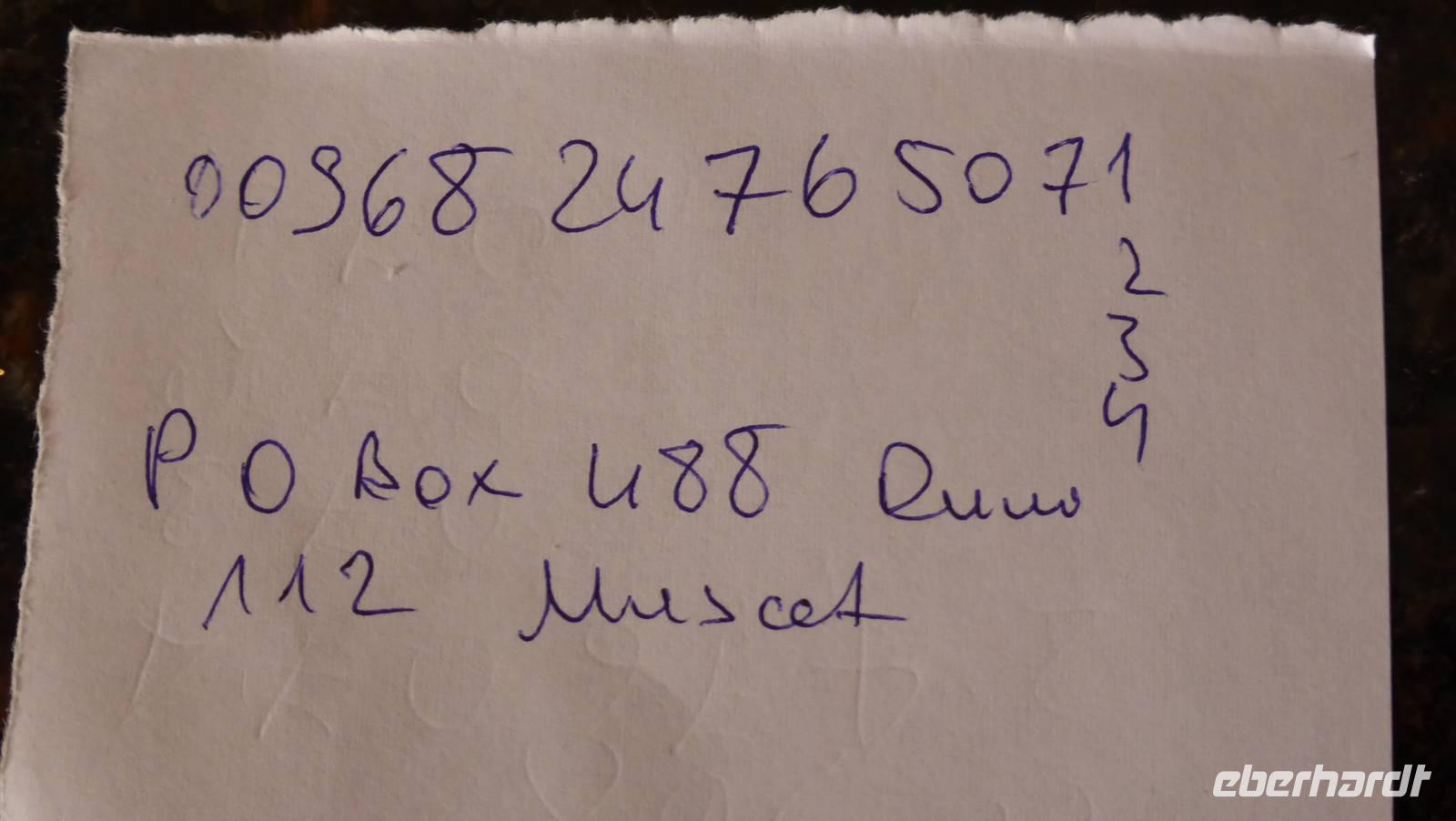 Das letzte Geld wird im Duty Free Shop in Schokodatteln umgewandelt und dann verlassen wir mit einem halben Tag Verspätung den Oman. Nach einem angenehmen Nonstopflug von 7,5 Stunden erwarten uns am Abend zwei Grad in Frankfurt. 30 Grad weniger als noch heute Mittag. In der Nacht erreichen wir schließlich unsere Heimatorte.