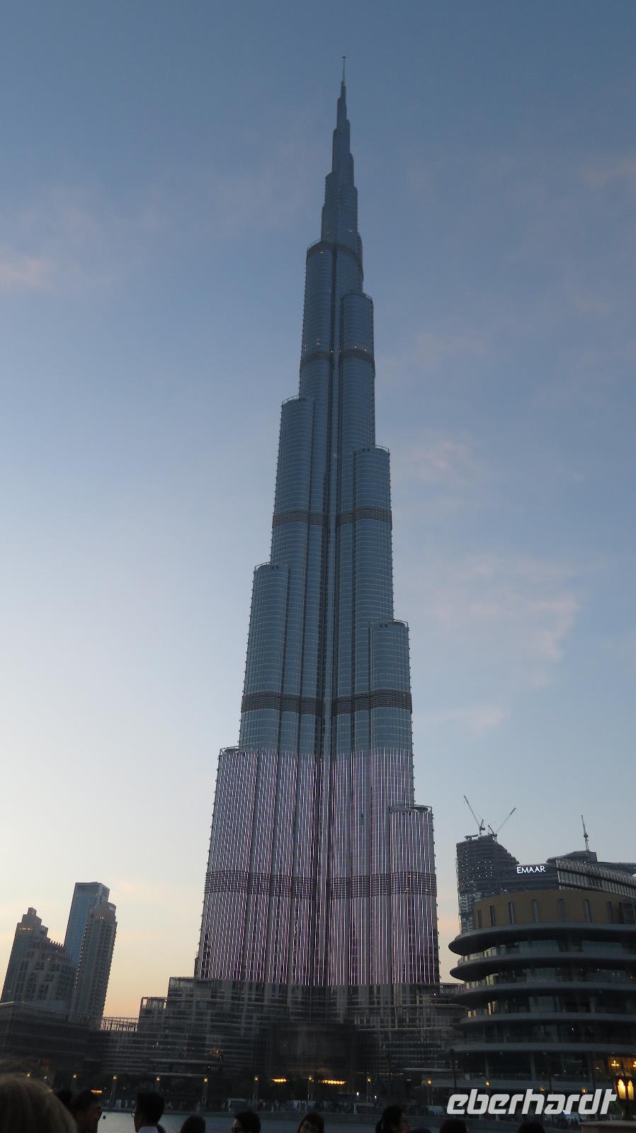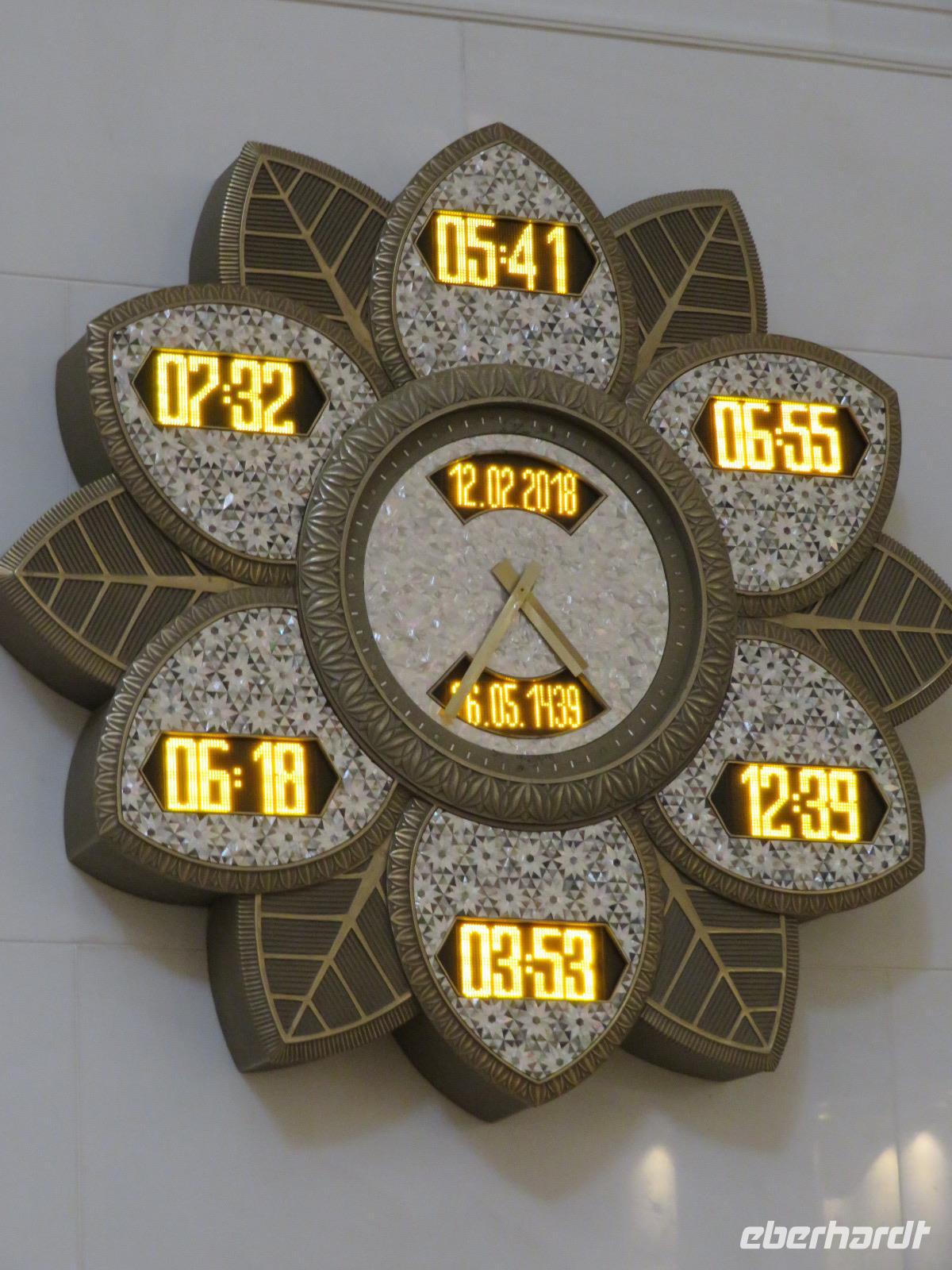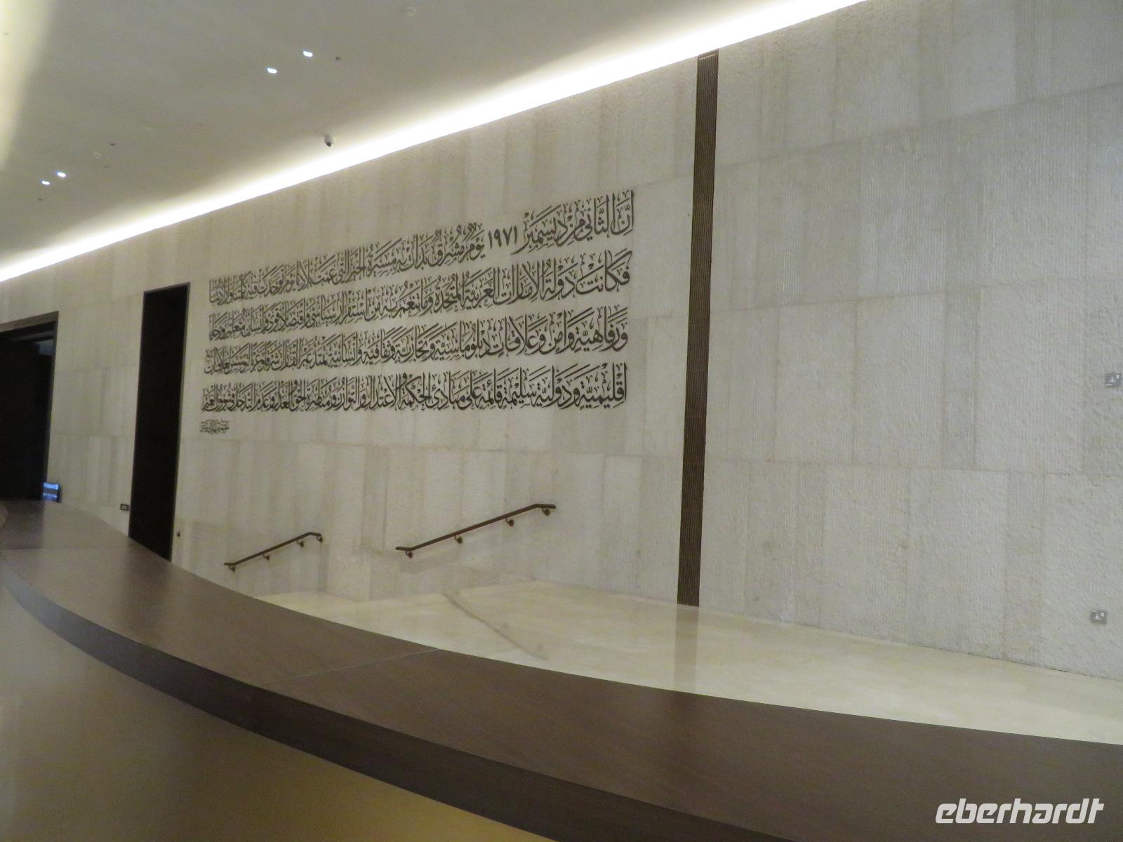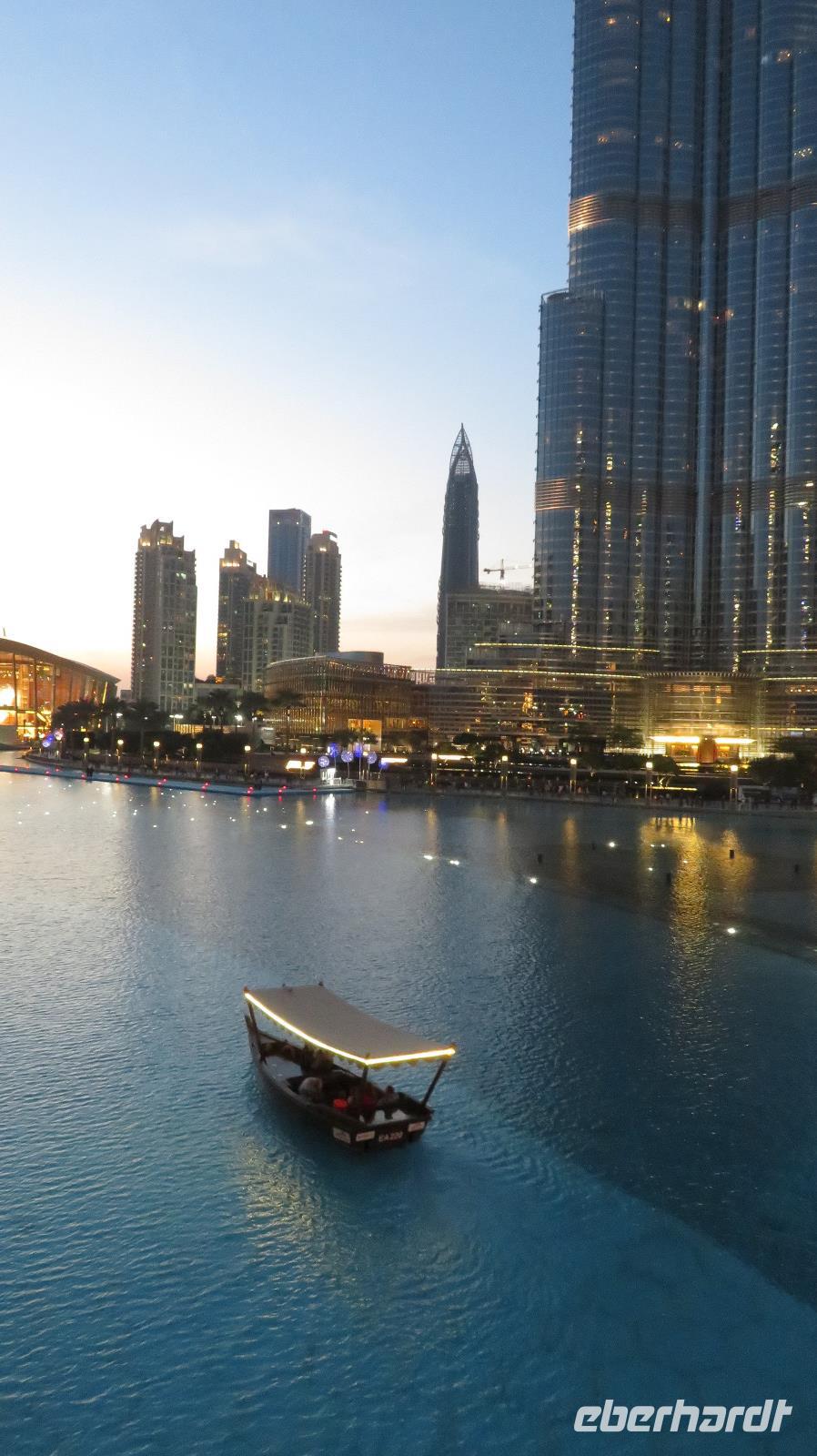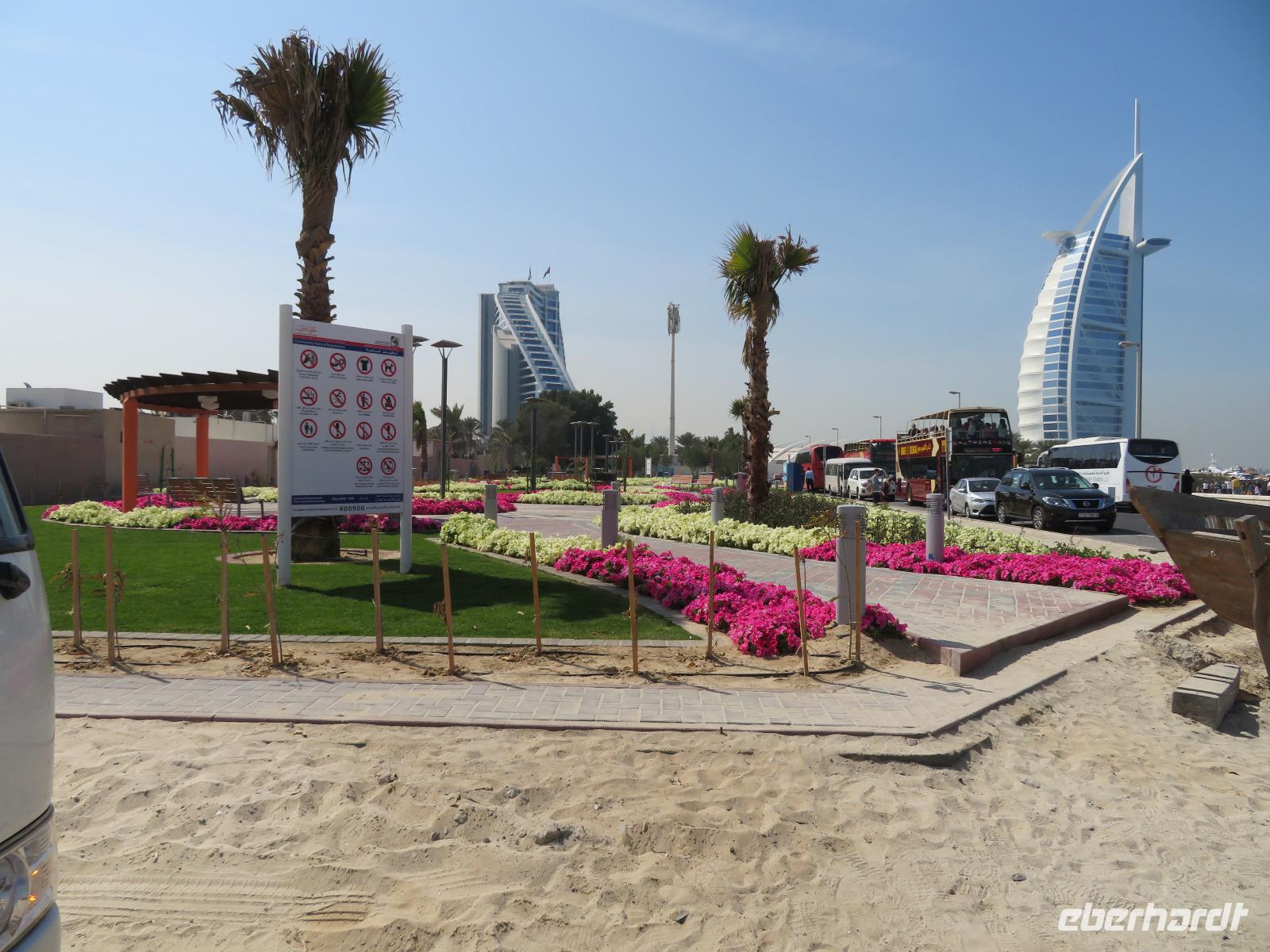Bereits der Morgen beginnt mit ein „bisschen Highlights", wie Ibrahim gerne zu pflegen sagt. Wir besichtigen das nagelneue Ethiad Museum, das die junge Geschichte der Arabischen Emirate aufarbeitet. Am 2. Dezember 1971 schlossen sich zunächst 6 Länder zu der Union zusammen: Dubai, Abu Dhabi, Sharjah, Ajman, Fujairah und Umm Al Quwain. Ein Jahr danach kam noch das Land Ras Al Khaimah dazu und der heute bekannte Bund war vollständig. Der erste Präsident, der gleichzeitig als „Vater der Nation" gilt, war Sheikh Zayed bin Sultan Al Nahyan bis zu seinem Tod im Jahre 2004. Es ist üblich, dass der Nachfolger blutsverwandt mit dem vorherigen Herrscher ist, der erste Anwärter ist immer der älteste Sohn. Das Museum ist mit vielen interaktiven Details ausgestattet und die Architektur des Gebäudes soll an den Vertrag und die sieben Stifte erinnern, die damals verwendet wurden. Unsere Reise geht weiter durch eine der teuersten Wohngegenden, dem Stadtteil Jumeirah. Hier steht auch die gleichnamige Moschee, die auch Nichtmuslime an 6 Tagen der Woche besuchen können um einen Eindruck von der islamischen Religion zu erhalten. Wir machen hier nur einen Fotostopp bevor wir weiter zum Jumeirah Strand fahren. Schon von weitem können wir das Luxushotel Burj Al Arab erblicken. Die Form des Dhaw-Segel ist genauso spektakulär wie die Preise des Hotels. Somit bleibt das Hotel ein Traum und wir fahren anschließend anstatt mit dem Bus mit der eigens für die Palmeninsel geschaffenen Eisenbahn entlang des Stamms bis zu der Endstation an der das Atlantis Hotel erbaut wurde. Die extravagante Palmeninsel „The Palm Jumeirah" ist die größte künstlich erschaffene Insel der Welt. Nach einem kurzen Aufenthalt im extravaganten Stadtteil Dubai Marina, begeben wir uns zu der wohl spannendsten Einkaufsmeile der Welt. Der Dubai Mall. Neben 350.000qm ² Verkaufsfläche bietet die Einkaufshalle die Möglichkeit zum Skifahren und auch zum Besuch des Aquariums. Unglaublich, aber wahr. In Dubai gibt es nichts, was es nicht gibt. Der nächste Programmpunkt ist ebenfalls ein Highlight, wir fahren auf den 828m hohen Wolkenkratzer, das höchste Gebäude der Welt. Während wir zu Abend essen können wir die faszinierenden Wasserspiele, wie auch die Lichterspiele auf dem Burj Khalifa bestaunen. Ein ereignisreicher Tag geht zu Ende.