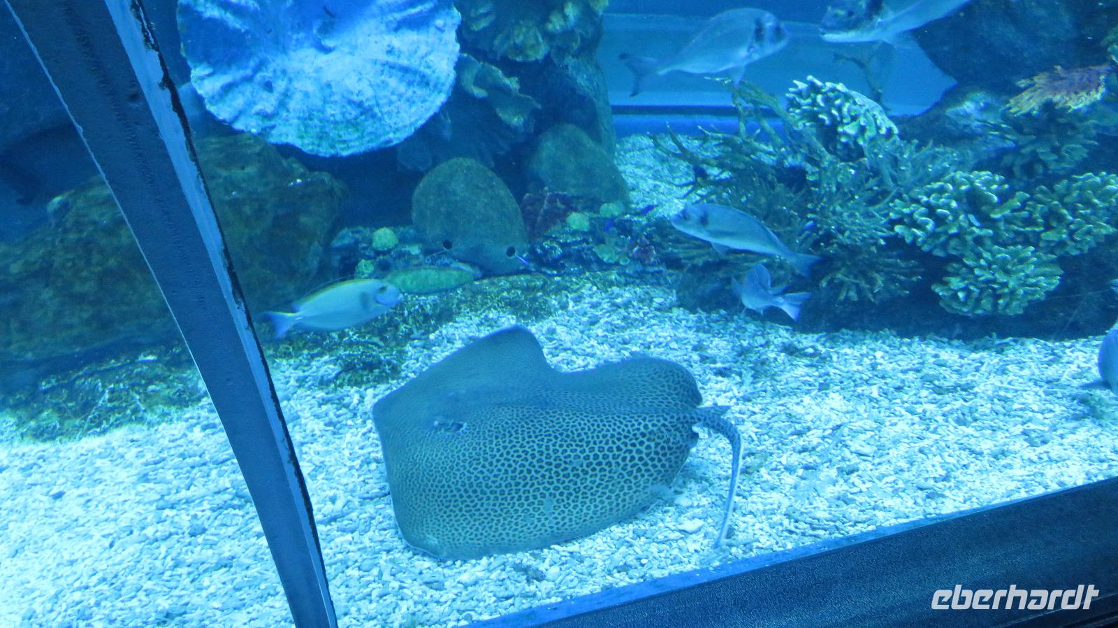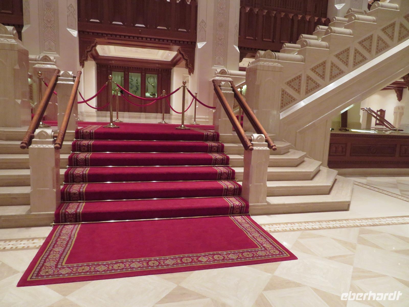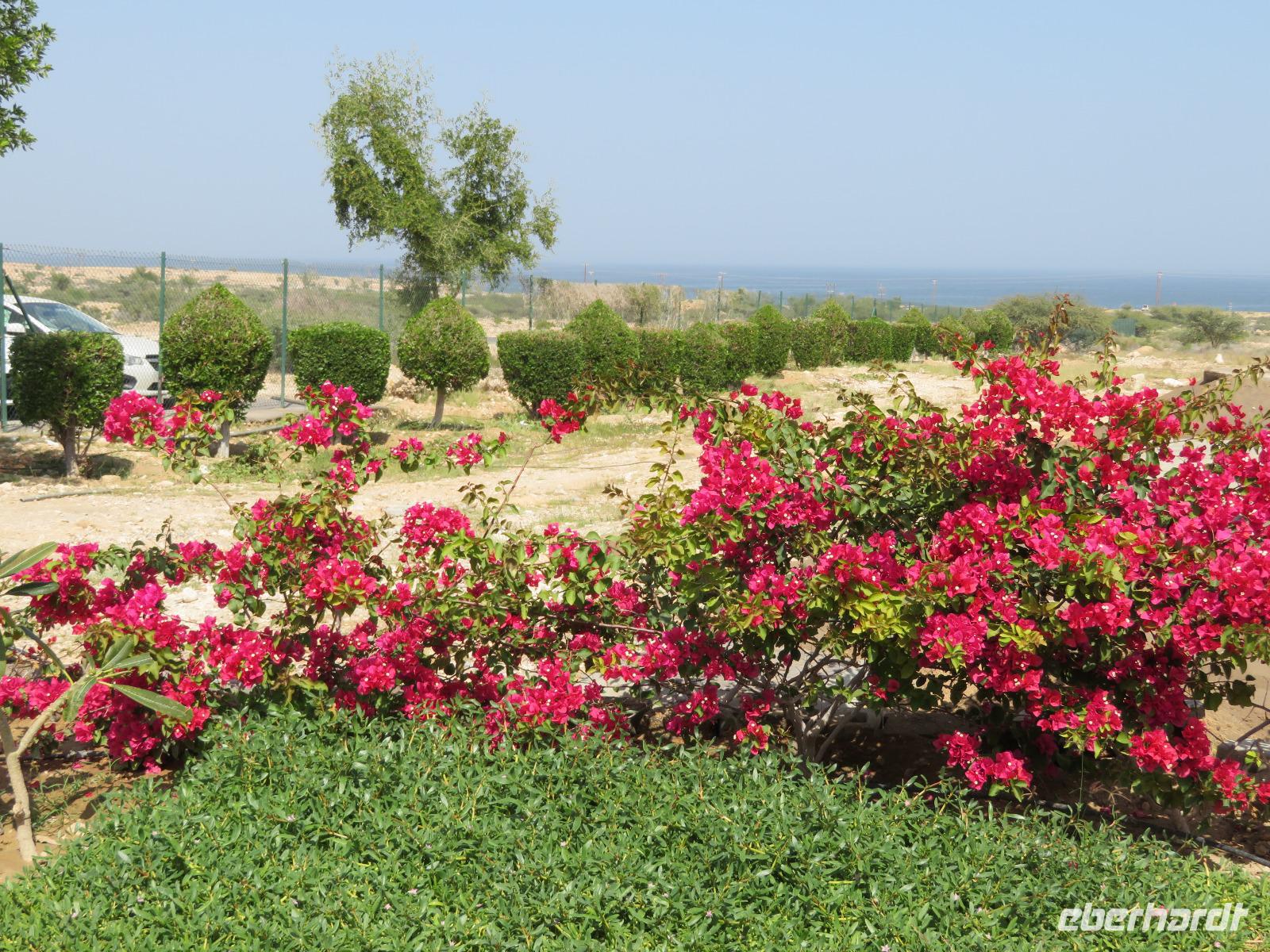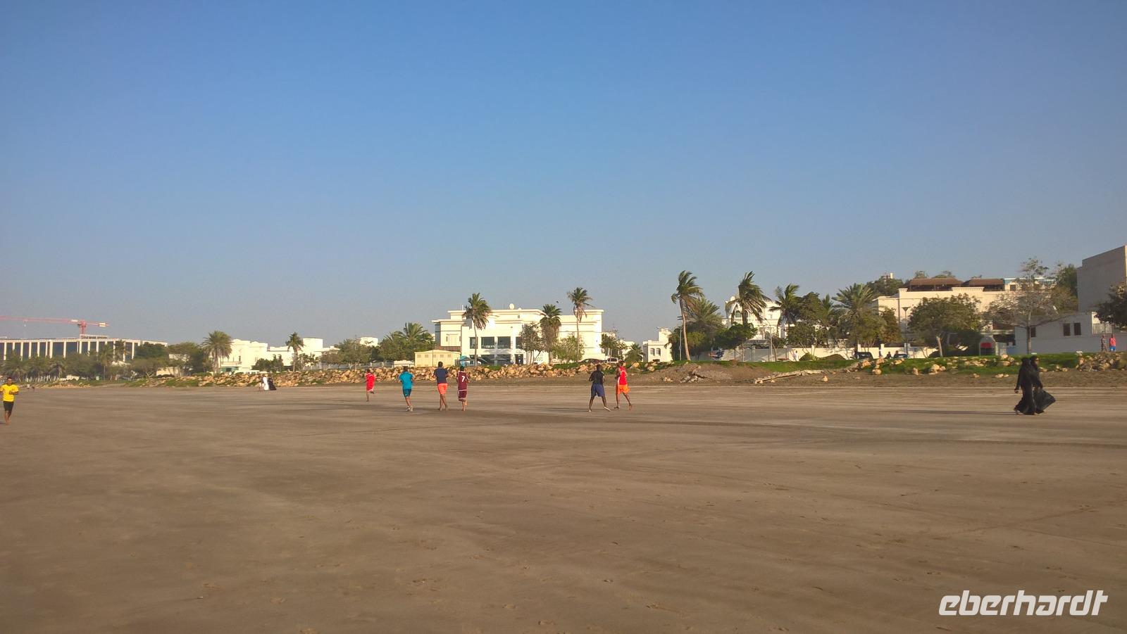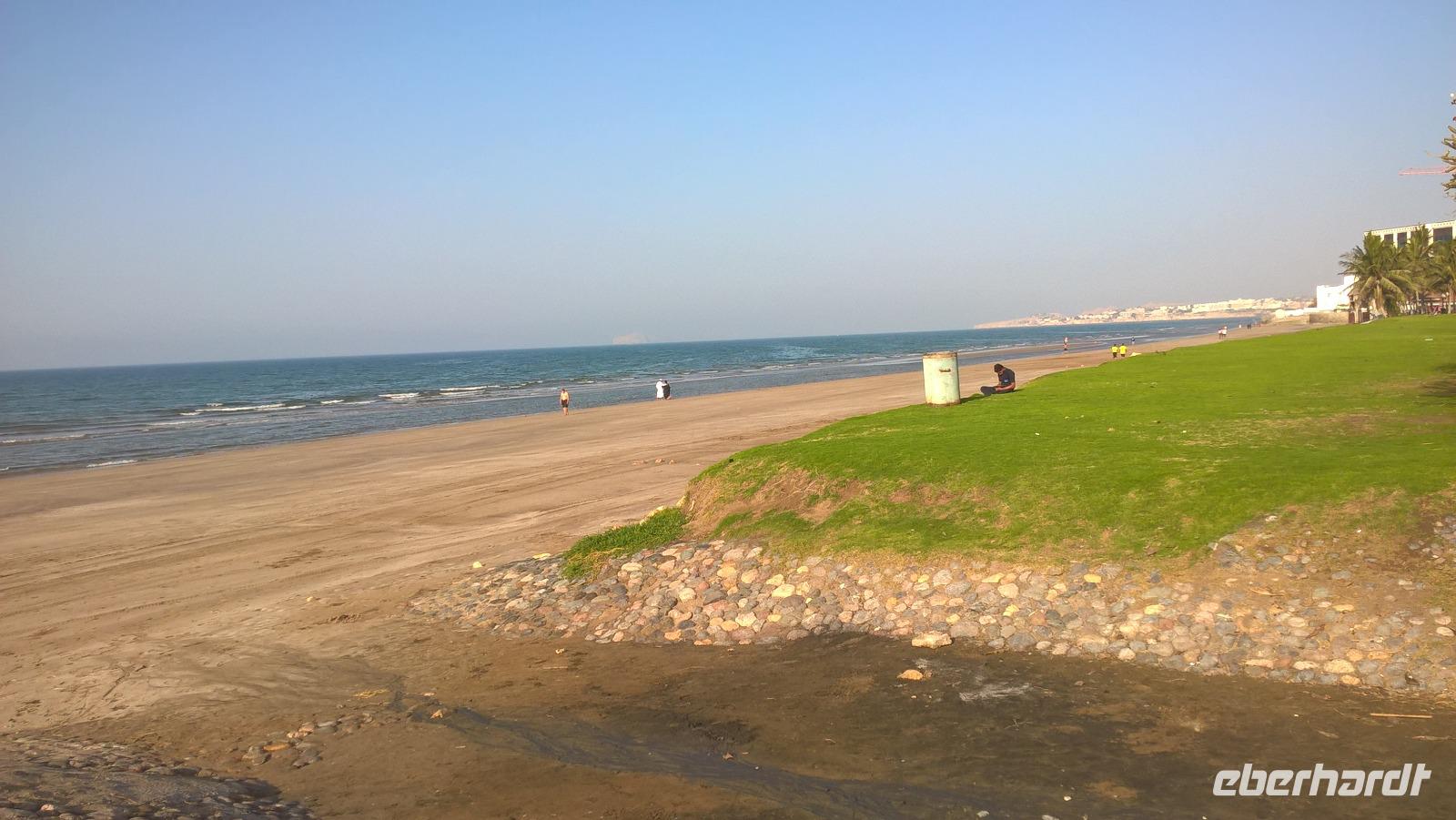 Heute steht zunächst die Besichtigung der berühmten Sultan Qaboos Moschee an. Auf einer Fläche von 416.000 Quadratmetern finden insgesamt etwa 20.000 Gläubige des Korans Platz. Die Bauzeit betrug 6 Jahre und endete im Jahr 2001. Die insgesamt fünf Minarette der Moschee stehen für die fünf Säulen des Islams. Diese bestehen aus dem Glaubensbekenntnis, dem Gebet, dem Fasten, der sozialen Pflichtabgabe und der Pilgerfahrt nach Mekka. Die Moschee wirkt schlichter als die bereits von uns besuchte Scheich-Zayid-Moschee. Alles ist grün bepflanzt und geschmückt mit bunten Blumen. Wir verlassen Muscat und kommen genau zur richtigen Zeit in Barka an um den traditionellen Fischmarkt zu besuchen. Die Fische liegen aufgebahrt zum Verkauf bereit. Nebenan wird Obst und Gemüse verkauft. Am Fuße des Jebel-Nakhl-Massivs liegt das gleichnamige Örtchen Nakhl. Im Deutschen bedeutet Nakhl Dattelpalmen, was passend ist für diesen Ort. Inmitten der Dattelpalmen ragt die Festung hervor. Diese wurde um den Felsen herum erbaut und Teile des Felsens sind immer noch freigelegt. Der Blick auf die oberste Etage wird durch einen weiten Blick auf die Dattelplantage entlohnt. Wir legen eine letzte Ruhephase bei den heißen Quellen Ain A'Thawwarah im Wadi Hammam ein, bevor wir zurück nach Muscat fahren. Den Wunsch der Gäste noch einen Spaziergang am Strand zu unternehmen gehen wir natürlich nach. Am schönen Strand von Qurum lauschen wir dem Meer und spüren den Sand unter unseren Füßen. Der Tag endet mit einer Überraschung. Unser Abendessen nehmen wir im Hyatt Hotel ein, hier können wir auch noch ein kühles Bier neben dem Essen genießen ;)