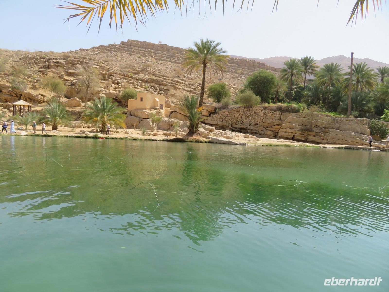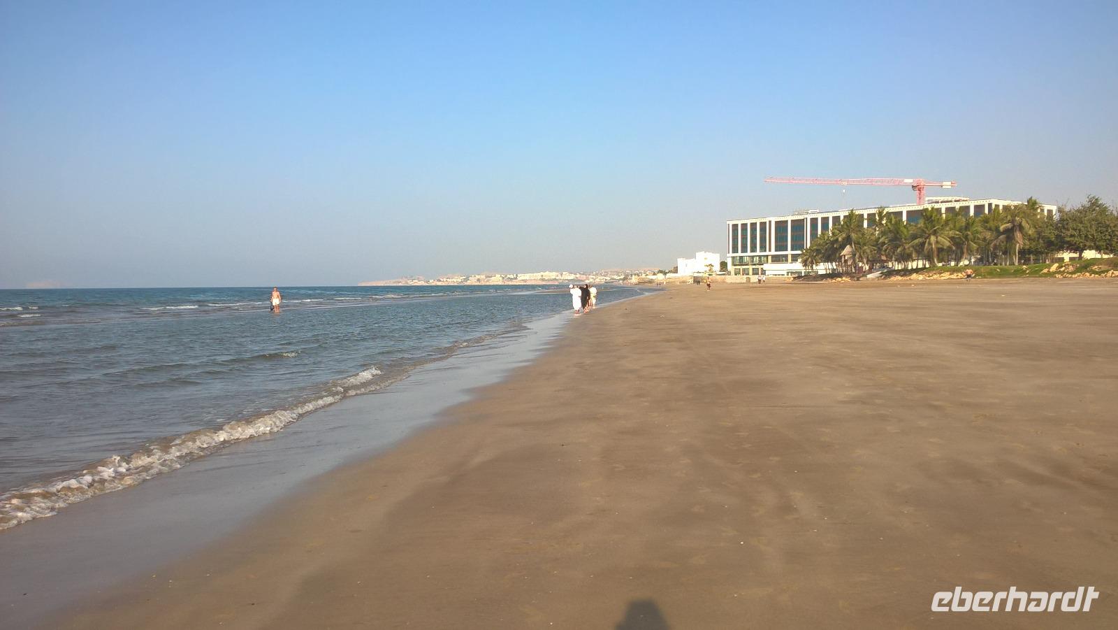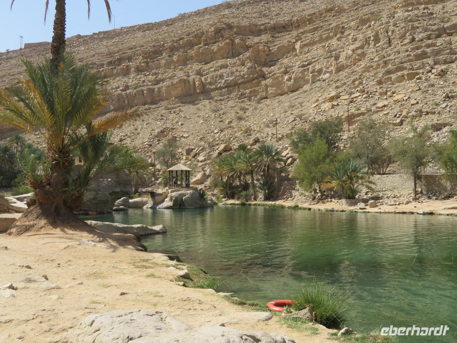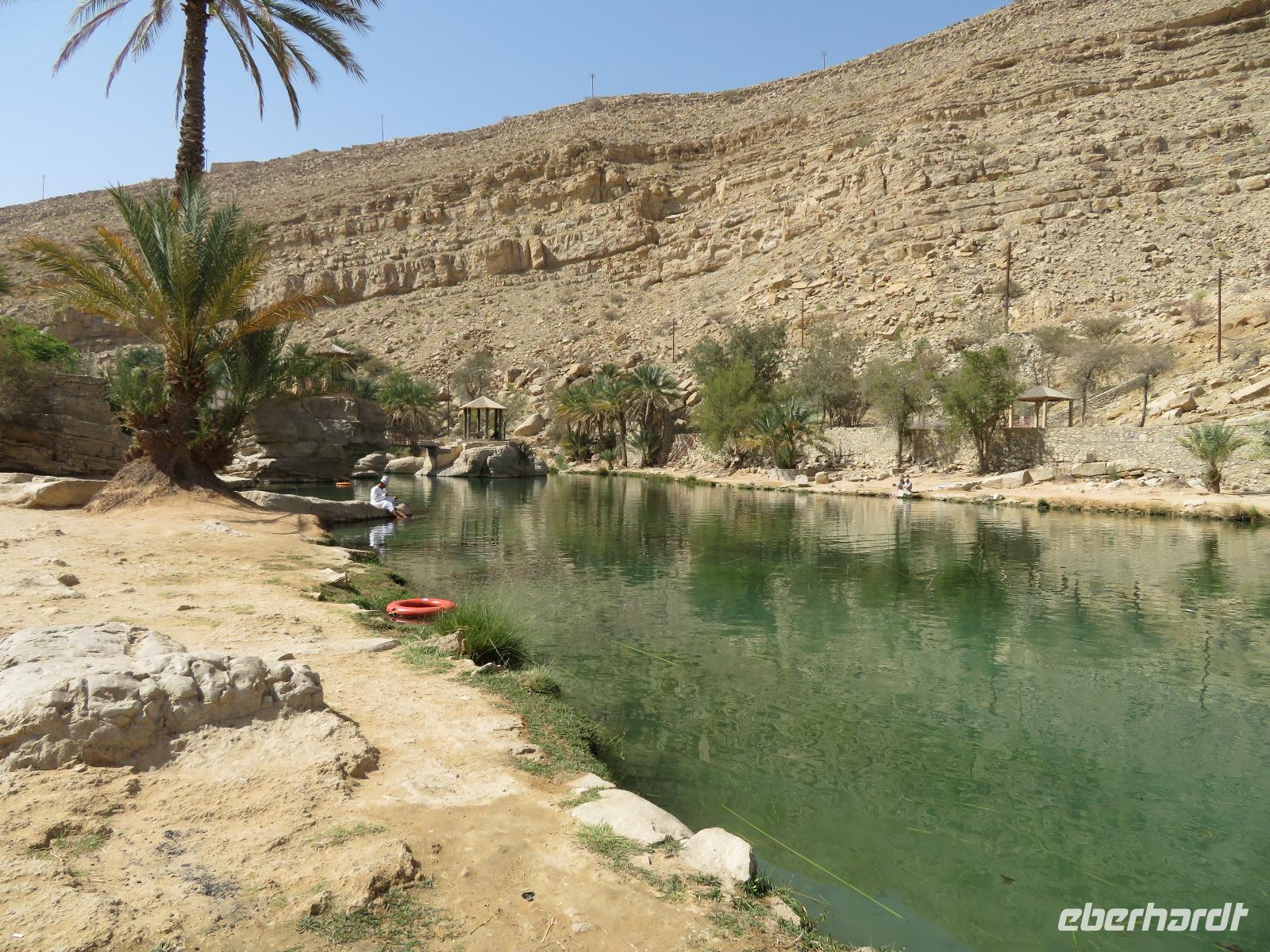 Der Morgen in der Wüste beginnt früh, denn einige der Gäste wollen sich einen kleinen Traum erfüllen und einen Kamelritt wagen. Nach einigen Anfangsschwierigkeiten sitzen sie auf dem Rücken der Trampeltiere. Da es bereits am Morgen sehr warm ist kommt uns der erste Programmunkt des Tages gerade recht. Mit den modernen Jeeps fahren wir zum Wadi Bani Khalid, dem bekanntesten Wadi im Oman. Nachdem wir am Ende des Pfades angelangt sind erwartet uns das Paradies. Wir erblicken einen malerischen türkisblauen See umrahmt von Palmen, der zum Baden einlädt. Außerdem ist die Pediküre an diesem See ebenso kostenlos, die Fische in dem See knabbern an den Füßen, welche anschließend babyweich sind ;) Einige nutzen auch nur die Ruhe, um sich etwas zu erholen. Nach unserer Auszeit fahren wir weiter in die Hafenstadt Sur. Wir besichtigen eine Dhau-Werft, hier werden die Dhaus noch auf traditionelle Art und Weise erbaut. Für uns sieht das "Holzlager" der Werft etwas durcheinander aus, aber anscheinend haben die Handwerker einen Plan. Bzw. auch keinen Plan, Asa'd erzählt uns, dass es keinen Bauplan gibt sondern dieser von Familie zu Familie mündlich überliefert wird. Nach dem Abendessen im Hotel sind wir gespannt auf das besondere Naturschauspiel am Abend. Im Naturreservat Ras Al Junayz warten wir darauf, dass die Meeresschildkröten am Strand ankommen um Eier zu legen. Während wir darauf warten erfahren wir, dass die Meeresschildkröten die hier geboren wurden zum Eier legen auch wieder hier her kommen. Insgesamt tun sie das zwei- bis dreimal pro Jahr und machen anschließend eine Pause von etwa 3 Jahren. Von den ca. 100 Eiern die sie legen überleben aber nur 2-3 Babyschildkröten. Und dann ist es soweit, wir dürfen zum Strand und beobachten die riesige Meeresschildkröte. Aufgrund der Trockenheit des Sandes, legt diese leider keine Eier, aber die Sichtung der Schildkröte ist es trotzdem wert.