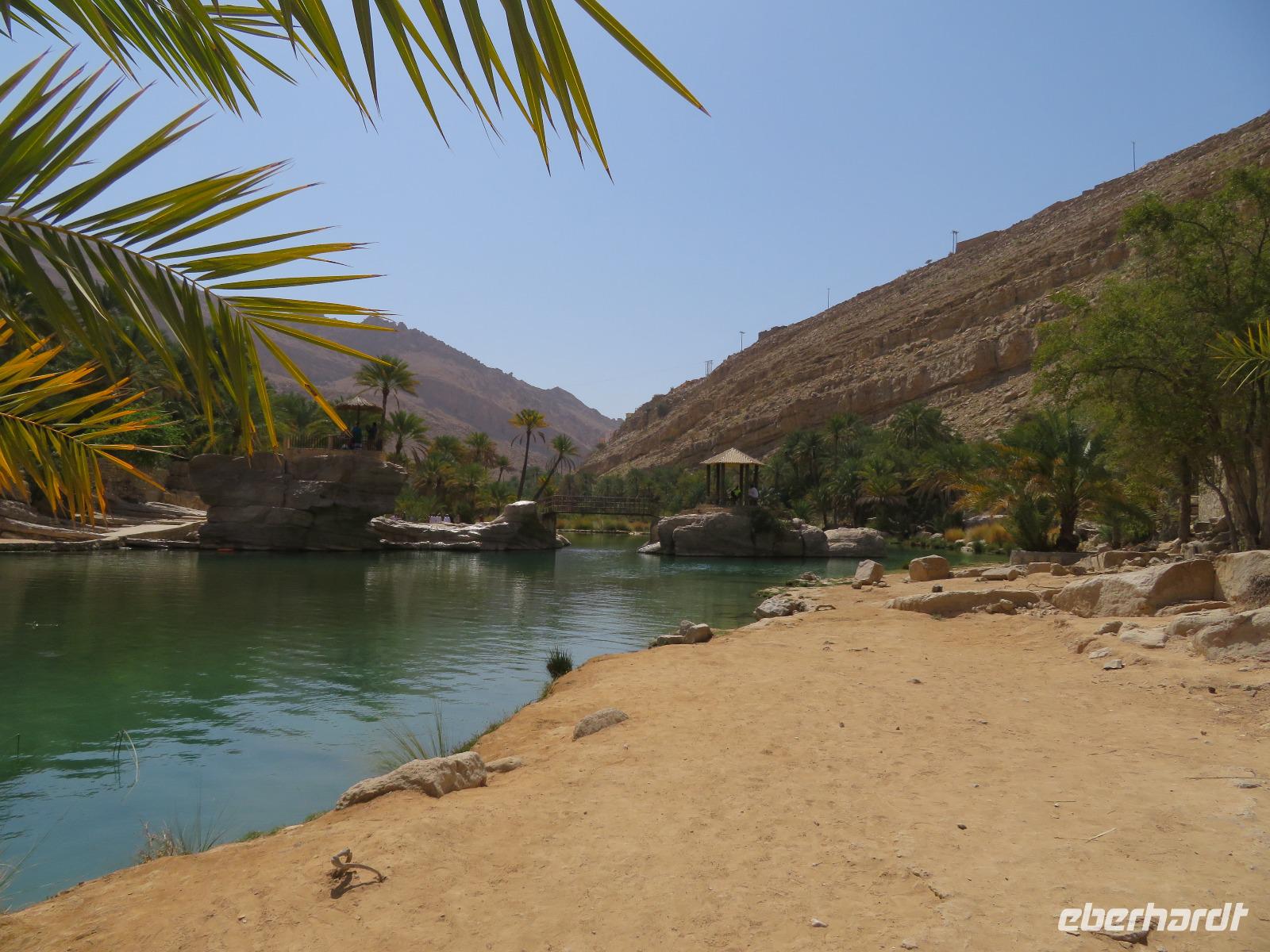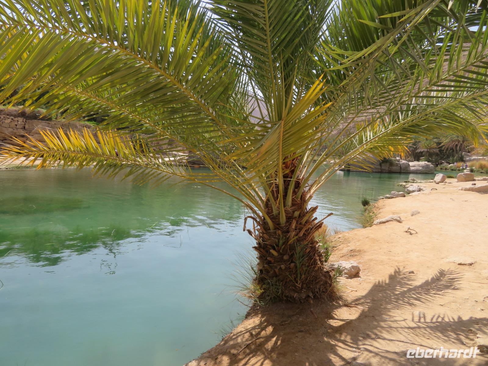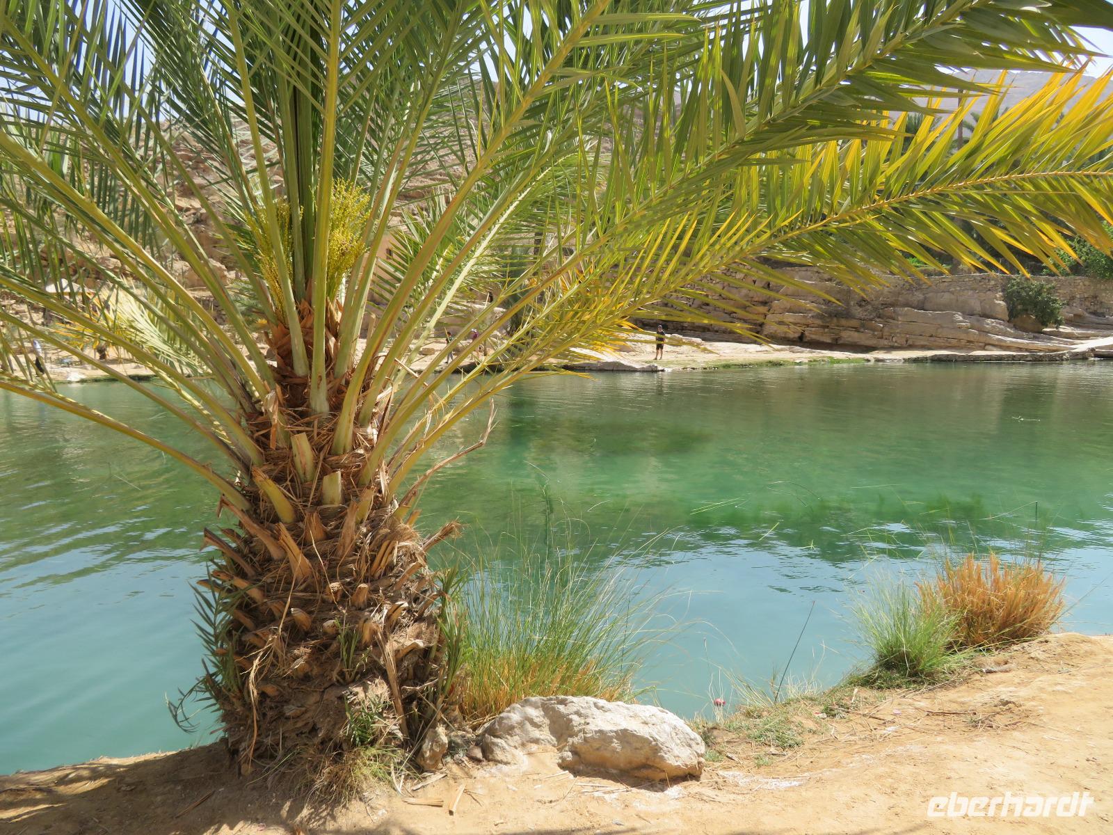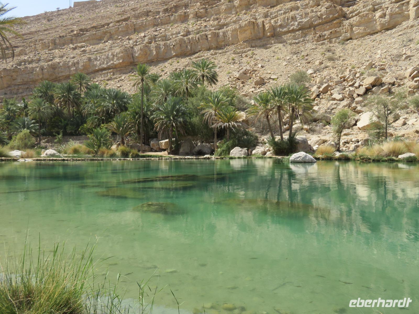 Der Morgen in der Wüste beginnt früh, denn einige der Gäste wollen sich einen kleinen Traum erfüllen und einen Kamelritt wagen. Nach einigen Anfangsschwierigkeiten sitzen sie auf dem Rücken der Trampeltiere. Da es bereits am Morgen sehr warm ist kommt uns der erste Programmunkt des Tages gerade recht. Mit den modernen Jeeps fahren wir zum Wadi Bani Khalid, dem bekanntesten Wadi im Oman. Nachdem wir am Ende des Pfades angelangt sind erwartet uns das Paradies. Wir erblicken einen malerischen türkisblauen See umrahmt von Palmen, der zum Baden einlädt. Außerdem ist die Pediküre an diesem See ebenso kostenlos, die Fische in dem See knabbern an den Füßen, welche anschließend babyweich sind ;) Einige nutzen auch nur die Ruhe, um sich etwas zu erholen. Nach unserer Auszeit fahren wir weiter in die Hafenstadt Sur. Wir besichtigen eine Dhau-Werft, hier werden die Dhaus noch auf traditionelle Art und Weise erbaut. Für uns sieht das "Holzlager" der Werft etwas durcheinander aus, aber anscheinend haben die Handwerker einen Plan. Bzw. auch keinen Plan, Asa'd erzählt uns, dass es keinen Bauplan gibt sondern dieser von Familie zu Familie mündlich überliefert wird. Nach dem Abendessen im Hotel sind wir gespannt auf das besondere Naturschauspiel am Abend. Im Naturreservat Ras Al Junayz warten wir darauf, dass die Meeresschildkröten am Strand ankommen um Eier zu legen. Während wir darauf warten erfahren wir, dass die Meeresschildkröten die hier geboren wurden zum Eier legen auch wieder hier her kommen. Insgesamt tun sie das zwei- bis dreimal pro Jahr und machen anschließend eine Pause von etwa 3 Jahren. Von den ca. 100 Eiern die sie legen überleben aber nur 2-3 Babyschildkröten. Und dann ist es soweit, wir dürfen zum Strand und beobachten die riesige Meeresschildkröte. Aufgrund der Trockenheit des Sandes, legt diese leider keine Eier, aber die Sichtung der Schildkröte ist es trotzdem wert.