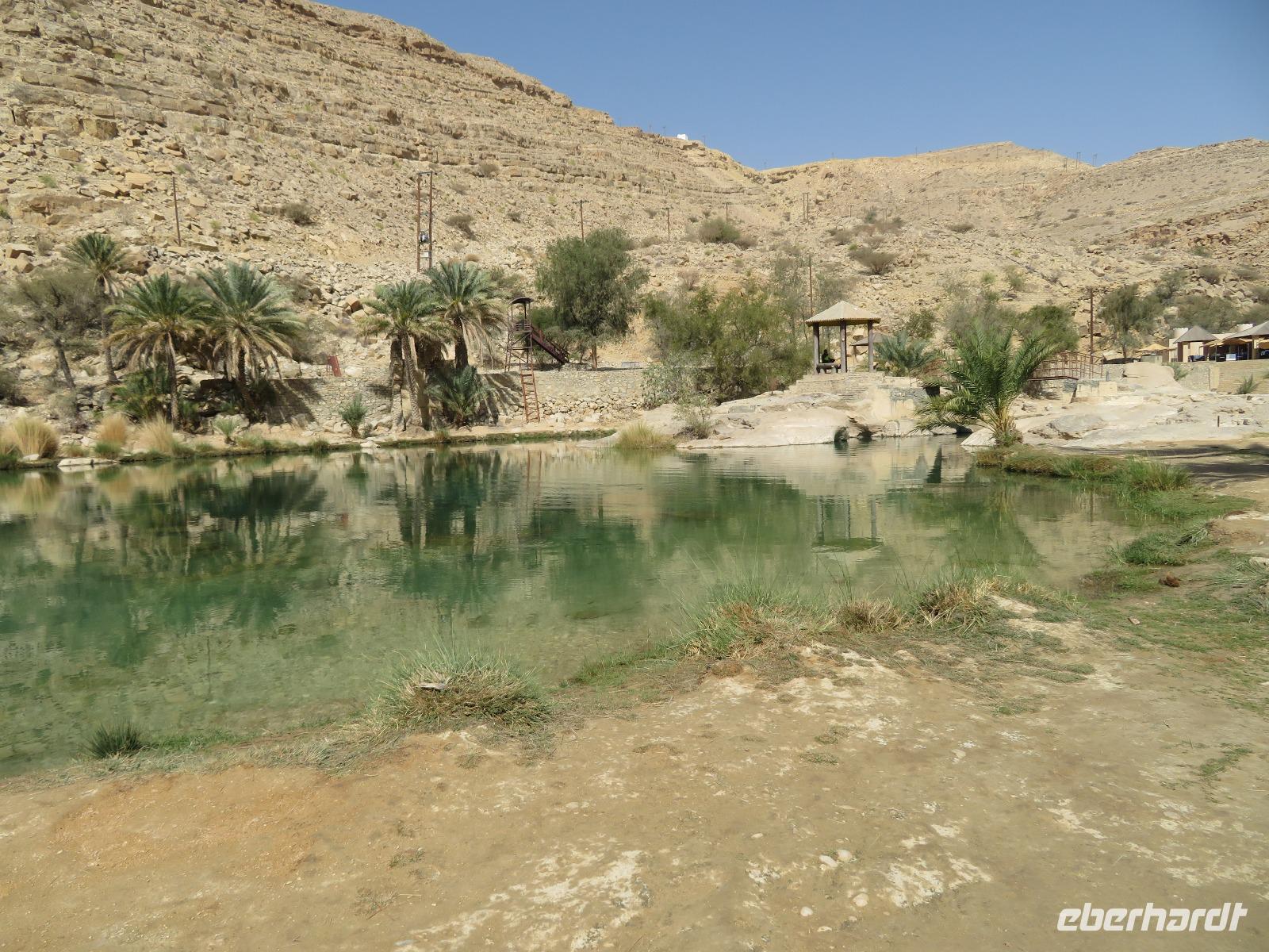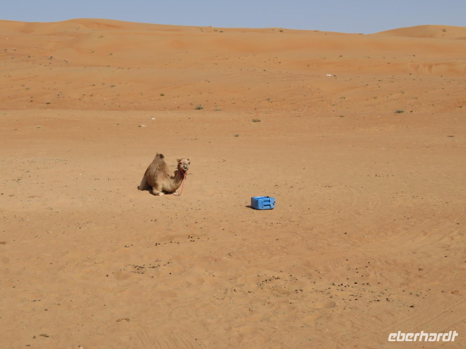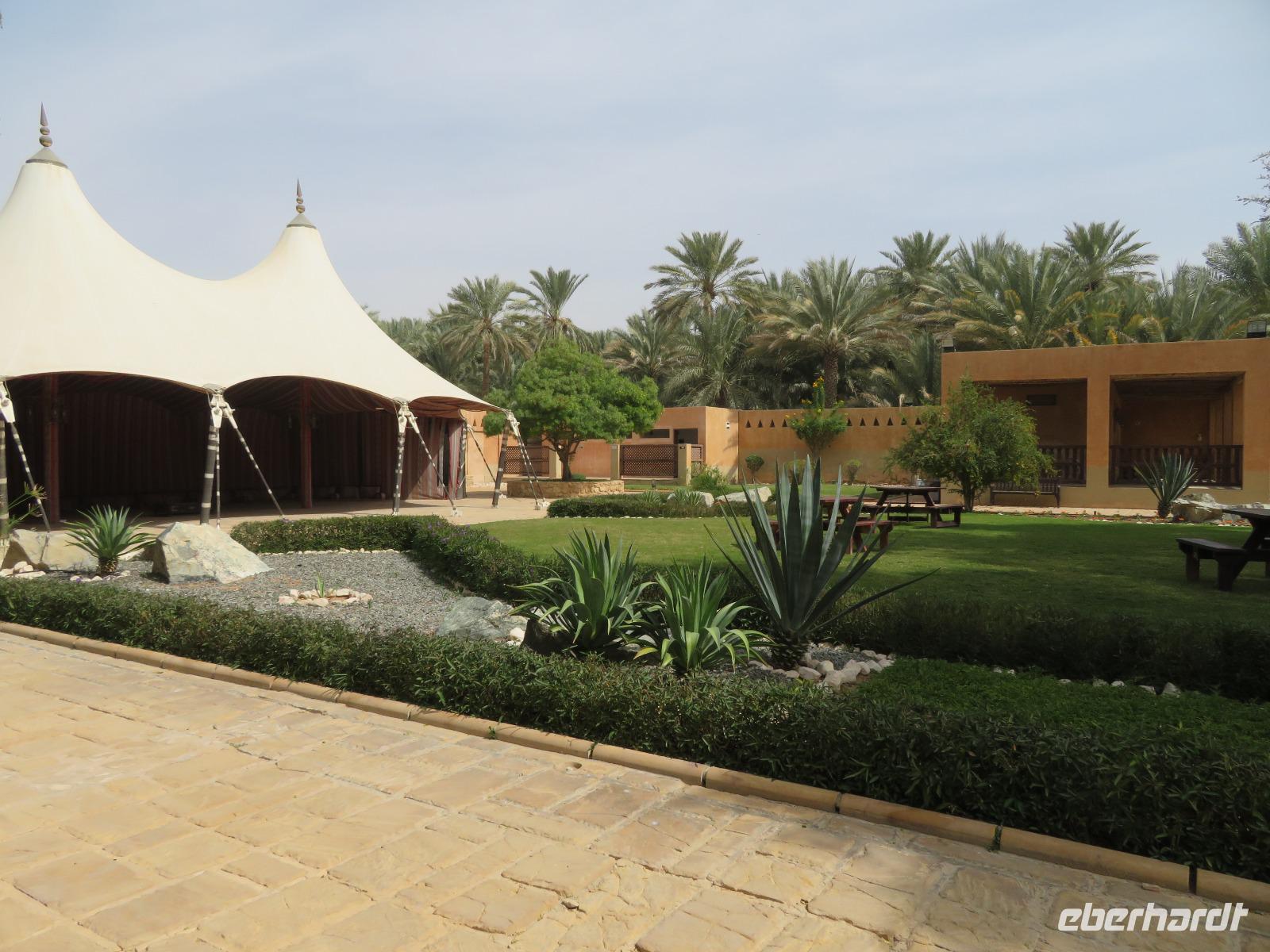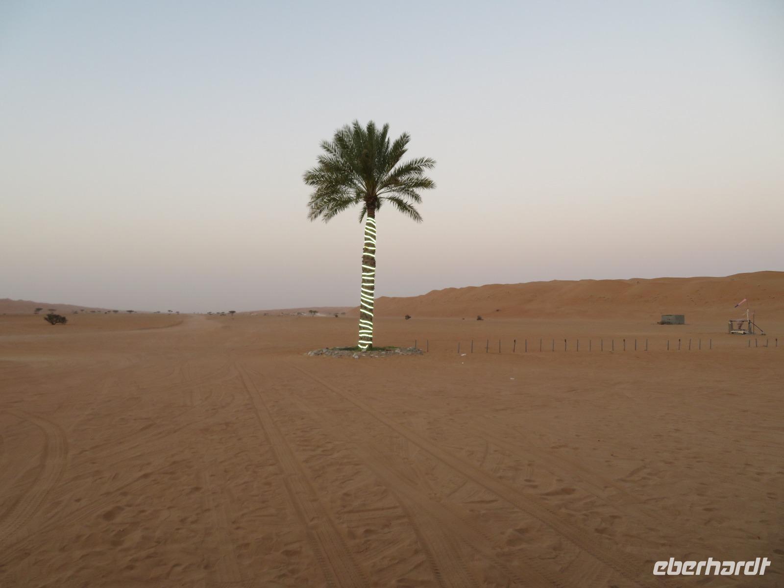 Der Morgen in der Wüste beginnt früh, denn einige der Gäste wollen sich einen kleinen Traum erfüllen und einen Kamelritt wagen. Nach einigen Anfangsschwierigkeiten sitzen sie auf dem Rücken der Trampeltiere. Da es bereits am Morgen sehr warm ist kommt uns der erste Programmunkt des Tages gerade recht. Mit den modernen Jeeps fahren wir zum Wadi Bani Khalid, dem bekanntesten Wadi im Oman. Nachdem wir am Ende des Pfades angelangt sind erwartet uns das Paradies. Wir erblicken einen malerischen türkisblauen See umrahmt von Palmen, der zum Baden einlädt. Außerdem ist die Pediküre an diesem See ebenso kostenlos, die Fische in dem See knabbern an den Füßen, welche anschließend babyweich sind ;) Einige nutzen auch nur die Ruhe, um sich etwas zu erholen. Nach unserer Auszeit fahren wir weiter in die Hafenstadt Sur. Wir besichtigen eine Dhau-Werft, hier werden die Dhaus noch auf traditionelle Art und Weise erbaut. Für uns sieht das "Holzlager" der Werft etwas durcheinander aus, aber anscheinend haben die Handwerker einen Plan. Bzw. auch keinen Plan, Asa'd erzählt uns, dass es keinen Bauplan gibt sondern dieser von Familie zu Familie mündlich überliefert wird. Nach dem Abendessen im Hotel sind wir gespannt auf das besondere Naturschauspiel am Abend. Im Naturreservat Ras Al Junayz warten wir darauf, dass die Meeresschildkröten am Strand ankommen um Eier zu legen. Während wir darauf warten erfahren wir, dass die Meeresschildkröten die hier geboren wurden zum Eier legen auch wieder hier her kommen. Insgesamt tun sie das zwei- bis dreimal pro Jahr und machen anschließend eine Pause von etwa 3 Jahren. Von den ca. 100 Eiern die sie legen überleben aber nur 2-3 Babyschildkröten. Und dann ist es soweit, wir dürfen zum Strand und beobachten die riesige Meeresschildkröte. Aufgrund der Trockenheit des Sandes, legt diese leider keine Eier, aber die Sichtung der Schildkröte ist es trotzdem wert.