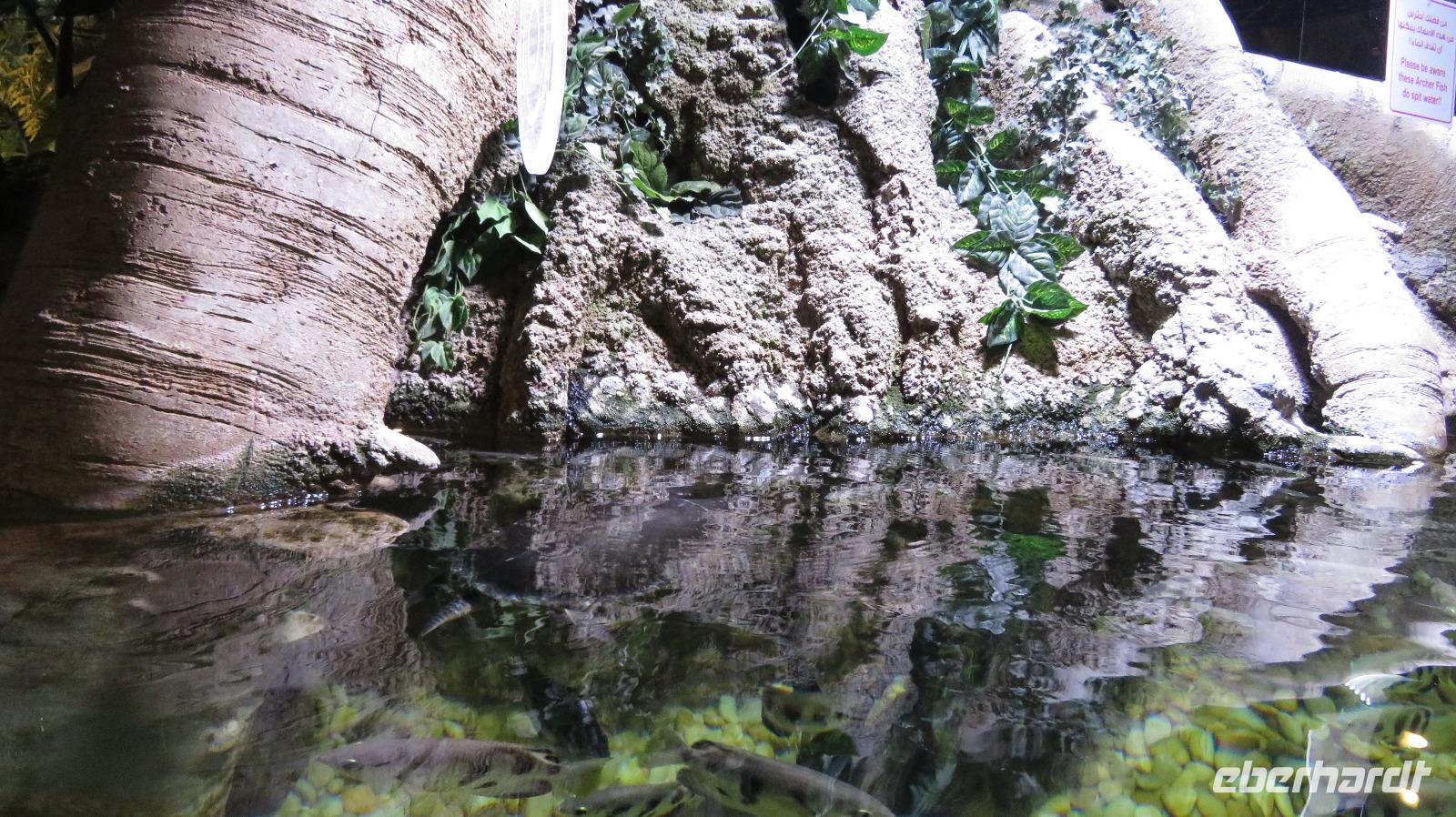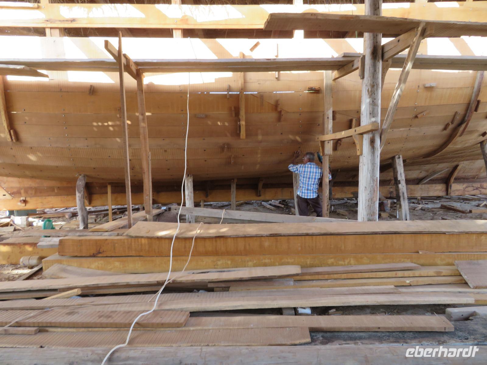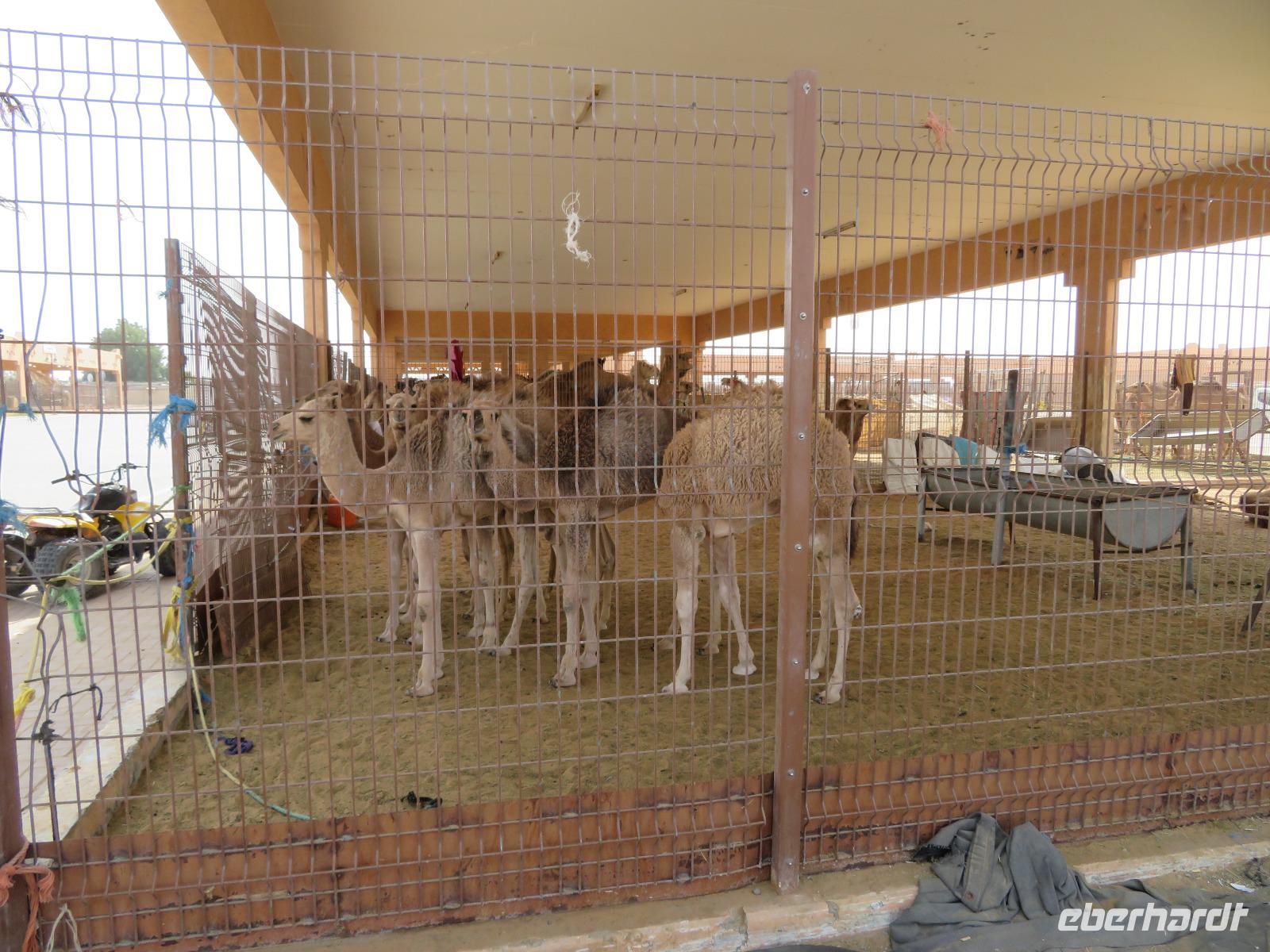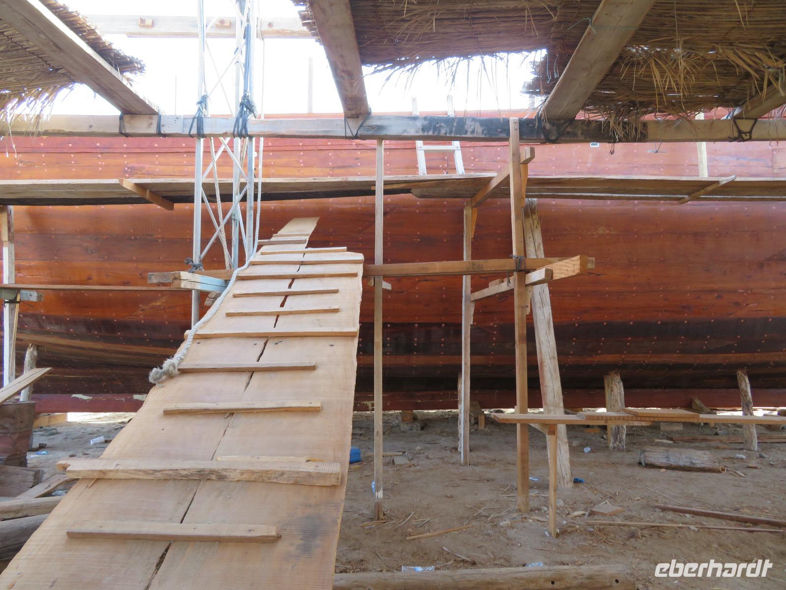Der Morgen in der Wüste beginnt früh, denn einige der Gäste wollen sich einen kleinen Traum erfüllen und einen Kamelritt wagen. Nach einigen Anfangsschwierigkeiten sitzen sie auf dem Rücken der Trampeltiere. Da es bereits am Morgen sehr warm ist kommt uns der erste Programmunkt des Tages gerade recht. Mit den modernen Jeeps fahren wir zum Wadi Bani Khalid, dem bekanntesten Wadi im Oman. Nachdem wir am Ende des Pfades angelangt sind erwartet uns das Paradies. Wir erblicken einen malerischen türkisblauen See umrahmt von Palmen, der zum Baden einlädt. Außerdem ist die Pediküre an diesem See ebenso kostenlos, die Fische in dem See knabbern an den Füßen, welche anschließend babyweich sind ;) Einige nutzen auch nur die Ruhe, um sich etwas zu erholen. Nach unserer Auszeit fahren wir weiter in die Hafenstadt Sur. Wir besichtigen eine Dhau-Werft, hier werden die Dhaus noch auf traditionelle Art und Weise erbaut. Für uns sieht das "Holzlager" der Werft etwas durcheinander aus, aber anscheinend haben die Handwerker einen Plan. Bzw. auch keinen Plan, Asa'd erzählt uns, dass es keinen Bauplan gibt sondern dieser von Familie zu Familie mündlich überliefert wird. Nach dem Abendessen im Hotel sind wir gespannt auf das besondere Naturschauspiel am Abend. Im Naturreservat Ras Al Junayz warten wir darauf, dass die Meeresschildkröten am Strand ankommen um Eier zu legen. Während wir darauf warten erfahren wir, dass die Meeresschildkröten die hier geboren wurden zum Eier legen auch wieder hier her kommen. Insgesamt tun sie das zwei- bis dreimal pro Jahr und machen anschließend eine Pause von etwa 3 Jahren. Von den ca. 100 Eiern die sie legen überleben aber nur 2-3 Babyschildkröten. Und dann ist es soweit, wir dürfen zum Strand und beobachten die riesige Meeresschildkröte. Aufgrund der Trockenheit des Sandes, legt diese leider keine Eier, aber die Sichtung der Schildkröte ist es trotzdem wert.