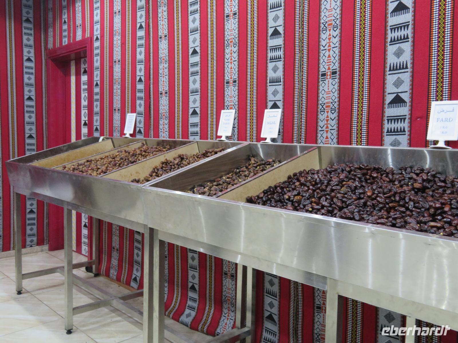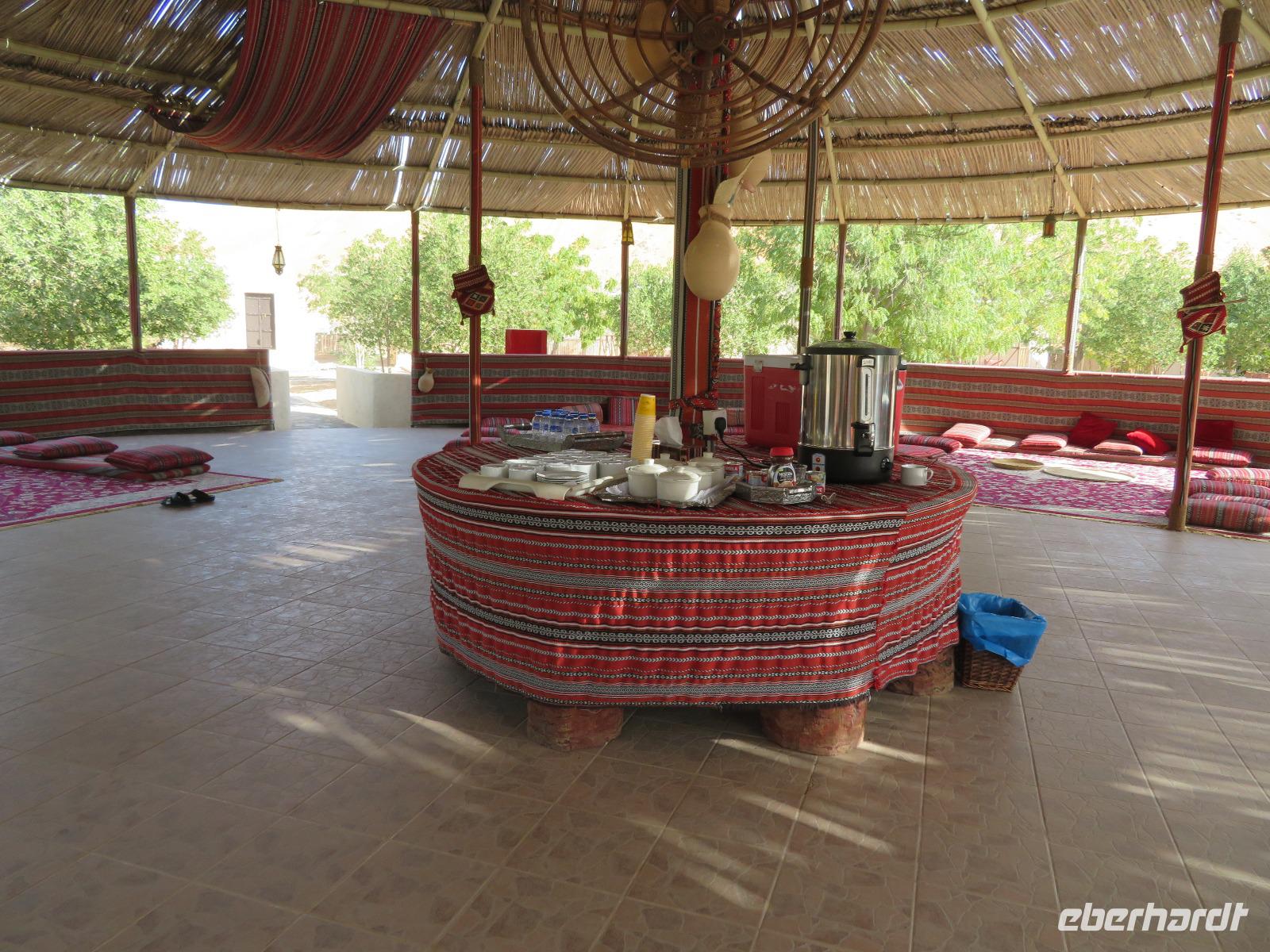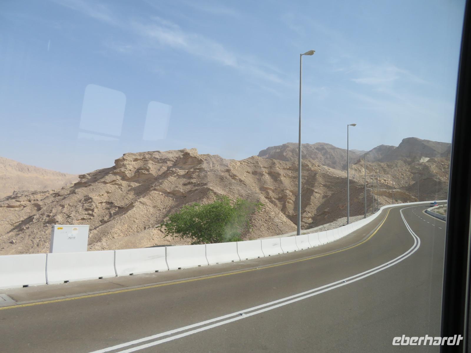 Nach vielen extravaganten Eindrücken in der Großstadt Dubai mit den hunderten Wolkenkratzern reisen wir heute weiter in Richtung des Nachbarlandes Oman. Je weiter wir uns von der Großstadt entfernen, desto karger wird das Land. In der Oasenstadt Al Ain besuchen wir den ehemaligen Palast des verstorbenen Scheich Zayed Bin Sultan Al Nahyan. Wir bekommen arabischen Kaffee und Datteln gereicht, Ibrahim führt uns durch die Räumlichkeiten der Palastanlage die unter anderem mit den Gemälden der Scheich Familie geschmückt ist. Aber nur die der männlichen, von den weiblichen Familienmitglieder, werden um sie zu schützen keine Gemälde angefertigt. Eine Sehenswürdigkeit in dieser kargen Landschaft ist auch die 1.200 Hektar große Dattelplantage wird durch ein uraltes Faladsch-Kanalsystem bewässert. Wie man die Palmen bestäubt und die Datteln im Anschluss erntet zeigt ein Mitarbeiter der Dattelplantage. Mit einem Seil bewaffnet und scheinbar mühelos klettert er die Palme hinauf. Wir dürfen die leckeren Datteln der Palmen ebenfalls kosten. Neben der Plantage hat der letzte Kamelmarkt des Landes seinen Sitz in Al Ain. Hunderte von Kamelen warten darauf weiterverkauft zu werden, da stellt sich die Frage wer von uns am meisten wert wäre? ;) Wir kommen den Kamelen ganz nah und fahren dann glücklicherweiße vollzählig weiter zu unserem Hotel. Über eine steile Serpentinenstraße fahren wir zu unserem Hotel auf 915 Meter Höhe auf dem Jebel-Hafeet-Berg. Am Abend wartet noch eine Überraschung auf uns, da heute der Tag der Liebenden ist, ist der Speisesaal entsprechend geschmückt. Die Frauen dürfen sich über eine Rose freuen und die Nachspeisen sind zu Herzen geformt. Frohen Valentinstag!