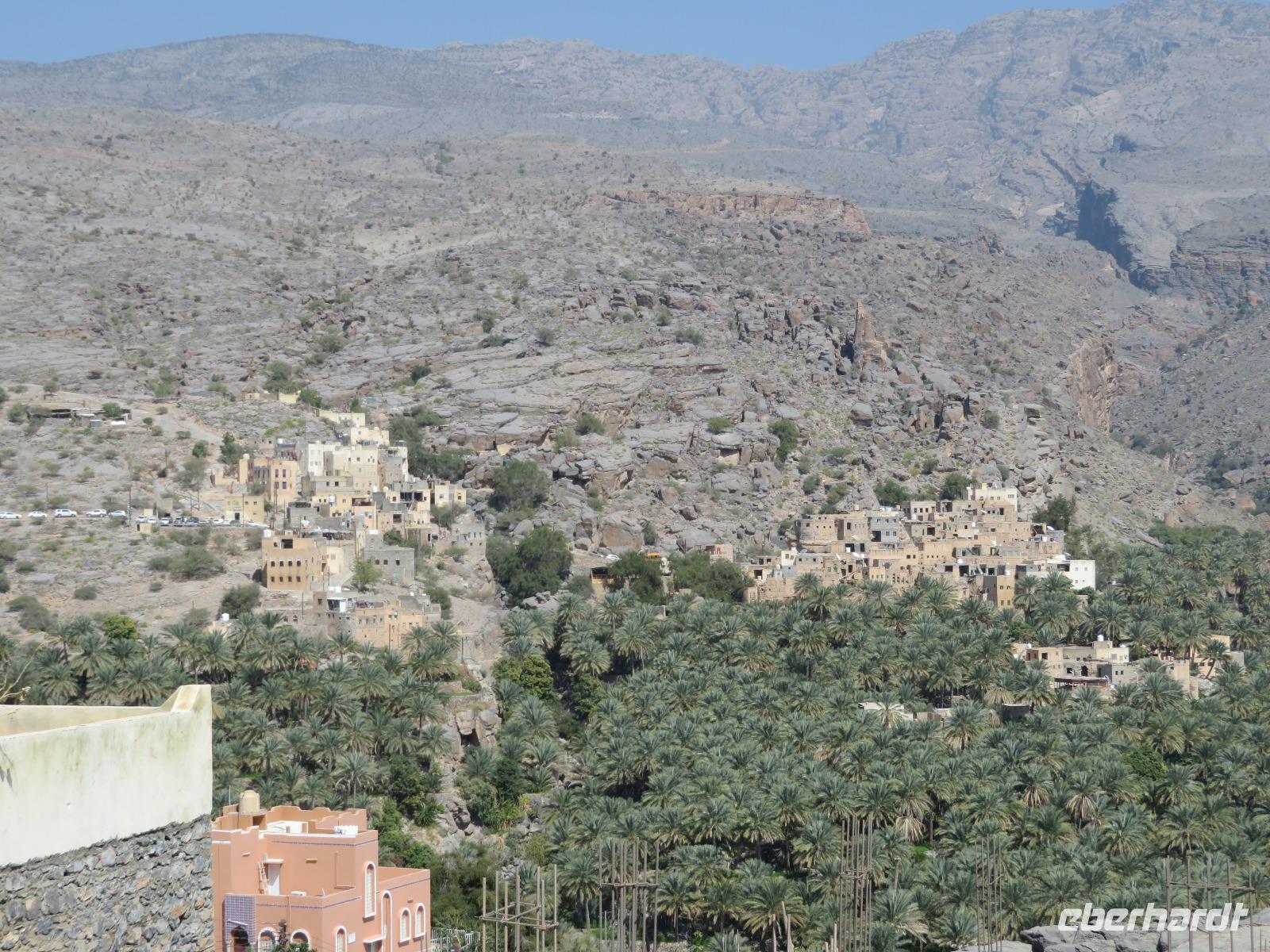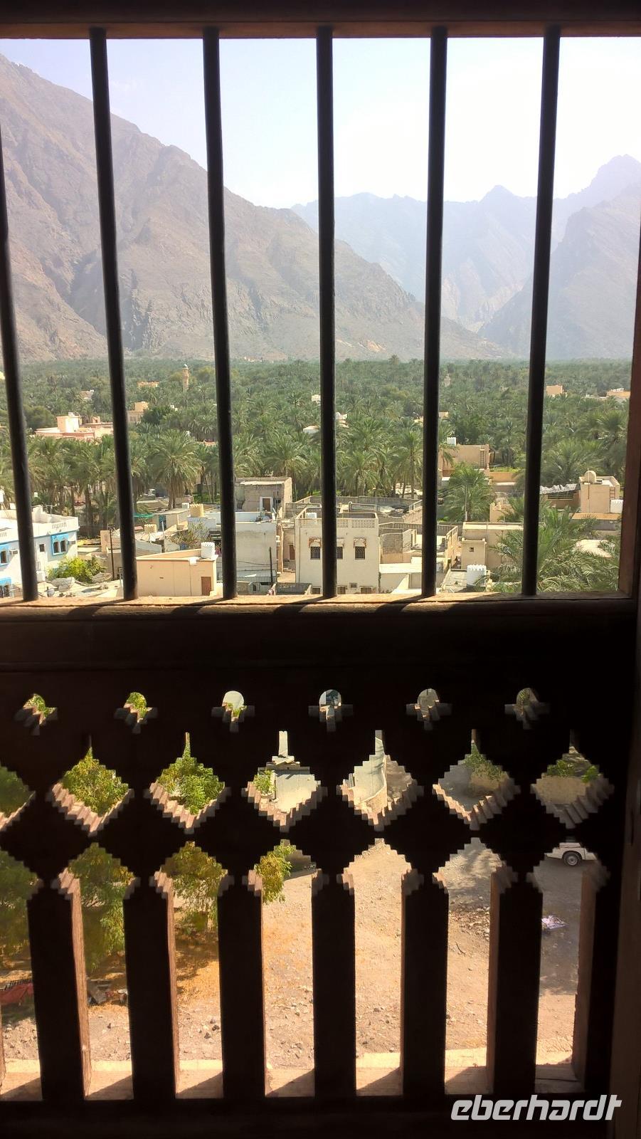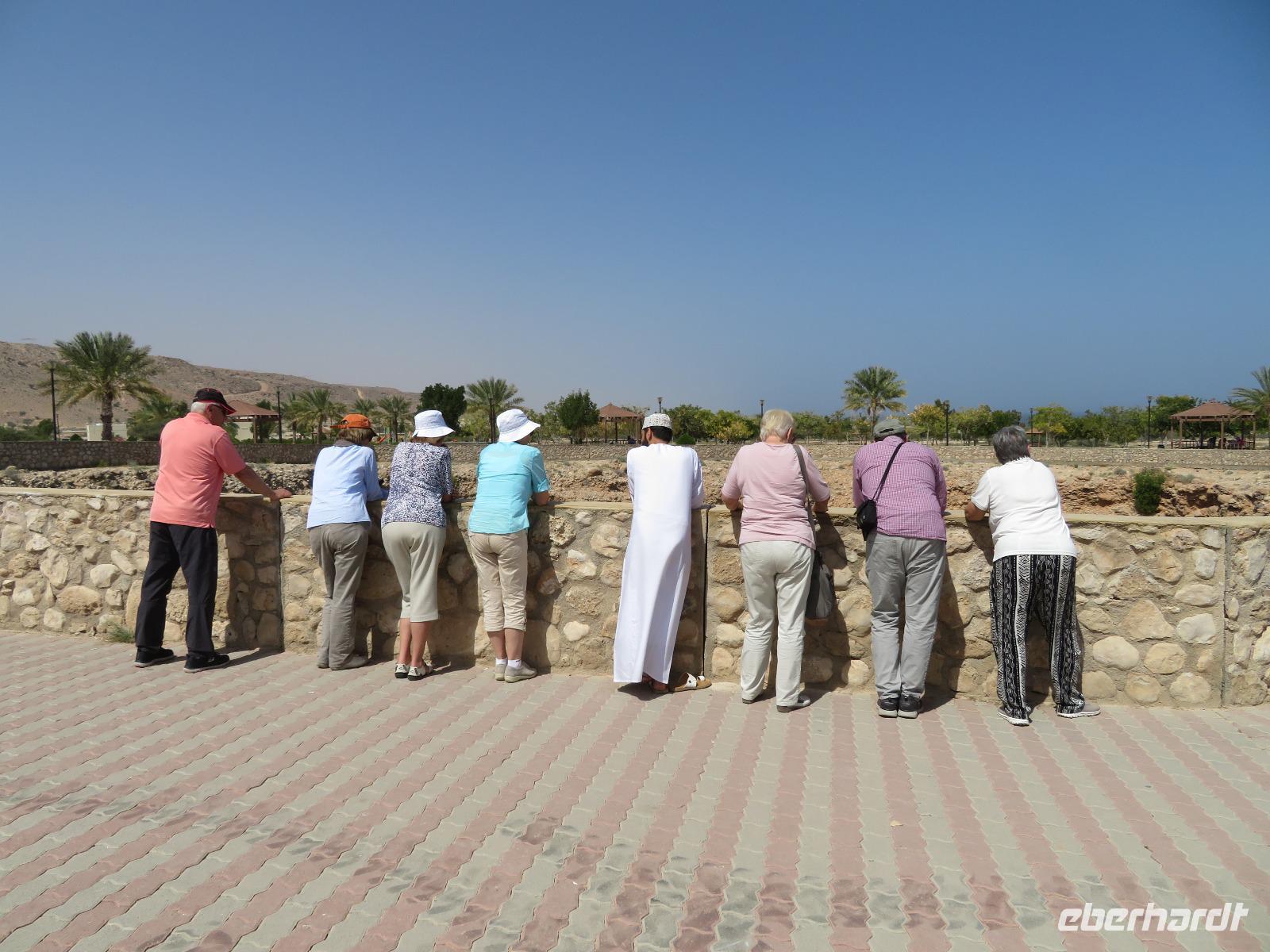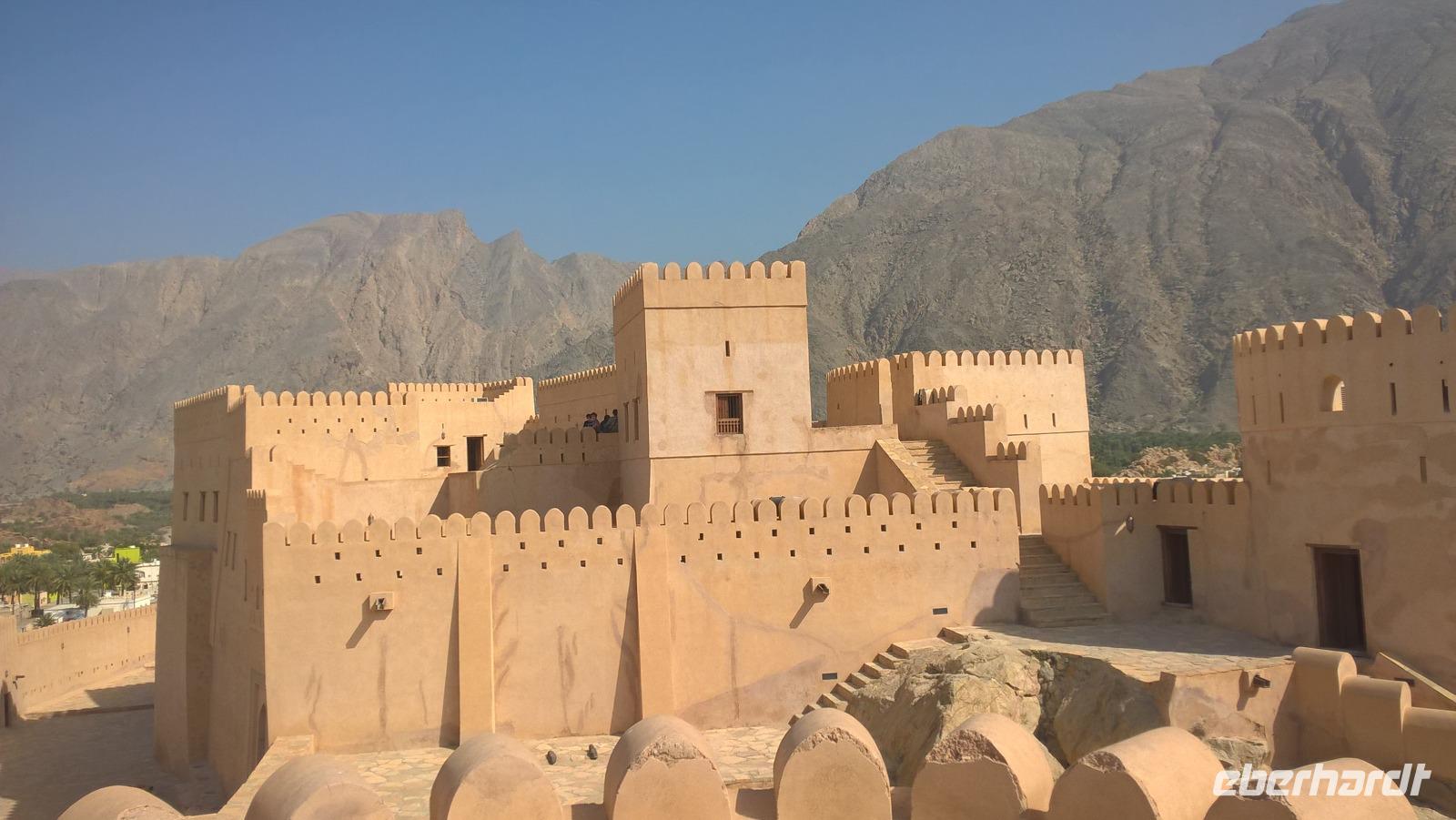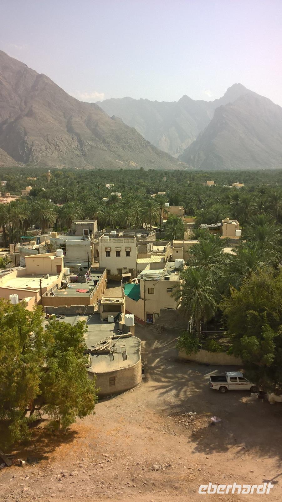 Wir begrüßen unseren neuen Reiseleiter Asa'd, einen jungen Omani, der fünf Jahre in Deutschland studiert hat. Mit ihm fahren wir zur Grenze der Vereinigten Arabischen Emirate an der wir zunächst einmal ausreisen um in das Sultanat Oman einzureisen. In den nächsten 7 Tagen reisen wir durch das aufstrebende Land unter der Herrschaft des Sultans Qaboos bin Said Al-Said. Dieser investiert nicht nur in die Zukunft des Landes sondern auch in die deren Landesbewohner. Asa'd erzählt uns, dass er mithilfe der finanziellen Unterstützung des Sultans für Absolventen im Deutschland studieren konnte. Nachdem wir unsere Arabischen Dirham in Omainische Rial getauscht haben besichtigen wir das Schloss von Jabrin aus dem Jahre 1670, das ehemals als Wohnschloss und Sommerresidenz gedacht war. Nachdem es zu Streitigkeiten mit seinem Bruder kam beschloss Sultan Bilarab bin Sultan al-Yaarub es mit Wehrmauern und Türmen zu erweitern. Man kann sich vorstellen, wie hier gelebt wurde. Es rentiert sich auch einen Blick nach oben auf die schön verzierte Holzdecke zu werfen. Ebenso beeindruckend ist das Fort von Bahla. Die Festung wurde wahrscheinlich von den Nabhani im 17. Jahrhundert aus Lehm erbaut und zählt seit 1978 als einzige osmanische Festung zum Weltkulturerbe. Eine 12 Kilometer lange Mauer umgibt die Festung. Wir fahren heute bis nach Al Hamra mit unserem Reisebus und steigen dann in Jeeps um. Diese bringen uns auf 1400 Meter Höhe, zu unserem heutigen Hotel. Der Blick von oben ist einfach unglaublich und ist die holprige Fahrt mehr als wert.