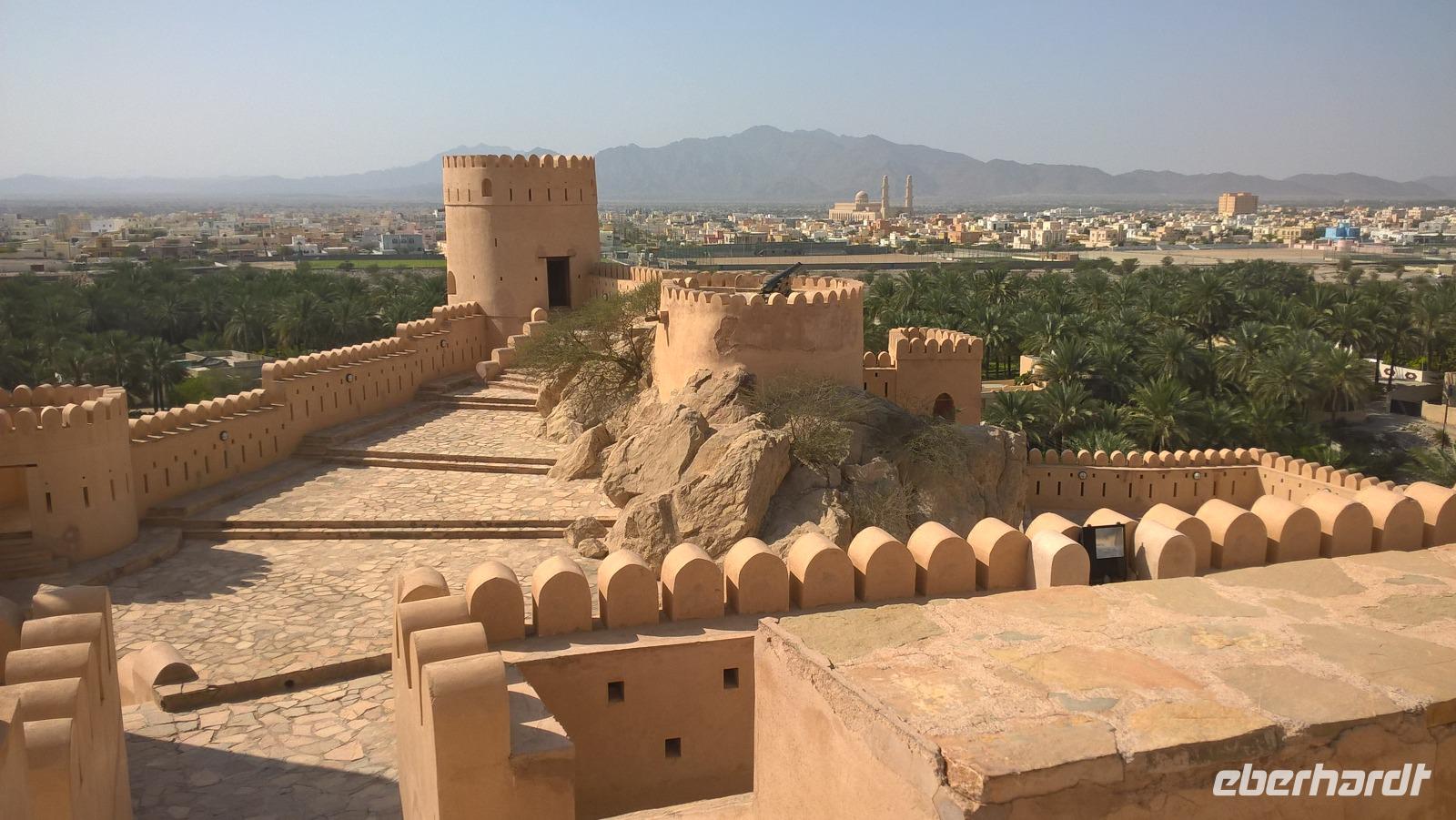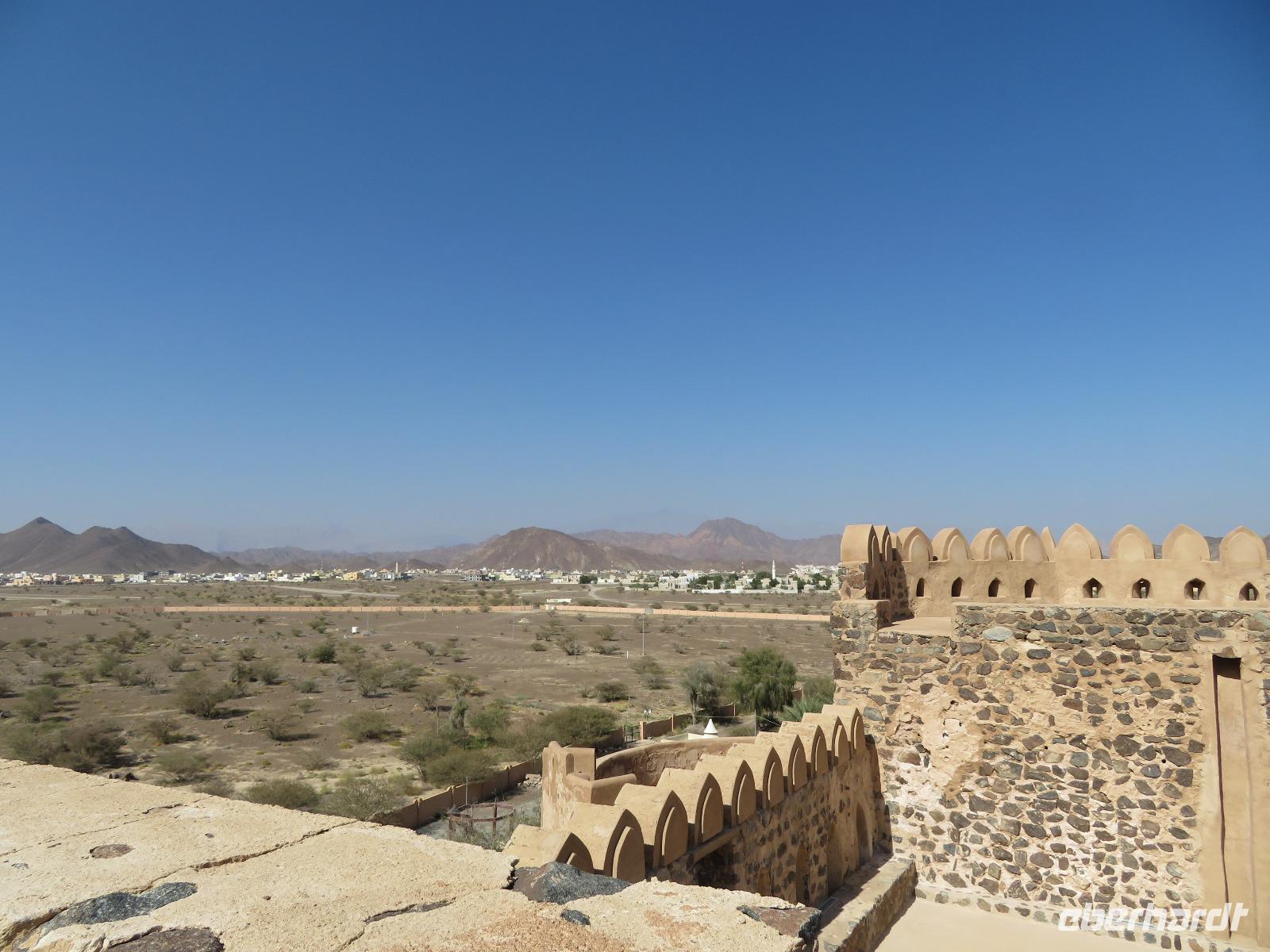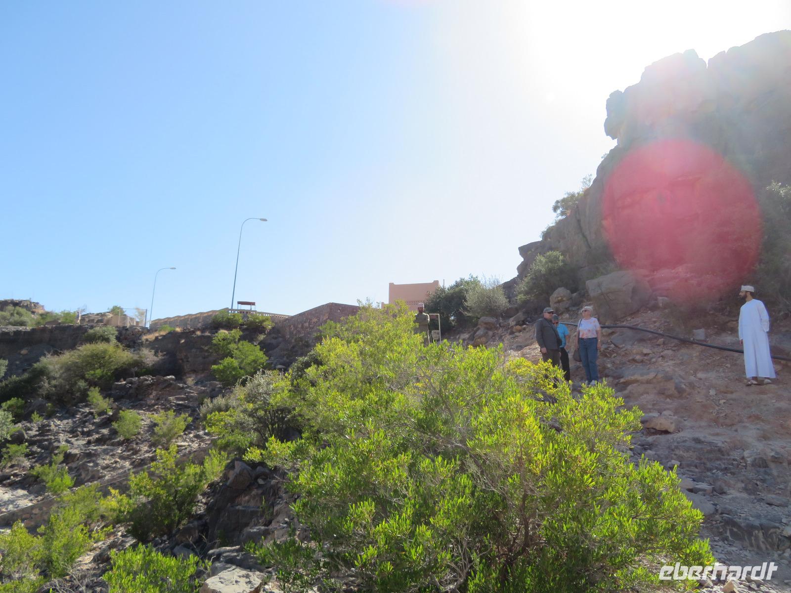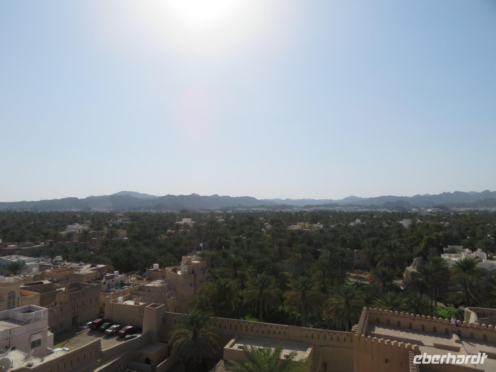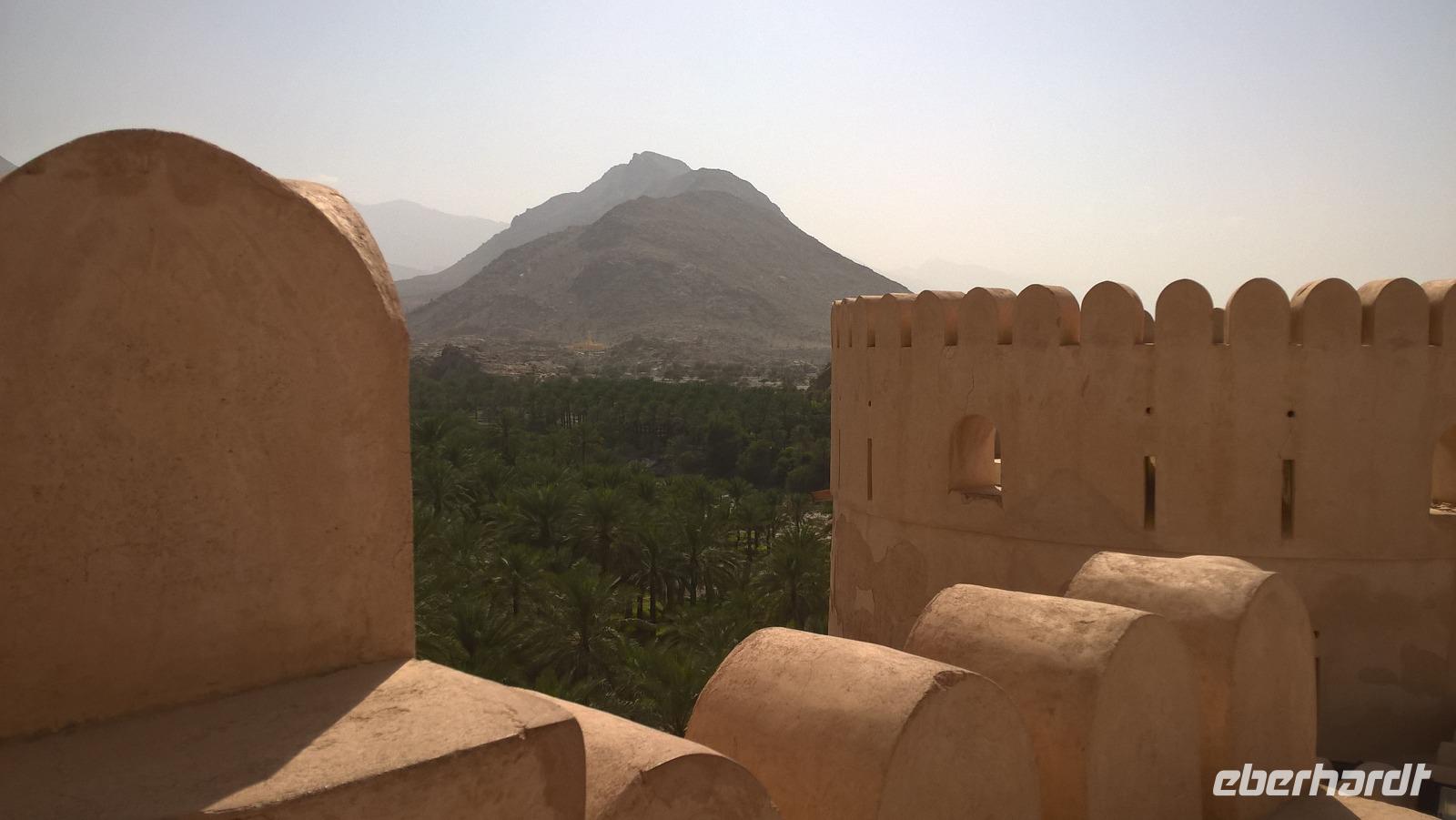 Wir begrüßen unseren neuen Reiseleiter Asa'd, einen jungen Omani, der fünf Jahre in Deutschland studiert hat. Mit ihm fahren wir zur Grenze der Vereinigten Arabischen Emirate an der wir zunächst einmal ausreisen um in das Sultanat Oman einzureisen. In den nächsten 7 Tagen reisen wir durch das aufstrebende Land unter der Herrschaft des Sultans Qaboos bin Said Al-Said. Dieser investiert nicht nur in die Zukunft des Landes sondern auch in die deren Landesbewohner. Asa'd erzählt uns, dass er mithilfe der finanziellen Unterstützung des Sultans für Absolventen im Deutschland studieren konnte. Nachdem wir unsere Arabischen Dirham in Omainische Rial getauscht haben besichtigen wir das Schloss von Jabrin aus dem Jahre 1670, das ehemals als Wohnschloss und Sommerresidenz gedacht war. Nachdem es zu Streitigkeiten mit seinem Bruder kam beschloss Sultan Bilarab bin Sultan al-Yaarub es mit Wehrmauern und Türmen zu erweitern. Man kann sich vorstellen, wie hier gelebt wurde. Es rentiert sich auch einen Blick nach oben auf die schön verzierte Holzdecke zu werfen. Ebenso beeindruckend ist das Fort von Bahla. Die Festung wurde wahrscheinlich von den Nabhani im 17. Jahrhundert aus Lehm erbaut und zählt seit 1978 als einzige osmanische Festung zum Weltkulturerbe. Eine 12 Kilometer lange Mauer umgibt die Festung. Wir fahren heute bis nach Al Hamra mit unserem Reisebus und steigen dann in Jeeps um. Diese bringen uns auf 1400 Meter Höhe, zu unserem heutigen Hotel. Der Blick von oben ist einfach unglaublich und ist die holprige Fahrt mehr als wert.