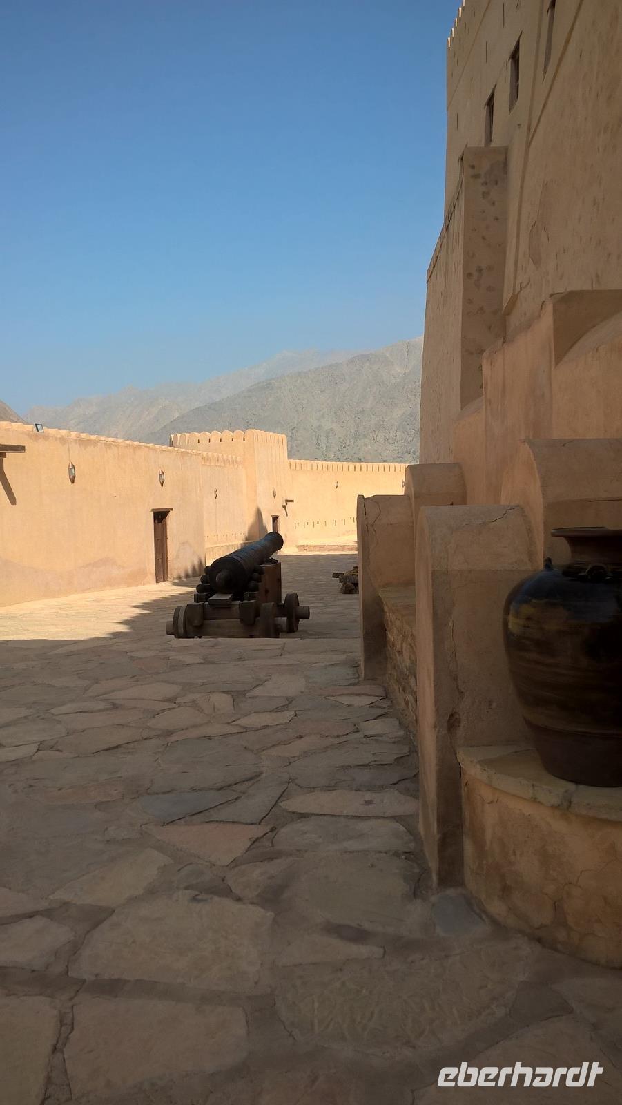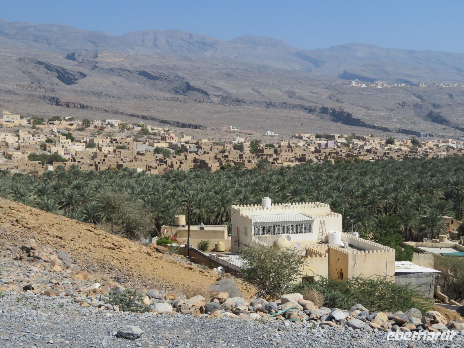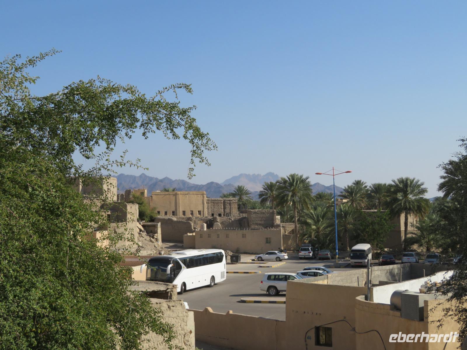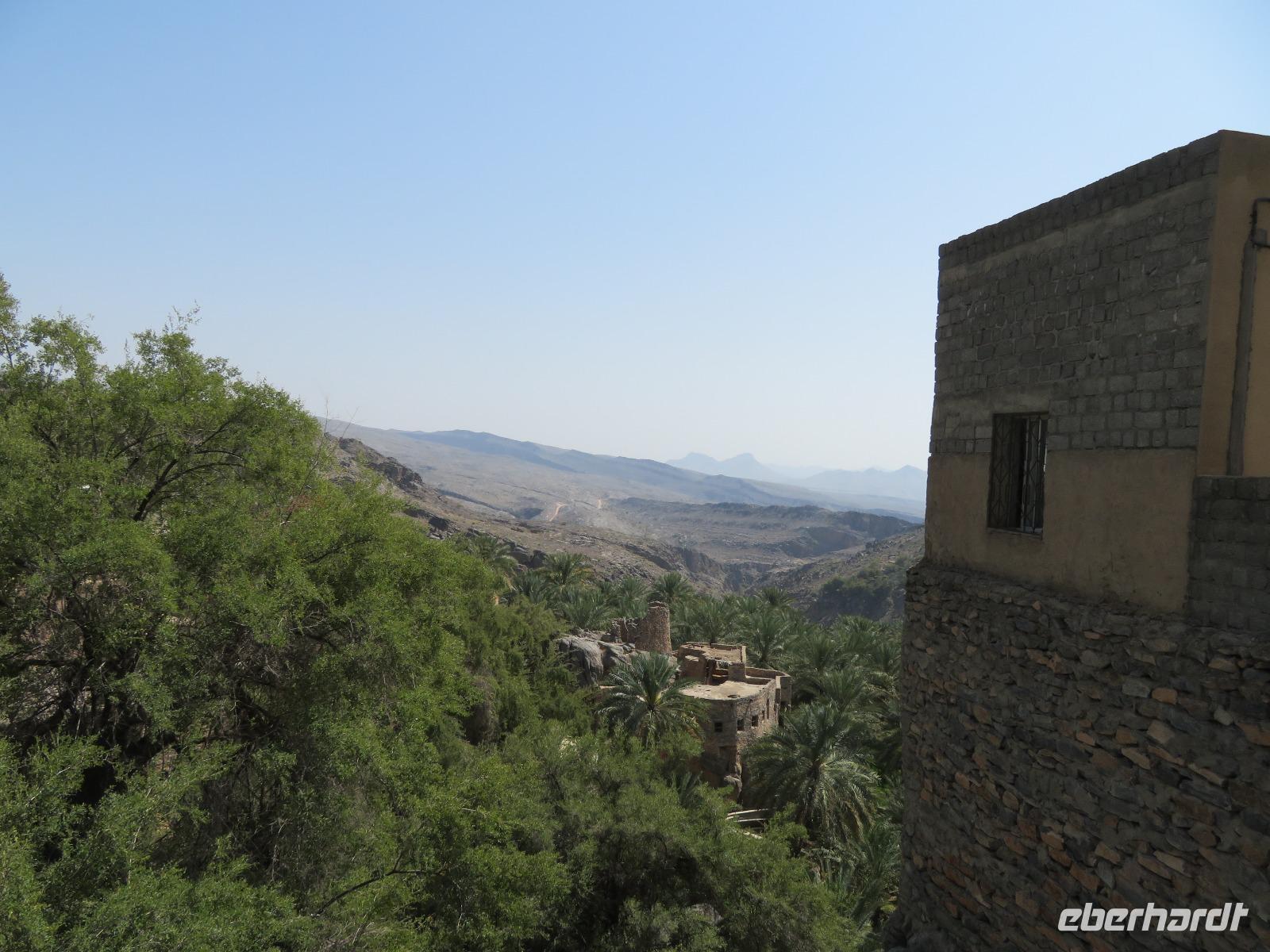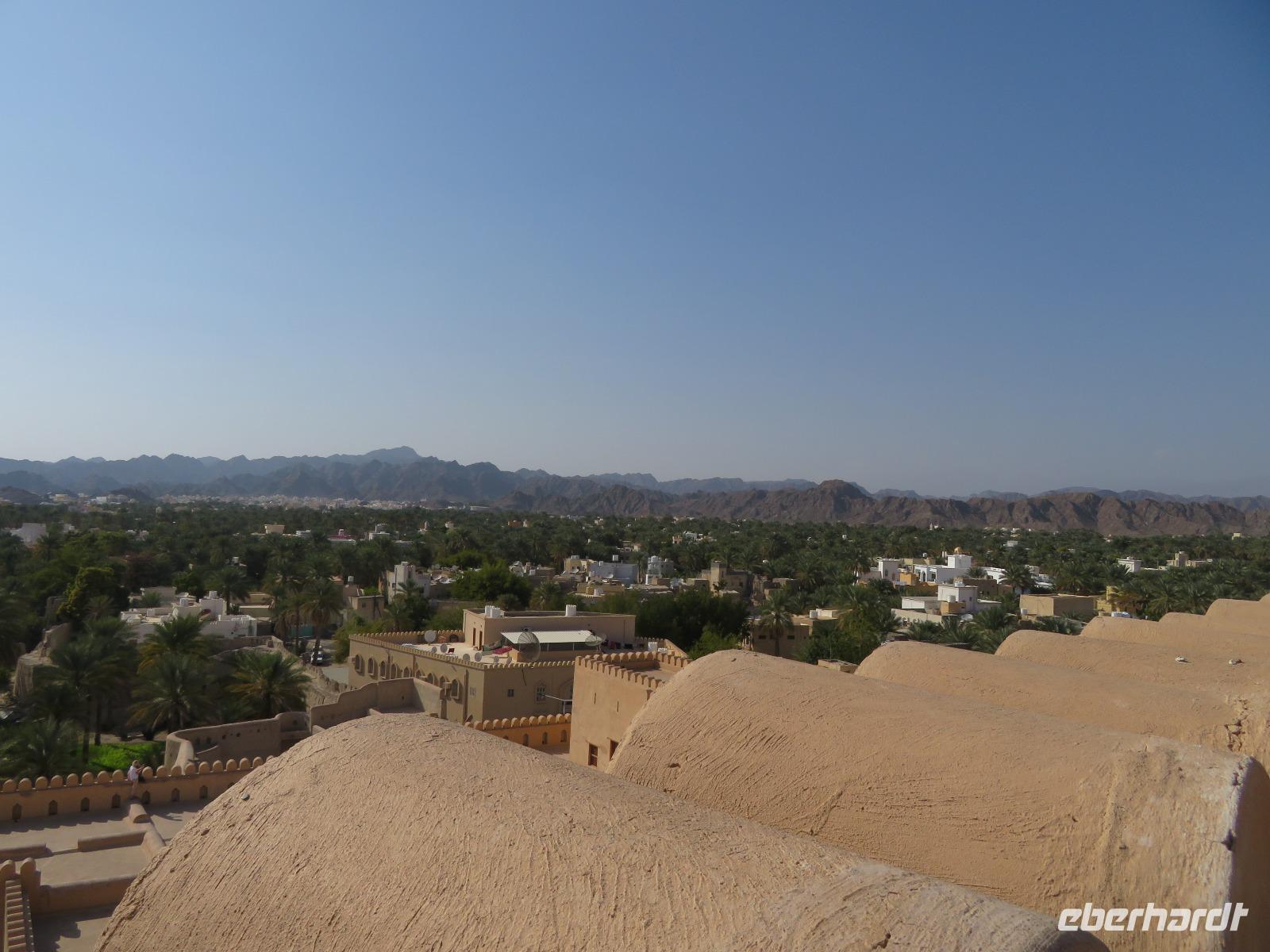 Wir begrüßen unseren neuen Reiseleiter Asa'd, einen jungen Omani, der fünf Jahre in Deutschland studiert hat. Mit ihm fahren wir zur Grenze der Vereinigten Arabischen Emirate an der wir zunächst einmal ausreisen um in das Sultanat Oman einzureisen. In den nächsten 7 Tagen reisen wir durch das aufstrebende Land unter der Herrschaft des Sultans Qaboos bin Said Al-Said. Dieser investiert nicht nur in die Zukunft des Landes sondern auch in die deren Landesbewohner. Asa'd erzählt uns, dass er mithilfe der finanziellen Unterstützung des Sultans für Absolventen im Deutschland studieren konnte. Nachdem wir unsere Arabischen Dirham in Omainische Rial getauscht haben besichtigen wir das Schloss von Jabrin aus dem Jahre 1670, das ehemals als Wohnschloss und Sommerresidenz gedacht war. Nachdem es zu Streitigkeiten mit seinem Bruder kam beschloss Sultan Bilarab bin Sultan al-Yaarub es mit Wehrmauern und Türmen zu erweitern. Man kann sich vorstellen, wie hier gelebt wurde. Es rentiert sich auch einen Blick nach oben auf die schön verzierte Holzdecke zu werfen. Ebenso beeindruckend ist das Fort von Bahla. Die Festung wurde wahrscheinlich von den Nabhani im 17. Jahrhundert aus Lehm erbaut und zählt seit 1978 als einzige osmanische Festung zum Weltkulturerbe. Eine 12 Kilometer lange Mauer umgibt die Festung. Wir fahren heute bis nach Al Hamra mit unserem Reisebus und steigen dann in Jeeps um. Diese bringen uns auf 1400 Meter Höhe, zu unserem heutigen Hotel. Der Blick von oben ist einfach unglaublich und ist die holprige Fahrt mehr als wert.