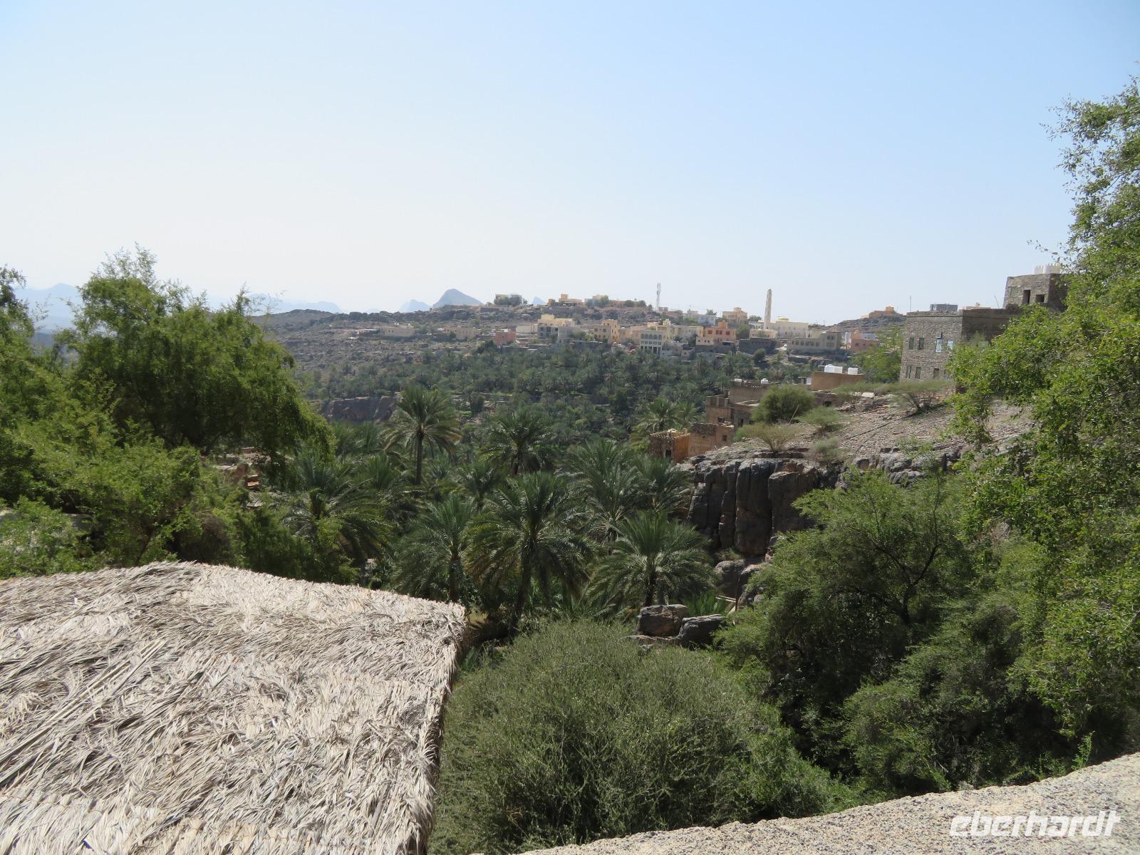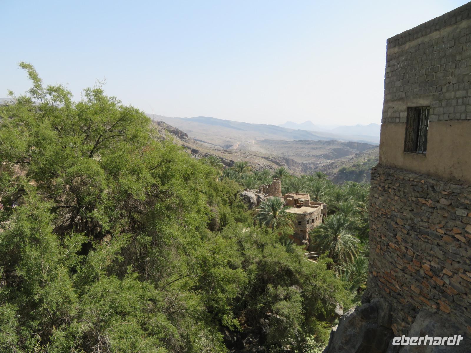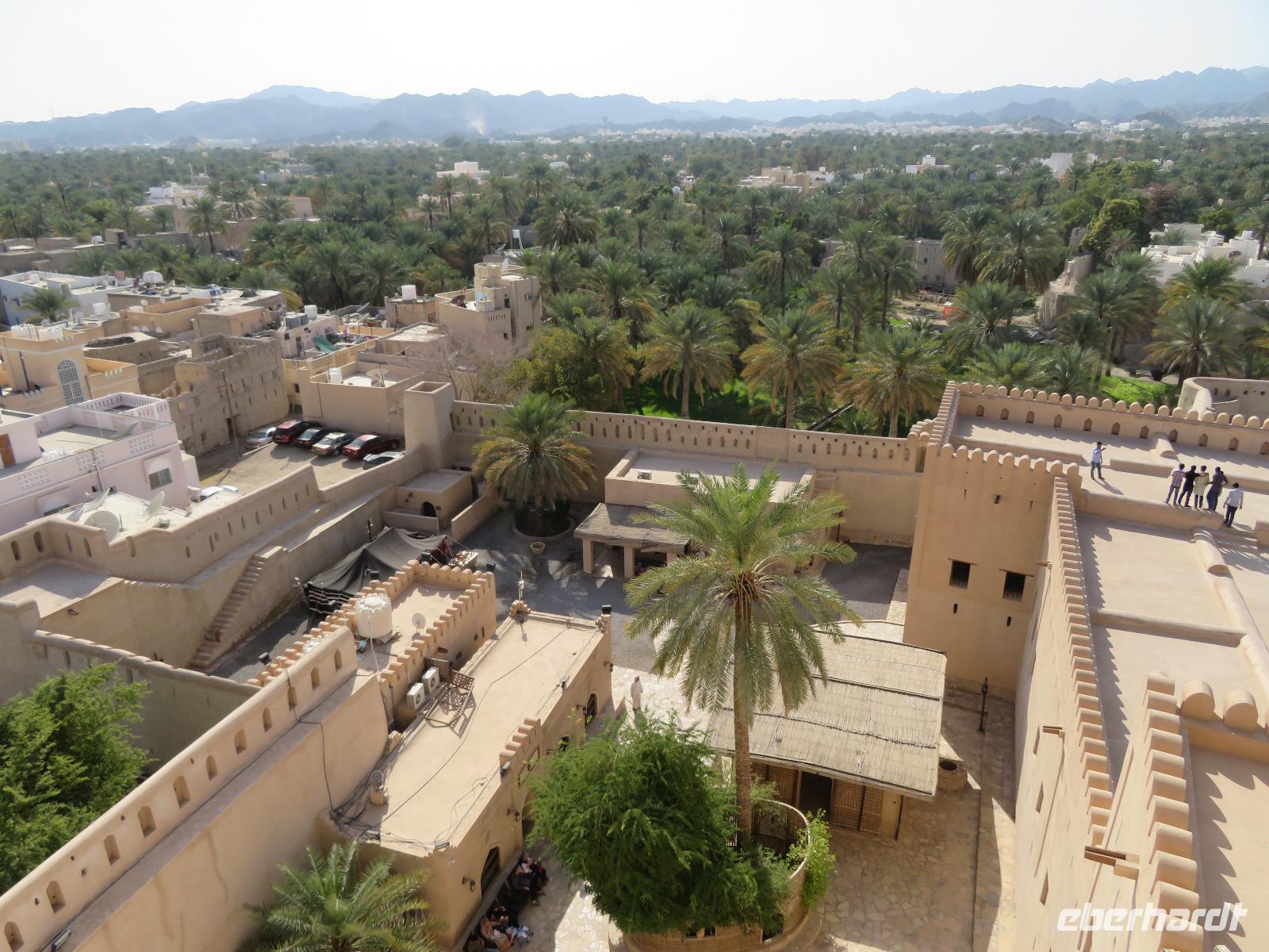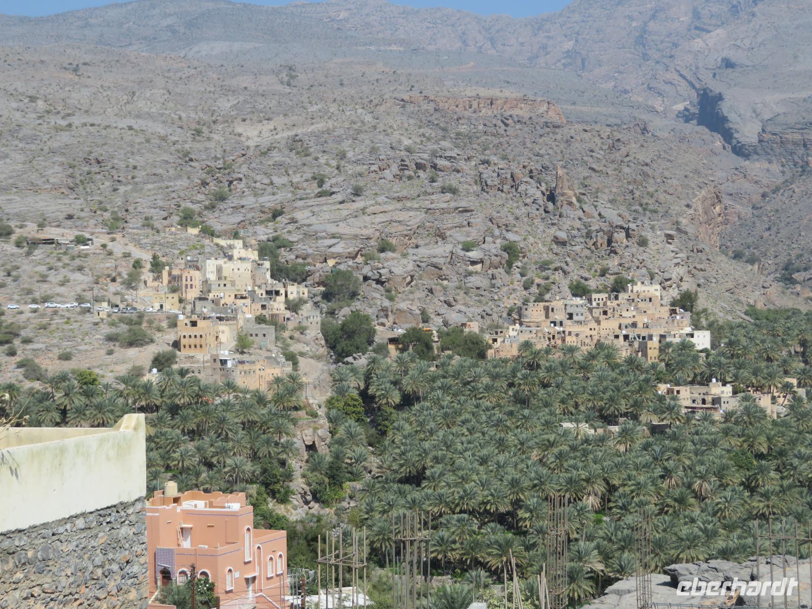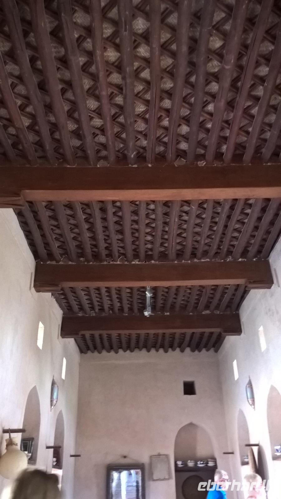 Wir begrüßen unseren neuen Reiseleiter Asa'd, einen jungen Omani, der fünf Jahre in Deutschland studiert hat. Mit ihm fahren wir zur Grenze der Vereinigten Arabischen Emirate an der wir zunächst einmal ausreisen um in das Sultanat Oman einzureisen. In den nächsten 7 Tagen reisen wir durch das aufstrebende Land unter der Herrschaft des Sultans Qaboos bin Said Al-Said. Dieser investiert nicht nur in die Zukunft des Landes sondern auch in die deren Landesbewohner. Asa'd erzählt uns, dass er mithilfe der finanziellen Unterstützung des Sultans für Absolventen im Deutschland studieren konnte. Nachdem wir unsere Arabischen Dirham in Omainische Rial getauscht haben besichtigen wir das Schloss von Jabrin aus dem Jahre 1670, das ehemals als Wohnschloss und Sommerresidenz gedacht war. Nachdem es zu Streitigkeiten mit seinem Bruder kam beschloss Sultan Bilarab bin Sultan al-Yaarub es mit Wehrmauern und Türmen zu erweitern. Man kann sich vorstellen, wie hier gelebt wurde. Es rentiert sich auch einen Blick nach oben auf die schön verzierte Holzdecke zu werfen. Ebenso beeindruckend ist das Fort von Bahla. Die Festung wurde wahrscheinlich von den Nabhani im 17. Jahrhundert aus Lehm erbaut und zählt seit 1978 als einzige osmanische Festung zum Weltkulturerbe. Eine 12 Kilometer lange Mauer umgibt die Festung. Wir fahren heute bis nach Al Hamra mit unserem Reisebus und steigen dann in Jeeps um. Diese bringen uns auf 1400 Meter Höhe, zu unserem heutigen Hotel. Der Blick von oben ist einfach unglaublich und ist die holprige Fahrt mehr als wert.