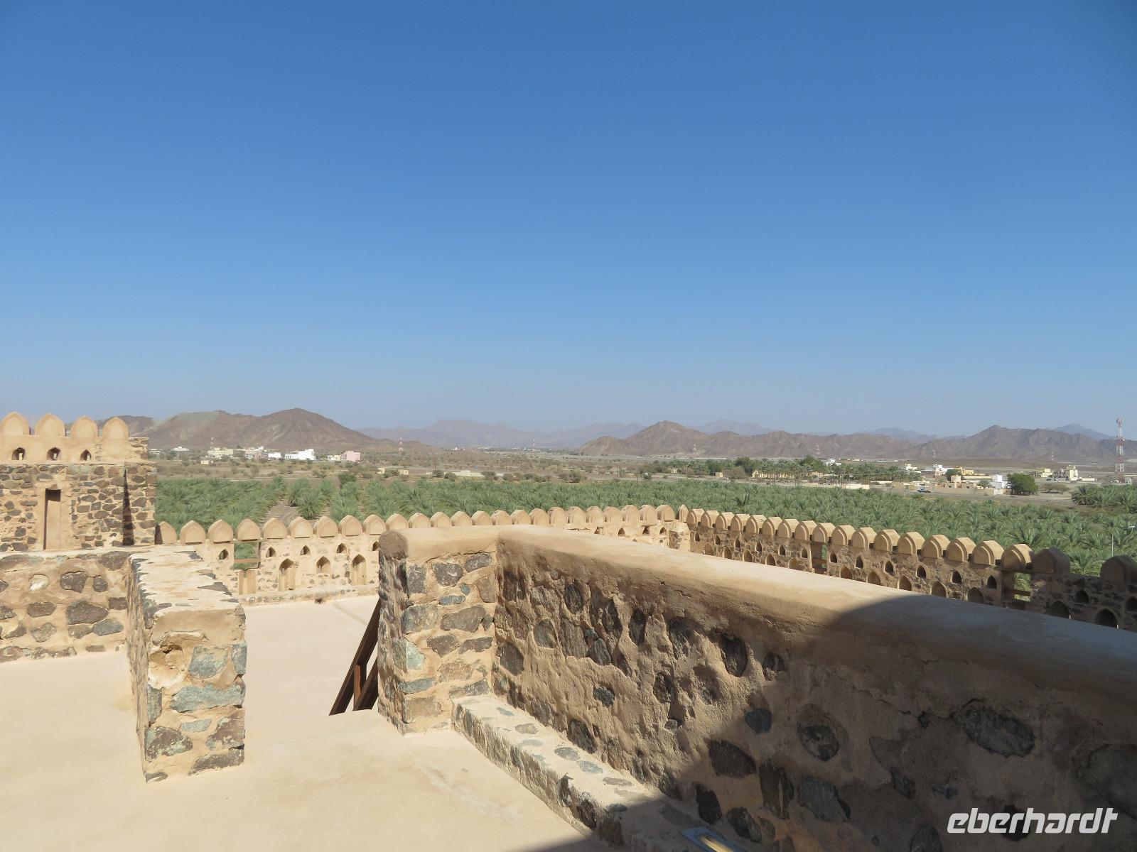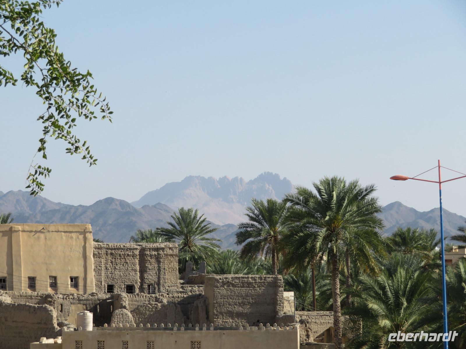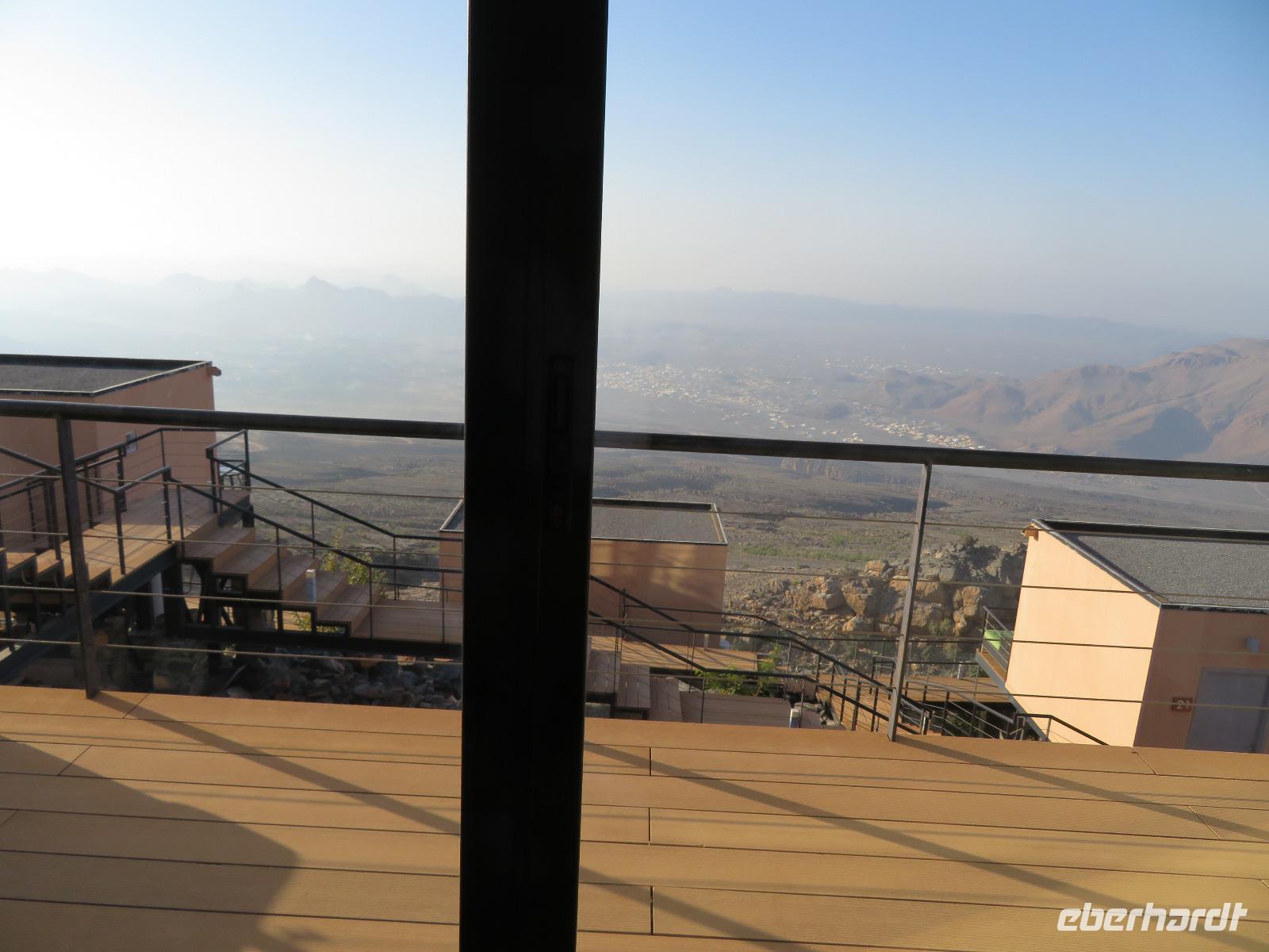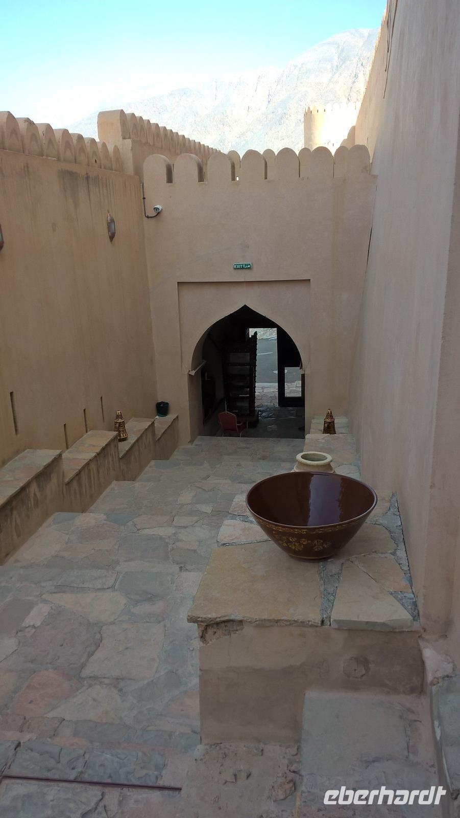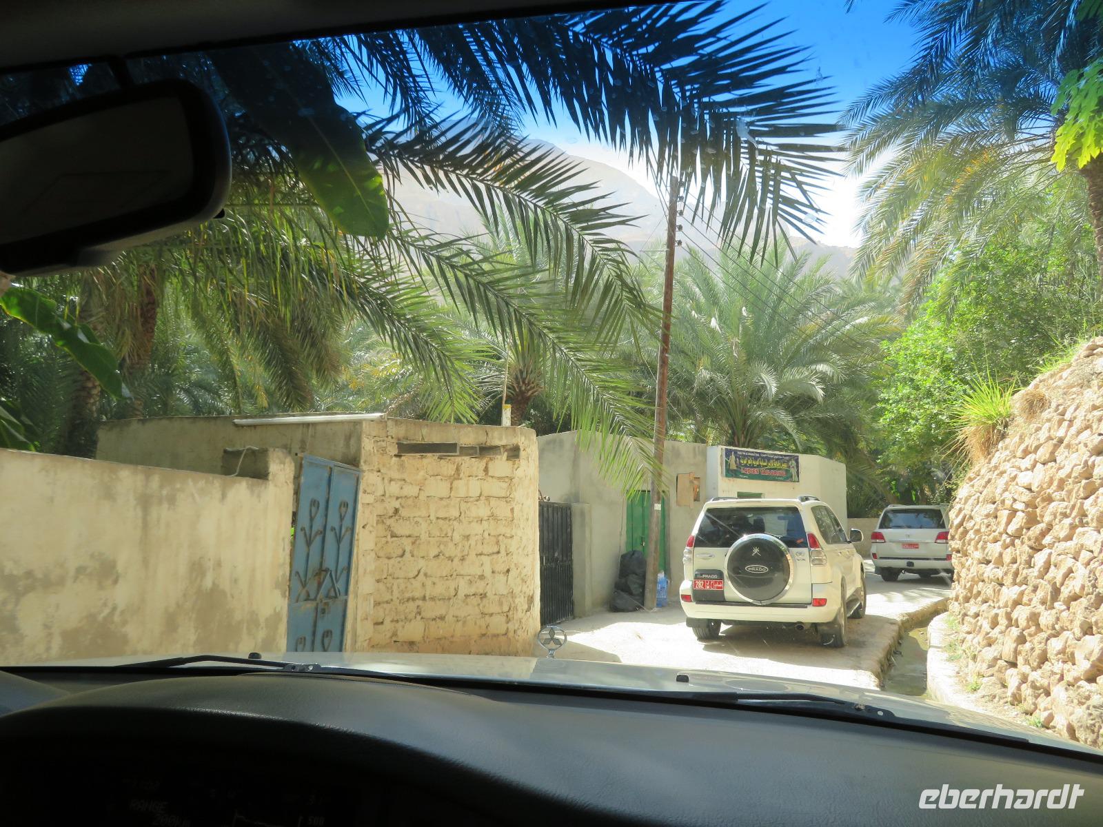 Wir begrüßen unseren neuen Reiseleiter Asa'd, einen jungen Omani, der fünf Jahre in Deutschland studiert hat. Mit ihm fahren wir zur Grenze der Vereinigten Arabischen Emirate an der wir zunächst einmal ausreisen um in das Sultanat Oman einzureisen. In den nächsten 7 Tagen reisen wir durch das aufstrebende Land unter der Herrschaft des Sultans Qaboos bin Said Al-Said. Dieser investiert nicht nur in die Zukunft des Landes sondern auch in die deren Landesbewohner. Asa'd erzählt uns, dass er mithilfe der finanziellen Unterstützung des Sultans für Absolventen im Deutschland studieren konnte. Nachdem wir unsere Arabischen Dirham in Omainische Rial getauscht haben besichtigen wir das Schloss von Jabrin aus dem Jahre 1670, das ehemals als Wohnschloss und Sommerresidenz gedacht war. Nachdem es zu Streitigkeiten mit seinem Bruder kam beschloss Sultan Bilarab bin Sultan al-Yaarub es mit Wehrmauern und Türmen zu erweitern. Man kann sich vorstellen, wie hier gelebt wurde. Es rentiert sich auch einen Blick nach oben auf die schön verzierte Holzdecke zu werfen. Ebenso beeindruckend ist das Fort von Bahla. Die Festung wurde wahrscheinlich von den Nabhani im 17. Jahrhundert aus Lehm erbaut und zählt seit 1978 als einzige osmanische Festung zum Weltkulturerbe. Eine 12 Kilometer lange Mauer umgibt die Festung. Wir fahren heute bis nach Al Hamra mit unserem Reisebus und steigen dann in Jeeps um. Diese bringen uns auf 1400 Meter Höhe, zu unserem heutigen Hotel. Der Blick von oben ist einfach unglaublich und ist die holprige Fahrt mehr als wert.