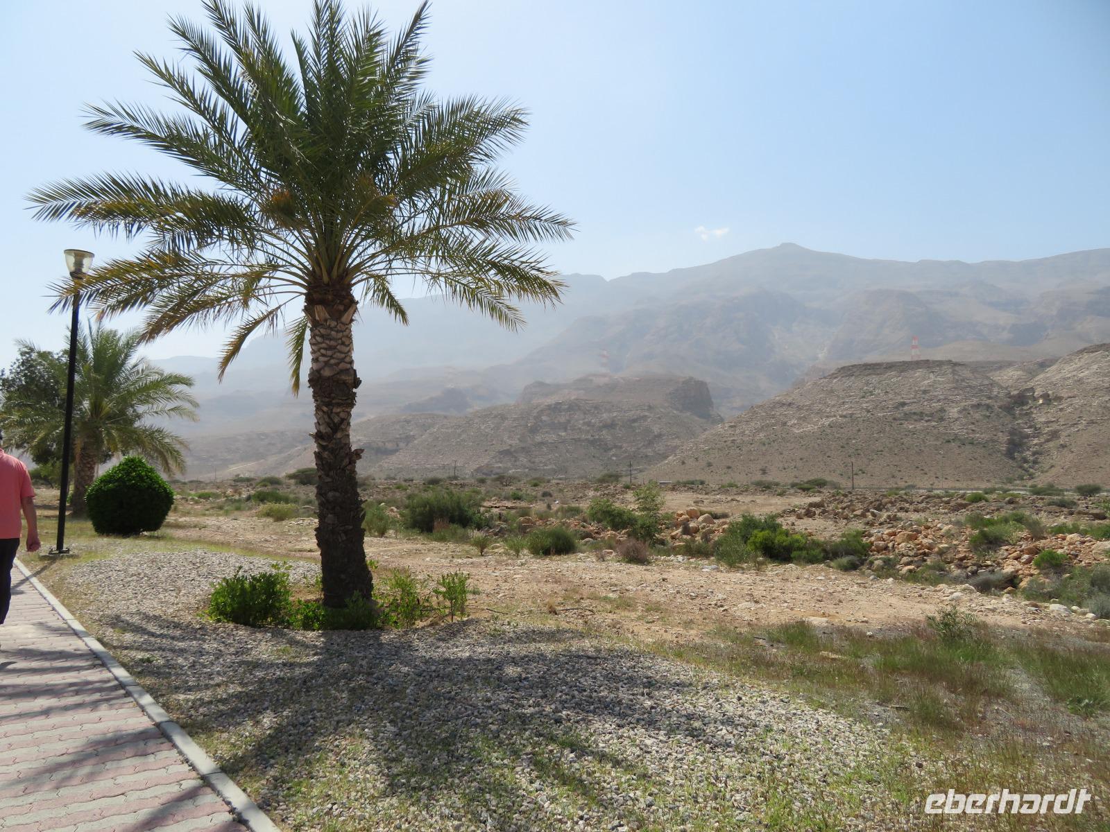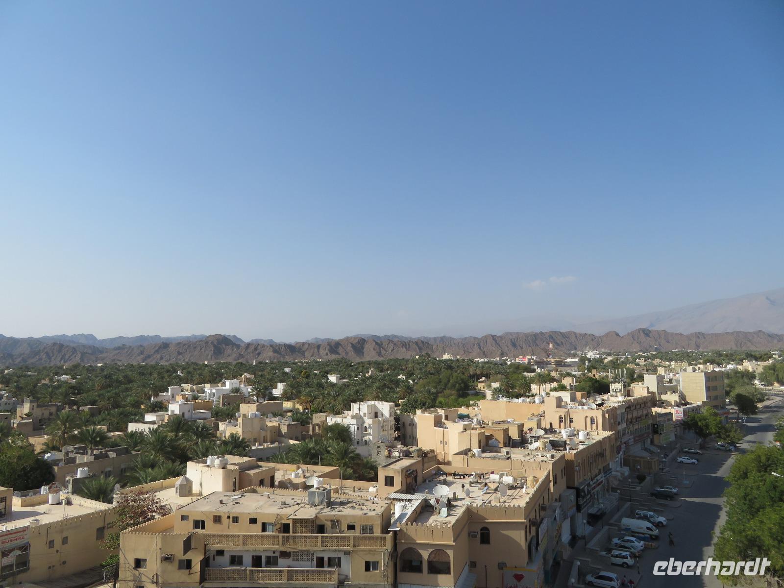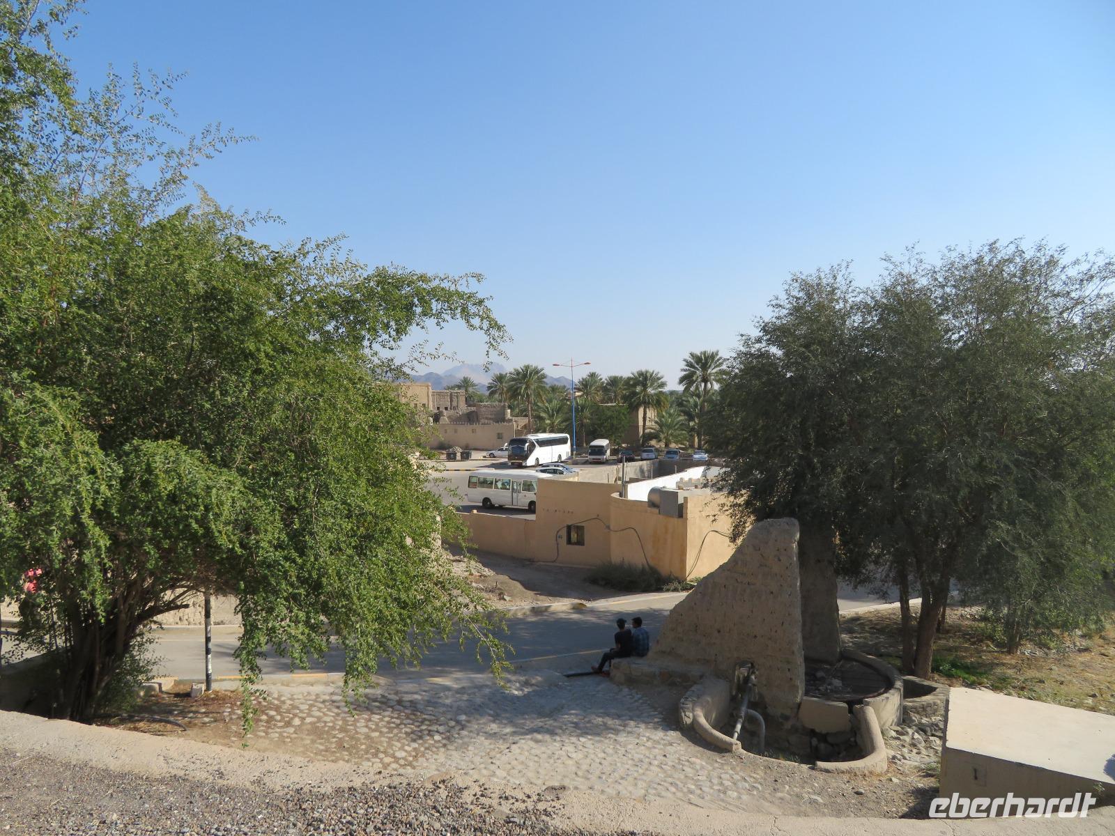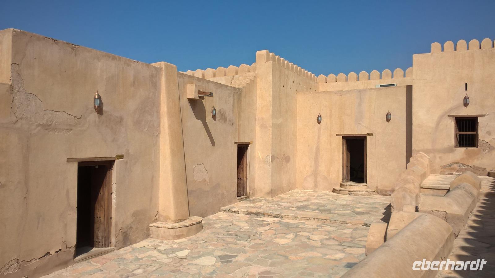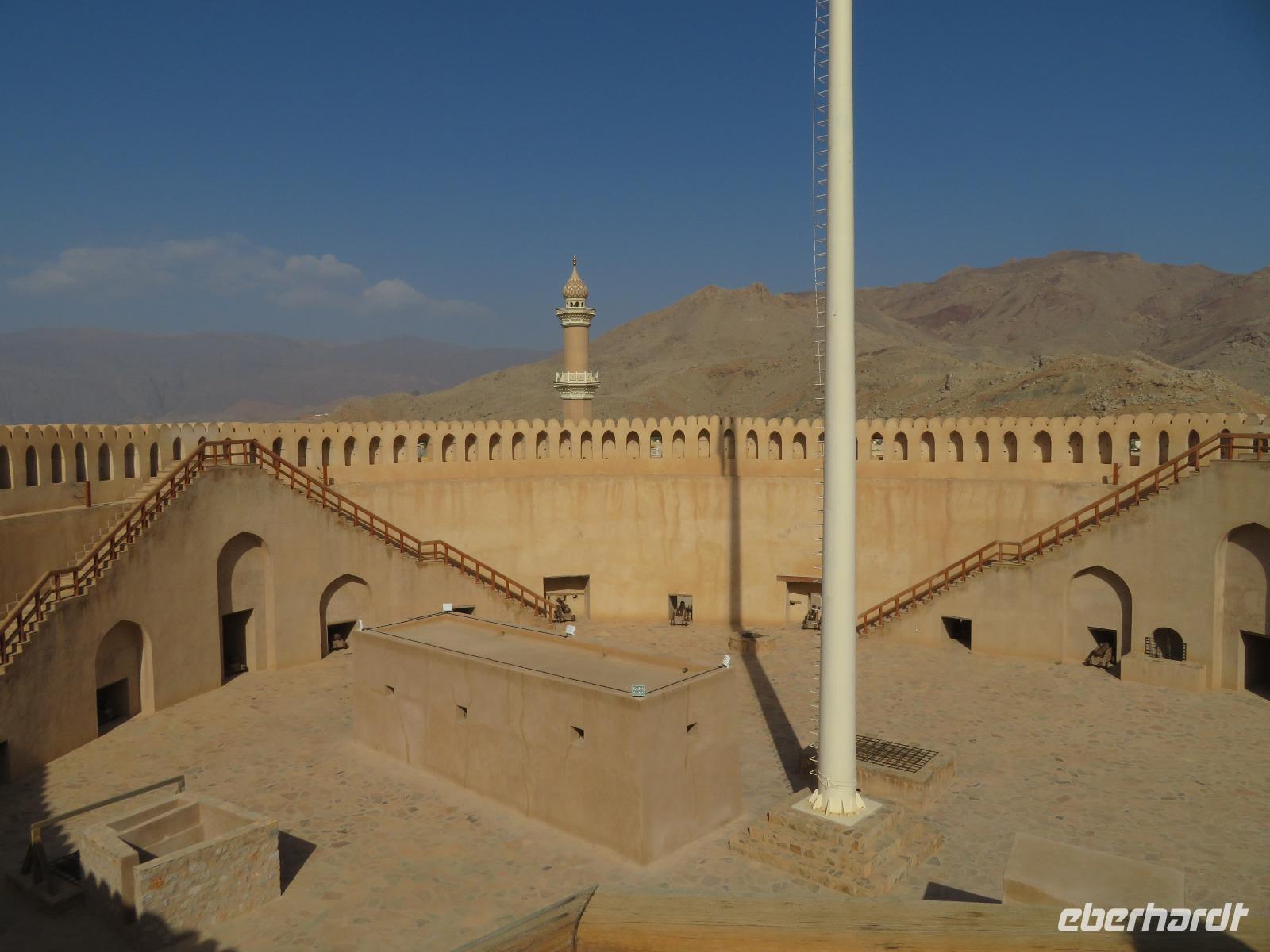 Wir begrüßen unseren neuen Reiseleiter Asa'd, einen jungen Omani, der fünf Jahre in Deutschland studiert hat. Mit ihm fahren wir zur Grenze der Vereinigten Arabischen Emirate an der wir zunächst einmal ausreisen um in das Sultanat Oman einzureisen. In den nächsten 7 Tagen reisen wir durch das aufstrebende Land unter der Herrschaft des Sultans Qaboos bin Said Al-Said. Dieser investiert nicht nur in die Zukunft des Landes sondern auch in die deren Landesbewohner. Asa'd erzählt uns, dass er mithilfe der finanziellen Unterstützung des Sultans für Absolventen im Deutschland studieren konnte. Nachdem wir unsere Arabischen Dirham in Omainische Rial getauscht haben besichtigen wir das Schloss von Jabrin aus dem Jahre 1670, das ehemals als Wohnschloss und Sommerresidenz gedacht war. Nachdem es zu Streitigkeiten mit seinem Bruder kam beschloss Sultan Bilarab bin Sultan al-Yaarub es mit Wehrmauern und Türmen zu erweitern. Man kann sich vorstellen, wie hier gelebt wurde. Es rentiert sich auch einen Blick nach oben auf die schön verzierte Holzdecke zu werfen. Ebenso beeindruckend ist das Fort von Bahla. Die Festung wurde wahrscheinlich von den Nabhani im 17. Jahrhundert aus Lehm erbaut und zählt seit 1978 als einzige osmanische Festung zum Weltkulturerbe. Eine 12 Kilometer lange Mauer umgibt die Festung. Wir fahren heute bis nach Al Hamra mit unserem Reisebus und steigen dann in Jeeps um. Diese bringen uns auf 1400 Meter Höhe, zu unserem heutigen Hotel. Der Blick von oben ist einfach unglaublich und ist die holprige Fahrt mehr als wert.