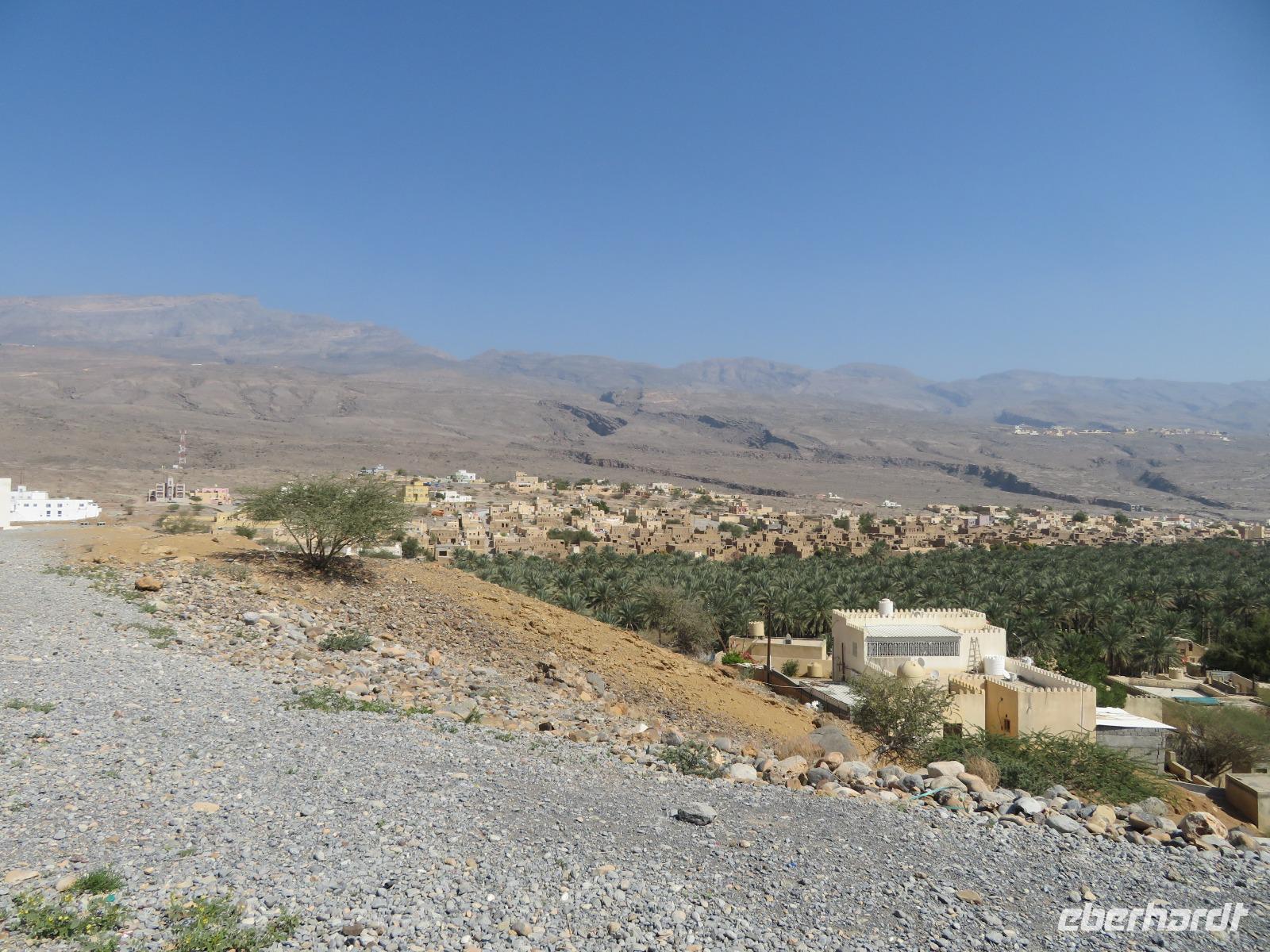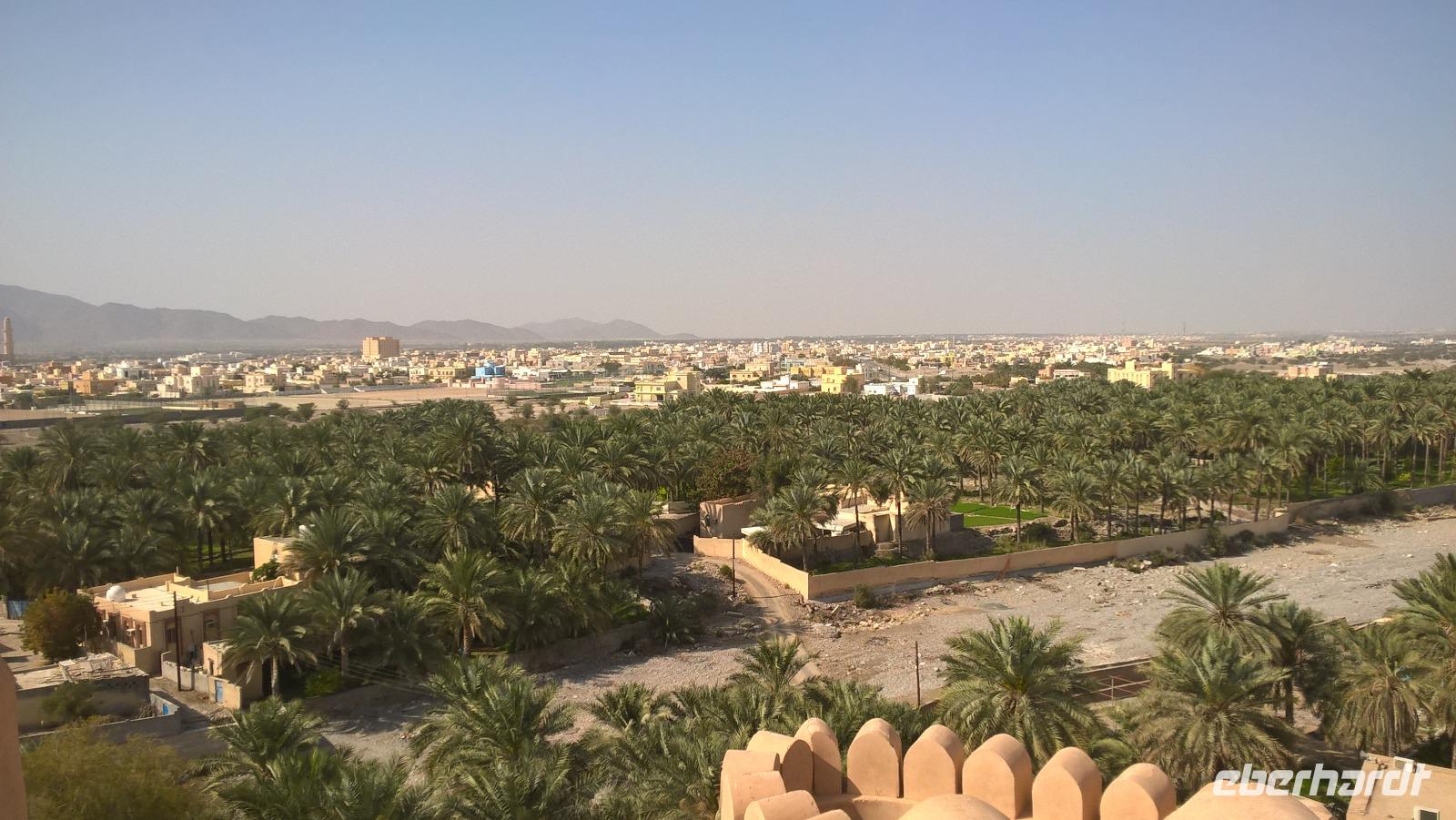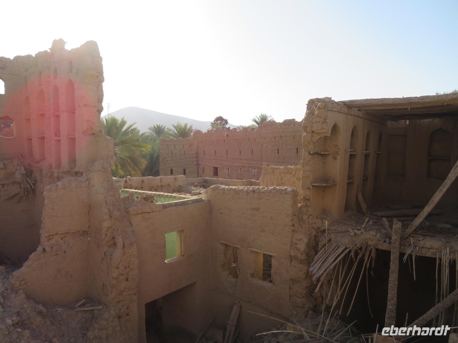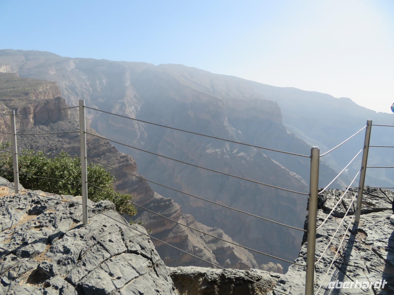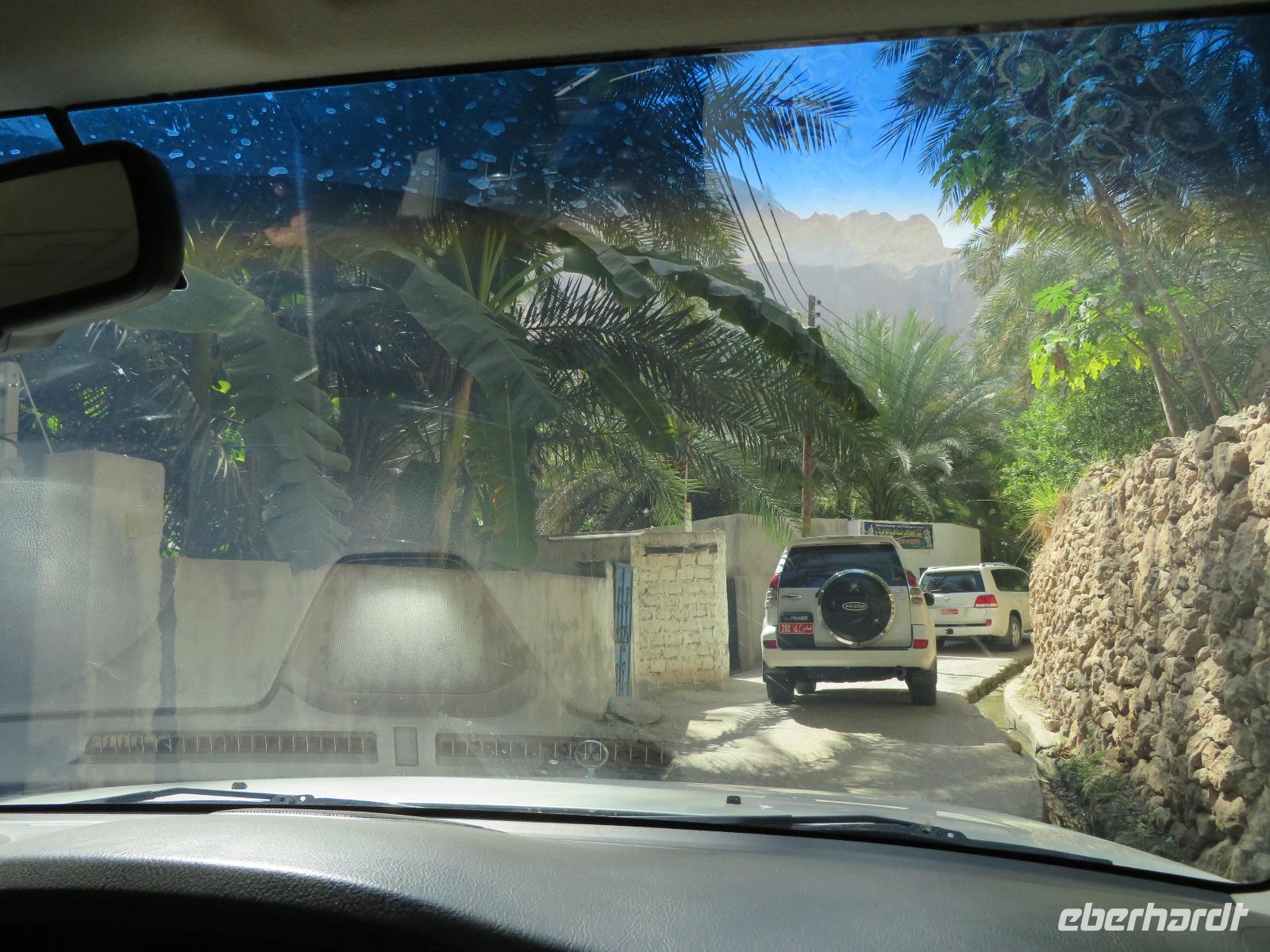 Wir begrüßen unseren neuen Reiseleiter Asa'd, einen jungen Omani, der fünf Jahre in Deutschland studiert hat. Mit ihm fahren wir zur Grenze der Vereinigten Arabischen Emirate an der wir zunächst einmal ausreisen um in das Sultanat Oman einzureisen. In den nächsten 7 Tagen reisen wir durch das aufstrebende Land unter der Herrschaft des Sultans Qaboos bin Said Al-Said. Dieser investiert nicht nur in die Zukunft des Landes sondern auch in die deren Landesbewohner. Asa'd erzählt uns, dass er mithilfe der finanziellen Unterstützung des Sultans für Absolventen im Deutschland studieren konnte. Nachdem wir unsere Arabischen Dirham in Omainische Rial getauscht haben besichtigen wir das Schloss von Jabrin aus dem Jahre 1670, das ehemals als Wohnschloss und Sommerresidenz gedacht war. Nachdem es zu Streitigkeiten mit seinem Bruder kam beschloss Sultan Bilarab bin Sultan al-Yaarub es mit Wehrmauern und Türmen zu erweitern. Man kann sich vorstellen, wie hier gelebt wurde. Es rentiert sich auch einen Blick nach oben auf die schön verzierte Holzdecke zu werfen. Ebenso beeindruckend ist das Fort von Bahla. Die Festung wurde wahrscheinlich von den Nabhani im 17. Jahrhundert aus Lehm erbaut und zählt seit 1978 als einzige osmanische Festung zum Weltkulturerbe. Eine 12 Kilometer lange Mauer umgibt die Festung. Wir fahren heute bis nach Al Hamra mit unserem Reisebus und steigen dann in Jeeps um. Diese bringen uns auf 1400 Meter Höhe, zu unserem heutigen Hotel. Der Blick von oben ist einfach unglaublich und ist die holprige Fahrt mehr als wert.