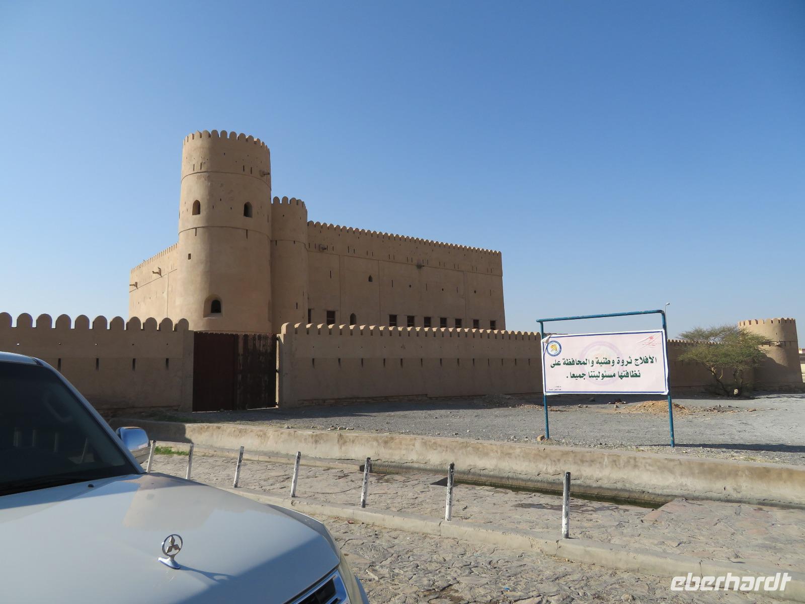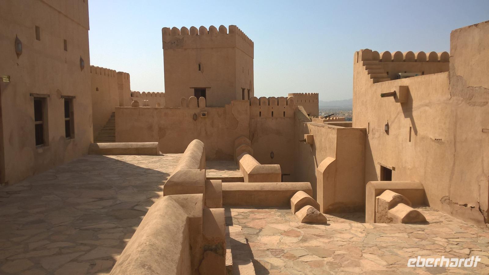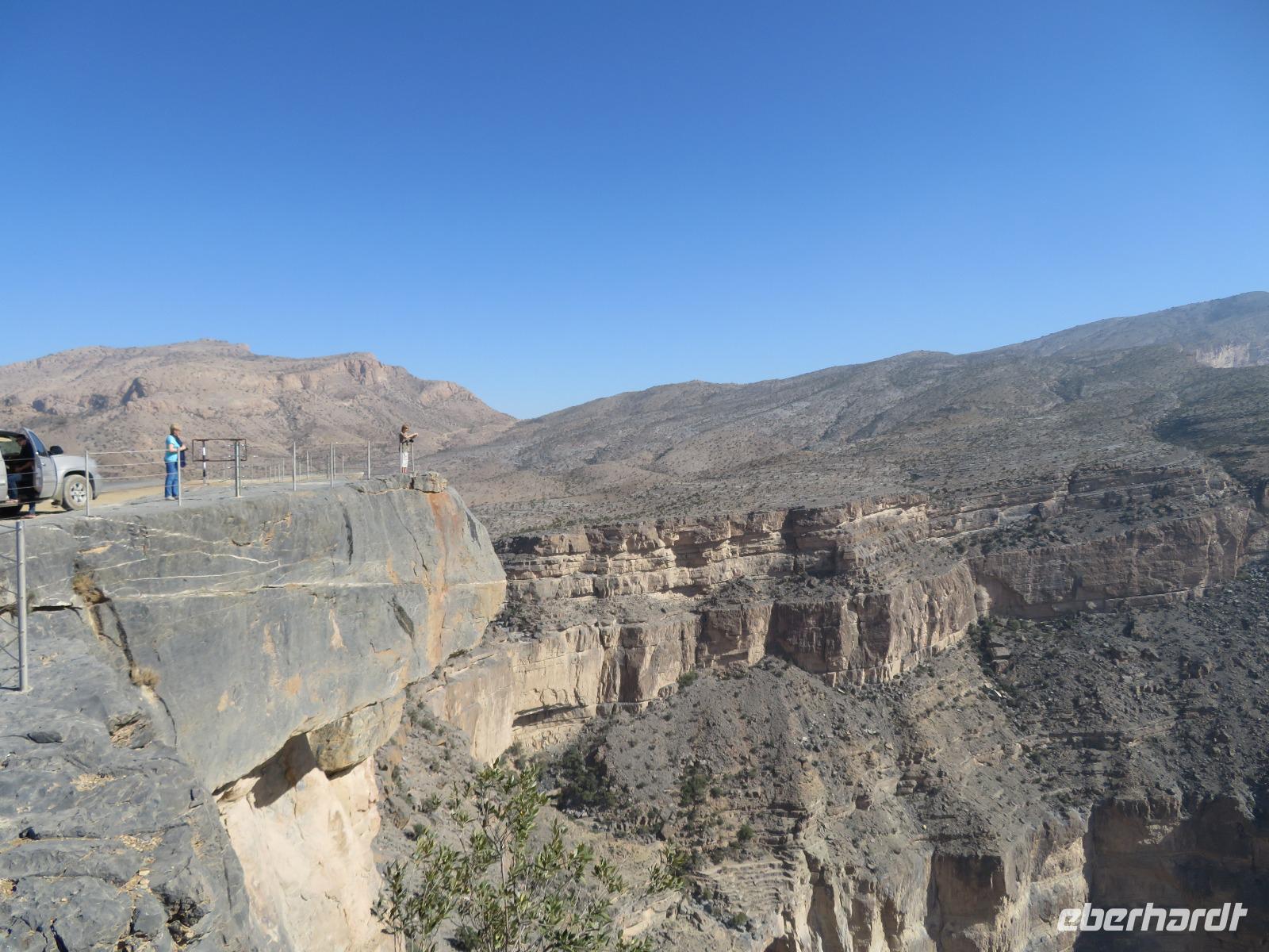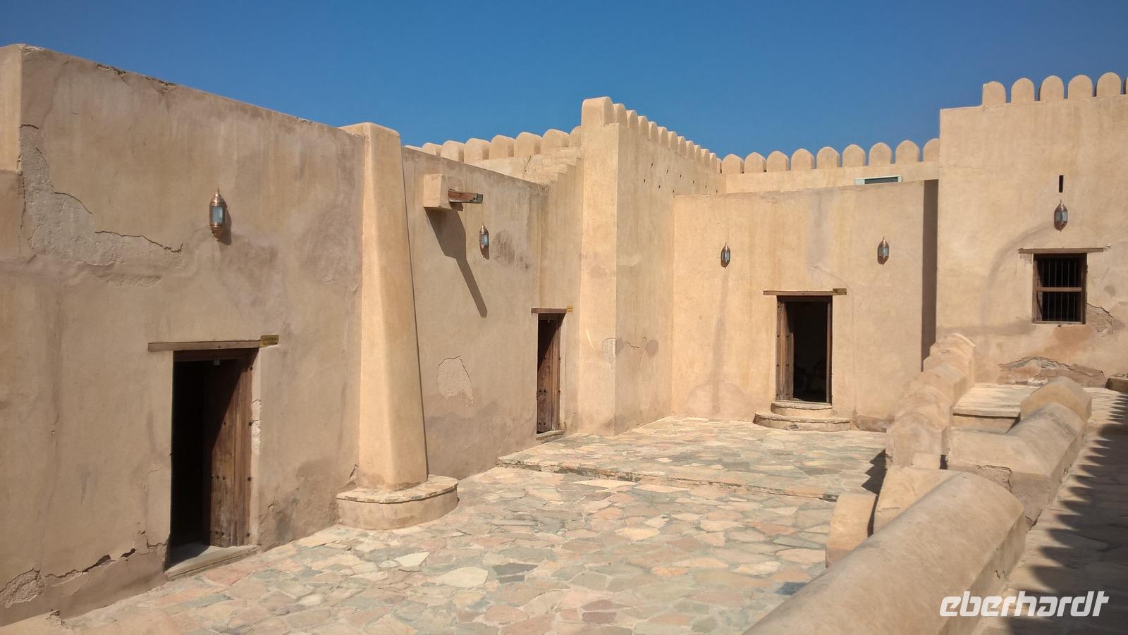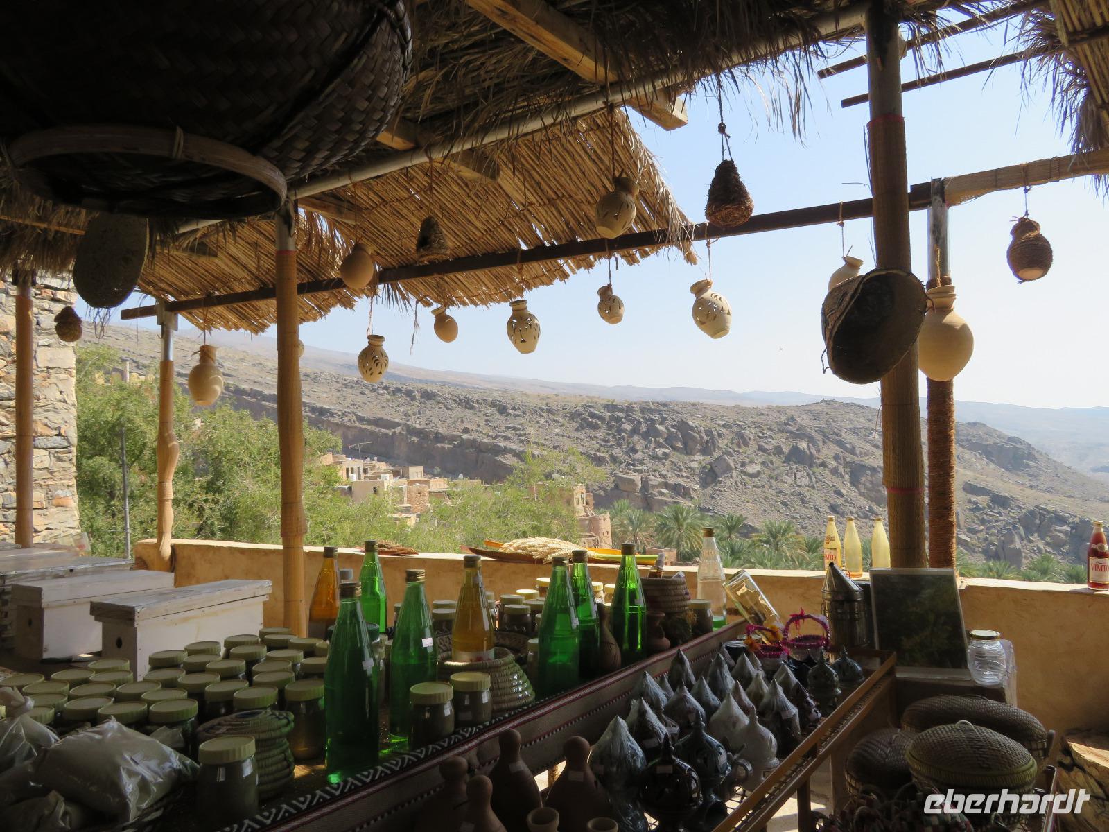 Wir begrüßen unseren neuen Reiseleiter Asa'd, einen jungen Omani, der fünf Jahre in Deutschland studiert hat. Mit ihm fahren wir zur Grenze der Vereinigten Arabischen Emirate an der wir zunächst einmal ausreisen um in das Sultanat Oman einzureisen. In den nächsten 7 Tagen reisen wir durch das aufstrebende Land unter der Herrschaft des Sultans Qaboos bin Said Al-Said. Dieser investiert nicht nur in die Zukunft des Landes sondern auch in die deren Landesbewohner. Asa'd erzählt uns, dass er mithilfe der finanziellen Unterstützung des Sultans für Absolventen im Deutschland studieren konnte. Nachdem wir unsere Arabischen Dirham in Omainische Rial getauscht haben besichtigen wir das Schloss von Jabrin aus dem Jahre 1670, das ehemals als Wohnschloss und Sommerresidenz gedacht war. Nachdem es zu Streitigkeiten mit seinem Bruder kam beschloss Sultan Bilarab bin Sultan al-Yaarub es mit Wehrmauern und Türmen zu erweitern. Man kann sich vorstellen, wie hier gelebt wurde. Es rentiert sich auch einen Blick nach oben auf die schön verzierte Holzdecke zu werfen. Ebenso beeindruckend ist das Fort von Bahla. Die Festung wurde wahrscheinlich von den Nabhani im 17. Jahrhundert aus Lehm erbaut und zählt seit 1978 als einzige osmanische Festung zum Weltkulturerbe. Eine 12 Kilometer lange Mauer umgibt die Festung. Wir fahren heute bis nach Al Hamra mit unserem Reisebus und steigen dann in Jeeps um. Diese bringen uns auf 1400 Meter Höhe, zu unserem heutigen Hotel. Der Blick von oben ist einfach unglaublich und ist die holprige Fahrt mehr als wert.