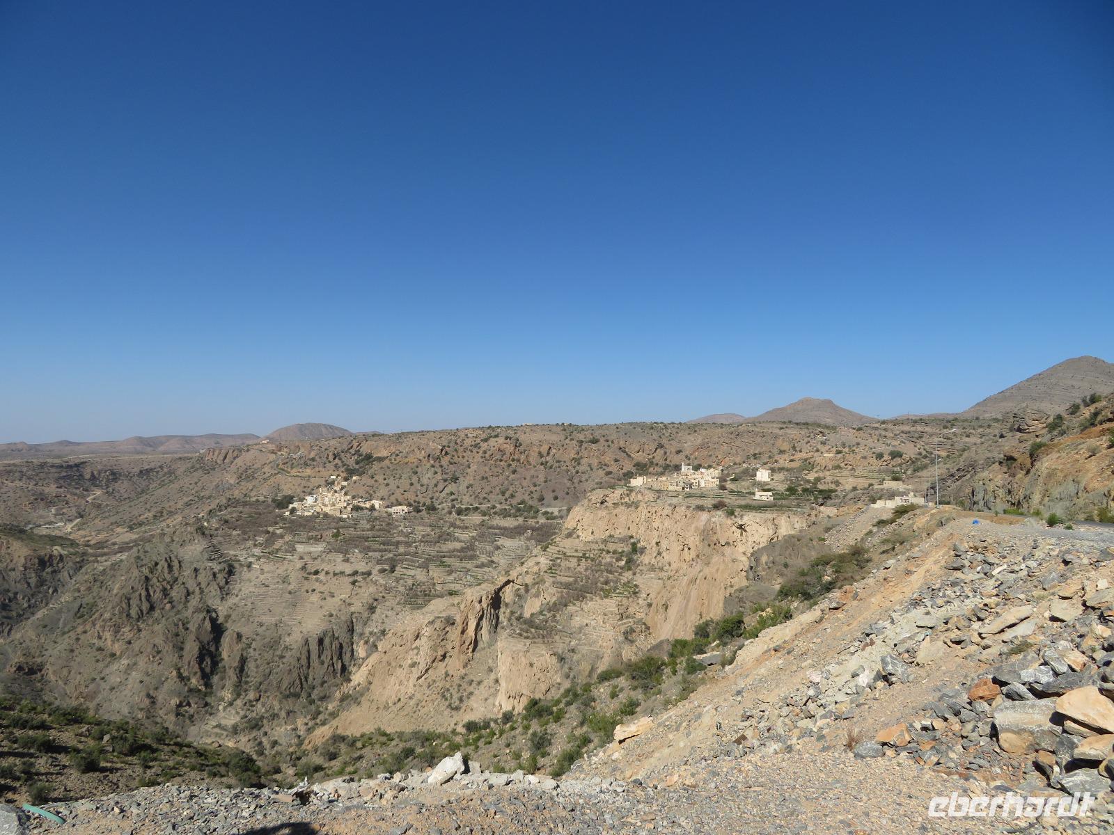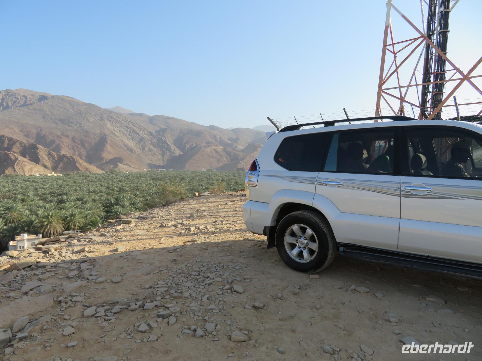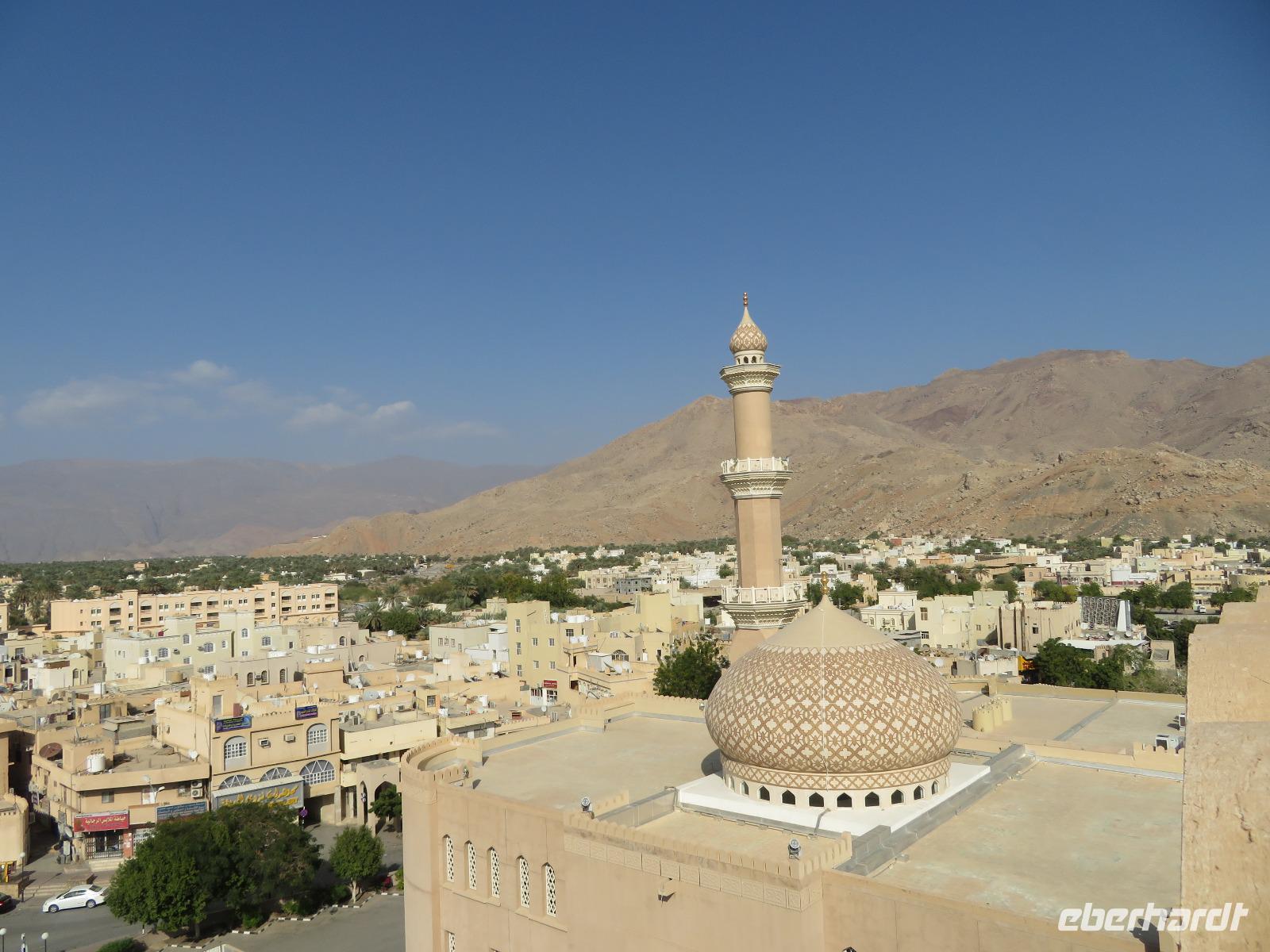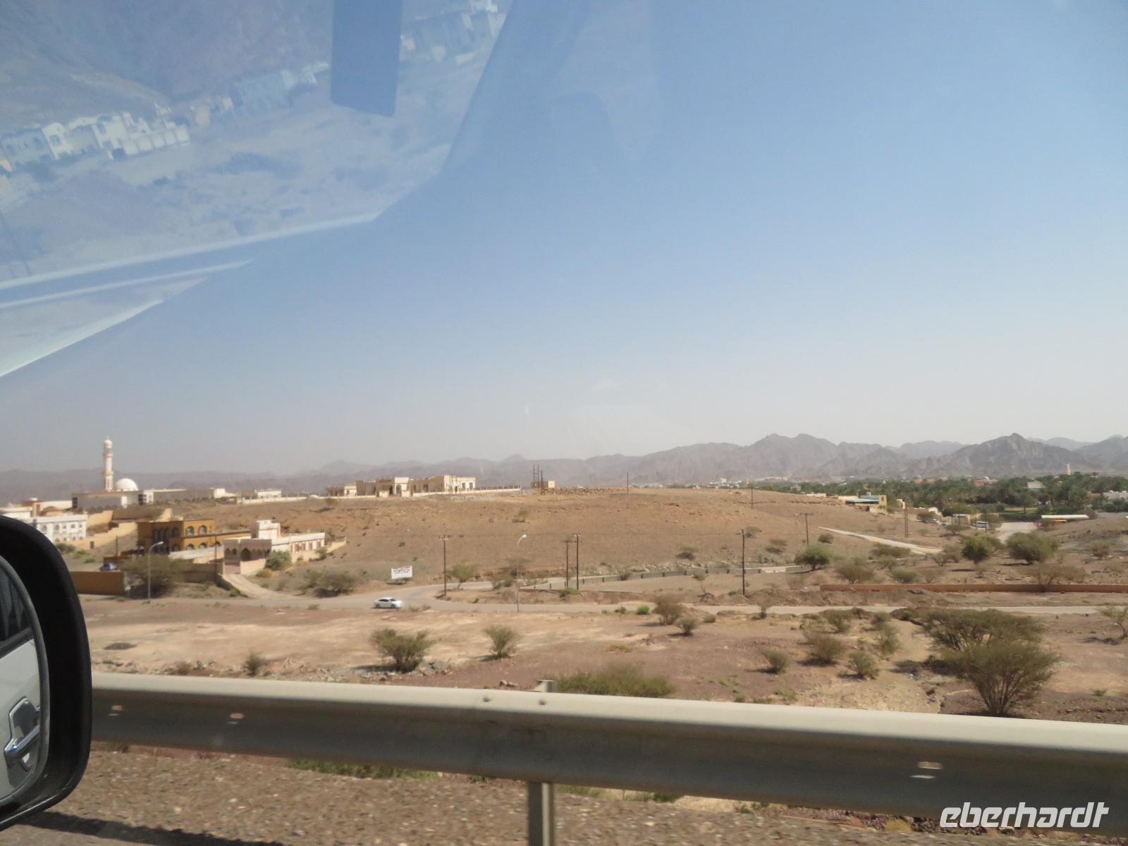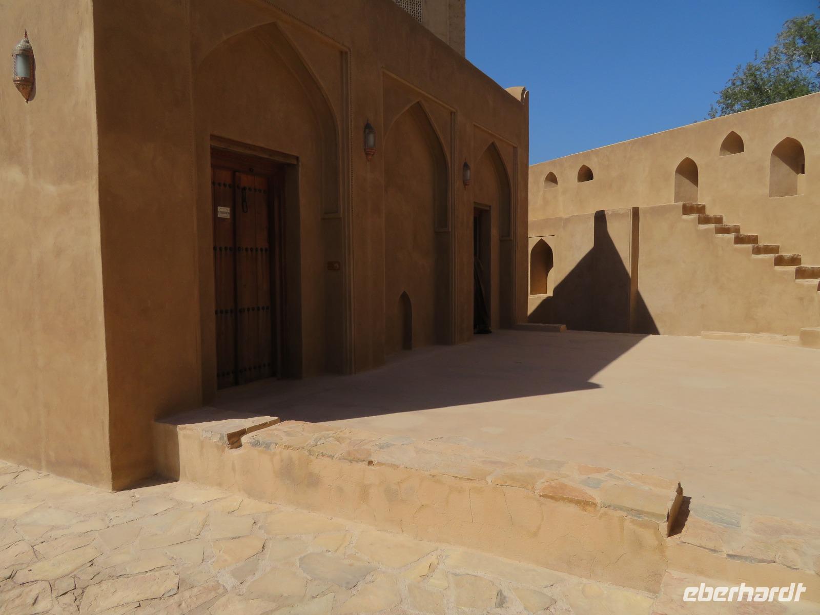 Wir begrüßen unseren neuen Reiseleiter Asa'd, einen jungen Omani, der fünf Jahre in Deutschland studiert hat. Mit ihm fahren wir zur Grenze der Vereinigten Arabischen Emirate an der wir zunächst einmal ausreisen um in das Sultanat Oman einzureisen. In den nächsten 7 Tagen reisen wir durch das aufstrebende Land unter der Herrschaft des Sultans Qaboos bin Said Al-Said. Dieser investiert nicht nur in die Zukunft des Landes sondern auch in die deren Landesbewohner. Asa'd erzählt uns, dass er mithilfe der finanziellen Unterstützung des Sultans für Absolventen im Deutschland studieren konnte. Nachdem wir unsere Arabischen Dirham in Omainische Rial getauscht haben besichtigen wir das Schloss von Jabrin aus dem Jahre 1670, das ehemals als Wohnschloss und Sommerresidenz gedacht war. Nachdem es zu Streitigkeiten mit seinem Bruder kam beschloss Sultan Bilarab bin Sultan al-Yaarub es mit Wehrmauern und Türmen zu erweitern. Man kann sich vorstellen, wie hier gelebt wurde. Es rentiert sich auch einen Blick nach oben auf die schön verzierte Holzdecke zu werfen. Ebenso beeindruckend ist das Fort von Bahla. Die Festung wurde wahrscheinlich von den Nabhani im 17. Jahrhundert aus Lehm erbaut und zählt seit 1978 als einzige osmanische Festung zum Weltkulturerbe. Eine 12 Kilometer lange Mauer umgibt die Festung. Wir fahren heute bis nach Al Hamra mit unserem Reisebus und steigen dann in Jeeps um. Diese bringen uns auf 1400 Meter Höhe, zu unserem heutigen Hotel. Der Blick von oben ist einfach unglaublich und ist die holprige Fahrt mehr als wert.