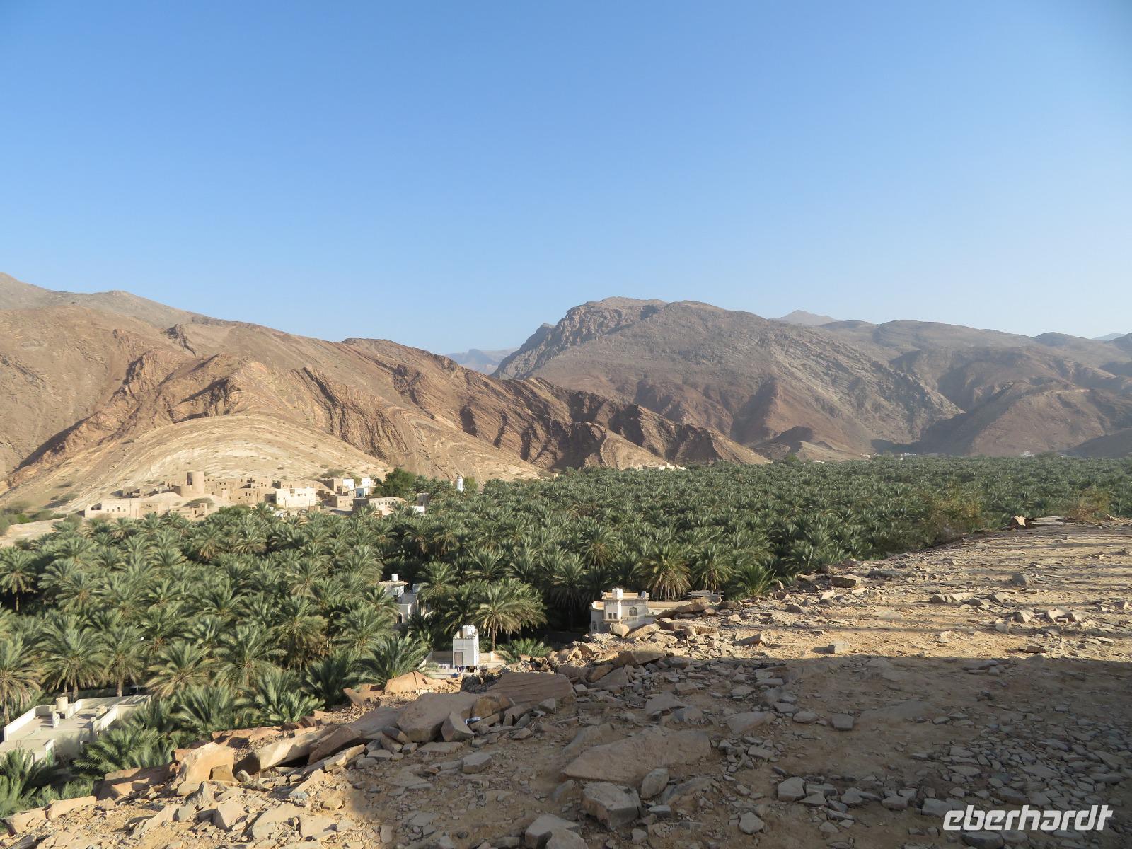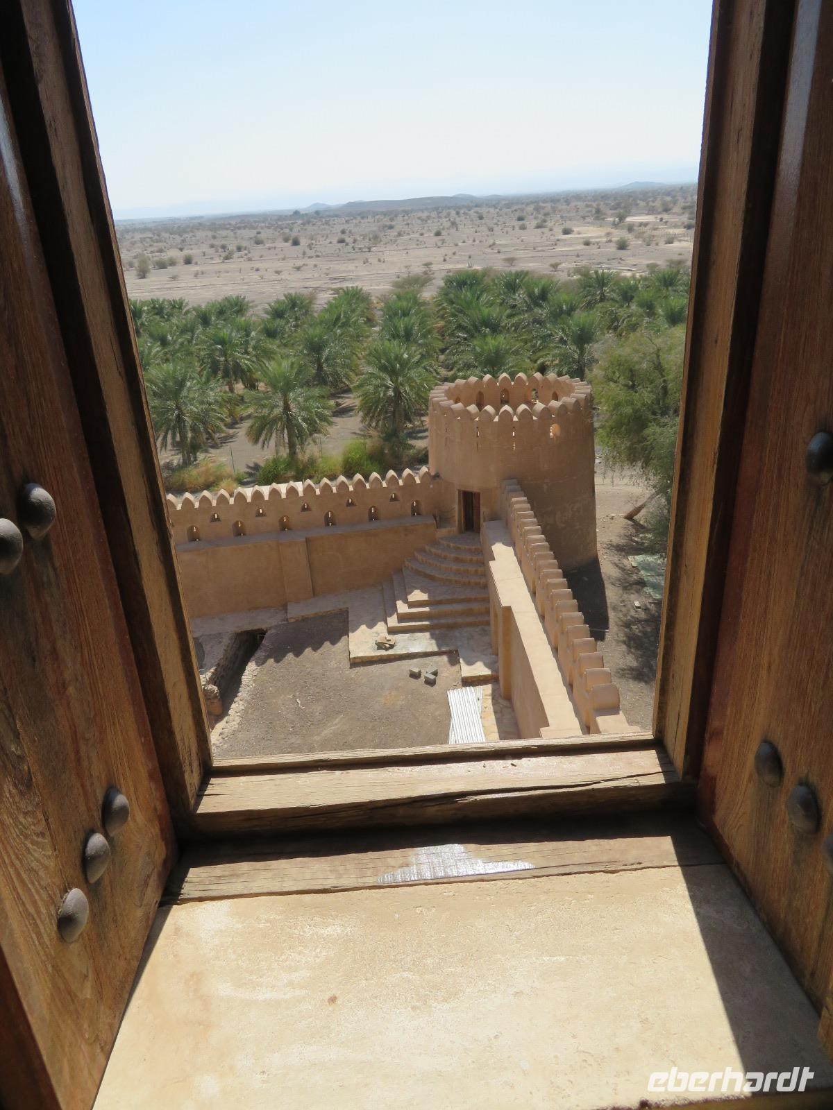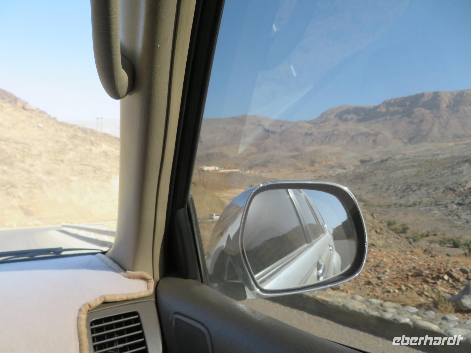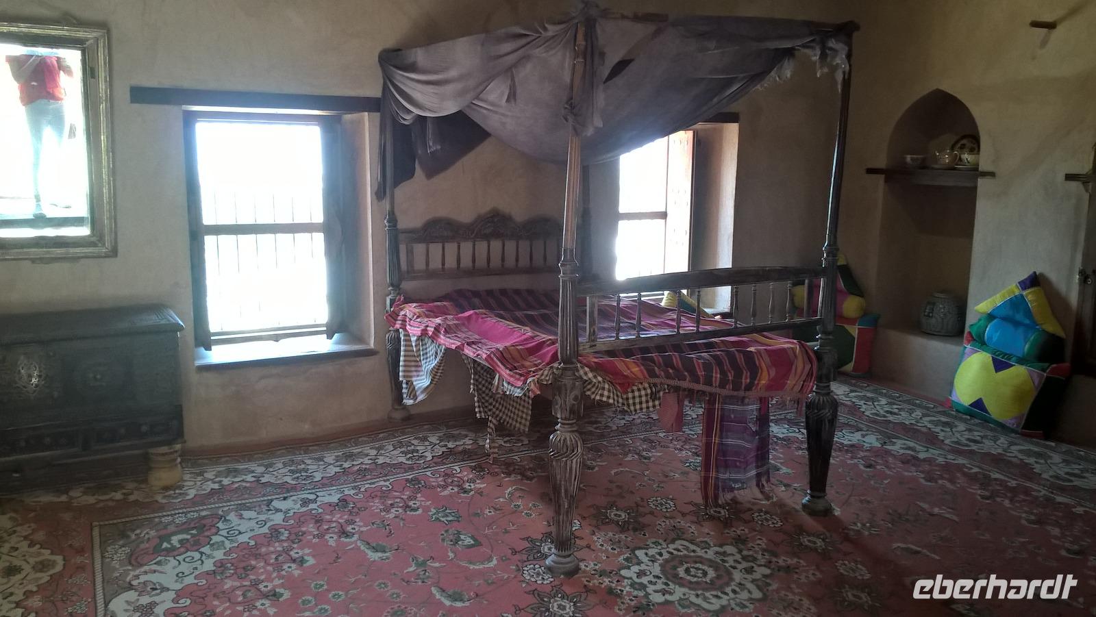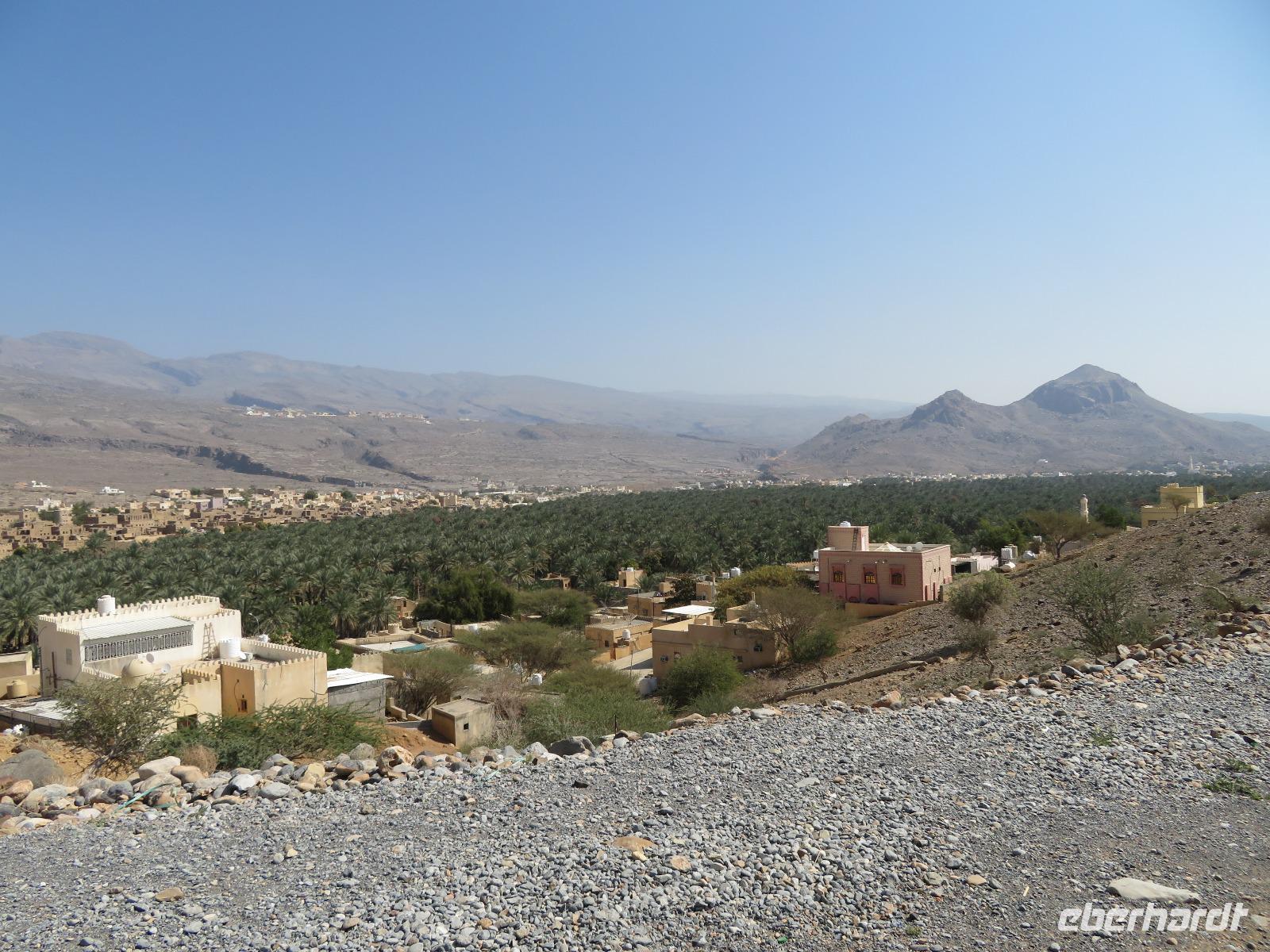 Wir begrüßen unseren neuen Reiseleiter Asa'd, einen jungen Omani, der fünf Jahre in Deutschland studiert hat. Mit ihm fahren wir zur Grenze der Vereinigten Arabischen Emirate an der wir zunächst einmal ausreisen um in das Sultanat Oman einzureisen. In den nächsten 7 Tagen reisen wir durch das aufstrebende Land unter der Herrschaft des Sultans Qaboos bin Said Al-Said. Dieser investiert nicht nur in die Zukunft des Landes sondern auch in die deren Landesbewohner. Asa'd erzählt uns, dass er mithilfe der finanziellen Unterstützung des Sultans für Absolventen im Deutschland studieren konnte. Nachdem wir unsere Arabischen Dirham in Omainische Rial getauscht haben besichtigen wir das Schloss von Jabrin aus dem Jahre 1670, das ehemals als Wohnschloss und Sommerresidenz gedacht war. Nachdem es zu Streitigkeiten mit seinem Bruder kam beschloss Sultan Bilarab bin Sultan al-Yaarub es mit Wehrmauern und Türmen zu erweitern. Man kann sich vorstellen, wie hier gelebt wurde. Es rentiert sich auch einen Blick nach oben auf die schön verzierte Holzdecke zu werfen. Ebenso beeindruckend ist das Fort von Bahla. Die Festung wurde wahrscheinlich von den Nabhani im 17. Jahrhundert aus Lehm erbaut und zählt seit 1978 als einzige osmanische Festung zum Weltkulturerbe. Eine 12 Kilometer lange Mauer umgibt die Festung. Wir fahren heute bis nach Al Hamra mit unserem Reisebus und steigen dann in Jeeps um. Diese bringen uns auf 1400 Meter Höhe, zu unserem heutigen Hotel. Der Blick von oben ist einfach unglaublich und ist die holprige Fahrt mehr als wert.