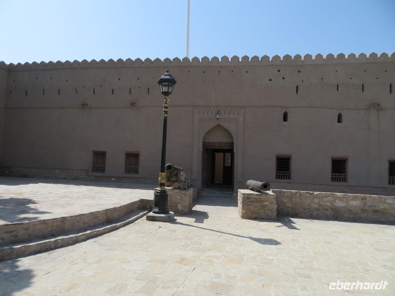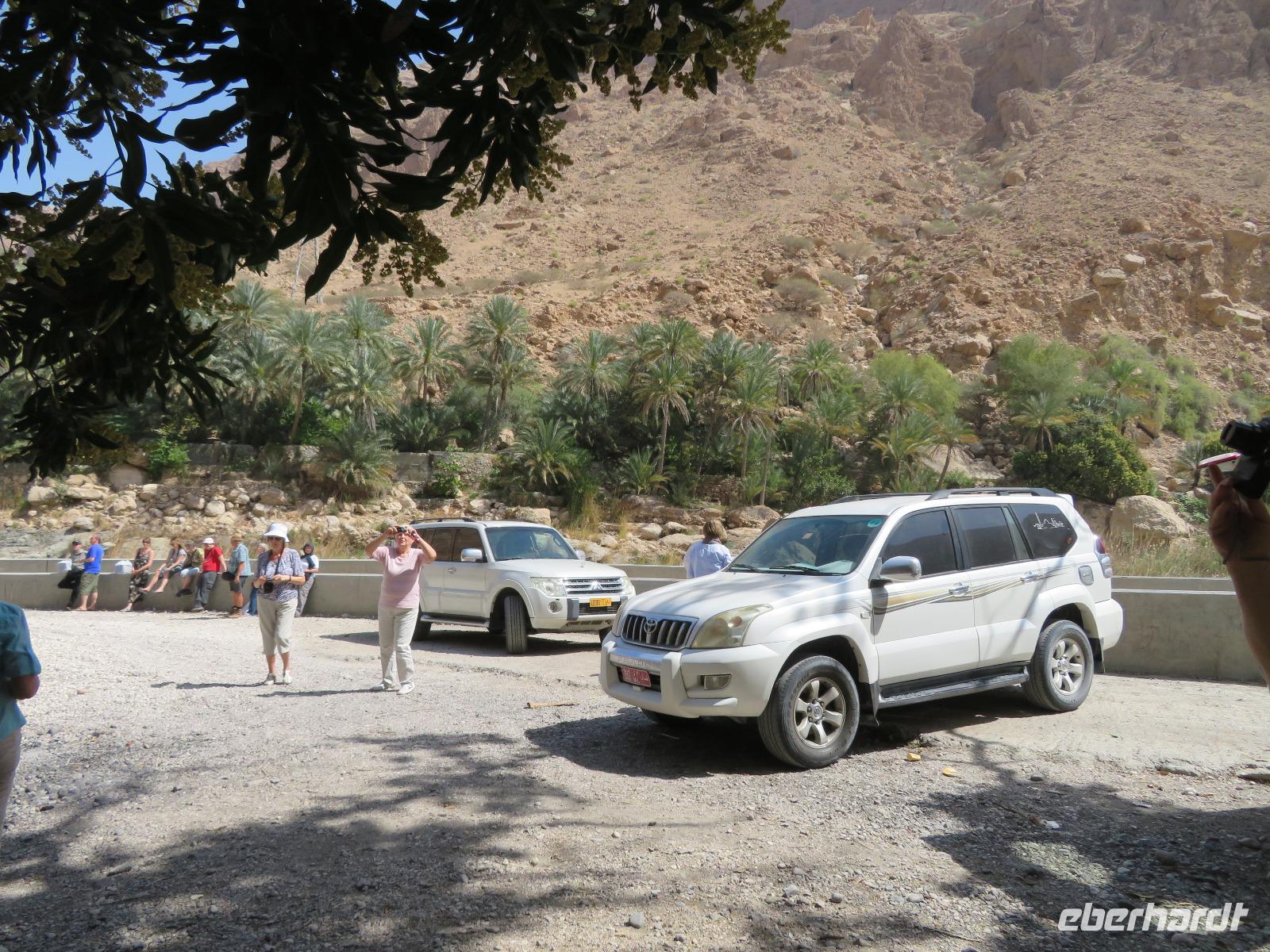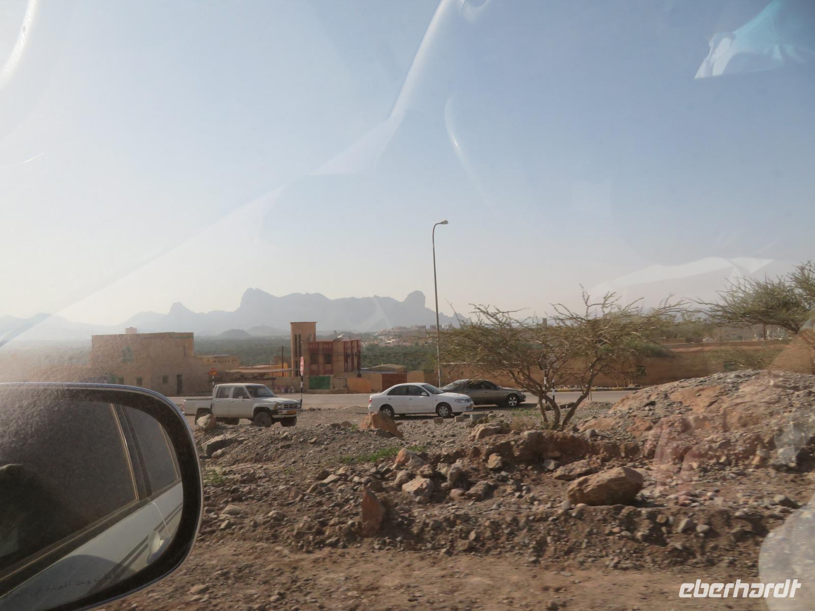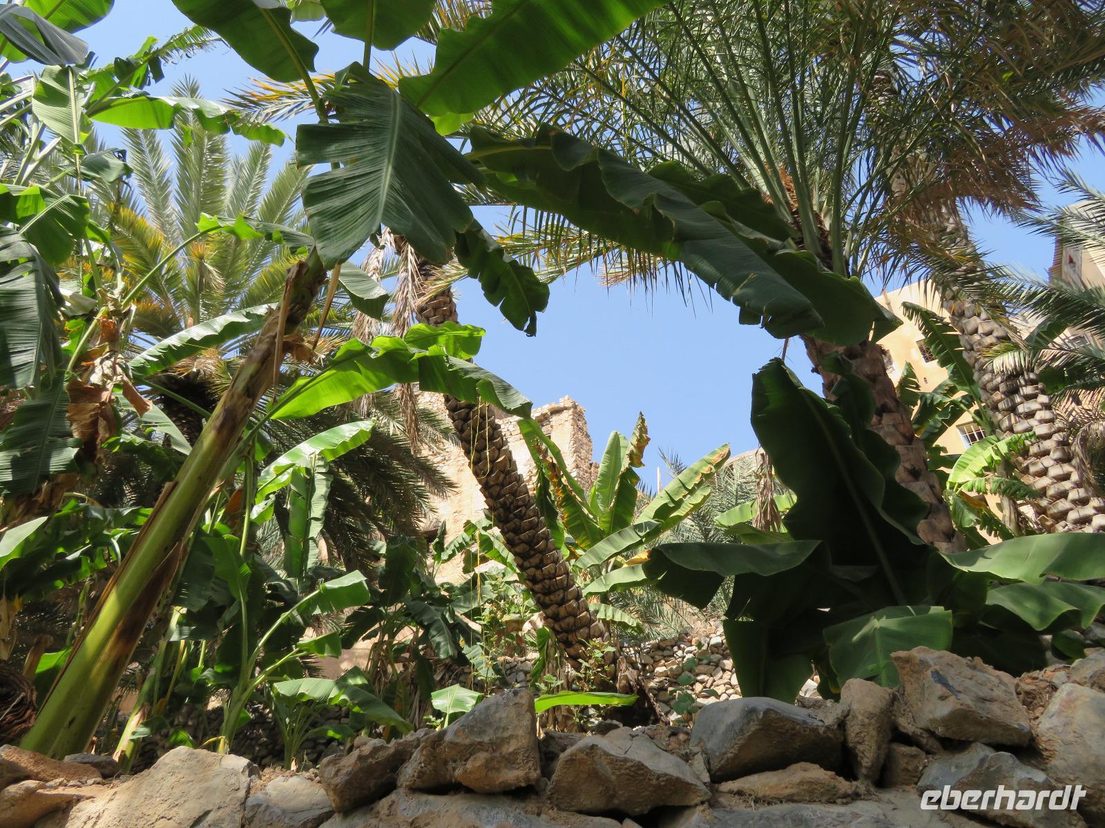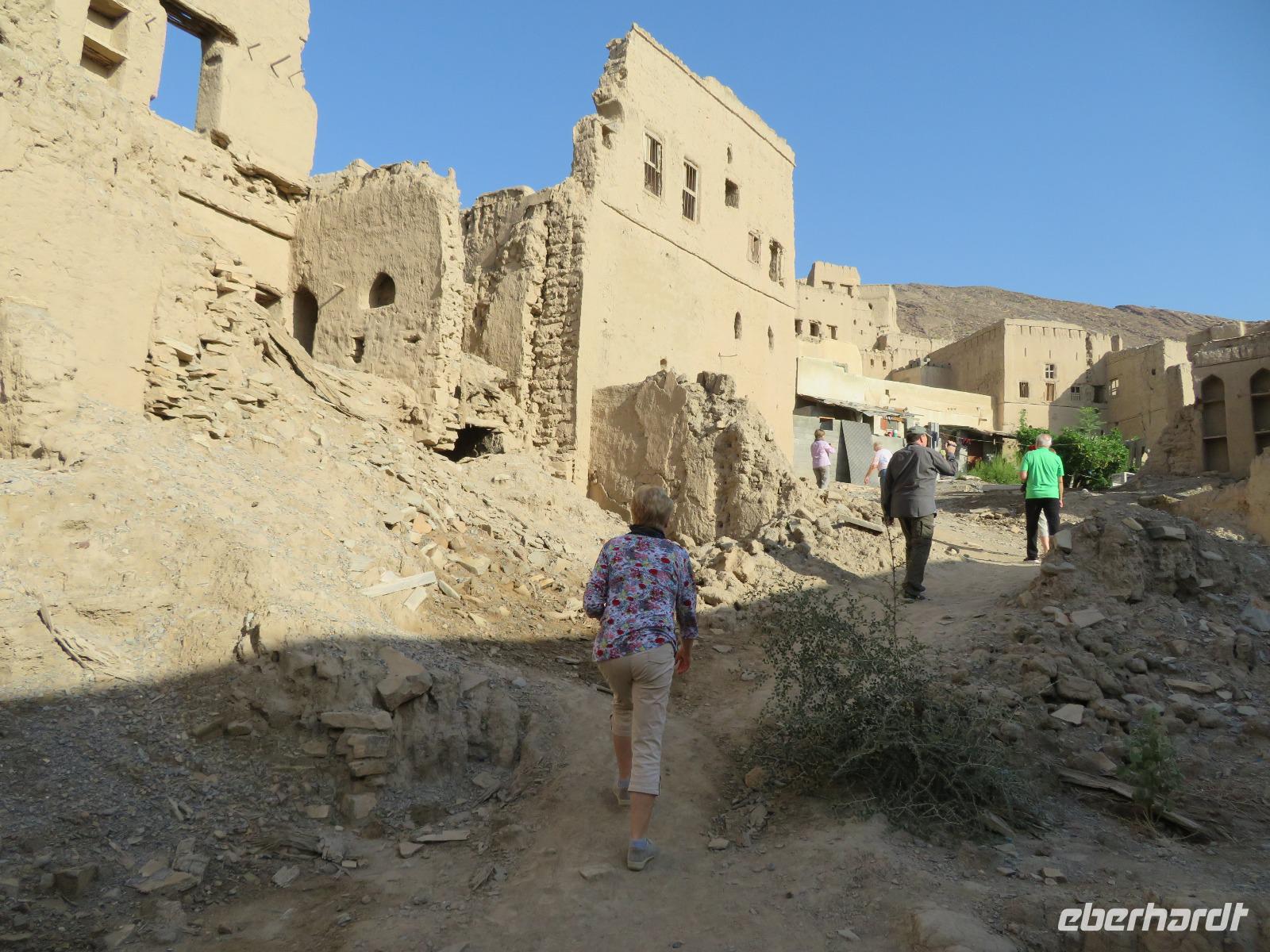 Wir begrüßen unseren neuen Reiseleiter Asa'd, einen jungen Omani, der fünf Jahre in Deutschland studiert hat. Mit ihm fahren wir zur Grenze der Vereinigten Arabischen Emirate an der wir zunächst einmal ausreisen um in das Sultanat Oman einzureisen. In den nächsten 7 Tagen reisen wir durch das aufstrebende Land unter der Herrschaft des Sultans Qaboos bin Said Al-Said. Dieser investiert nicht nur in die Zukunft des Landes sondern auch in die deren Landesbewohner. Asa'd erzählt uns, dass er mithilfe der finanziellen Unterstützung des Sultans für Absolventen im Deutschland studieren konnte. Nachdem wir unsere Arabischen Dirham in Omainische Rial getauscht haben besichtigen wir das Schloss von Jabrin aus dem Jahre 1670, das ehemals als Wohnschloss und Sommerresidenz gedacht war. Nachdem es zu Streitigkeiten mit seinem Bruder kam beschloss Sultan Bilarab bin Sultan al-Yaarub es mit Wehrmauern und Türmen zu erweitern. Man kann sich vorstellen, wie hier gelebt wurde. Es rentiert sich auch einen Blick nach oben auf die schön verzierte Holzdecke zu werfen. Ebenso beeindruckend ist das Fort von Bahla. Die Festung wurde wahrscheinlich von den Nabhani im 17. Jahrhundert aus Lehm erbaut und zählt seit 1978 als einzige osmanische Festung zum Weltkulturerbe. Eine 12 Kilometer lange Mauer umgibt die Festung. Wir fahren heute bis nach Al Hamra mit unserem Reisebus und steigen dann in Jeeps um. Diese bringen uns auf 1400 Meter Höhe, zu unserem heutigen Hotel. Der Blick von oben ist einfach unglaublich und ist die holprige Fahrt mehr als wert.