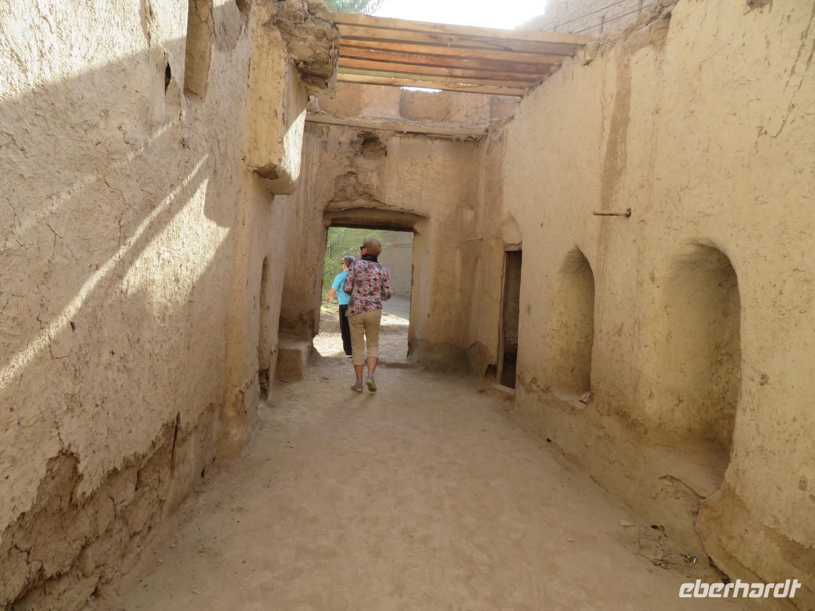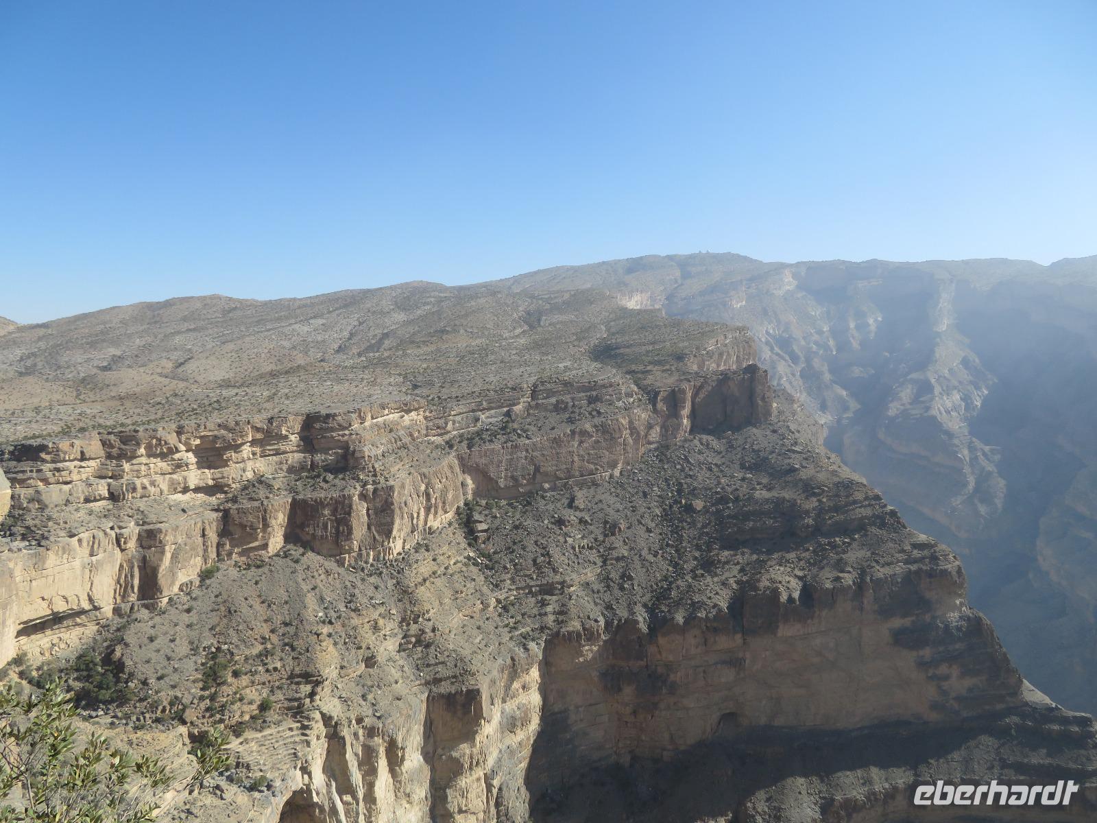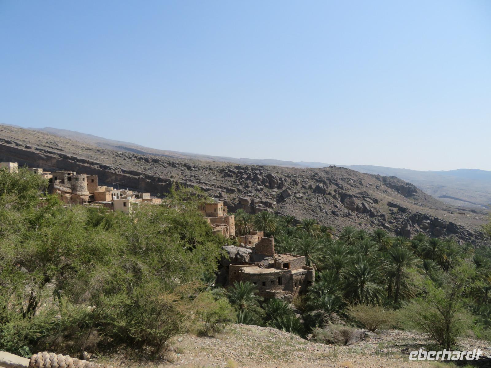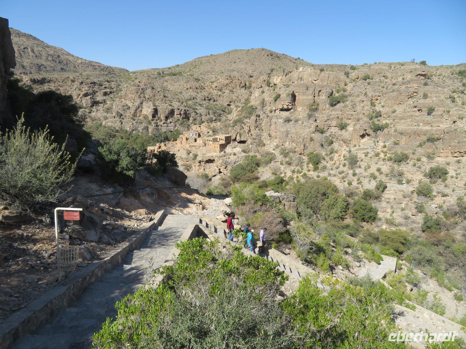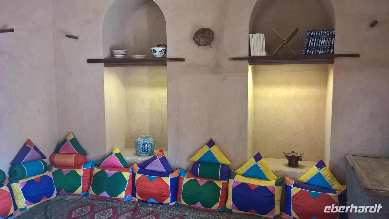 Wir begrüßen unseren neuen Reiseleiter Asa'd, einen jungen Omani, der fünf Jahre in Deutschland studiert hat. Mit ihm fahren wir zur Grenze der Vereinigten Arabischen Emirate an der wir zunächst einmal ausreisen um in das Sultanat Oman einzureisen. In den nächsten 7 Tagen reisen wir durch das aufstrebende Land unter der Herrschaft des Sultans Qaboos bin Said Al-Said. Dieser investiert nicht nur in die Zukunft des Landes sondern auch in die deren Landesbewohner. Asa'd erzählt uns, dass er mithilfe der finanziellen Unterstützung des Sultans für Absolventen im Deutschland studieren konnte. Nachdem wir unsere Arabischen Dirham in Omainische Rial getauscht haben besichtigen wir das Schloss von Jabrin aus dem Jahre 1670, das ehemals als Wohnschloss und Sommerresidenz gedacht war. Nachdem es zu Streitigkeiten mit seinem Bruder kam beschloss Sultan Bilarab bin Sultan al-Yaarub es mit Wehrmauern und Türmen zu erweitern. Man kann sich vorstellen, wie hier gelebt wurde. Es rentiert sich auch einen Blick nach oben auf die schön verzierte Holzdecke zu werfen. Ebenso beeindruckend ist das Fort von Bahla. Die Festung wurde wahrscheinlich von den Nabhani im 17. Jahrhundert aus Lehm erbaut und zählt seit 1978 als einzige osmanische Festung zum Weltkulturerbe. Eine 12 Kilometer lange Mauer umgibt die Festung. Wir fahren heute bis nach Al Hamra mit unserem Reisebus und steigen dann in Jeeps um. Diese bringen uns auf 1400 Meter Höhe, zu unserem heutigen Hotel. Der Blick von oben ist einfach unglaublich und ist die holprige Fahrt mehr als wert.
