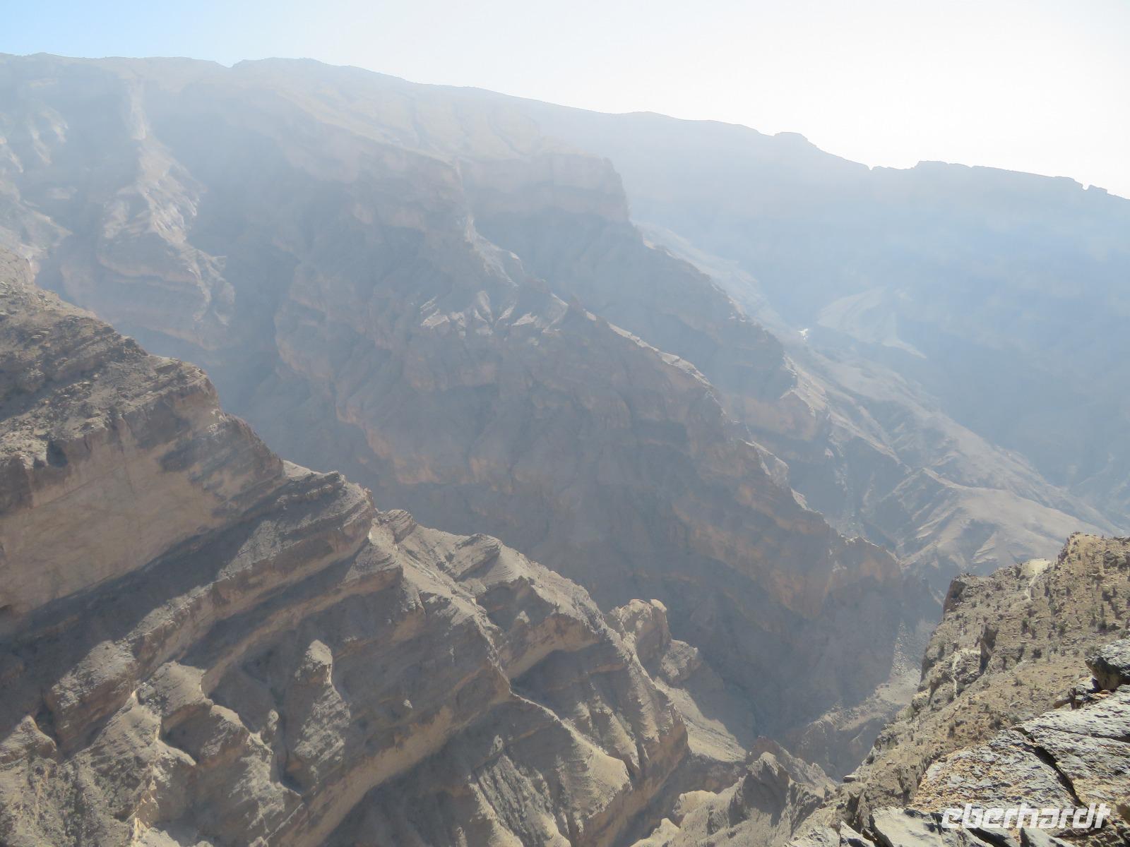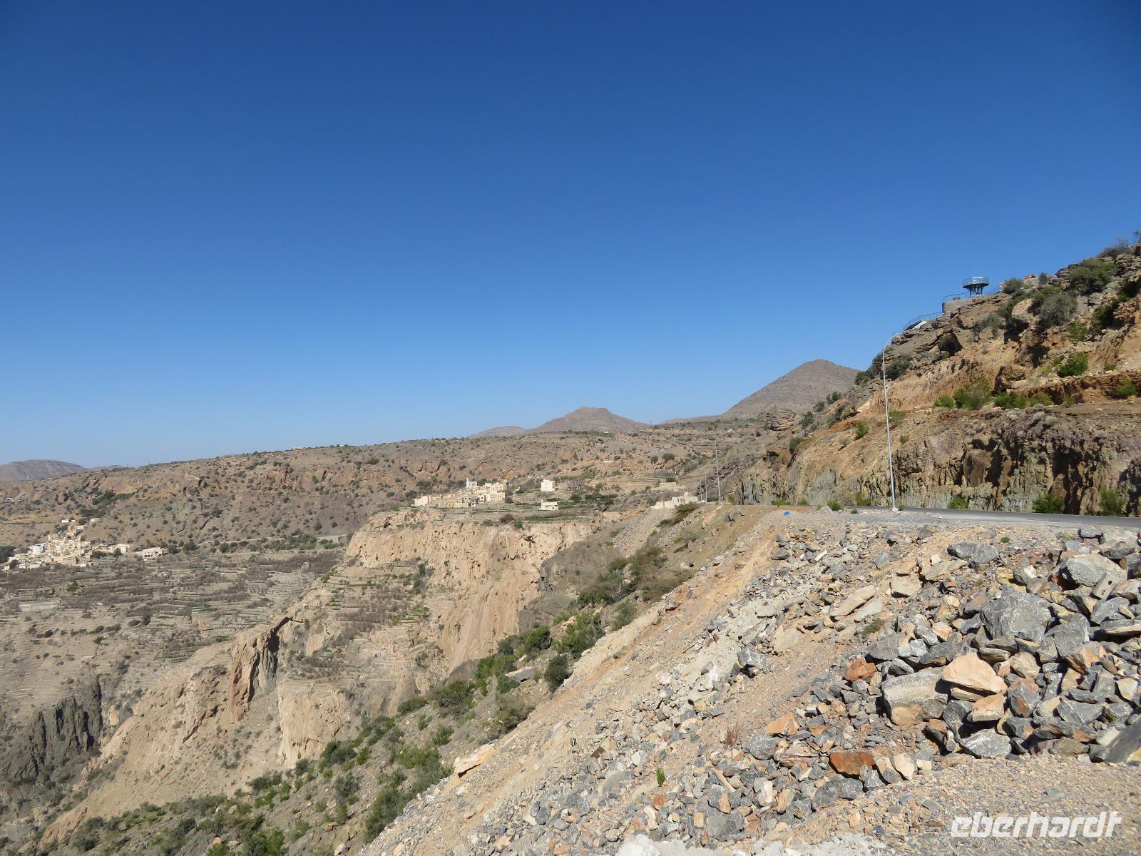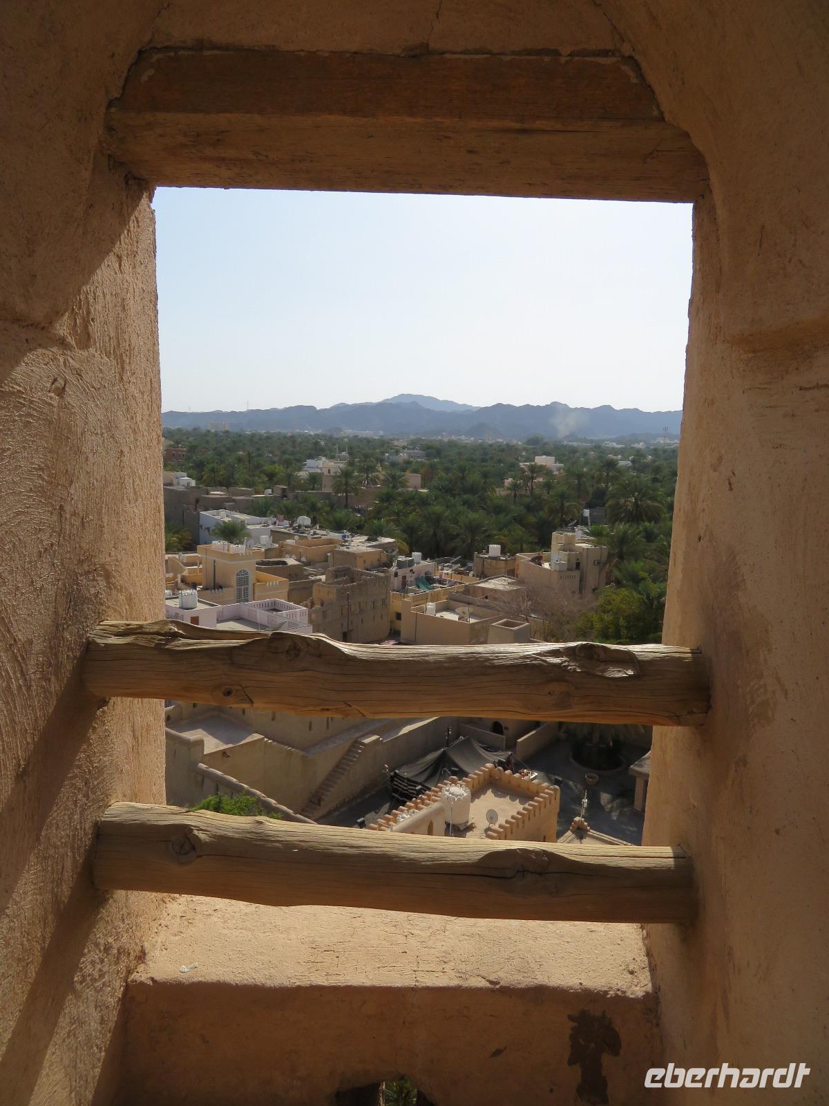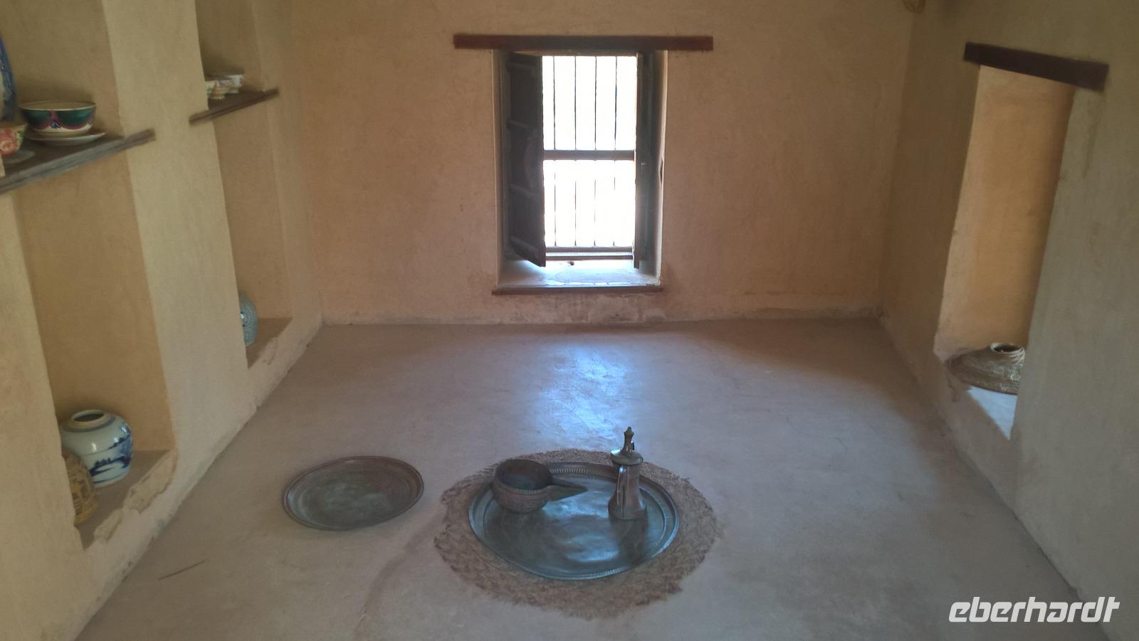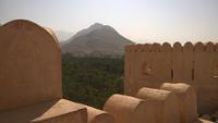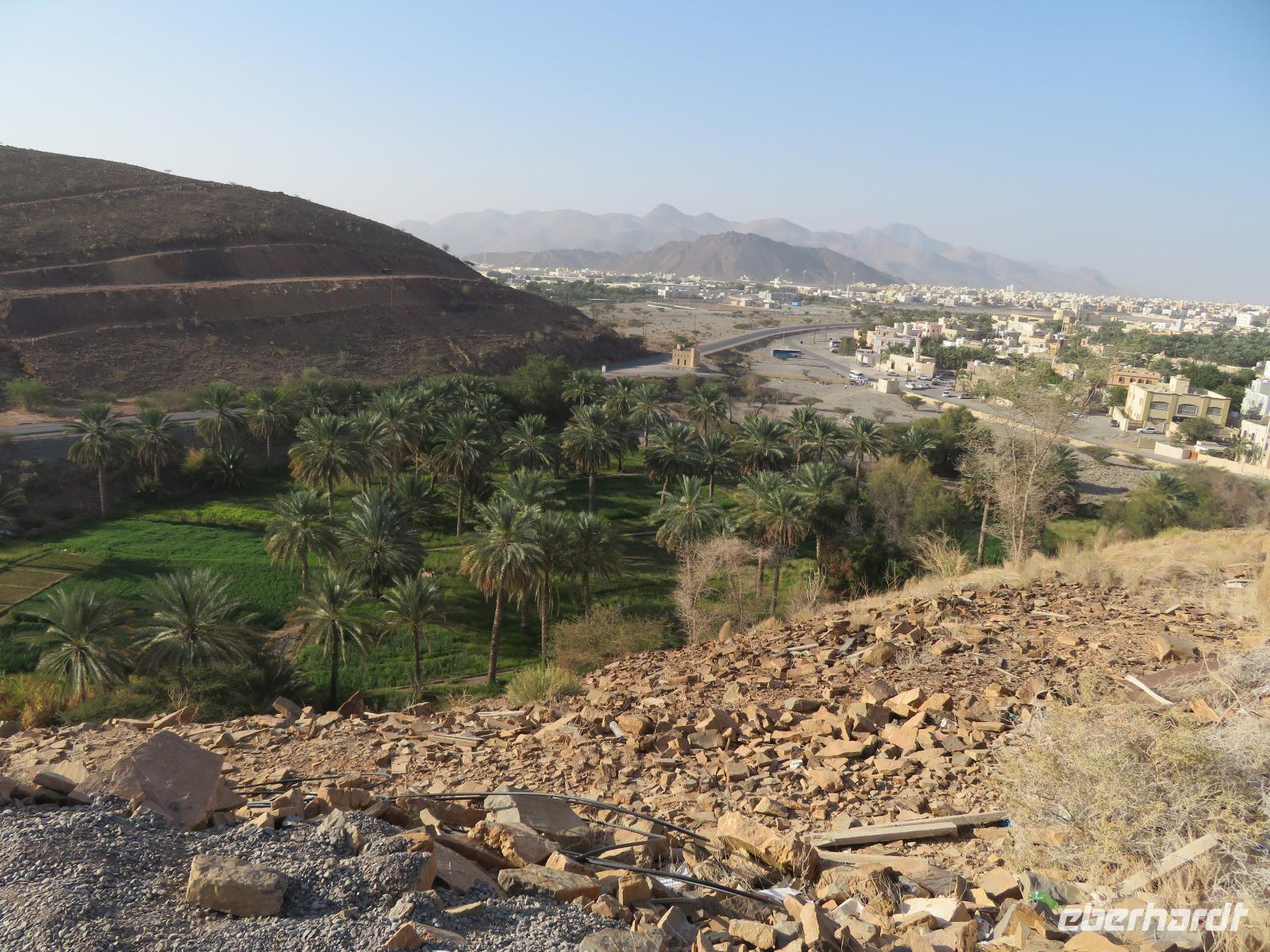 Wir begrüßen unseren neuen Reiseleiter Asa'd, einen jungen Omani, der fünf Jahre in Deutschland studiert hat. Mit ihm fahren wir zur Grenze der Vereinigten Arabischen Emirate an der wir zunächst einmal ausreisen um in das Sultanat Oman einzureisen. In den nächsten 7 Tagen reisen wir durch das aufstrebende Land unter der Herrschaft des Sultans Qaboos bin Said Al-Said. Dieser investiert nicht nur in die Zukunft des Landes sondern auch in die deren Landesbewohner. Asa'd erzählt uns, dass er mithilfe der finanziellen Unterstützung des Sultans für Absolventen im Deutschland studieren konnte. Nachdem wir unsere Arabischen Dirham in Omainische Rial getauscht haben besichtigen wir das Schloss von Jabrin aus dem Jahre 1670, das ehemals als Wohnschloss und Sommerresidenz gedacht war. Nachdem es zu Streitigkeiten mit seinem Bruder kam beschloss Sultan Bilarab bin Sultan al-Yaarub es mit Wehrmauern und Türmen zu erweitern. Man kann sich vorstellen, wie hier gelebt wurde. Es rentiert sich auch einen Blick nach oben auf die schön verzierte Holzdecke zu werfen. Ebenso beeindruckend ist das Fort von Bahla. Die Festung wurde wahrscheinlich von den Nabhani im 17. Jahrhundert aus Lehm erbaut und zählt seit 1978 als einzige osmanische Festung zum Weltkulturerbe. Eine 12 Kilometer lange Mauer umgibt die Festung. Wir fahren heute bis nach Al Hamra mit unserem Reisebus und steigen dann in Jeeps um. Diese bringen uns auf 1400 Meter Höhe, zu unserem heutigen Hotel. Der Blick von oben ist einfach unglaublich und ist die holprige Fahrt mehr als wert.