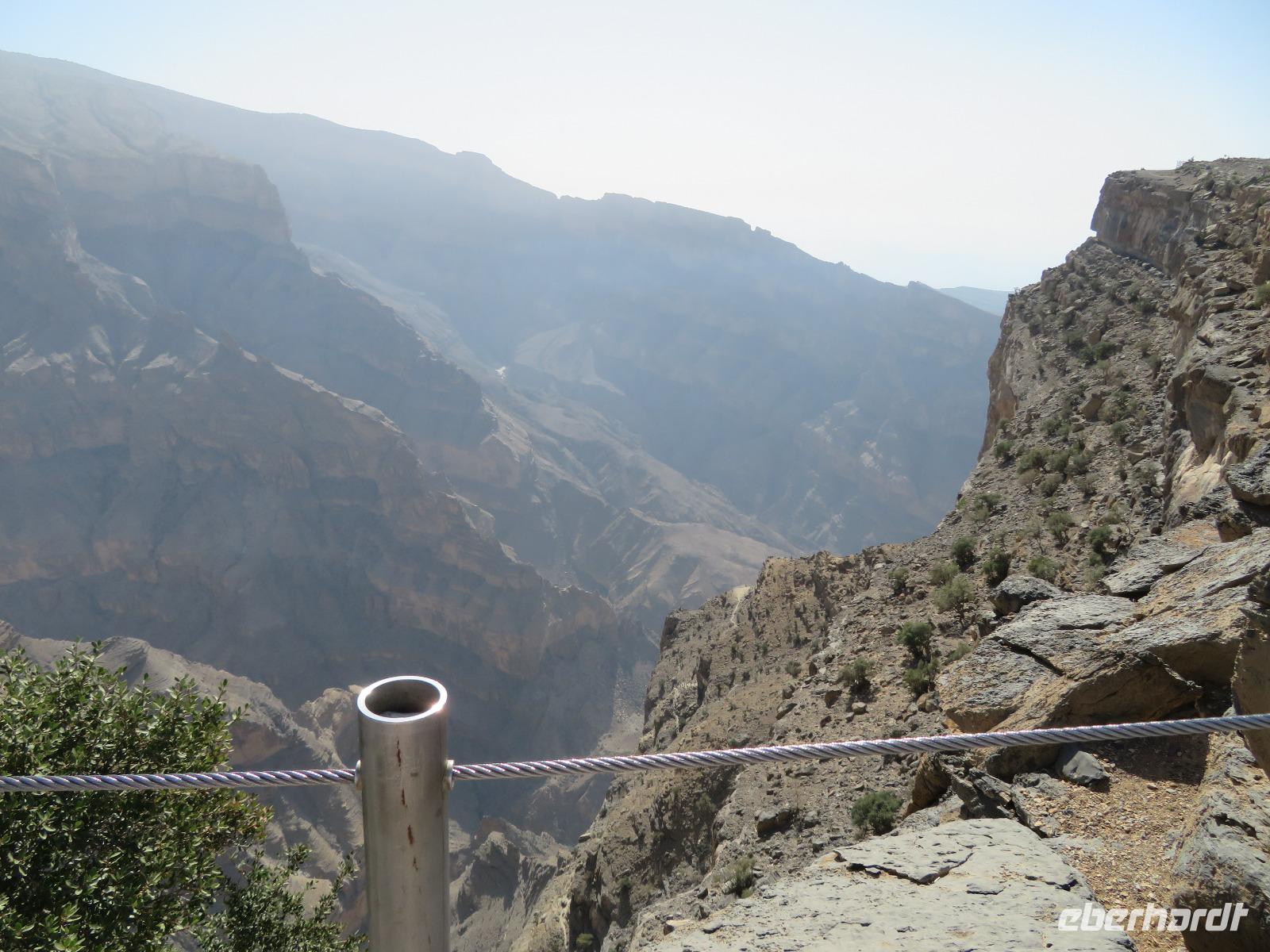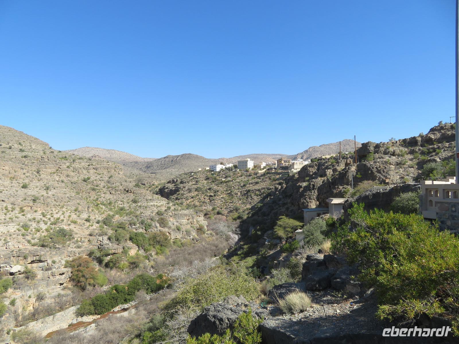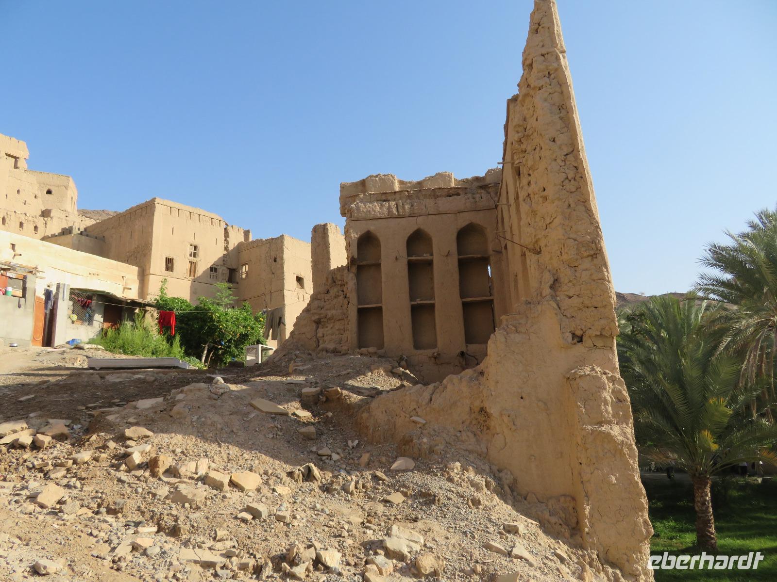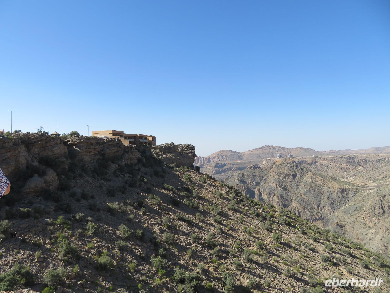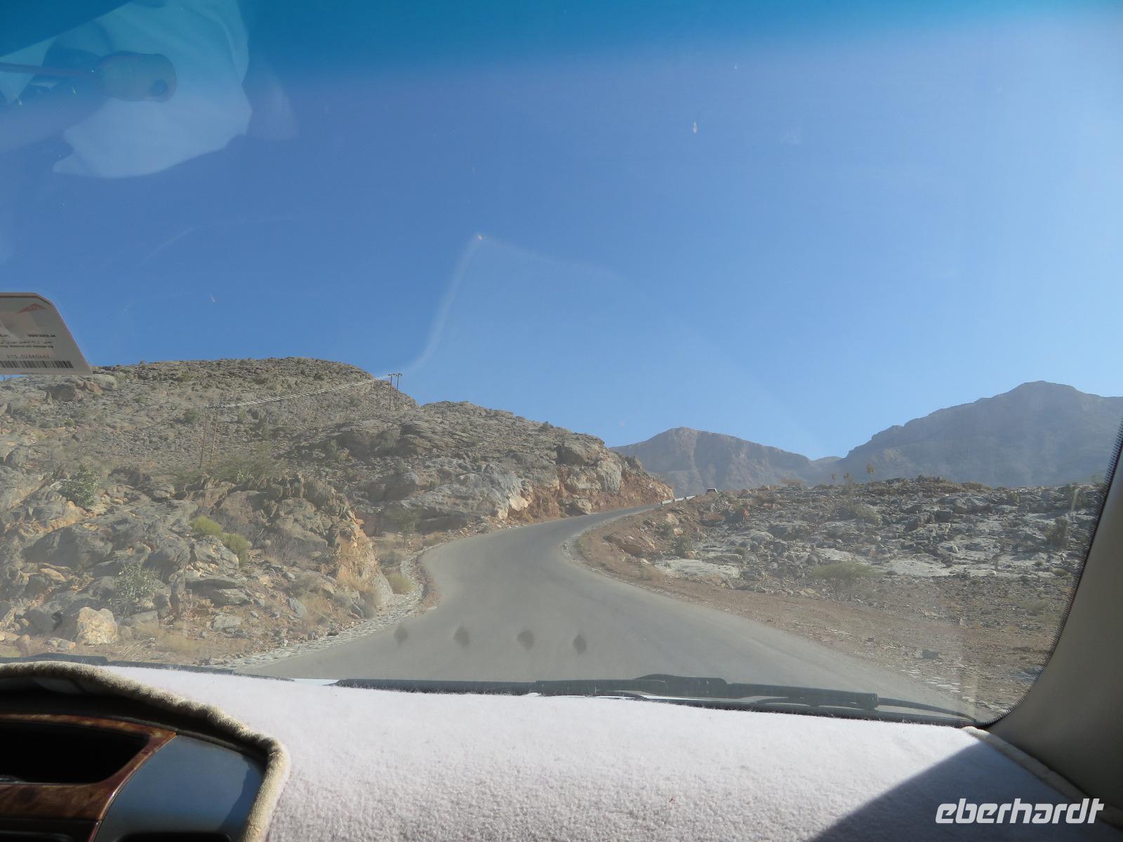Wir begrüßen unseren neuen Reiseleiter Asa'd, einen jungen Omani, der fünf Jahre in Deutschland studiert hat. Mit ihm fahren wir zur Grenze der Vereinigten Arabischen Emirate an der wir zunächst einmal ausreisen um in das Sultanat Oman einzureisen. In den nächsten 7 Tagen reisen wir durch das aufstrebende Land unter der Herrschaft des Sultans Qaboos bin Said Al-Said. Dieser investiert nicht nur in die Zukunft des Landes sondern auch in die deren Landesbewohner. Asa'd erzählt uns, dass er mithilfe der finanziellen Unterstützung des Sultans für Absolventen im Deutschland studieren konnte. Nachdem wir unsere Arabischen Dirham in Omainische Rial getauscht haben besichtigen wir das Schloss von Jabrin aus dem Jahre 1670, das ehemals als Wohnschloss und Sommerresidenz gedacht war. Nachdem es zu Streitigkeiten mit seinem Bruder kam beschloss Sultan Bilarab bin Sultan al-Yaarub es mit Wehrmauern und Türmen zu erweitern. Man kann sich vorstellen, wie hier gelebt wurde. Es rentiert sich auch einen Blick nach oben auf die schön verzierte Holzdecke zu werfen. Ebenso beeindruckend ist das Fort von Bahla. Die Festung wurde wahrscheinlich von den Nabhani im 17. Jahrhundert aus Lehm erbaut und zählt seit 1978 als einzige osmanische Festung zum Weltkulturerbe. Eine 12 Kilometer lange Mauer umgibt die Festung. Wir fahren heute bis nach Al Hamra mit unserem Reisebus und steigen dann in Jeeps um. Diese bringen uns auf 1400 Meter Höhe, zu unserem heutigen Hotel. Der Blick von oben ist einfach unglaublich und ist die holprige Fahrt mehr als wert.