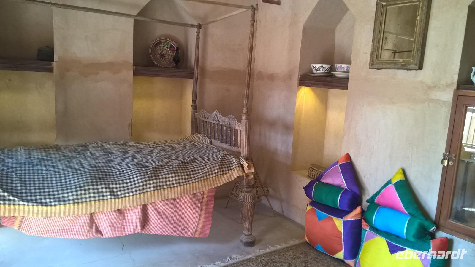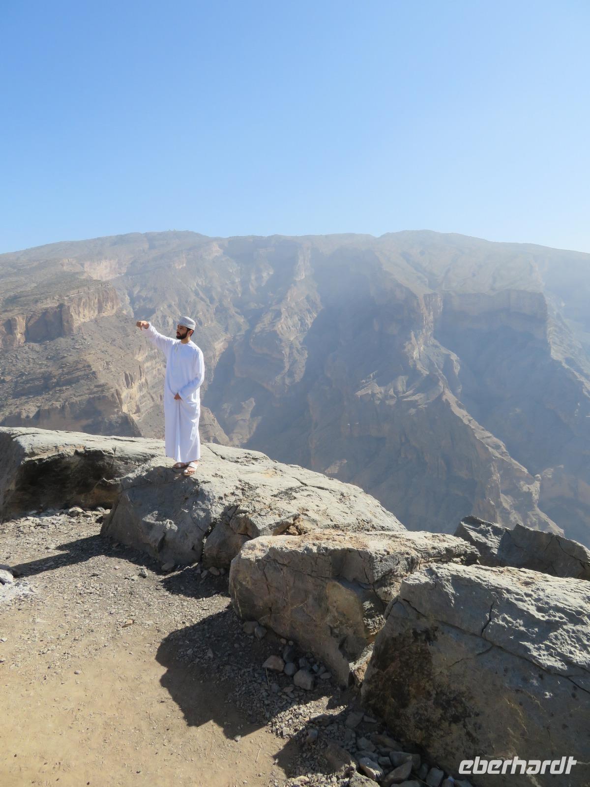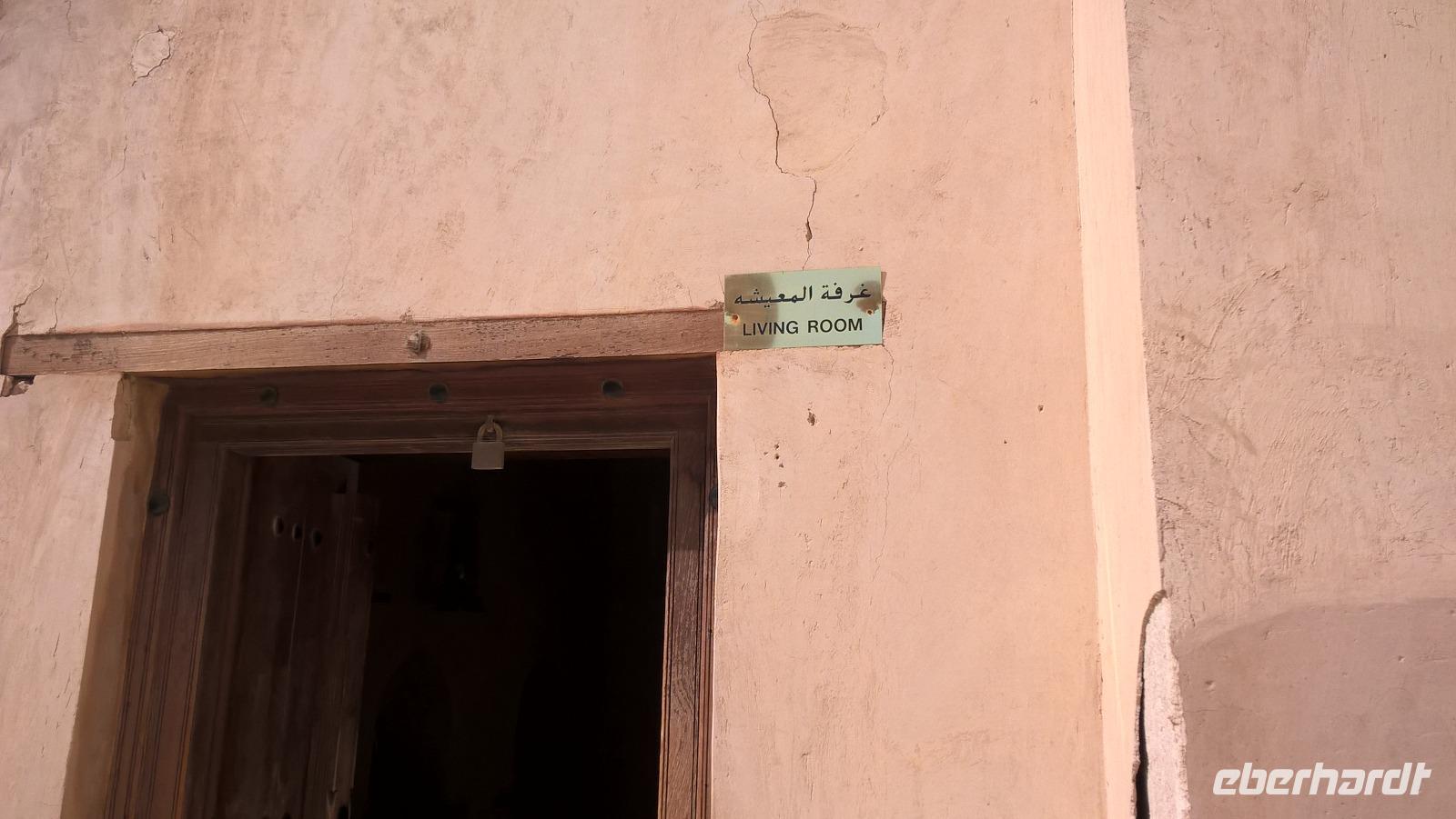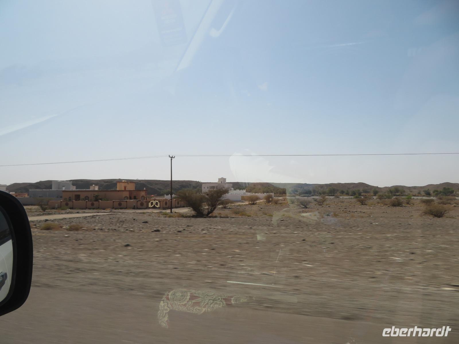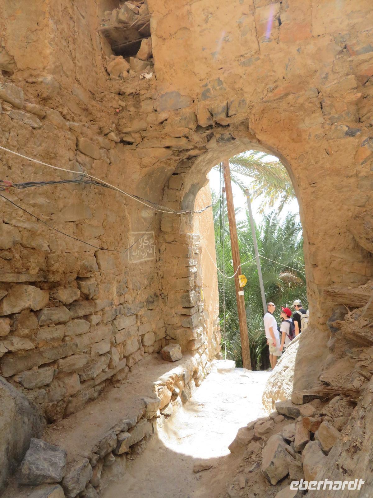Wir begrüßen unseren neuen Reiseleiter Asa'd, einen jungen Omani, der fünf Jahre in Deutschland studiert hat. Mit ihm fahren wir zur Grenze der Vereinigten Arabischen Emirate an der wir zunächst einmal ausreisen um in das Sultanat Oman einzureisen. In den nächsten 7 Tagen reisen wir durch das aufstrebende Land unter der Herrschaft des Sultans Qaboos bin Said Al-Said. Dieser investiert nicht nur in die Zukunft des Landes sondern auch in die deren Landesbewohner. Asa'd erzählt uns, dass er mithilfe der finanziellen Unterstützung des Sultans für Absolventen im Deutschland studieren konnte. Nachdem wir unsere Arabischen Dirham in Omainische Rial getauscht haben besichtigen wir das Schloss von Jabrin aus dem Jahre 1670, das ehemals als Wohnschloss und Sommerresidenz gedacht war. Nachdem es zu Streitigkeiten mit seinem Bruder kam beschloss Sultan Bilarab bin Sultan al-Yaarub es mit Wehrmauern und Türmen zu erweitern. Man kann sich vorstellen, wie hier gelebt wurde. Es rentiert sich auch einen Blick nach oben auf die schön verzierte Holzdecke zu werfen. Ebenso beeindruckend ist das Fort von Bahla. Die Festung wurde wahrscheinlich von den Nabhani im 17. Jahrhundert aus Lehm erbaut und zählt seit 1978 als einzige osmanische Festung zum Weltkulturerbe. Eine 12 Kilometer lange Mauer umgibt die Festung. Wir fahren heute bis nach Al Hamra mit unserem Reisebus und steigen dann in Jeeps um. Diese bringen uns auf 1400 Meter Höhe, zu unserem heutigen Hotel. Der Blick von oben ist einfach unglaublich und ist die holprige Fahrt mehr als wert.