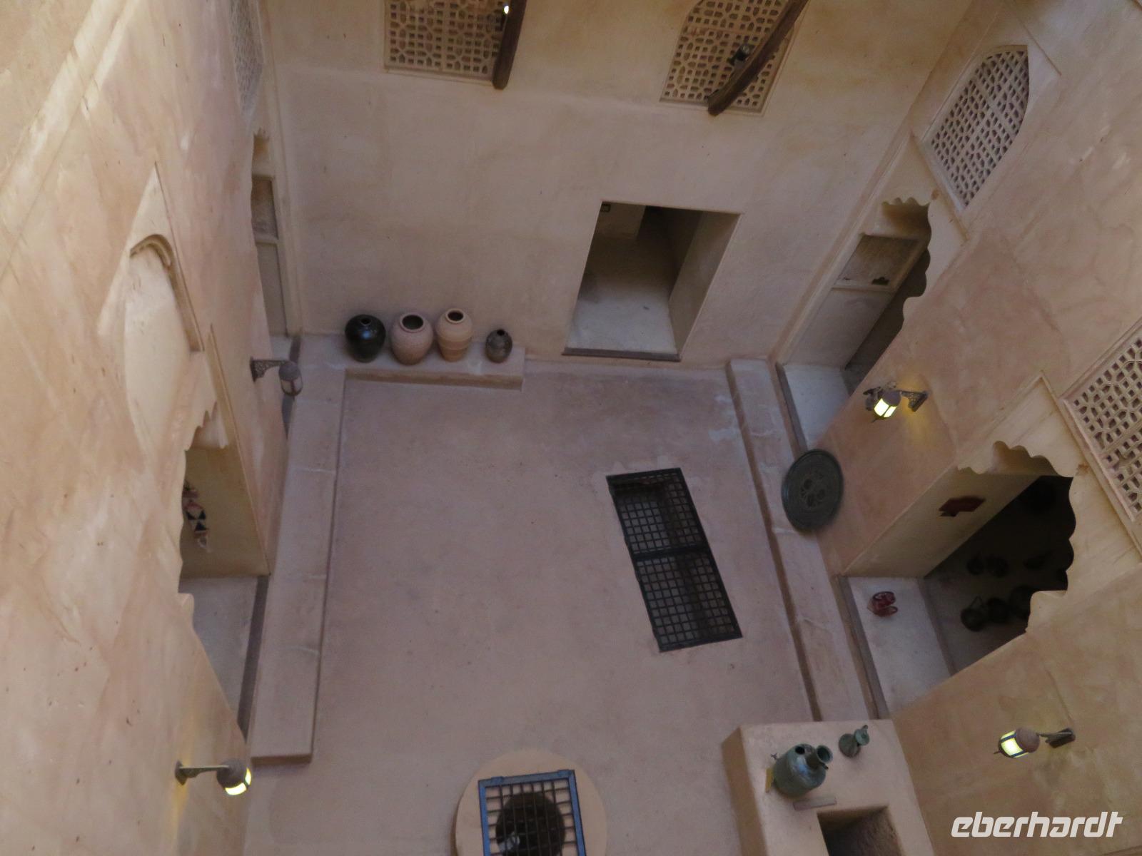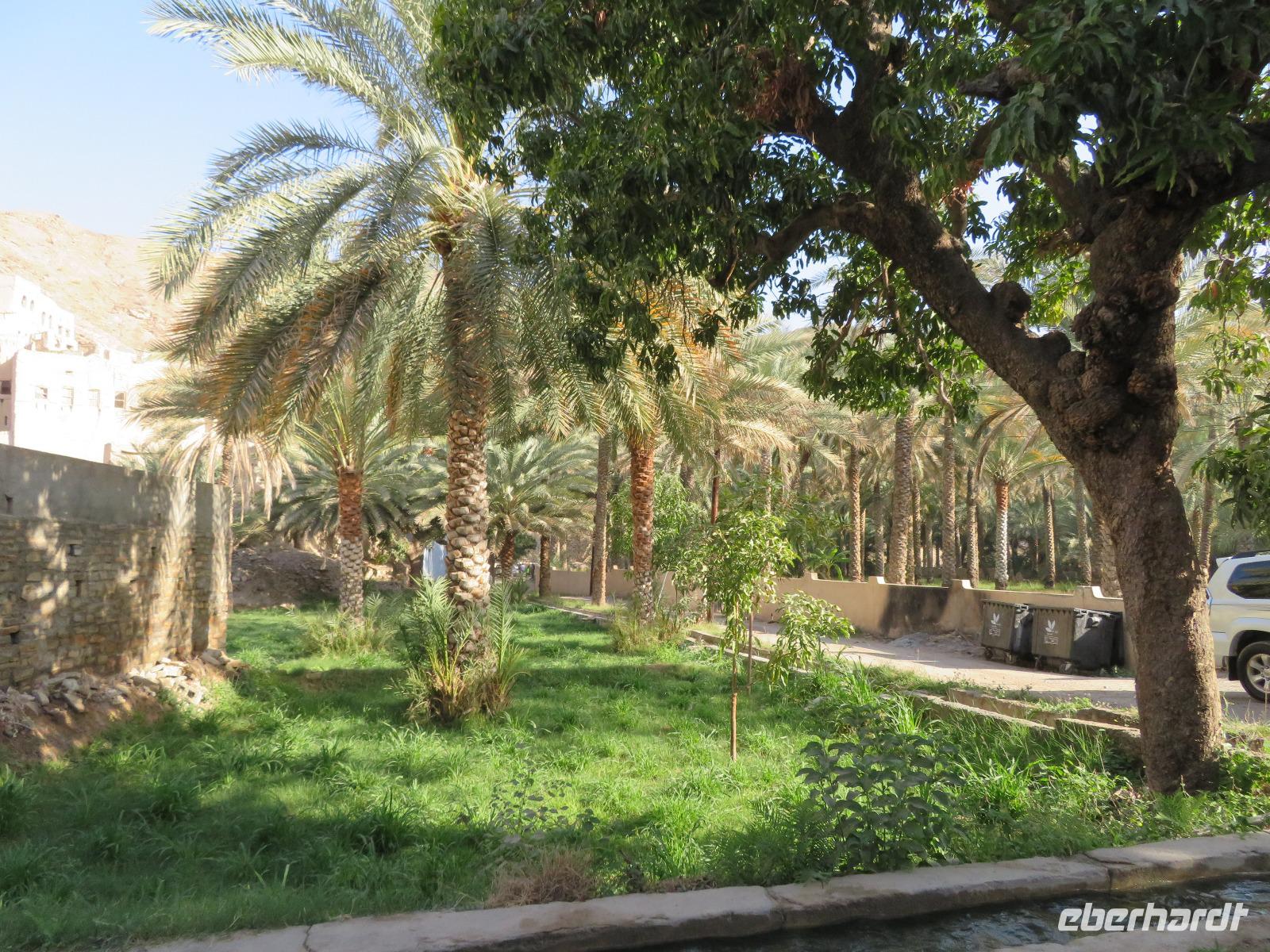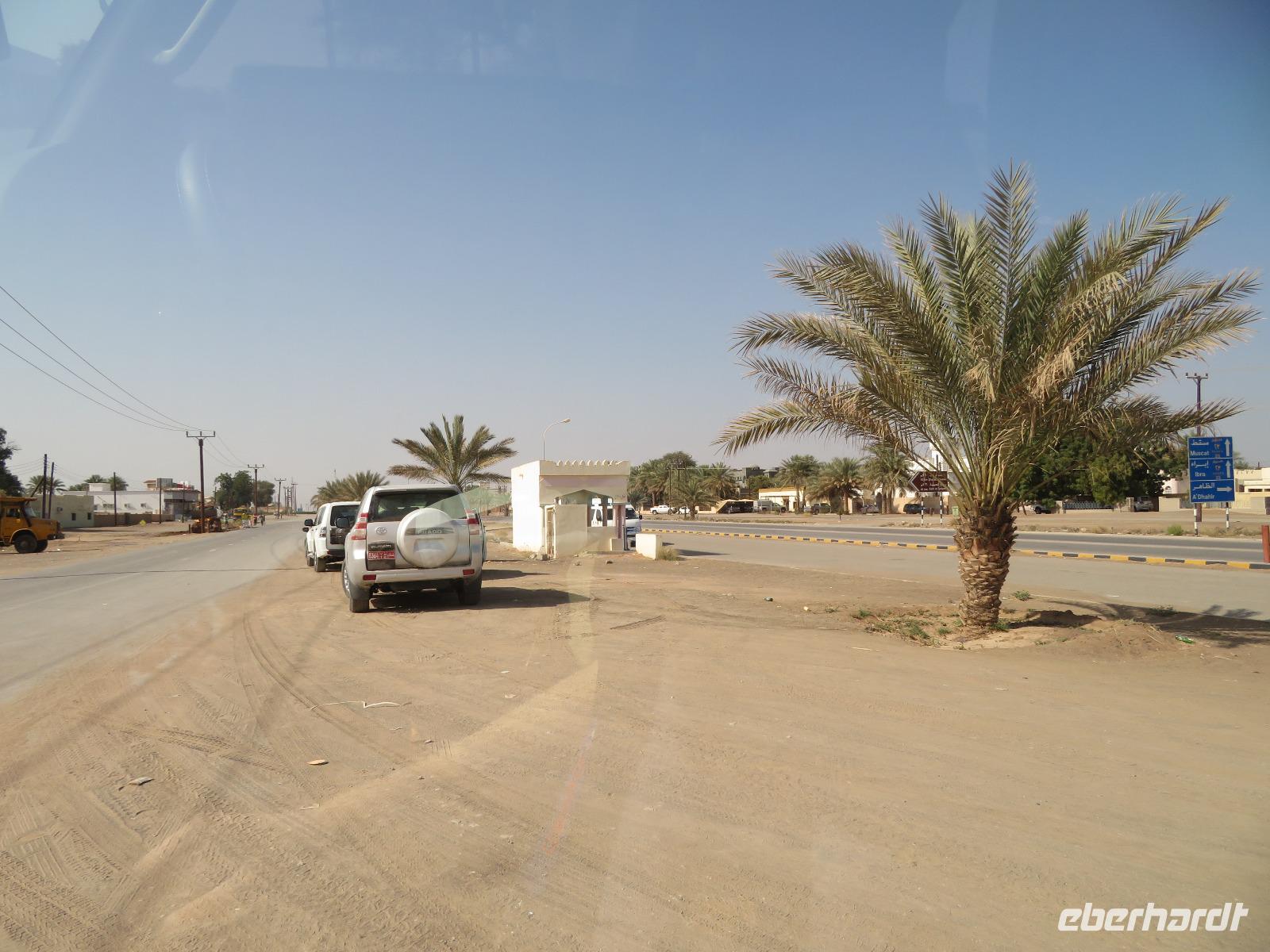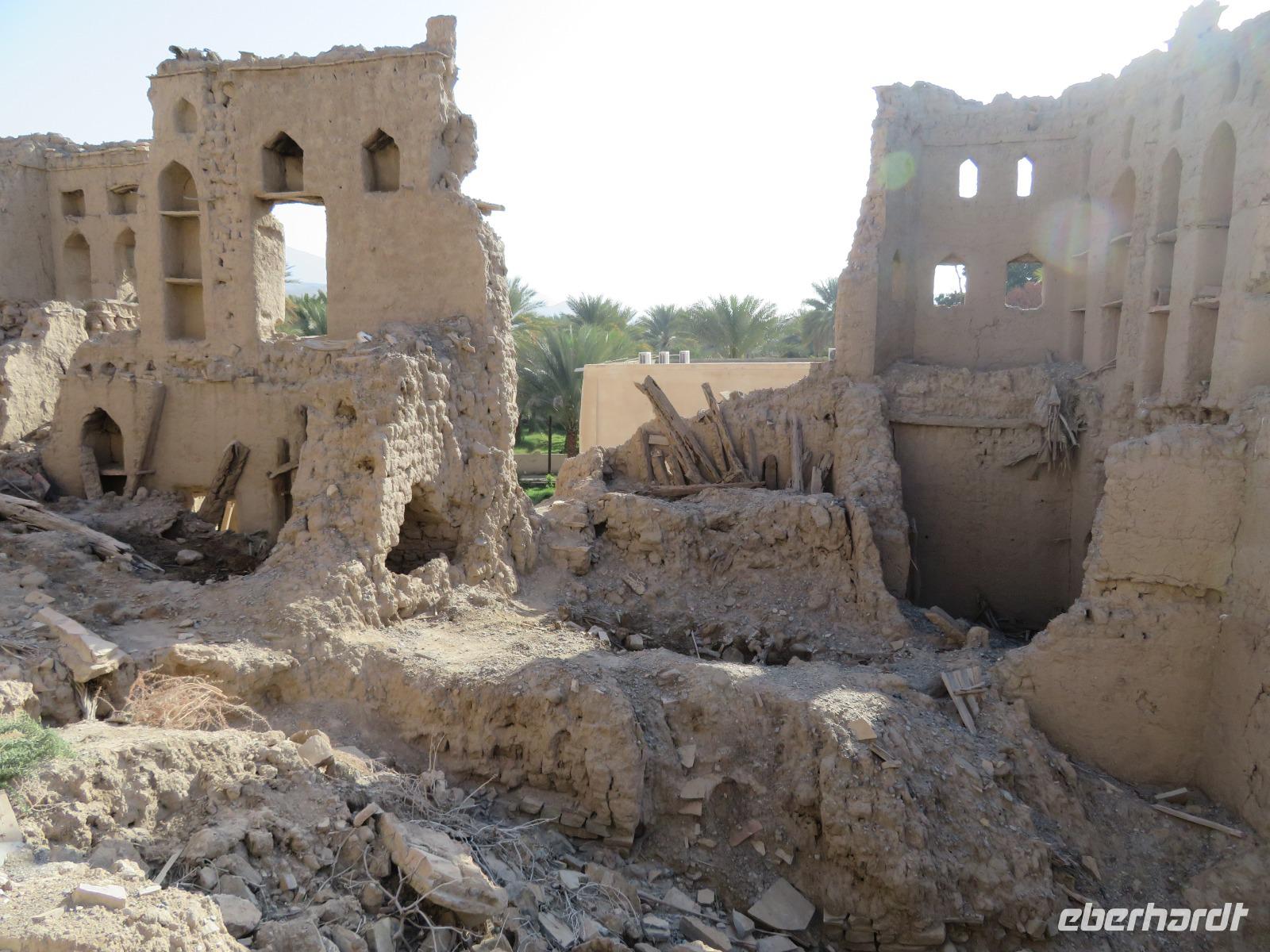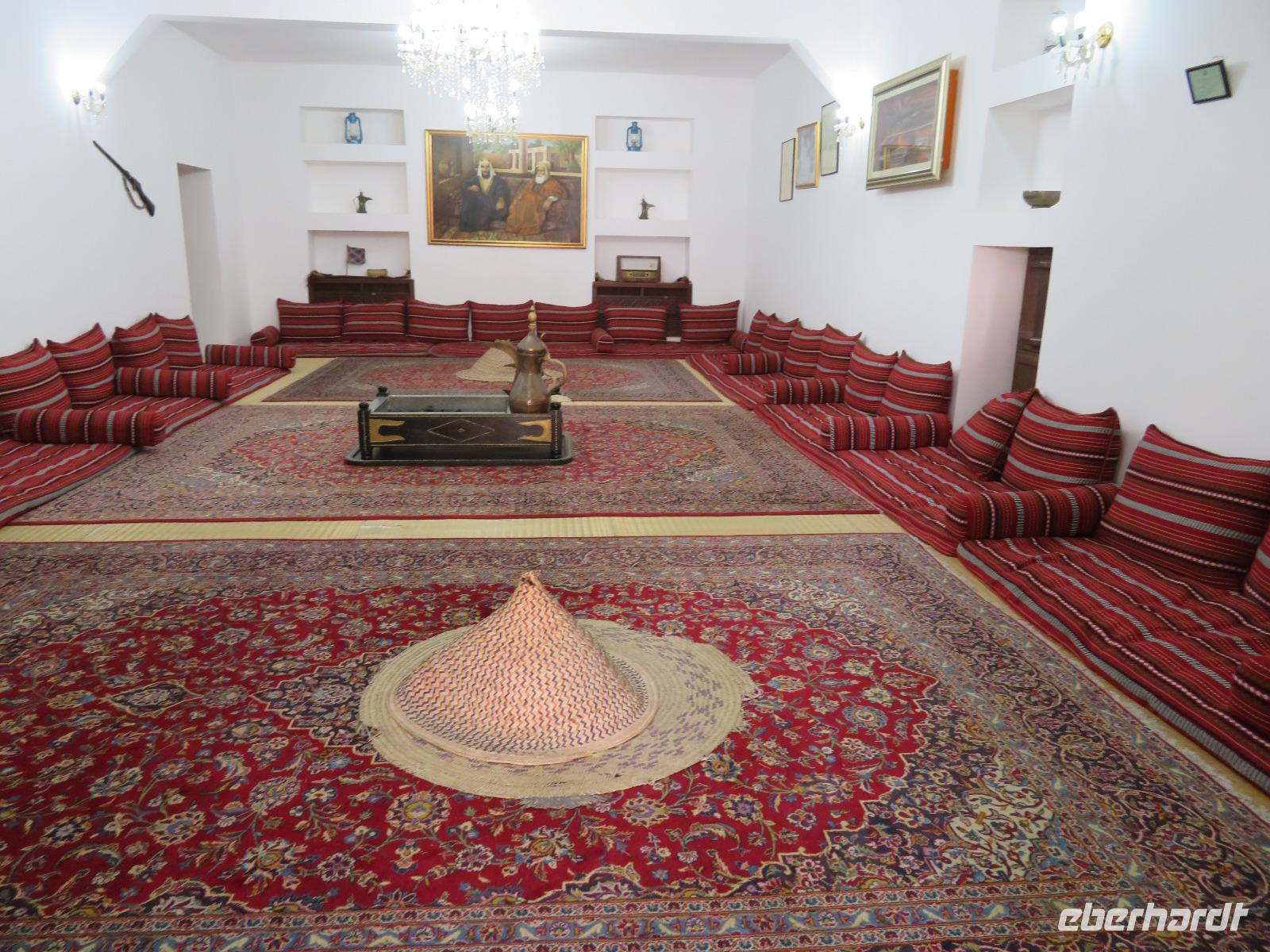 Wir begrüßen unseren neuen Reiseleiter Asa'd, einen jungen Omani, der fünf Jahre in Deutschland studiert hat. Mit ihm fahren wir zur Grenze der Vereinigten Arabischen Emirate an der wir zunächst einmal ausreisen um in das Sultanat Oman einzureisen. In den nächsten 7 Tagen reisen wir durch das aufstrebende Land unter der Herrschaft des Sultans Qaboos bin Said Al-Said. Dieser investiert nicht nur in die Zukunft des Landes sondern auch in die deren Landesbewohner. Asa'd erzählt uns, dass er mithilfe der finanziellen Unterstützung des Sultans für Absolventen im Deutschland studieren konnte. Nachdem wir unsere Arabischen Dirham in Omainische Rial getauscht haben besichtigen wir das Schloss von Jabrin aus dem Jahre 1670, das ehemals als Wohnschloss und Sommerresidenz gedacht war. Nachdem es zu Streitigkeiten mit seinem Bruder kam beschloss Sultan Bilarab bin Sultan al-Yaarub es mit Wehrmauern und Türmen zu erweitern. Man kann sich vorstellen, wie hier gelebt wurde. Es rentiert sich auch einen Blick nach oben auf die schön verzierte Holzdecke zu werfen. Ebenso beeindruckend ist das Fort von Bahla. Die Festung wurde wahrscheinlich von den Nabhani im 17. Jahrhundert aus Lehm erbaut und zählt seit 1978 als einzige osmanische Festung zum Weltkulturerbe. Eine 12 Kilometer lange Mauer umgibt die Festung. Wir fahren heute bis nach Al Hamra mit unserem Reisebus und steigen dann in Jeeps um. Diese bringen uns auf 1400 Meter Höhe, zu unserem heutigen Hotel. Der Blick von oben ist einfach unglaublich und ist die holprige Fahrt mehr als wert.