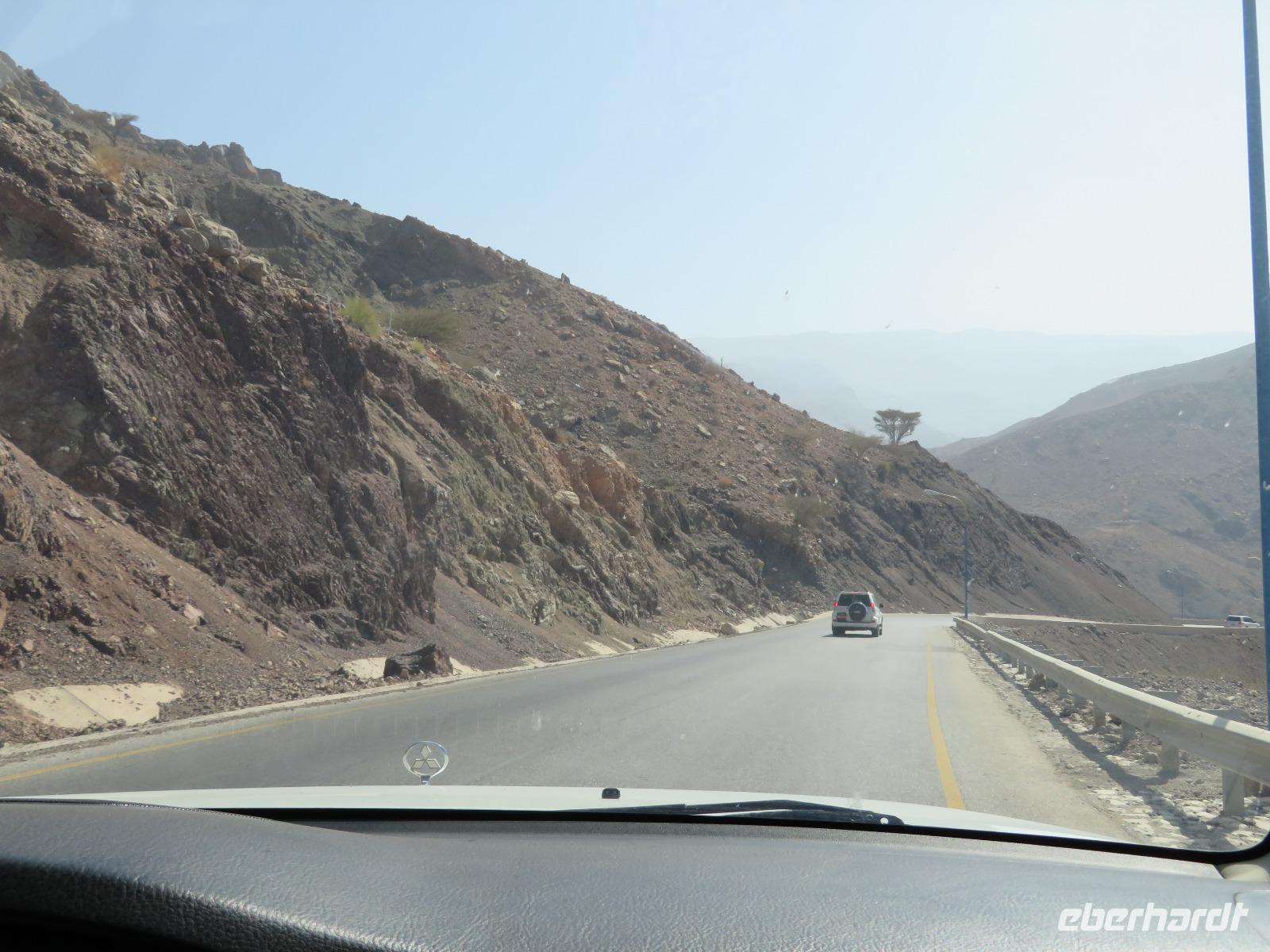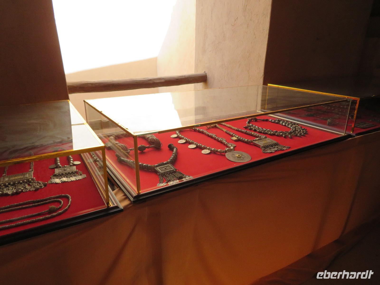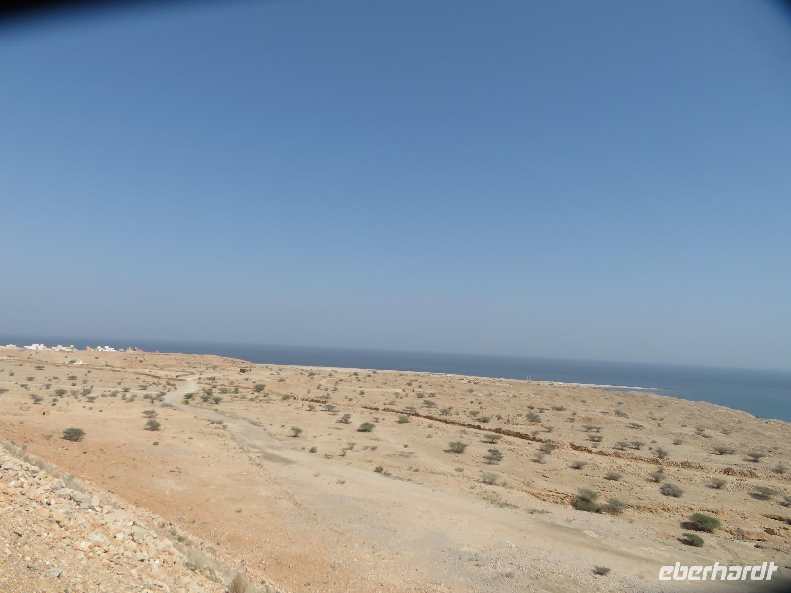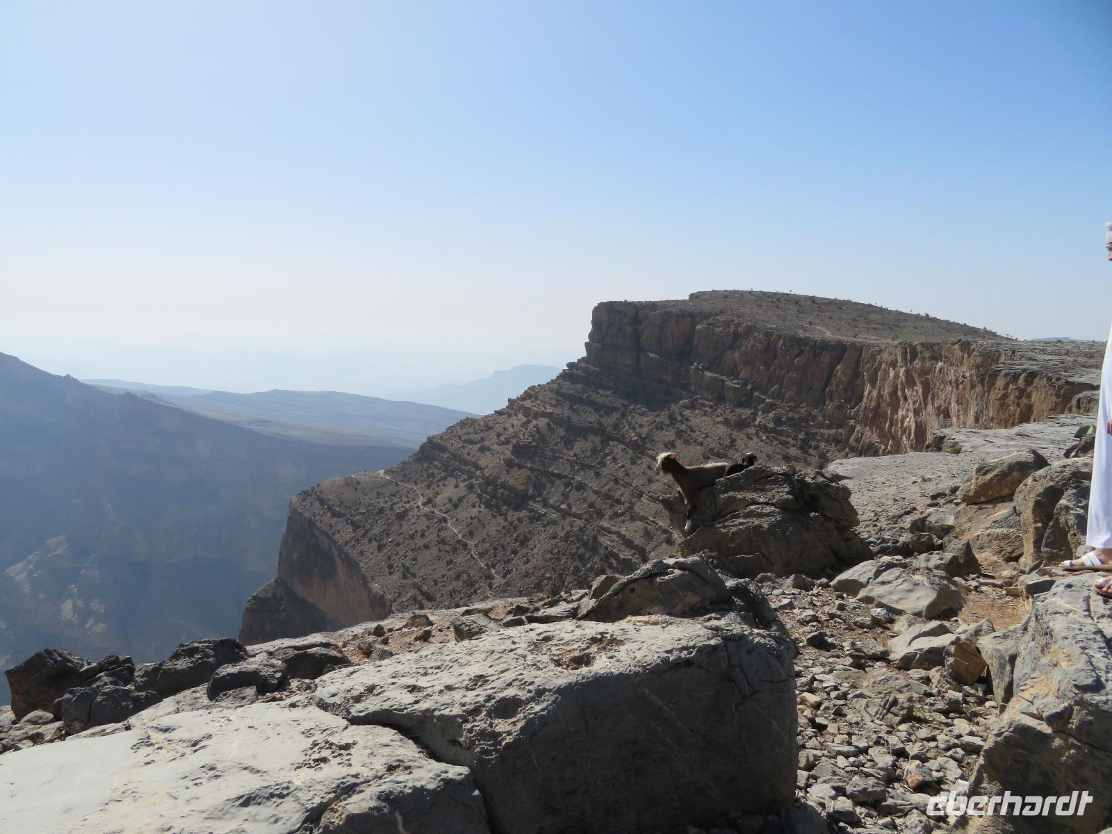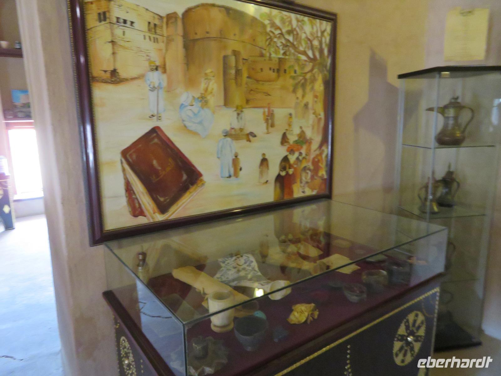 Wir begrüßen unseren neuen Reiseleiter Asa'd, einen jungen Omani, der fünf Jahre in Deutschland studiert hat. Mit ihm fahren wir zur Grenze der Vereinigten Arabischen Emirate an der wir zunächst einmal ausreisen um in das Sultanat Oman einzureisen. In den nächsten 7 Tagen reisen wir durch das aufstrebende Land unter der Herrschaft des Sultans Qaboos bin Said Al-Said. Dieser investiert nicht nur in die Zukunft des Landes sondern auch in die deren Landesbewohner. Asa'd erzählt uns, dass er mithilfe der finanziellen Unterstützung des Sultans für Absolventen im Deutschland studieren konnte. Nachdem wir unsere Arabischen Dirham in Omainische Rial getauscht haben besichtigen wir das Schloss von Jabrin aus dem Jahre 1670, das ehemals als Wohnschloss und Sommerresidenz gedacht war. Nachdem es zu Streitigkeiten mit seinem Bruder kam beschloss Sultan Bilarab bin Sultan al-Yaarub es mit Wehrmauern und Türmen zu erweitern. Man kann sich vorstellen, wie hier gelebt wurde. Es rentiert sich auch einen Blick nach oben auf die schön verzierte Holzdecke zu werfen. Ebenso beeindruckend ist das Fort von Bahla. Die Festung wurde wahrscheinlich von den Nabhani im 17. Jahrhundert aus Lehm erbaut und zählt seit 1978 als einzige osmanische Festung zum Weltkulturerbe. Eine 12 Kilometer lange Mauer umgibt die Festung. Wir fahren heute bis nach Al Hamra mit unserem Reisebus und steigen dann in Jeeps um. Diese bringen uns auf 1400 Meter Höhe, zu unserem heutigen Hotel. Der Blick von oben ist einfach unglaublich und ist die holprige Fahrt mehr als wert.