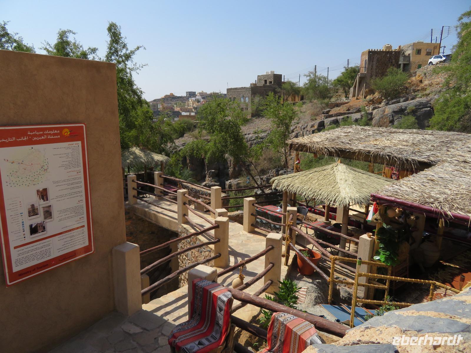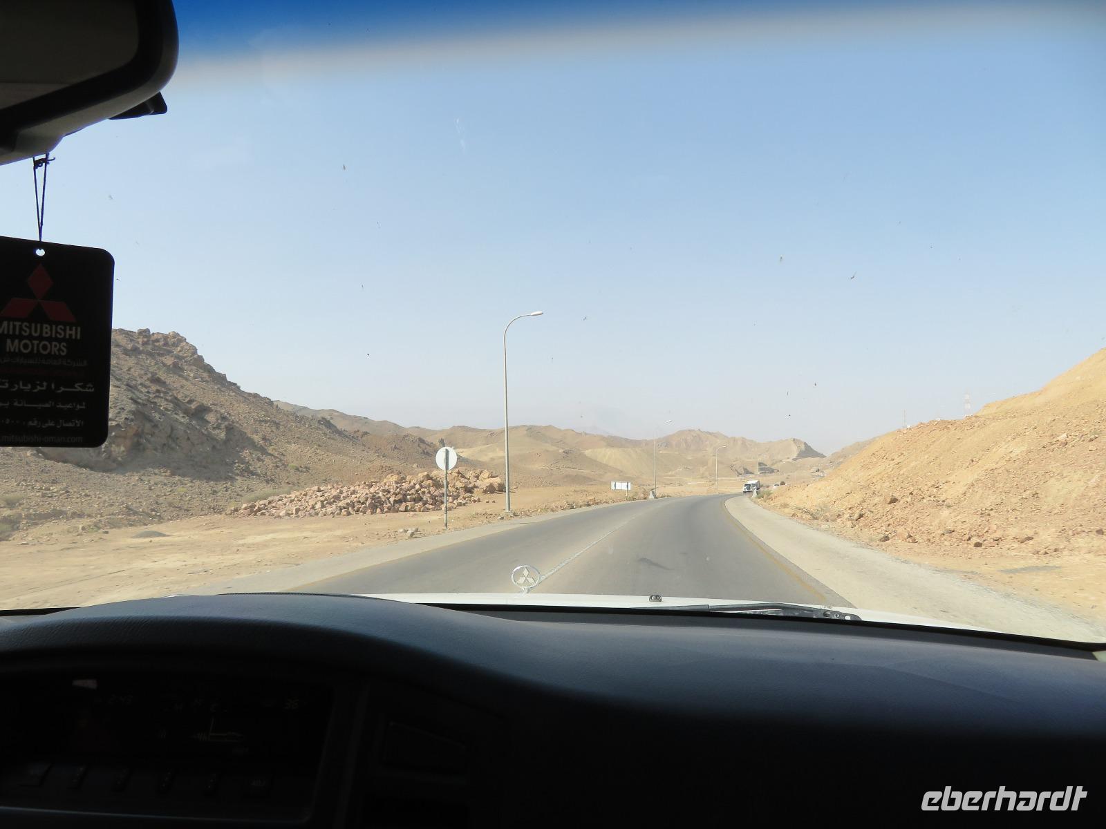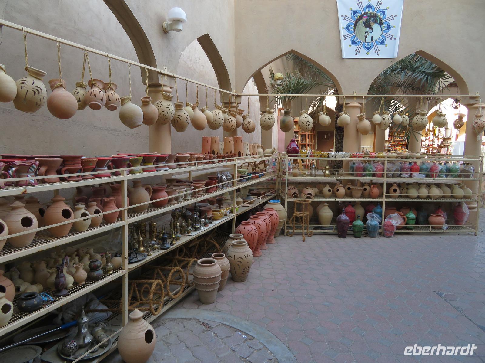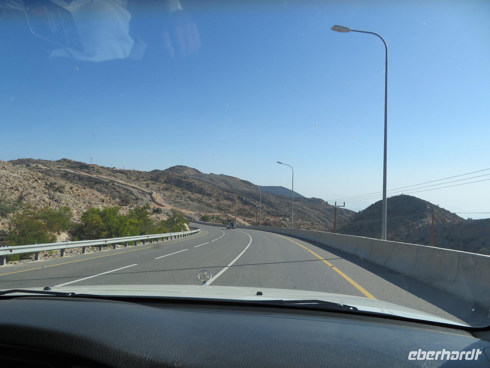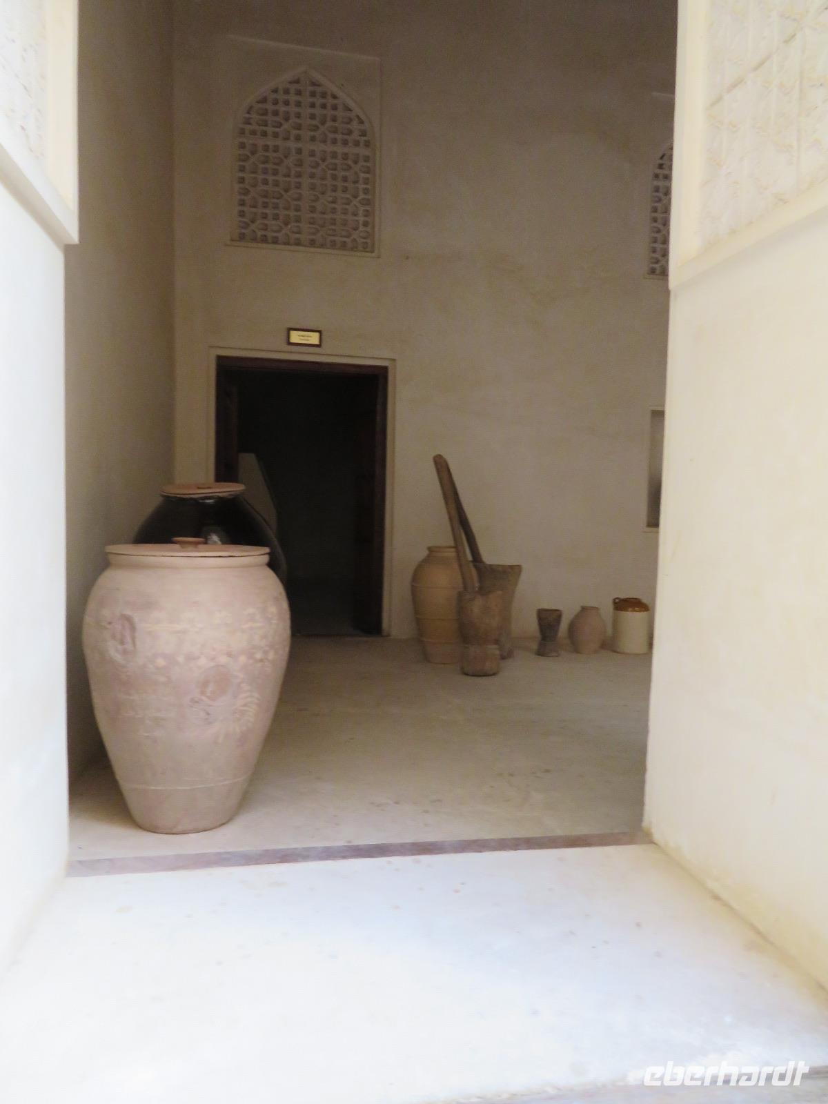Wir begrüßen unseren neuen Reiseleiter Asa'd, einen jungen Omani, der fünf Jahre in Deutschland studiert hat. Mit ihm fahren wir zur Grenze der Vereinigten Arabischen Emirate an der wir zunächst einmal ausreisen um in das Sultanat Oman einzureisen. In den nächsten 7 Tagen reisen wir durch das aufstrebende Land unter der Herrschaft des Sultans Qaboos bin Said Al-Said. Dieser investiert nicht nur in die Zukunft des Landes sondern auch in die deren Landesbewohner. Asa'd erzählt uns, dass er mithilfe der finanziellen Unterstützung des Sultans für Absolventen im Deutschland studieren konnte. Nachdem wir unsere Arabischen Dirham in Omainische Rial getauscht haben besichtigen wir das Schloss von Jabrin aus dem Jahre 1670, das ehemals als Wohnschloss und Sommerresidenz gedacht war. Nachdem es zu Streitigkeiten mit seinem Bruder kam beschloss Sultan Bilarab bin Sultan al-Yaarub es mit Wehrmauern und Türmen zu erweitern. Man kann sich vorstellen, wie hier gelebt wurde. Es rentiert sich auch einen Blick nach oben auf die schön verzierte Holzdecke zu werfen. Ebenso beeindruckend ist das Fort von Bahla. Die Festung wurde wahrscheinlich von den Nabhani im 17. Jahrhundert aus Lehm erbaut und zählt seit 1978 als einzige osmanische Festung zum Weltkulturerbe. Eine 12 Kilometer lange Mauer umgibt die Festung. Wir fahren heute bis nach Al Hamra mit unserem Reisebus und steigen dann in Jeeps um. Diese bringen uns auf 1400 Meter Höhe, zu unserem heutigen Hotel. Der Blick von oben ist einfach unglaublich und ist die holprige Fahrt mehr als wert.