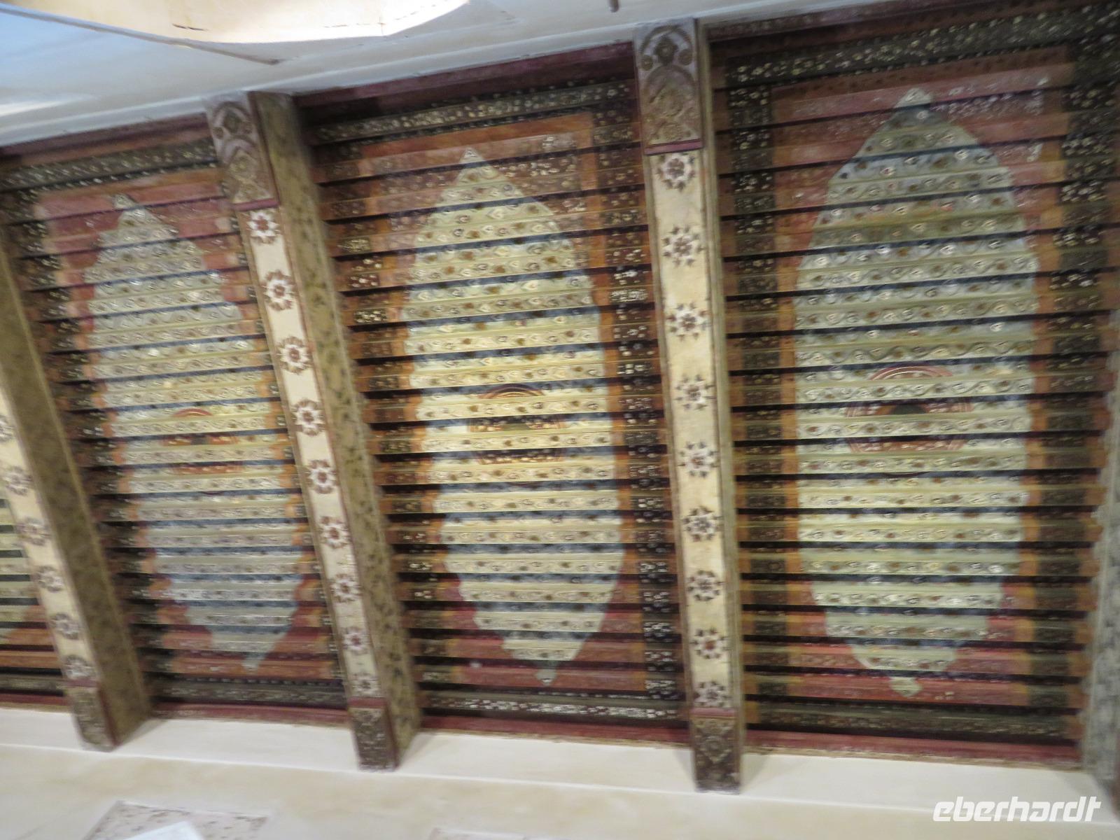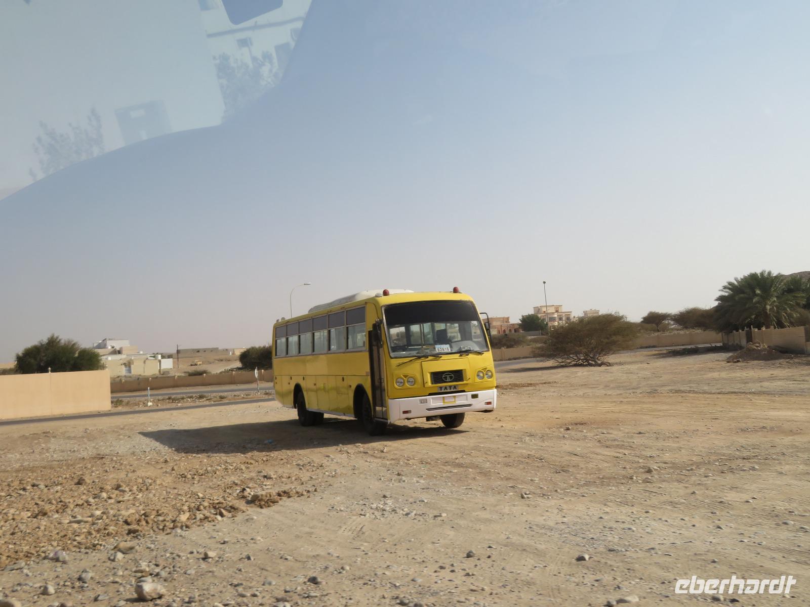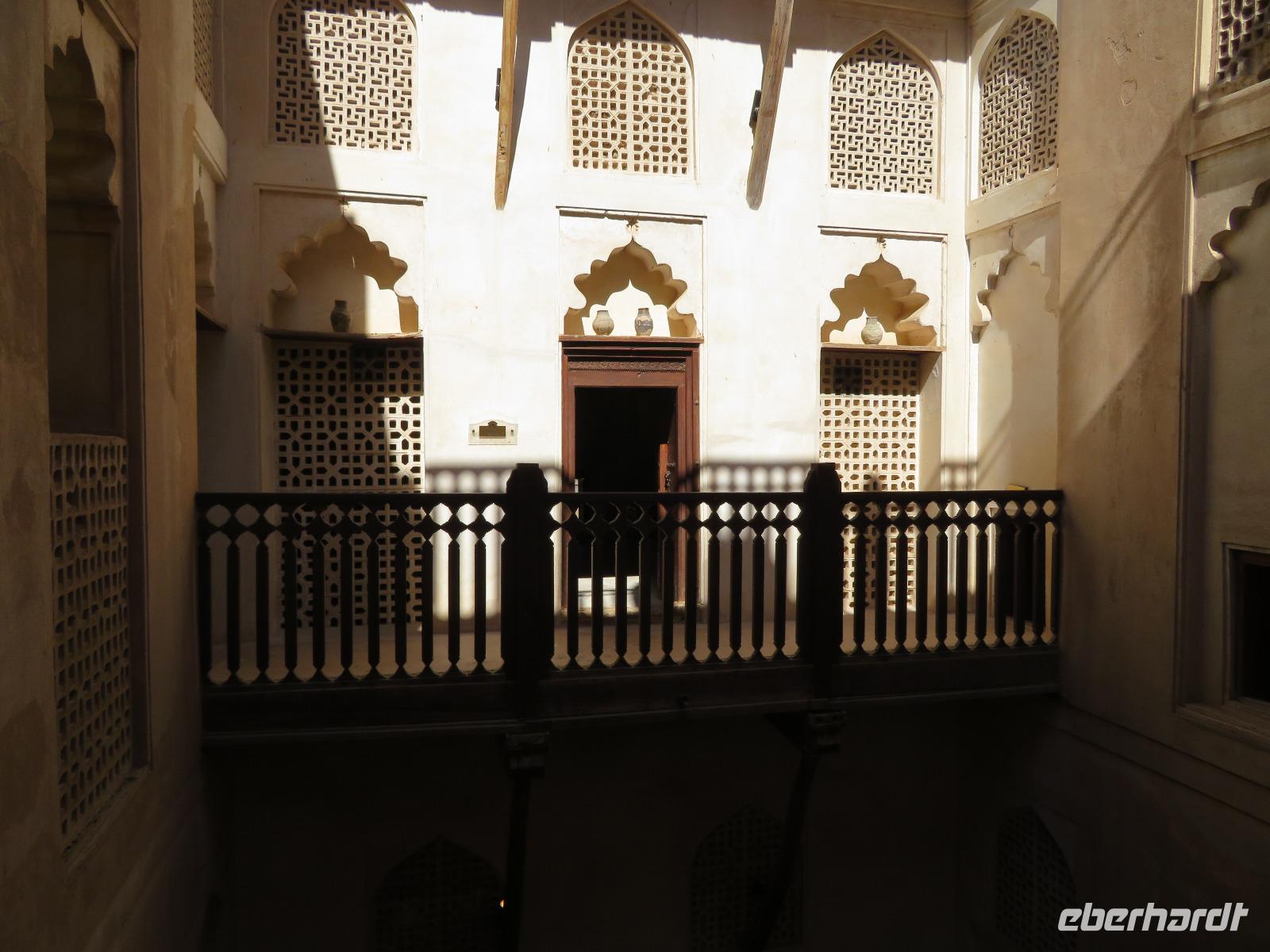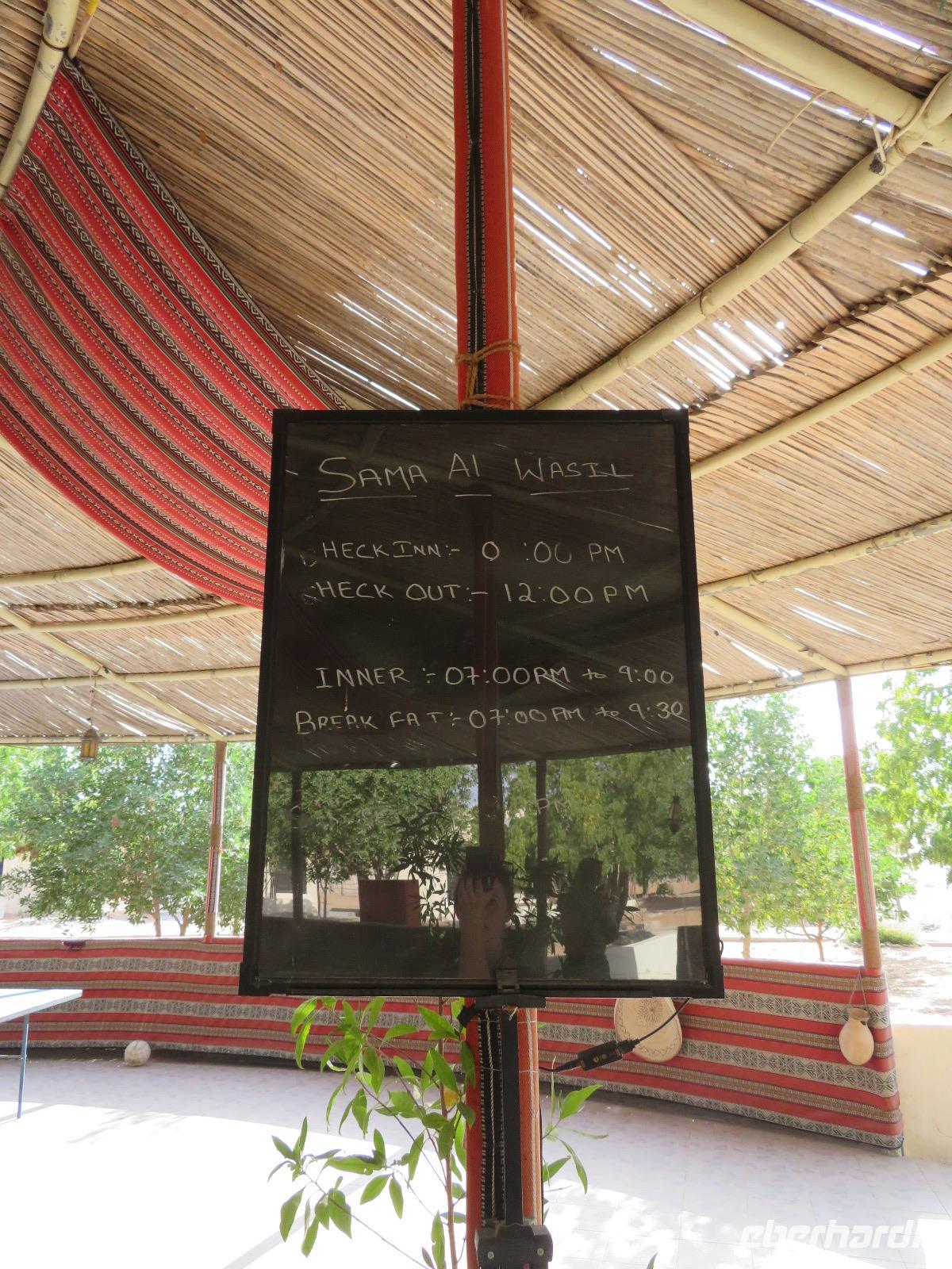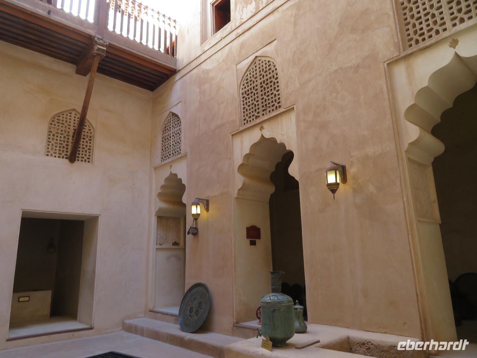Wir begrüßen unseren neuen Reiseleiter Asa'd, einen jungen Omani, der fünf Jahre in Deutschland studiert hat. Mit ihm fahren wir zur Grenze der Vereinigten Arabischen Emirate an der wir zunächst einmal ausreisen um in das Sultanat Oman einzureisen. In den nächsten 7 Tagen reisen wir durch das aufstrebende Land unter der Herrschaft des Sultans Qaboos bin Said Al-Said. Dieser investiert nicht nur in die Zukunft des Landes sondern auch in die deren Landesbewohner. Asa'd erzählt uns, dass er mithilfe der finanziellen Unterstützung des Sultans für Absolventen im Deutschland studieren konnte. Nachdem wir unsere Arabischen Dirham in Omainische Rial getauscht haben besichtigen wir das Schloss von Jabrin aus dem Jahre 1670, das ehemals als Wohnschloss und Sommerresidenz gedacht war. Nachdem es zu Streitigkeiten mit seinem Bruder kam beschloss Sultan Bilarab bin Sultan al-Yaarub es mit Wehrmauern und Türmen zu erweitern. Man kann sich vorstellen, wie hier gelebt wurde. Es rentiert sich auch einen Blick nach oben auf die schön verzierte Holzdecke zu werfen. Ebenso beeindruckend ist das Fort von Bahla. Die Festung wurde wahrscheinlich von den Nabhani im 17. Jahrhundert aus Lehm erbaut und zählt seit 1978 als einzige osmanische Festung zum Weltkulturerbe. Eine 12 Kilometer lange Mauer umgibt die Festung. Wir fahren heute bis nach Al Hamra mit unserem Reisebus und steigen dann in Jeeps um. Diese bringen uns auf 1400 Meter Höhe, zu unserem heutigen Hotel. Der Blick von oben ist einfach unglaublich und ist die holprige Fahrt mehr als wert.