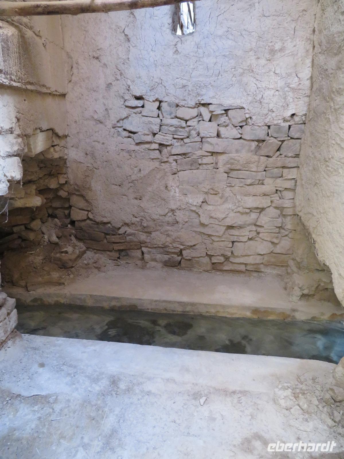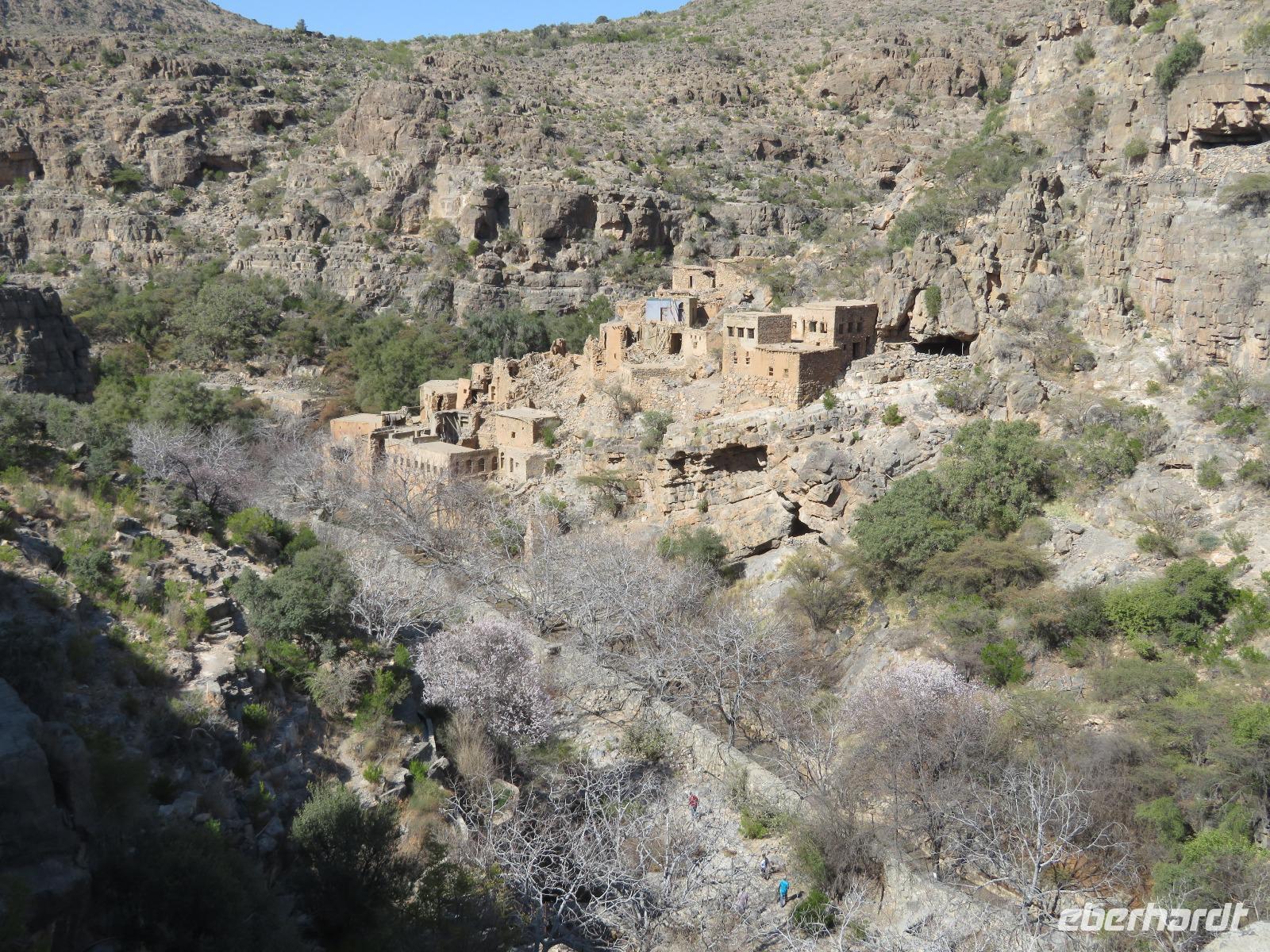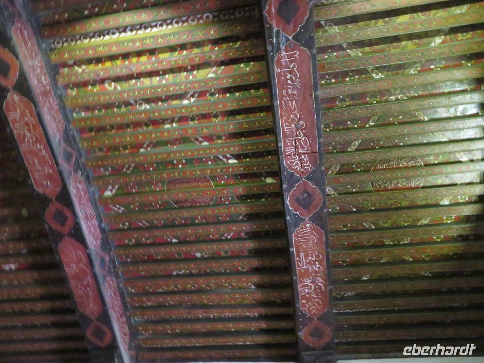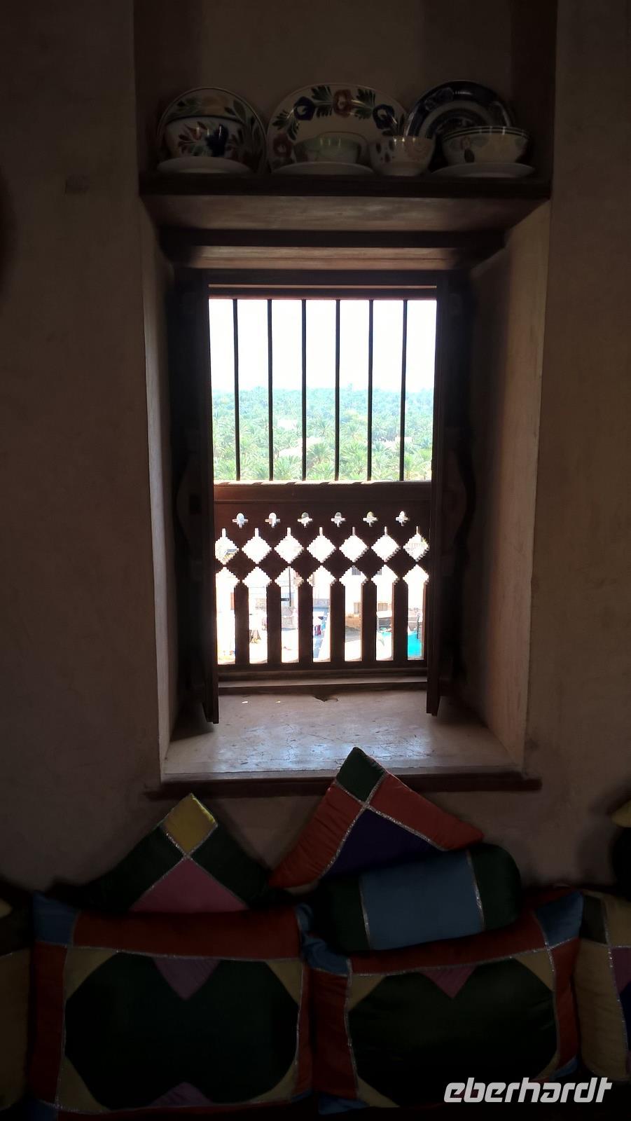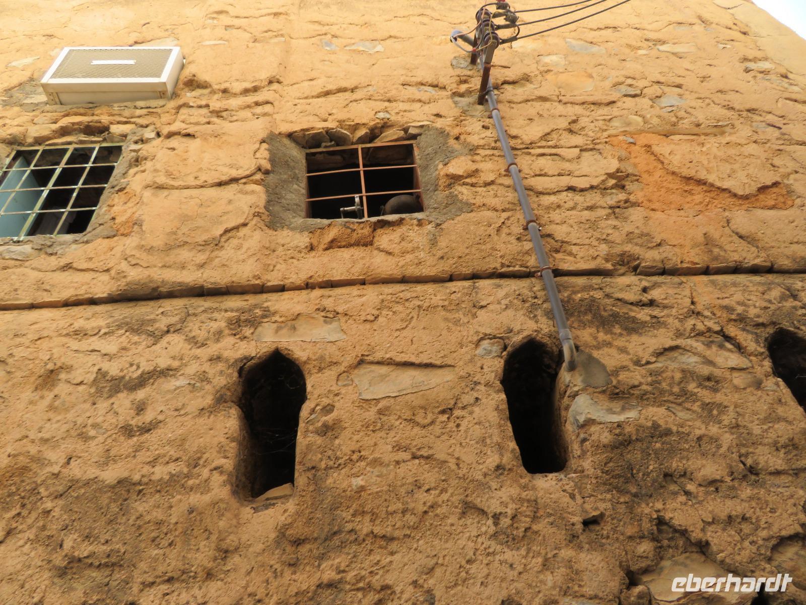 Wir begrüßen unseren neuen Reiseleiter Asa'd, einen jungen Omani, der fünf Jahre in Deutschland studiert hat. Mit ihm fahren wir zur Grenze der Vereinigten Arabischen Emirate an der wir zunächst einmal ausreisen um in das Sultanat Oman einzureisen. In den nächsten 7 Tagen reisen wir durch das aufstrebende Land unter der Herrschaft des Sultans Qaboos bin Said Al-Said. Dieser investiert nicht nur in die Zukunft des Landes sondern auch in die deren Landesbewohner. Asa'd erzählt uns, dass er mithilfe der finanziellen Unterstützung des Sultans für Absolventen im Deutschland studieren konnte. Nachdem wir unsere Arabischen Dirham in Omainische Rial getauscht haben besichtigen wir das Schloss von Jabrin aus dem Jahre 1670, das ehemals als Wohnschloss und Sommerresidenz gedacht war. Nachdem es zu Streitigkeiten mit seinem Bruder kam beschloss Sultan Bilarab bin Sultan al-Yaarub es mit Wehrmauern und Türmen zu erweitern. Man kann sich vorstellen, wie hier gelebt wurde. Es rentiert sich auch einen Blick nach oben auf die schön verzierte Holzdecke zu werfen. Ebenso beeindruckend ist das Fort von Bahla. Die Festung wurde wahrscheinlich von den Nabhani im 17. Jahrhundert aus Lehm erbaut und zählt seit 1978 als einzige osmanische Festung zum Weltkulturerbe. Eine 12 Kilometer lange Mauer umgibt die Festung. Wir fahren heute bis nach Al Hamra mit unserem Reisebus und steigen dann in Jeeps um. Diese bringen uns auf 1400 Meter Höhe, zu unserem heutigen Hotel. Der Blick von oben ist einfach unglaublich und ist die holprige Fahrt mehr als wert.