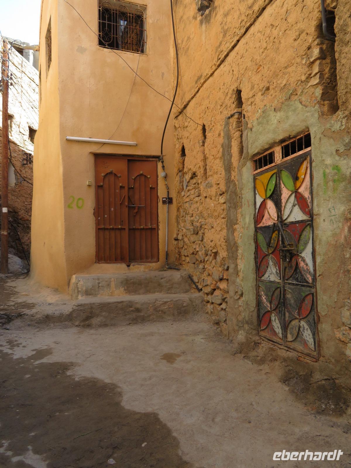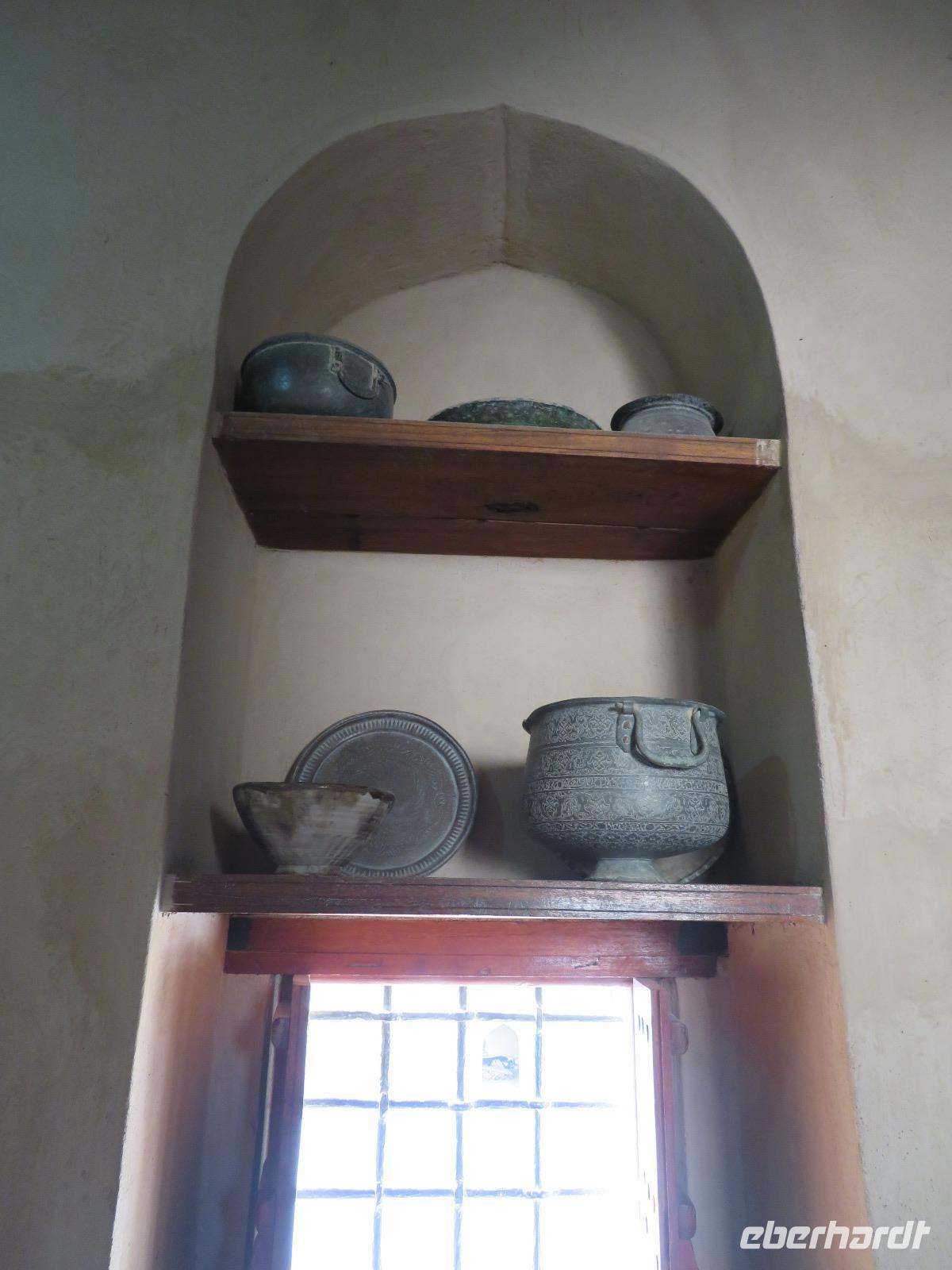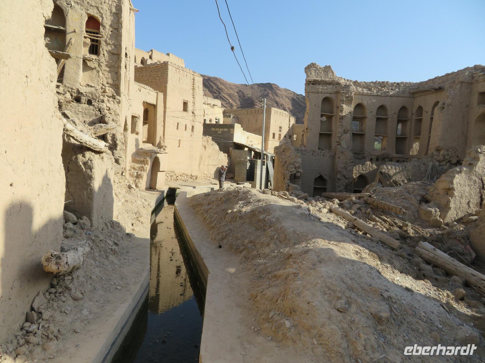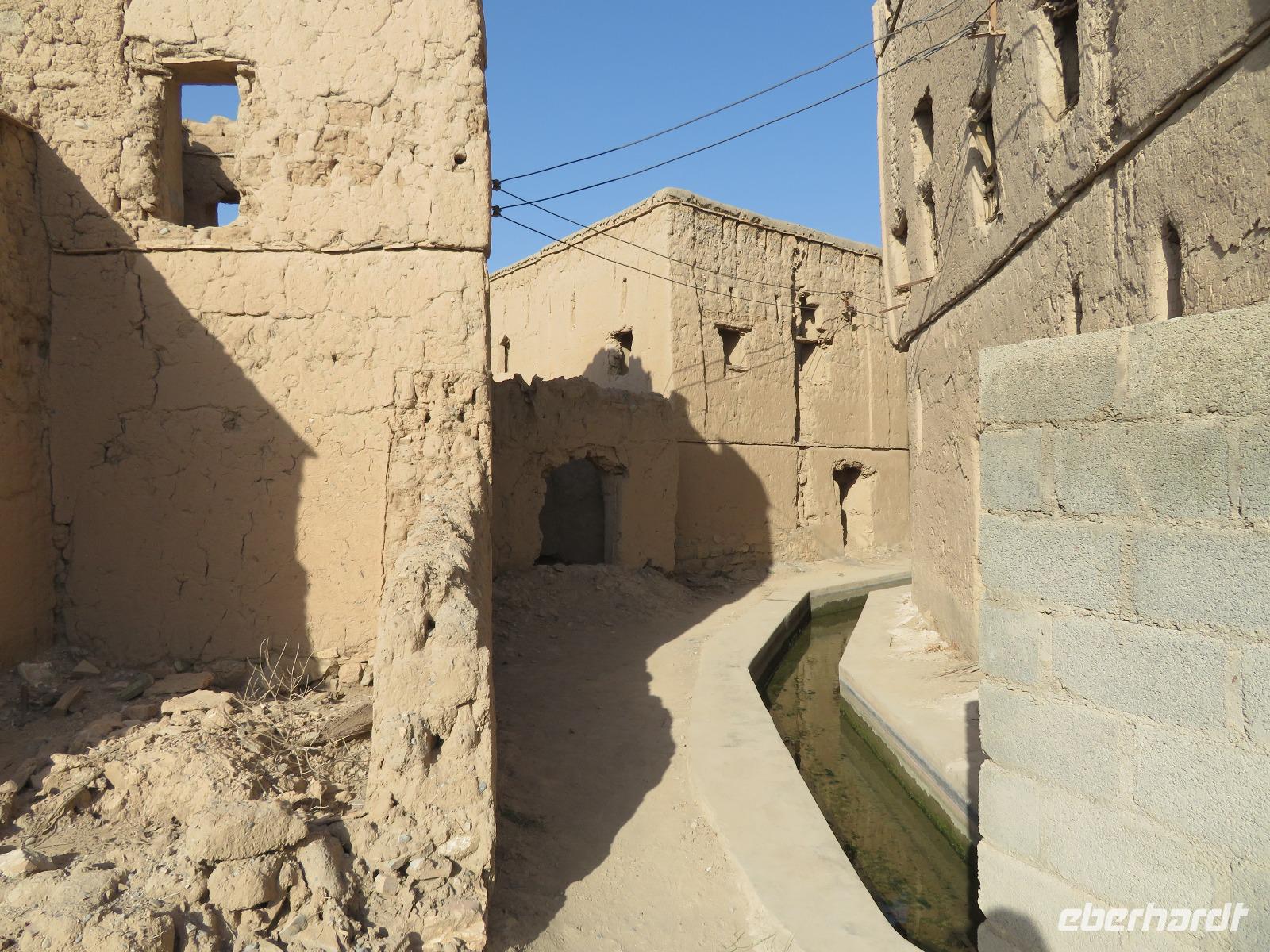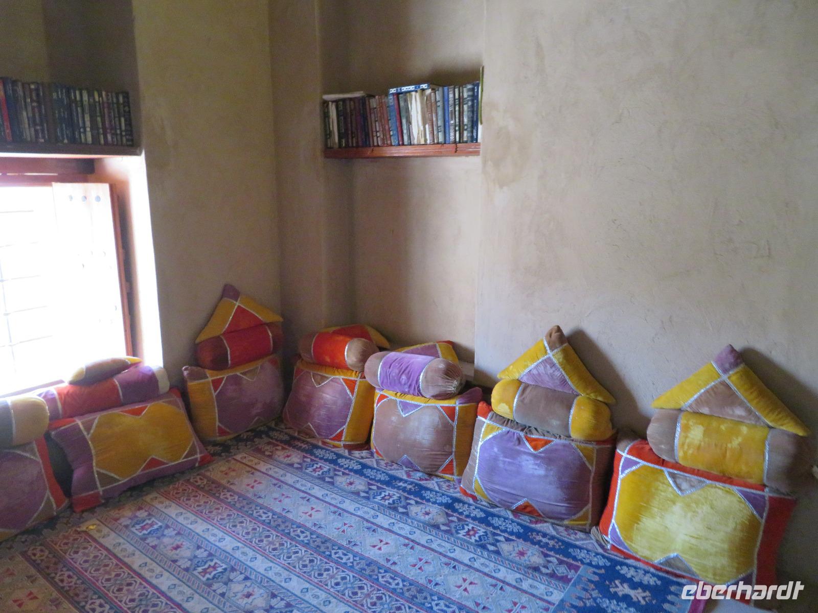 Wir begrüßen unseren neuen Reiseleiter Asa'd, einen jungen Omani, der fünf Jahre in Deutschland studiert hat. Mit ihm fahren wir zur Grenze der Vereinigten Arabischen Emirate an der wir zunächst einmal ausreisen um in das Sultanat Oman einzureisen. In den nächsten 7 Tagen reisen wir durch das aufstrebende Land unter der Herrschaft des Sultans Qaboos bin Said Al-Said. Dieser investiert nicht nur in die Zukunft des Landes sondern auch in die deren Landesbewohner. Asa'd erzählt uns, dass er mithilfe der finanziellen Unterstützung des Sultans für Absolventen im Deutschland studieren konnte. Nachdem wir unsere Arabischen Dirham in Omainische Rial getauscht haben besichtigen wir das Schloss von Jabrin aus dem Jahre 1670, das ehemals als Wohnschloss und Sommerresidenz gedacht war. Nachdem es zu Streitigkeiten mit seinem Bruder kam beschloss Sultan Bilarab bin Sultan al-Yaarub es mit Wehrmauern und Türmen zu erweitern. Man kann sich vorstellen, wie hier gelebt wurde. Es rentiert sich auch einen Blick nach oben auf die schön verzierte Holzdecke zu werfen. Ebenso beeindruckend ist das Fort von Bahla. Die Festung wurde wahrscheinlich von den Nabhani im 17. Jahrhundert aus Lehm erbaut und zählt seit 1978 als einzige osmanische Festung zum Weltkulturerbe. Eine 12 Kilometer lange Mauer umgibt die Festung. Wir fahren heute bis nach Al Hamra mit unserem Reisebus und steigen dann in Jeeps um. Diese bringen uns auf 1400 Meter Höhe, zu unserem heutigen Hotel. Der Blick von oben ist einfach unglaublich und ist die holprige Fahrt mehr als wert.