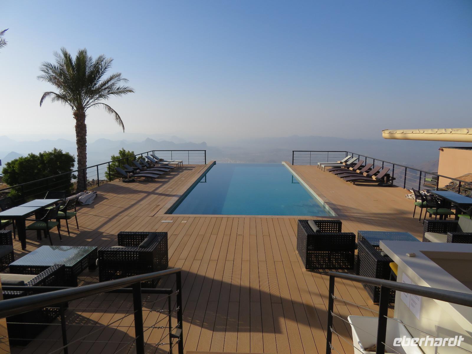Am Morgen lernen wir unsere Jeepfahrer kennen, die uns die nächsten Tage mit sicherer Fahrweise begleiten werden. Zunächst fahren wir auf den Jebel Shams, den sogenannten Sonnenberg. Eine Serpentinenstraße führt uns bis zu dem Aussichtspunkt auf 2.800 Meter Höhe. Natürlich ist es nicht ganz der Grand Canyon wie in den USA, aber trotzdem ist die Schlucht ebenso imposant. Wir beobachten wie einige Abenteurer durch den omanischen Canyon wandern, nur ganz klein wirken diese im Gegensatz zu der tiefen Schlucht. Und auch die omanischen Ziegen fühlen sich hier oben wohl. Im Anschluss geht es wieder bergab durch das Oasendorf Al Hamra bis zum Dorf Misfat al Abreen. Auf der gegenüberliegenden Seite machen wir zunächst einen Fotostopp um das Bergdorf aus der Ferne aufzunehmen. Das nächste Bild, das den Oman representiert ist entstanden. In Misfat spazieren wir durch die traditionellen Gassen zwischen den Lehmhäusern. Zum Mittag essen wir Datteln und trinken omanischen Kaffee. Aber es muss immer eine ungerade Zahl von Datteln sein, wie wir von Asa'd erfahren ;) In Nizwa, dem wichtigsten Markt- und Handelszentrum der Umgebung besuchen wir das im Zentrum gelegene Fort. Wir erfahren wie die Bewohner der Festung die Feinde abgewehrt haben und von ganz oben hat man einen einmaligen Blick auf die Palemoase. Wir sehen auch einige omanische Frauen, die sich zum "Kaffeeklatsch" treffen und in das Fort ist noch ein Museum integriert. In Nizwa stoppen wir noch am Markt und bummeln noch etwas durch die Geschäfte. Am Nachmittag fahren wir zu unserem Hotel in Nizwa, wo wir am Poolbereich zu Abend essen.