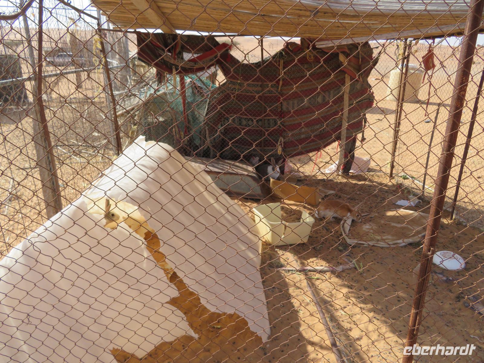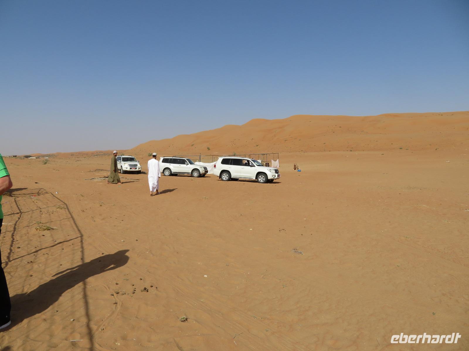 Wir verlassen heute Nizwa und fahren zur Oasenstadt Birkat al Mauz. Als wir ankommen plätschert neben uns bereits der Falaj, das Bewässerungssystem der Dattelpalmen. Hier ist wohl heute eine Großputzaktion angesagt, wir begegnen Kinder und Jugendlichen die Müll auflesen. Wir sehen uns alte Wohnhäuser an, durch die der Falaj verläuft. In Birkat al Mauz wachsen auch viele Bananenbäume, daher trägt die Oase auch oft den Beinamen "See der Bananen". Mit unserem Allradantrieb gelingt es uns die Kontrolle zum Jebel Akhdar-Gebirge zu passieren, da man die Straße bis zum Gebirge nur mit einem Jeep nehmen darf. Es geht steil nach oben und wir durchqueren verschiedene omanische Dörfer bis zum "Dianas Viewpoint". Angeblich war das Prinzessin Dianas Lieblingsplatz im Oman mit Blick auf die Terassen und die Dörfer am Hang des Berges. Einer unserer Fahrer wohnt in einem dieser Dörfer und Asa'd erzähl uns, dass die omanischen Bewohner des Dorfes die weit weg arbeiten häufig nur 2 Wochen und anschließend 2 Wochen frei haben. Eine angenehme Vorstellung ;) Wir stärken uns noch und machen uns dann auf dem Weg in die Wüste. Zuvor suchen wir noch eine Werkstatt auf um den Reifendruck der Wägen zu senken und sobald geht unsere wilde Fahrt los. Wir sind alle sehr gespannt und die Jeepfahrer chauffieren uns sicher durch die Sanddünen. Hier ist alles etwas einfacher gestaltet und wir werden mit Orangen, arabischen Kaffee und Datteln begüßt. Am späten Nachmittag bleibt uns noch Zeit für gemeinsame Gespräche und um 17.20 Uhr ist Abfahrt für den Sonnenuntergangsausflug. Nach einer aufregenden Fahrt halten wir auf einer Dünenanhöhe und sehen zu wie die Sonne in dem Sand verschwindet. Einmalig und unbeschreiblich. Wir treffen uns wieder zum Abendessen, bei dem wir nun auch das gegrillte Kamelfleisch probieren dürfen.