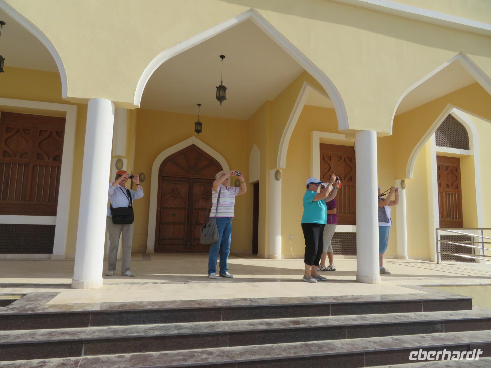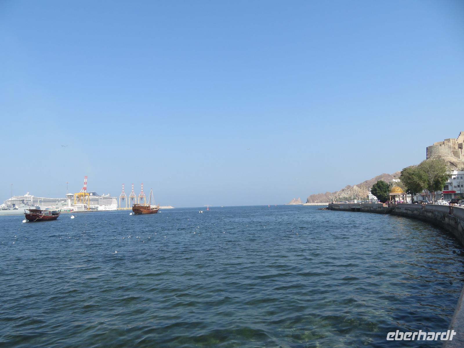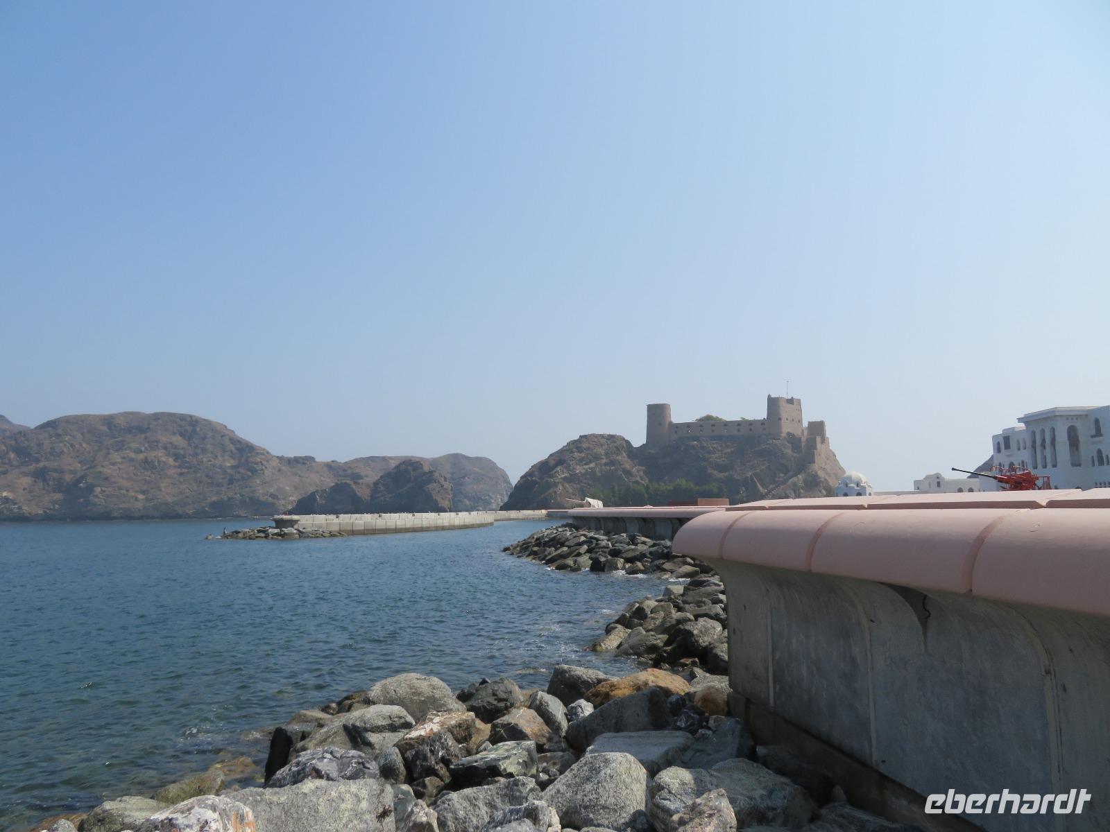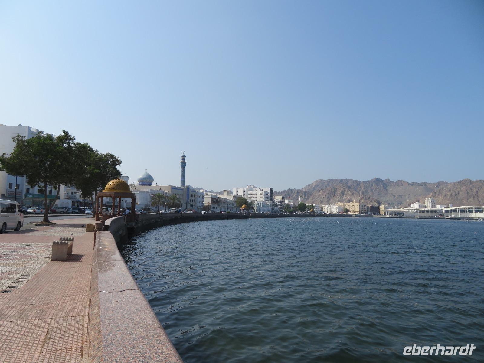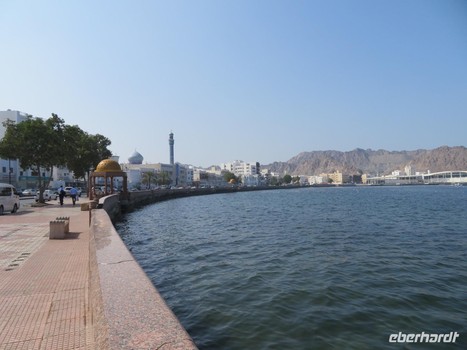 Nach dem Frühstück gehen wir zunächst auf den Gewürzmarkt in Sur und kaufen noch einige Gewürze für den heimatlichen Gebrauch. Danach fahren wir weiter in Richtung Muscat, unserer letzten Station. Doch auf dem Weg dorthin halten wir an der Ruinenstätte Qualhat, die im 13. Jahrhundert die erste Hauptstadt des damaligen Königreichs Hormuz war. Im damaligen Zeitalter war die Stadt mit einer Mauer und Wehrtürmen umgeben, aber im Jahr 1508 wurde die Stadt von den Portugiesen zerstört und die Bewohner getötet. Nach der Tragödie wurde die Stadt nicht wieder aufgebaut und geriet in Vergessenheit. Unsere Mittagspause verbringen wir am Wadi Tiwi, ein ruhige Idylle. Die Vegetation rund um den Wadi besteht neben Palmen auch aus Bananen, Mango- und Feigenbäume. Perfekt für ein Picknick, wie gut dass Eberhardt TRAVEL daran gedacht hat. Neben Fladenbrot werden Streichkäse und Chips gereicht. Klingt komisch, schmeckt aber gut :) Wir packen zusammen und unsere nächste Haltestelle an der Küstenstraße in Richtung Norden liegt das Bimmah Sinkhole. Legenden zufolge soll hier ein Krater eingeschlagen haben und dieses Badeparadies geschaffen haben. Doch dieses hat eigentlich natürliche Ursachen, das Sandgestein wurde vom Golf vom Oman unterspült und dieses Badeloch entstand. Wir besichtigen noch die Küstenstadt Quiryat und wir fahren über das Al Hajar Gebirge, schon von weitem erblicken wir die Hauptstadt des Omans, Muscat. Hier treffen sich Vergangenheit und Gegenwart. Wir machen noch eine Erkundungstour rund um das Hotel und essen dann gemeinsam zu Abend.
