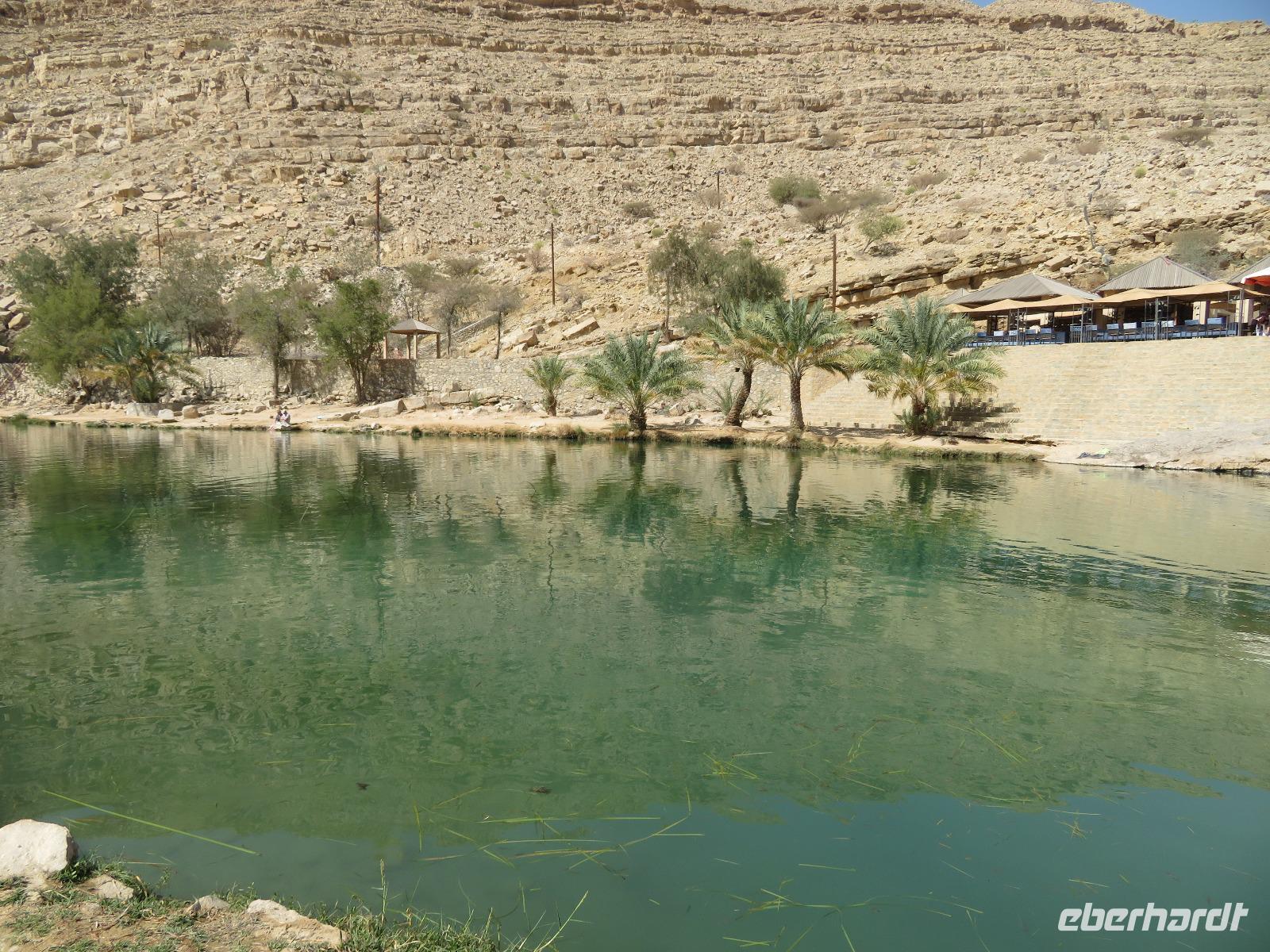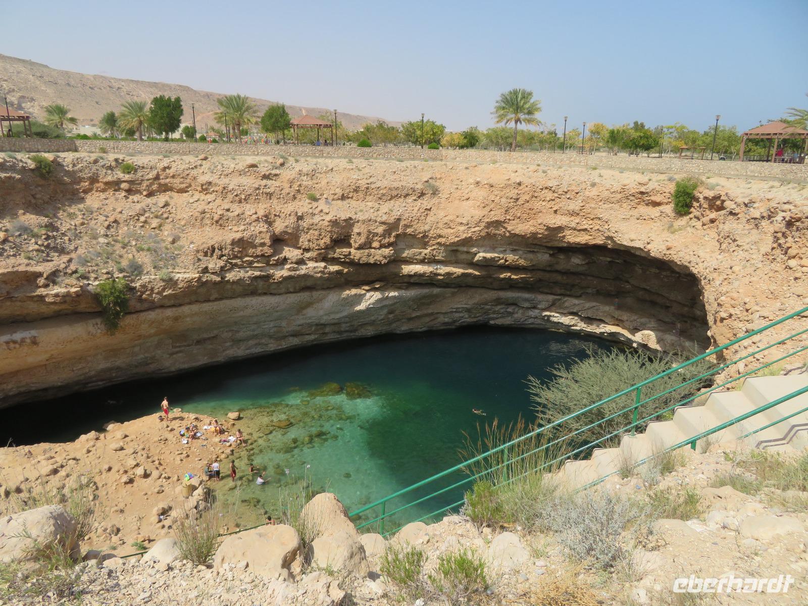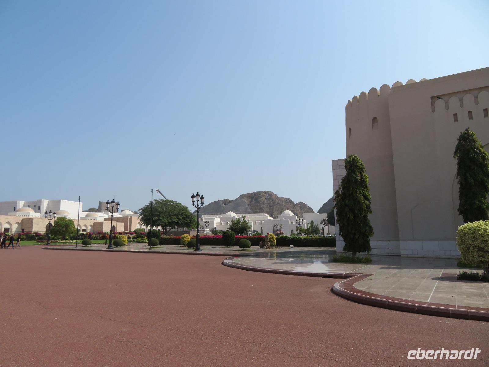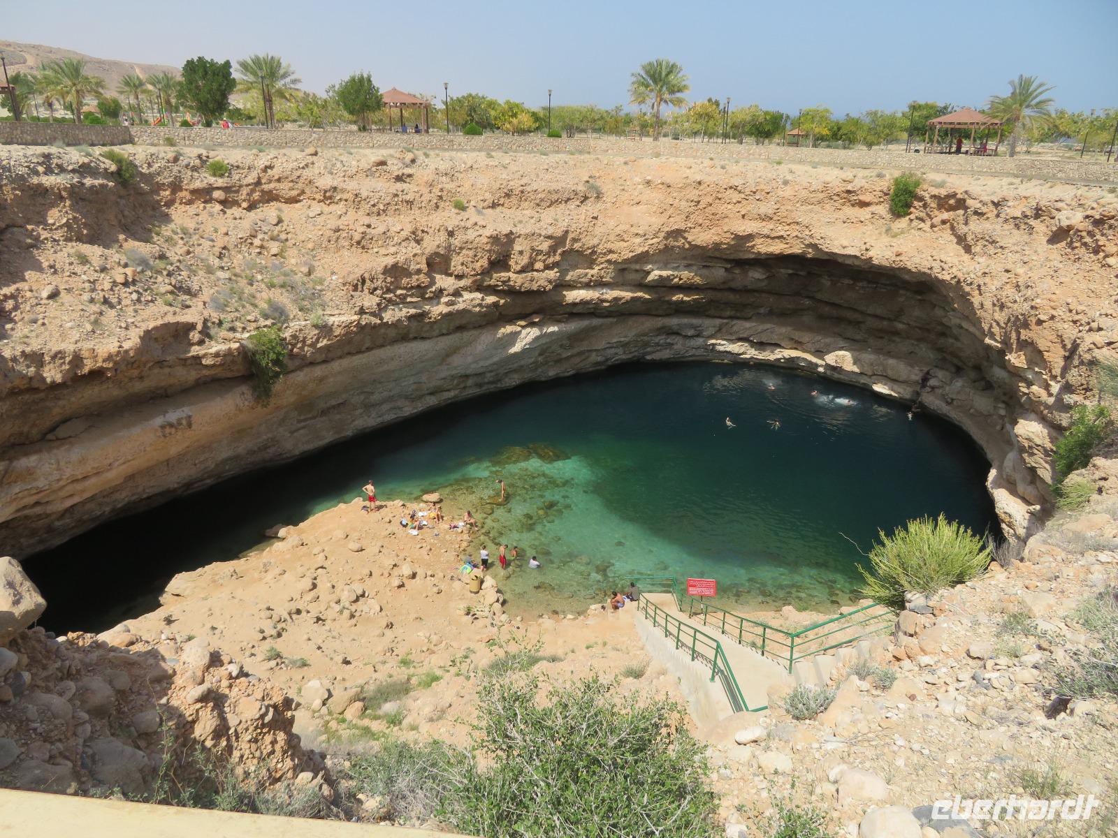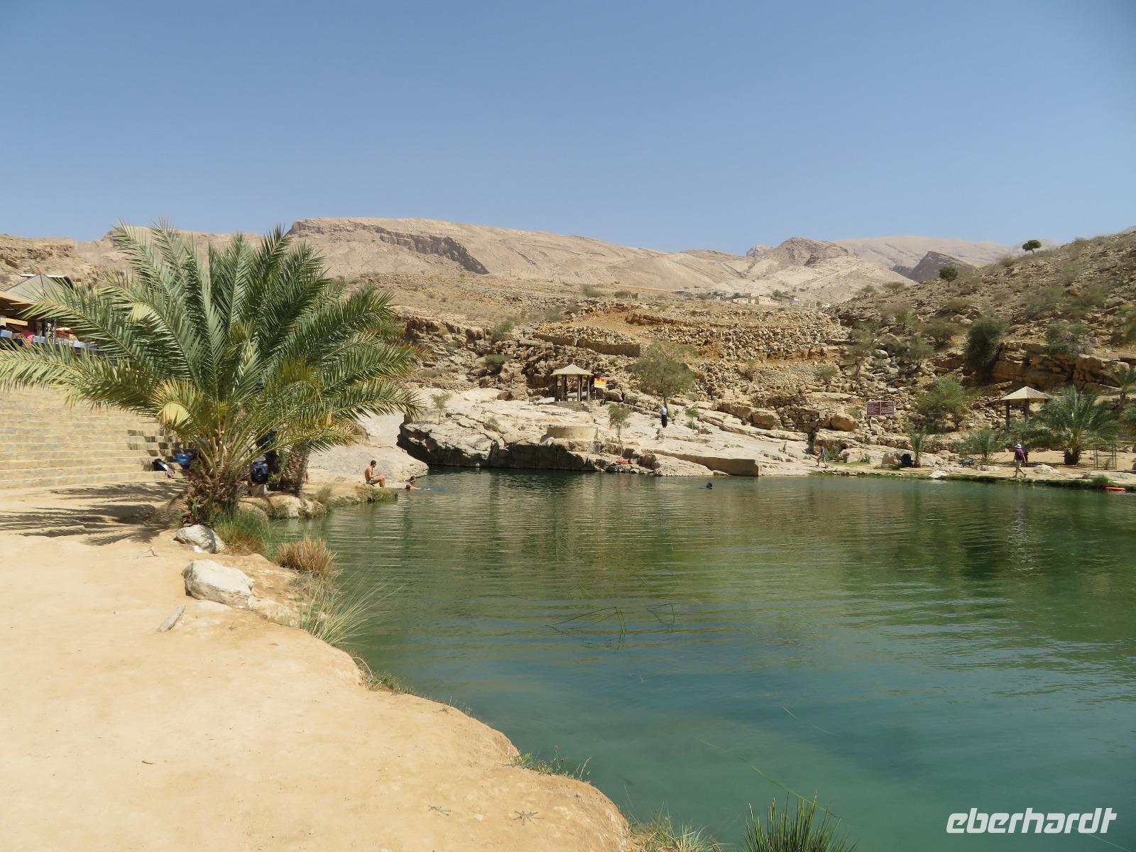 Nach dem Frühstück gehen wir zunächst auf den Gewürzmarkt in Sur und kaufen noch einige Gewürze für den heimatlichen Gebrauch. Danach fahren wir weiter in Richtung Muscat, unserer letzten Station. Doch auf dem Weg dorthin halten wir an der Ruinenstätte Qualhat, die im 13. Jahrhundert die erste Hauptstadt des damaligen Königreichs Hormuz war. Im damaligen Zeitalter war die Stadt mit einer Mauer und Wehrtürmen umgeben, aber im Jahr 1508 wurde die Stadt von den Portugiesen zerstört und die Bewohner getötet. Nach der Tragödie wurde die Stadt nicht wieder aufgebaut und geriet in Vergessenheit. Unsere Mittagspause verbringen wir am Wadi Tiwi, ein ruhige Idylle. Die Vegetation rund um den Wadi besteht neben Palmen auch aus Bananen, Mango- und Feigenbäume. Perfekt für ein Picknick, wie gut dass Eberhardt TRAVEL daran gedacht hat. Neben Fladenbrot werden Streichkäse und Chips gereicht. Klingt komisch, schmeckt aber gut :) Wir packen zusammen und unsere nächste Haltestelle an der Küstenstraße in Richtung Norden liegt das Bimmah Sinkhole. Legenden zufolge soll hier ein Krater eingeschlagen haben und dieses Badeparadies geschaffen haben. Doch dieses hat eigentlich natürliche Ursachen, das Sandgestein wurde vom Golf vom Oman unterspült und dieses Badeloch entstand. Wir besichtigen noch die Küstenstadt Quiryat und wir fahren über das Al Hajar Gebirge, schon von weitem erblicken wir die Hauptstadt des Omans, Muscat. Hier treffen sich Vergangenheit und Gegenwart. Wir machen noch eine Erkundungstour rund um das Hotel und essen dann gemeinsam zu Abend.