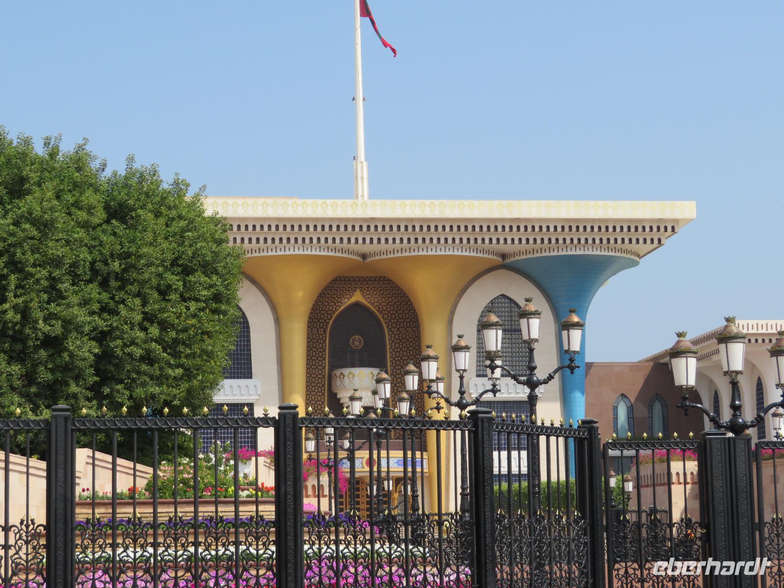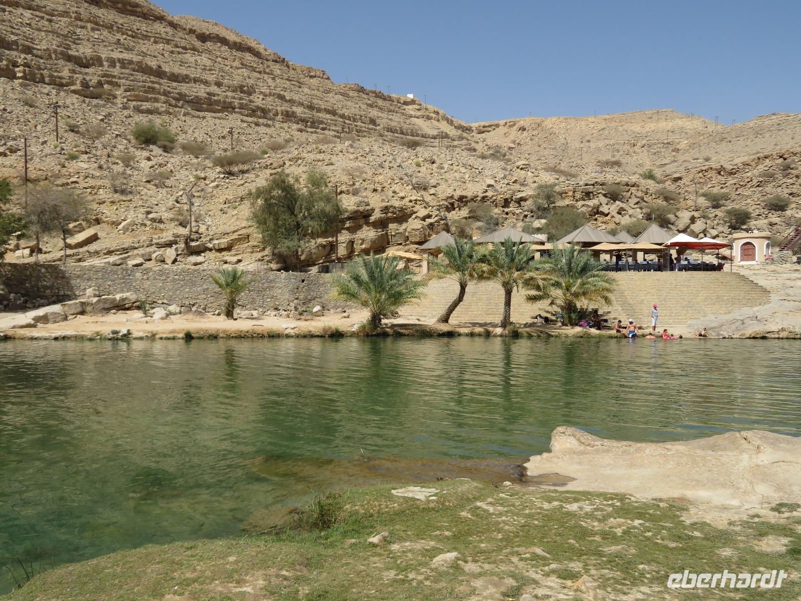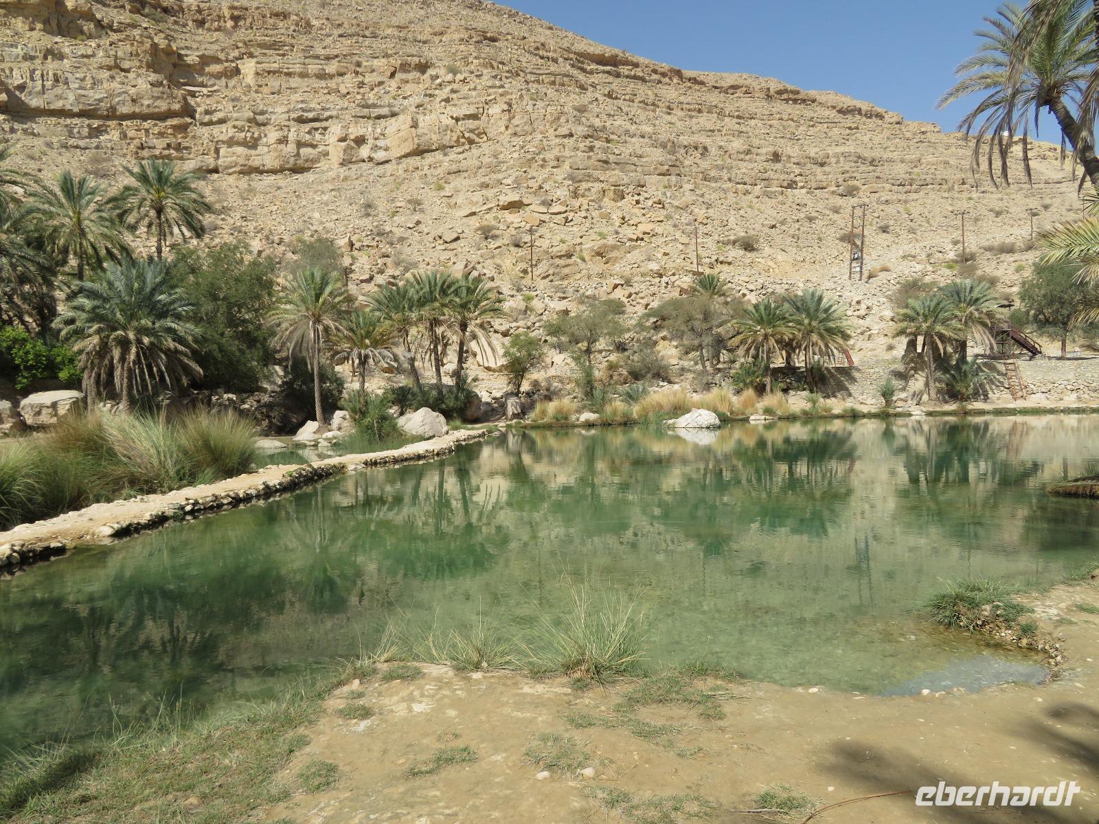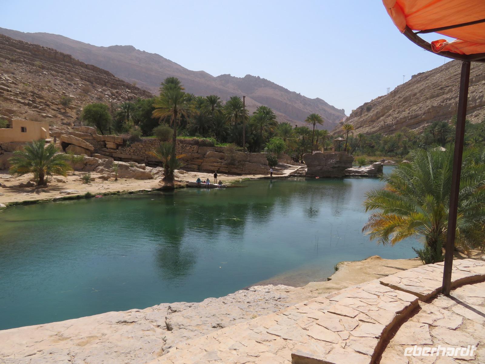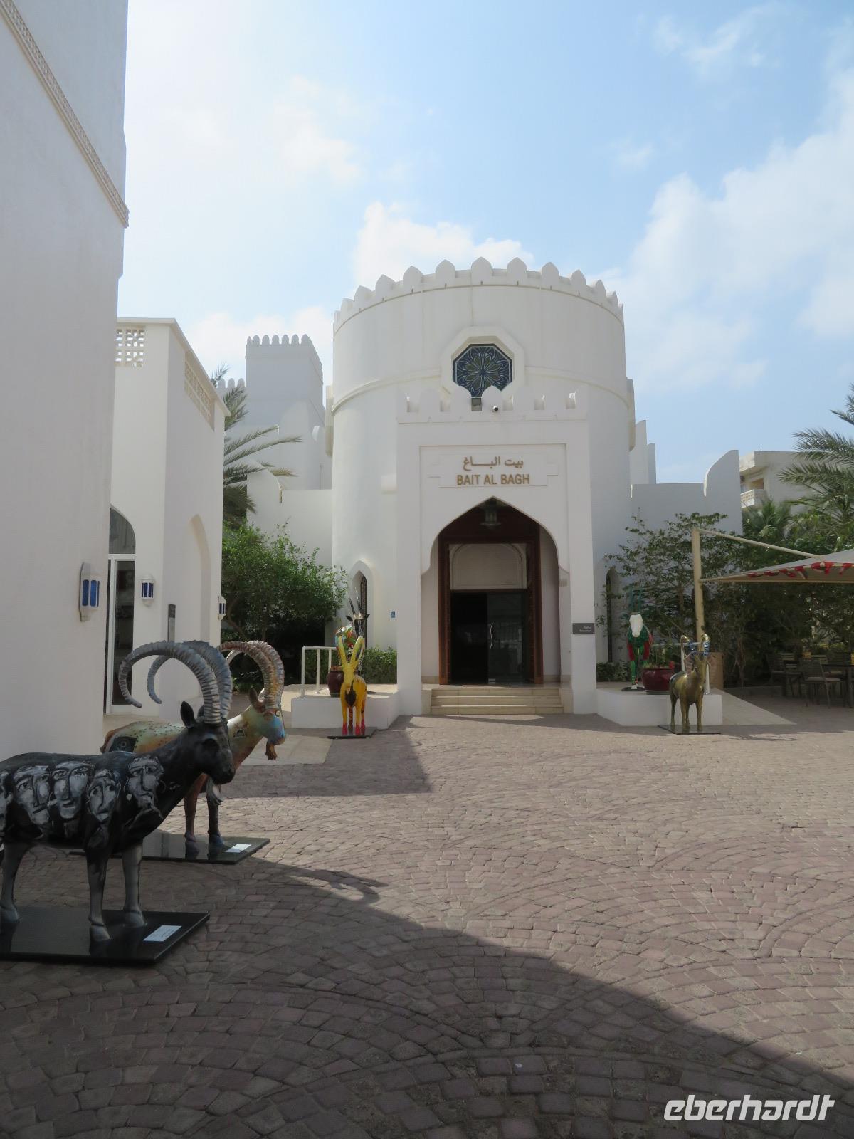Nach dem Frühstück gehen wir zunächst auf den Gewürzmarkt in Sur und kaufen noch einige Gewürze für den heimatlichen Gebrauch. Danach fahren wir weiter in Richtung Muscat, unserer letzten Station. Doch auf dem Weg dorthin halten wir an der Ruinenstätte Qualhat, die im 13. Jahrhundert die erste Hauptstadt des damaligen Königreichs Hormuz war. Im damaligen Zeitalter war die Stadt mit einer Mauer und Wehrtürmen umgeben, aber im Jahr 1508 wurde die Stadt von den Portugiesen zerstört und die Bewohner getötet. Nach der Tragödie wurde die Stadt nicht wieder aufgebaut und geriet in Vergessenheit. Unsere Mittagspause verbringen wir am Wadi Tiwi, ein ruhige Idylle. Die Vegetation rund um den Wadi besteht neben Palmen auch aus Bananen, Mango- und Feigenbäume. Perfekt für ein Picknick, wie gut dass Eberhardt TRAVEL daran gedacht hat. Neben Fladenbrot werden Streichkäse und Chips gereicht. Klingt komisch, schmeckt aber gut :) Wir packen zusammen und unsere nächste Haltestelle an der Küstenstraße in Richtung Norden liegt das Bimmah Sinkhole. Legenden zufolge soll hier ein Krater eingeschlagen haben und dieses Badeparadies geschaffen haben. Doch dieses hat eigentlich natürliche Ursachen, das Sandgestein wurde vom Golf vom Oman unterspült und dieses Badeloch entstand. Wir besichtigen noch die Küstenstadt Quiryat und wir fahren über das Al Hajar Gebirge, schon von weitem erblicken wir die Hauptstadt des Omans, Muscat. Hier treffen sich Vergangenheit und Gegenwart. Wir machen noch eine Erkundungstour rund um das Hotel und essen dann gemeinsam zu Abend.