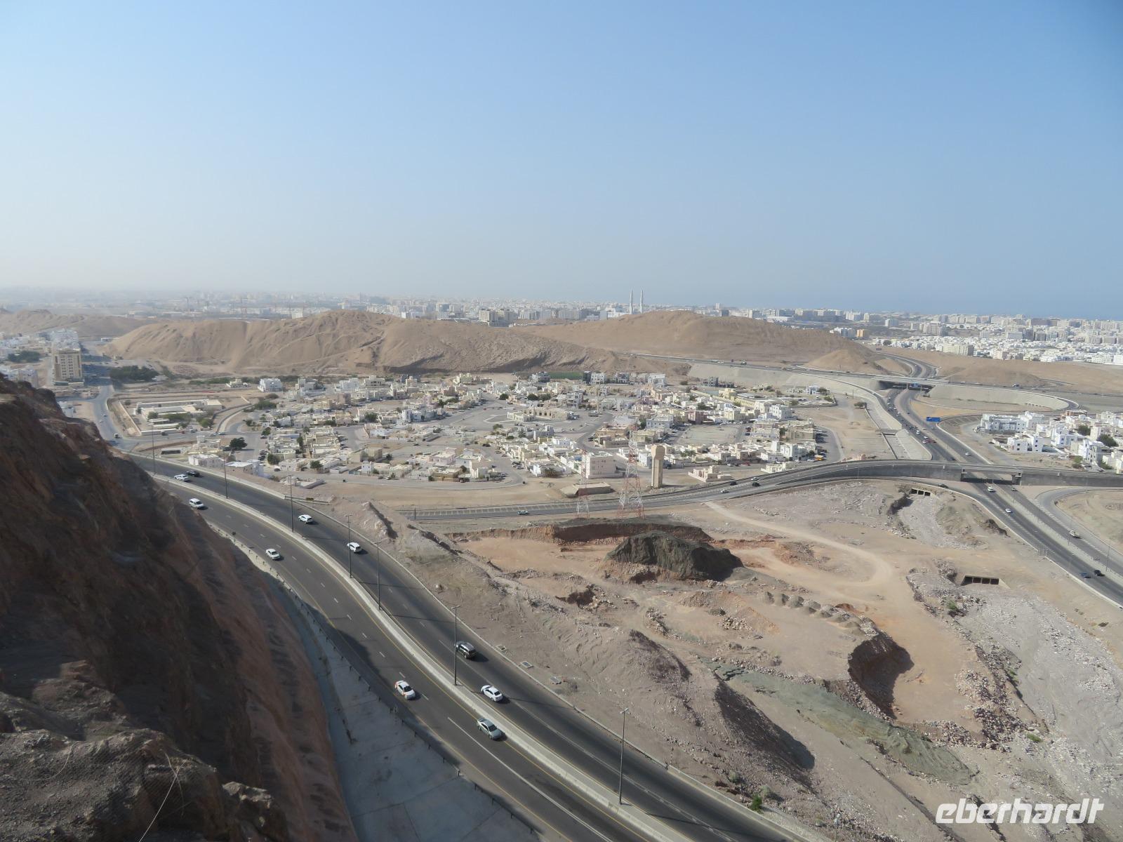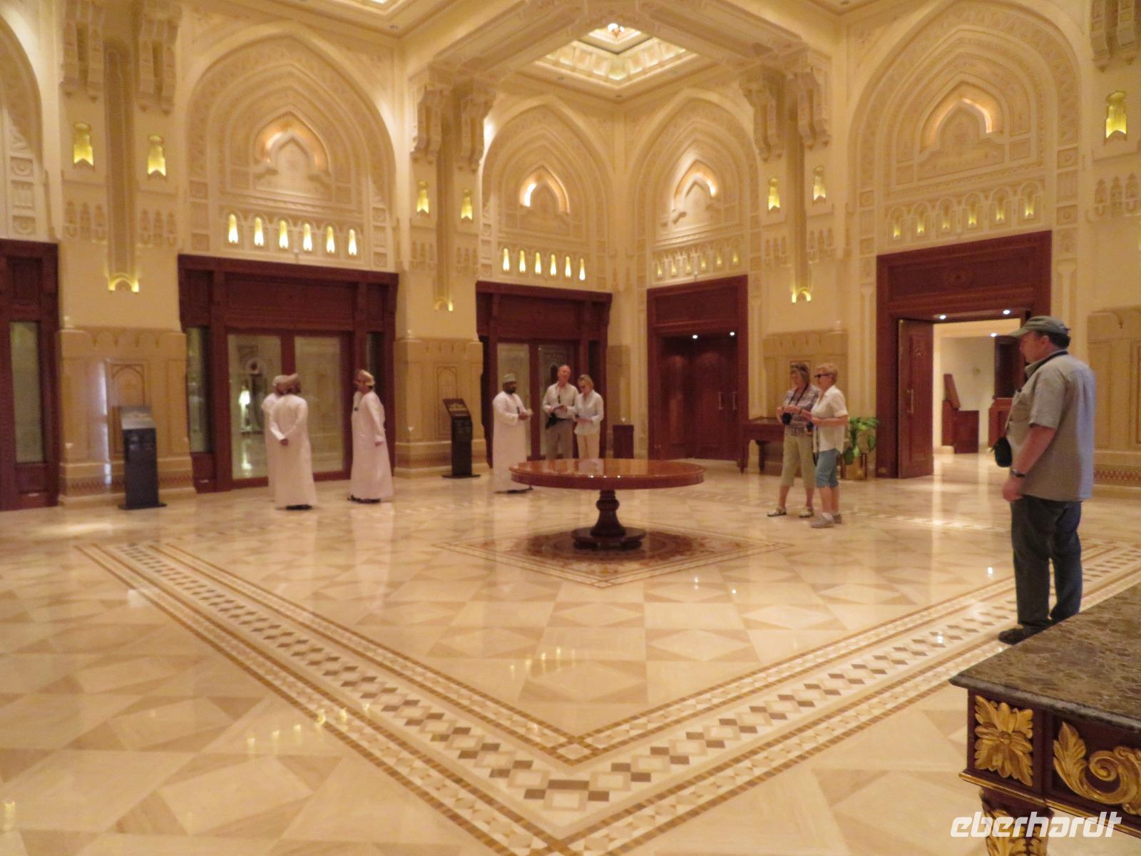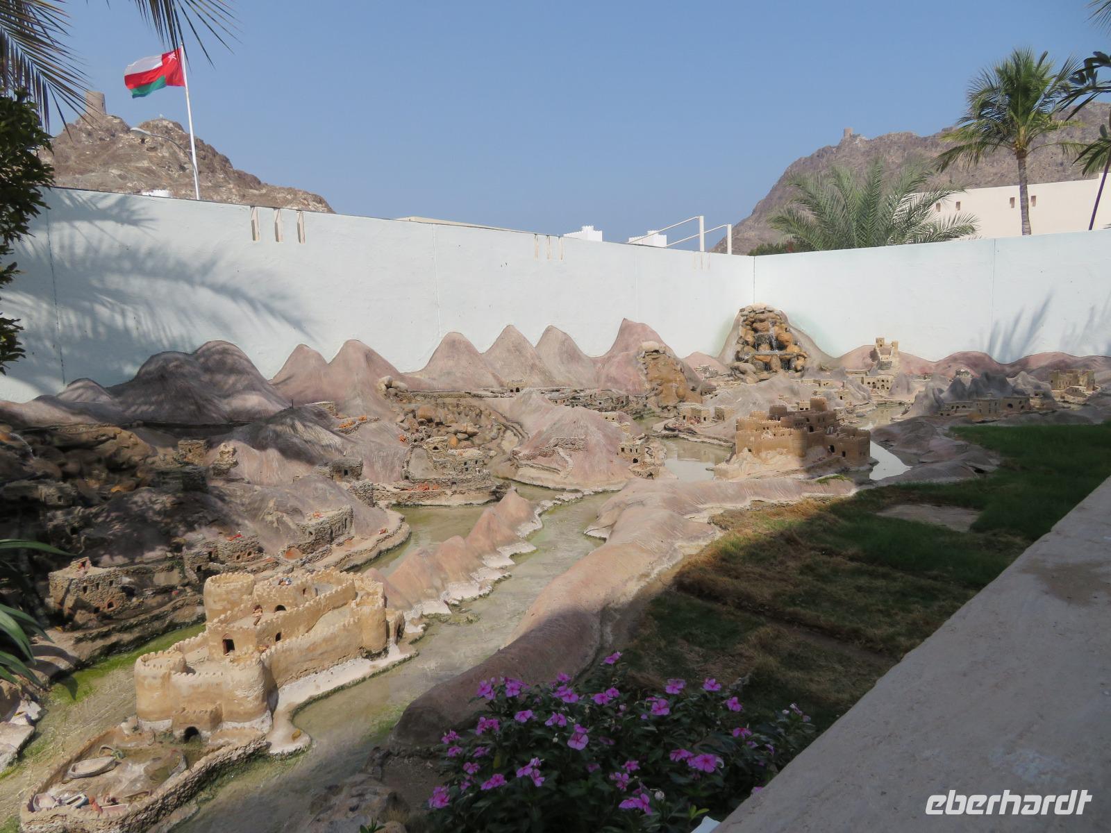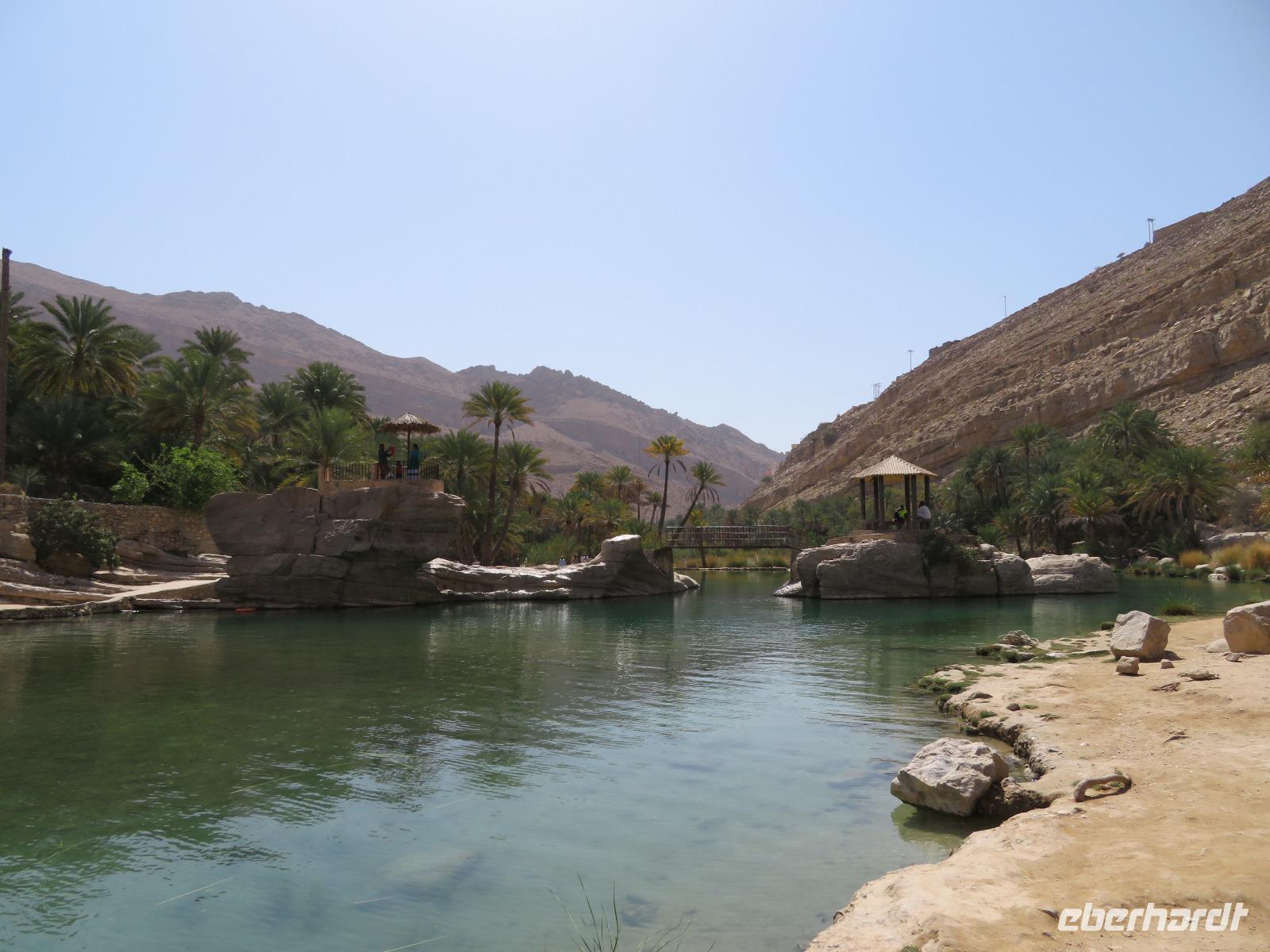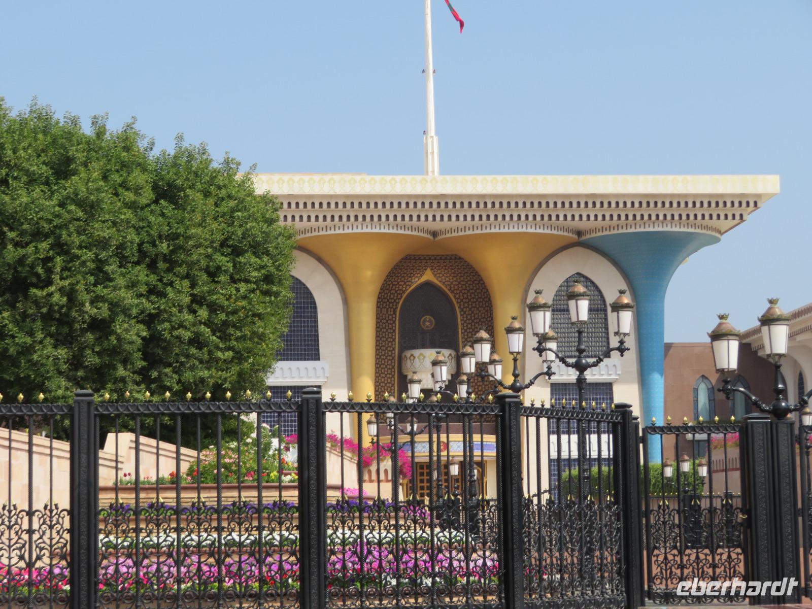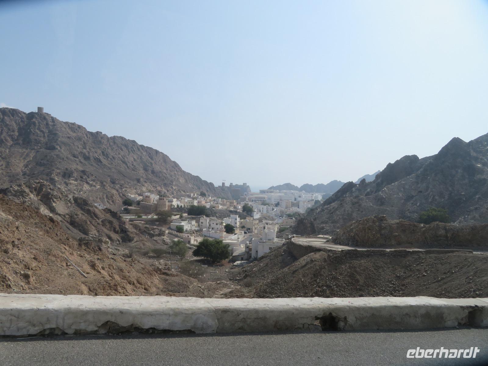 Nach dem Frühstück gehen wir zunächst auf den Gewürzmarkt in Sur und kaufen noch einige Gewürze für den heimatlichen Gebrauch. Danach fahren wir weiter in Richtung Muscat, unserer letzten Station. Doch auf dem Weg dorthin halten wir an der Ruinenstätte Qualhat, die im 13. Jahrhundert die erste Hauptstadt des damaligen Königreichs Hormuz war. Im damaligen Zeitalter war die Stadt mit einer Mauer und Wehrtürmen umgeben, aber im Jahr 1508 wurde die Stadt von den Portugiesen zerstört und die Bewohner getötet. Nach der Tragödie wurde die Stadt nicht wieder aufgebaut und geriet in Vergessenheit. Unsere Mittagspause verbringen wir am Wadi Tiwi, ein ruhige Idylle. Die Vegetation rund um den Wadi besteht neben Palmen auch aus Bananen, Mango- und Feigenbäume. Perfekt für ein Picknick, wie gut dass Eberhardt TRAVEL daran gedacht hat. Neben Fladenbrot werden Streichkäse und Chips gereicht. Klingt komisch, schmeckt aber gut :) Wir packen zusammen und unsere nächste Haltestelle an der Küstenstraße in Richtung Norden liegt das Bimmah Sinkhole. Legenden zufolge soll hier ein Krater eingeschlagen haben und dieses Badeparadies geschaffen haben. Doch dieses hat eigentlich natürliche Ursachen, das Sandgestein wurde vom Golf vom Oman unterspült und dieses Badeloch entstand. Wir besichtigen noch die Küstenstadt Quiryat und wir fahren über das Al Hajar Gebirge, schon von weitem erblicken wir die Hauptstadt des Omans, Muscat. Hier treffen sich Vergangenheit und Gegenwart. Wir machen noch eine Erkundungstour rund um das Hotel und essen dann gemeinsam zu Abend.