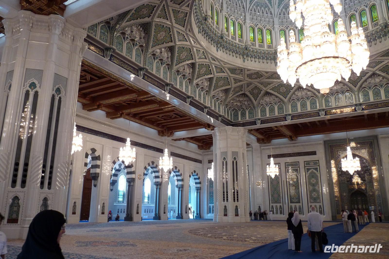 An unserem letzten Tag im Oman besuchen wir die Große Moschee Sultan Qaboos. Indischer Sandstein ziert die prächtige Freitagsmoschee. 5 hoch aufragende Minarette stehen als Sinnbild für die 5 Säulen des Islam. In der Hauptgebetshalle bewundern wir die kunstvolle Ausstattung, darunter den 8 Tonnen schweren Kronleuchter aus Swarowskikristallen, 8 Meter breit und 14 Meter hoch. 6.500 Muslime finden hier unter der riesigen Kuppel Platz zum Gebet.