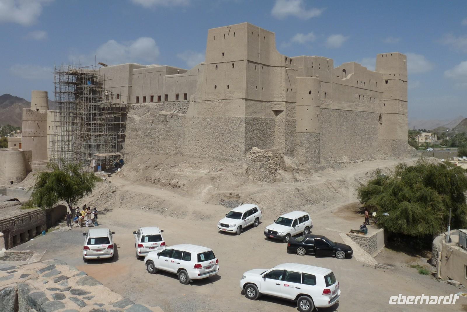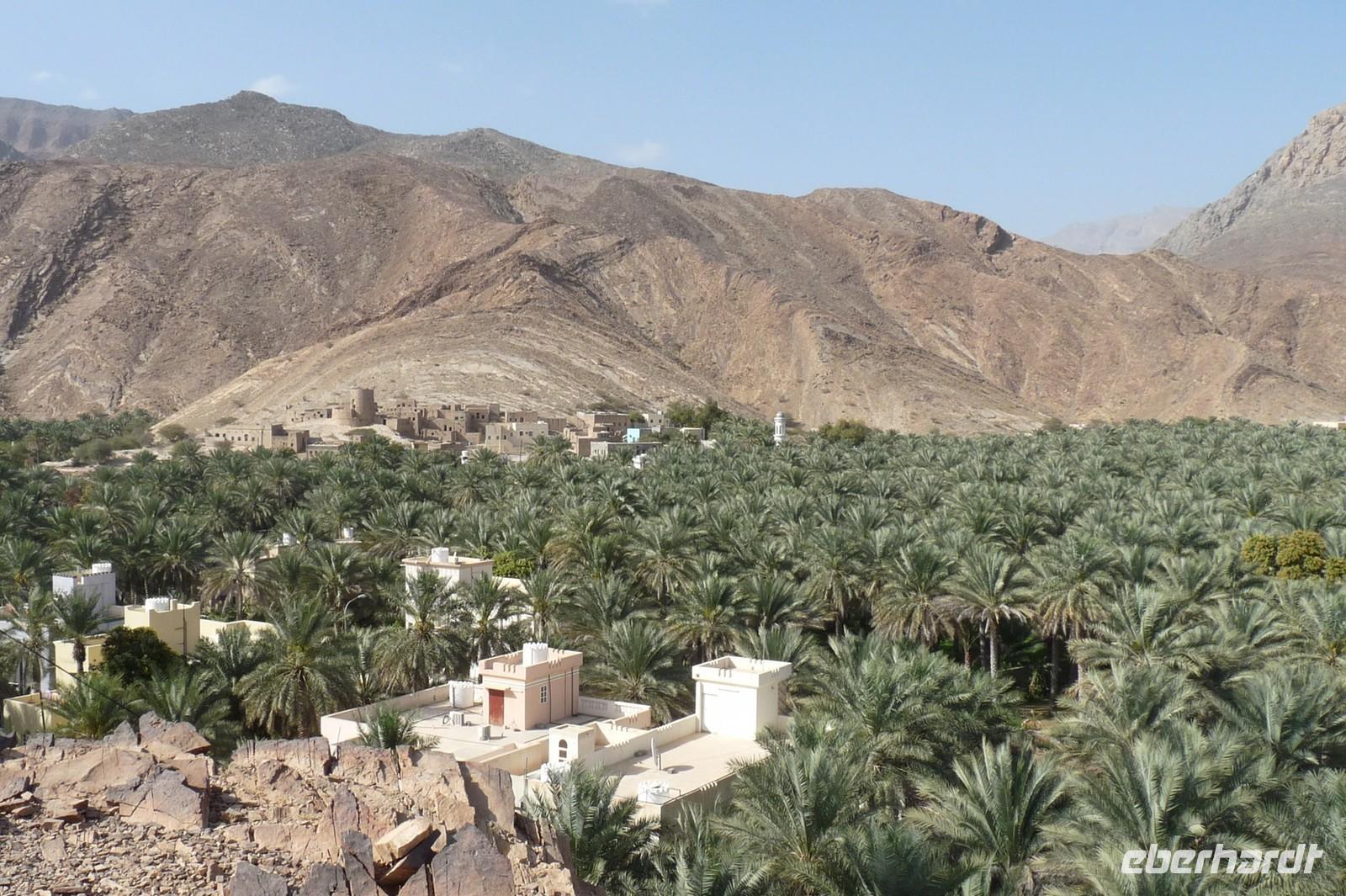 Im Zentrum Nizwas thront die mächtige Festung mit seinem großen Rundturm. Er bietet einen prächtigen Ausblick auf die Stadt und das Gebirgsmassiv Jebel Al Akhdar. Zu Füßen der Berge liegen weitere sehenswerte Oasen. Wir besuchen Jabrin und Bahla mit ihren Forts und spazieren durch den Dattelpalmengarten von Al Hamra. Wir beobachten, wie eine weibliche Dattelpalme befruchtet wird - Palme hochklettern, männliche Blütenstängel zwischen die weiblichen Blüten binden - fertig. Ein halbes Jahr später kann geerntet werden.