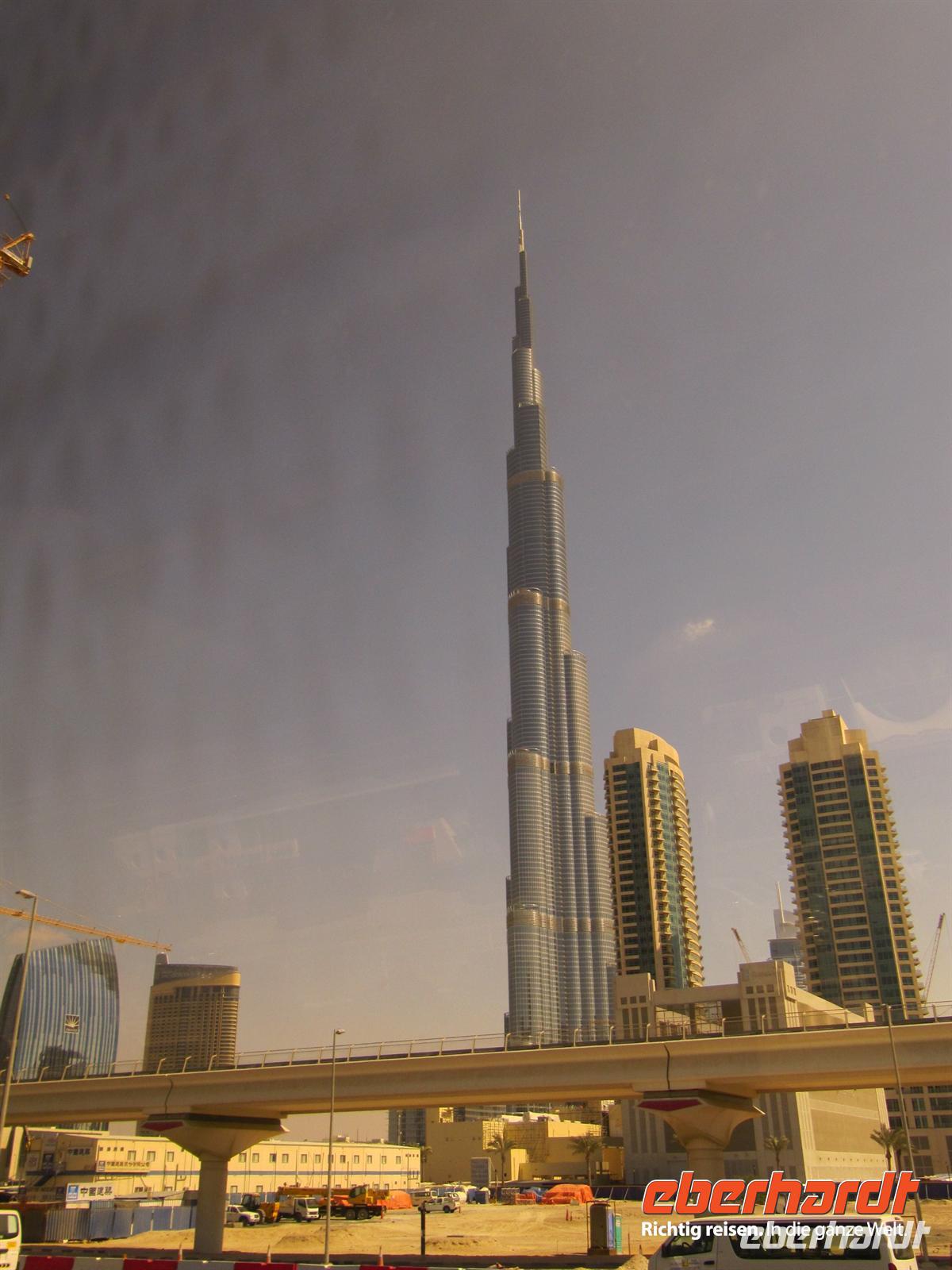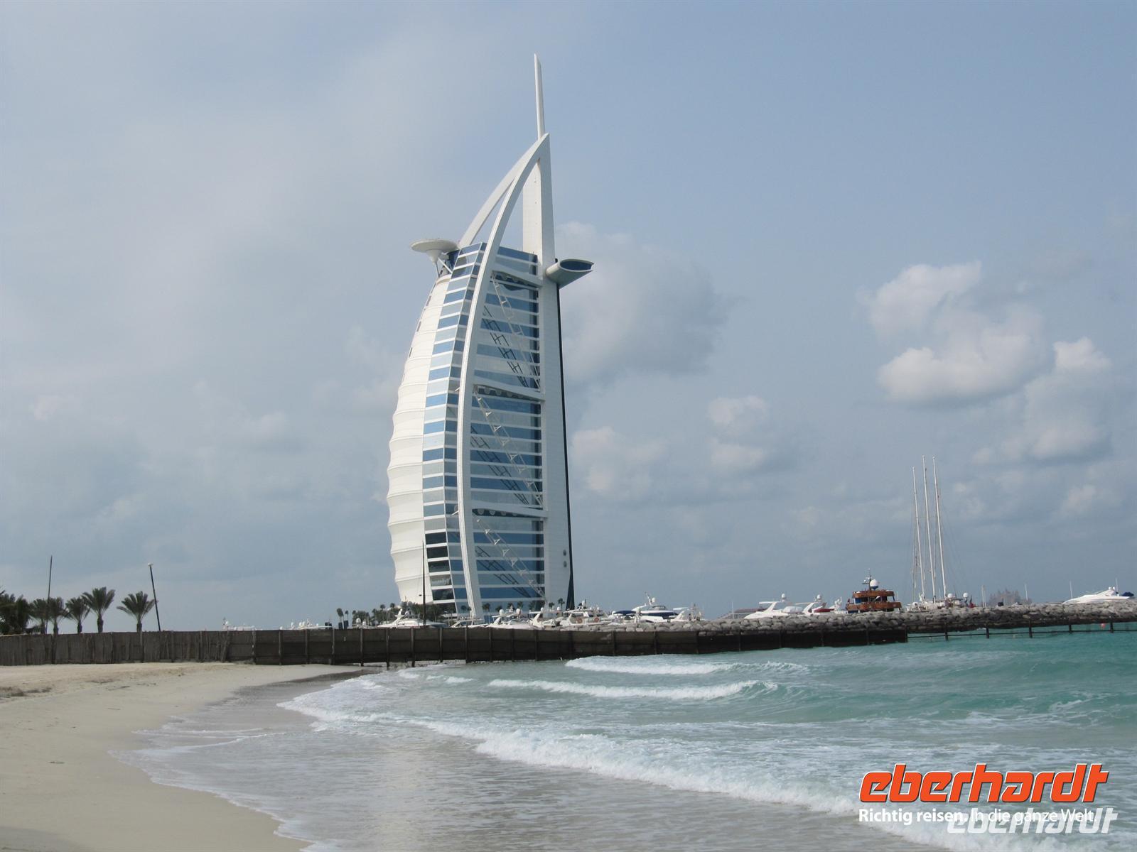 Wir, das waren 17 Gäste aus Dresden und Umgebung und ich, die Reisebegleiterin, trafen uns am späten Nachmittag am Flughafen. Die netten Kolleginnen von unserem eberhardt-Reisebüro hatten für uns den Check In schon vorbereitet und so konnten wir ganz entspannt mit einem Snack im Restaurant „Chili“ unsere Reise beginnen. Zunächst flogen wir nach München. Hier trafen wir die Gäste, die aus Leipzig, Berlin und mit der Bahn angereist waren. Unsere Gruppe war mit 26 Personen komplett. Allerdings blieben zwei Gäste zunächst in München zurück, weil eine Dame gestürzt war und der Lufthansa-Arzt sie erst im Krankenhaus untersuchen lassen wollte. Pünktlich starteten wir in Richtung Dubai. Der Flug verlief planmäßig und nach dem wir Deutschland bei Schmuddelwetter verlassen hatten begrüßten uns in Dubai angenehme 22°C und etwas bedeckter Himmel. An der Passkontrolle erhielten wir unseren Einreisestempel und nachdem wir alle unsere Koffer hatten trafen wir Martina, unsere örtliche Reiseleiterin. Mit dem Bus fuhren wir zunächst zum Hotel. Dabei konnten wir einen ersten Blick auf die Skyline von Dubai werfen. Im Arabian Courtyard Hotel stärkten wir uns mit einem leckeren Frühstück und stellten unsere Koffer ein. Nun erwartete uns eine erste Stadtrundfahrt. Wir sahen zunächst das berühmte Hotel Burj al Arab und den Jumeira Beach. In Dubai herrschte ein sehr starker Wind und so war auch das Meer etwas aufgewühlt. Es boten sich uns erste sehr schöne Fotomotive. Weiter ging es auf die