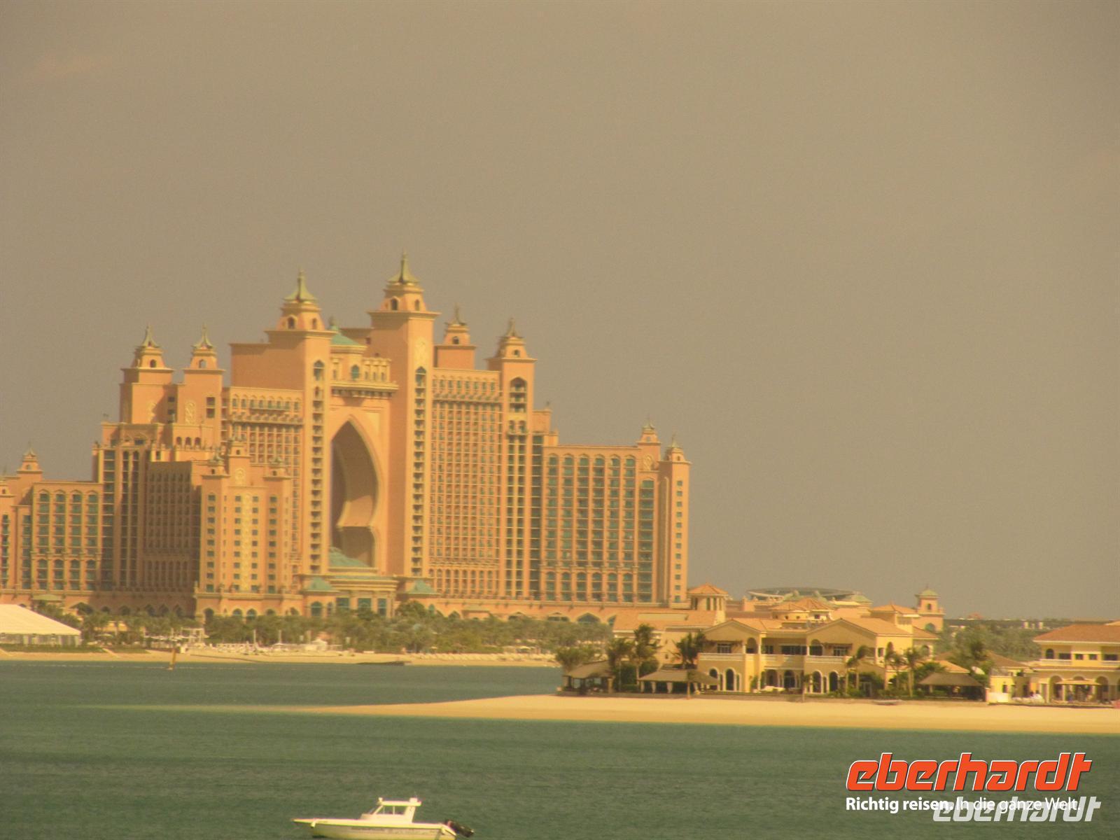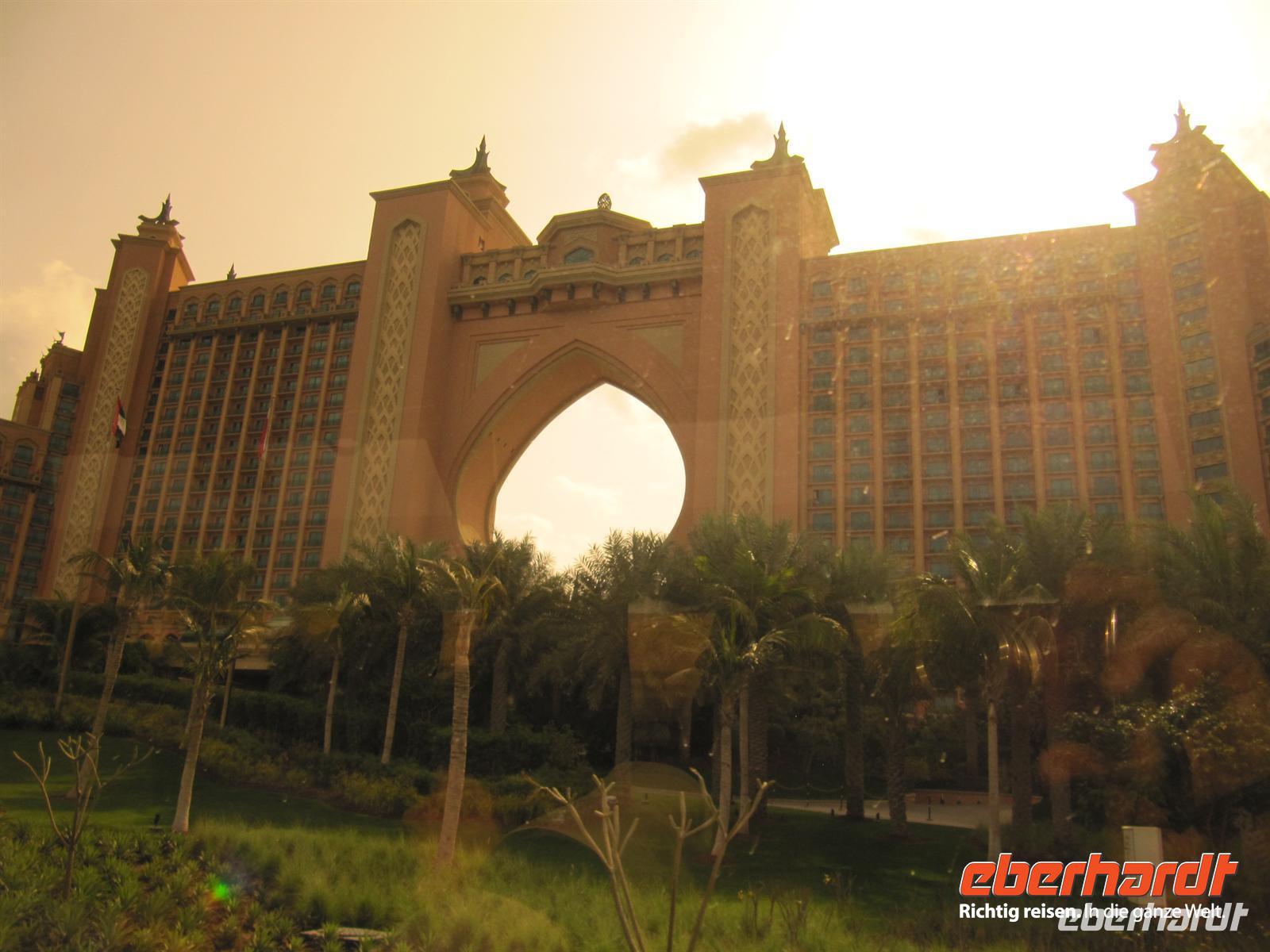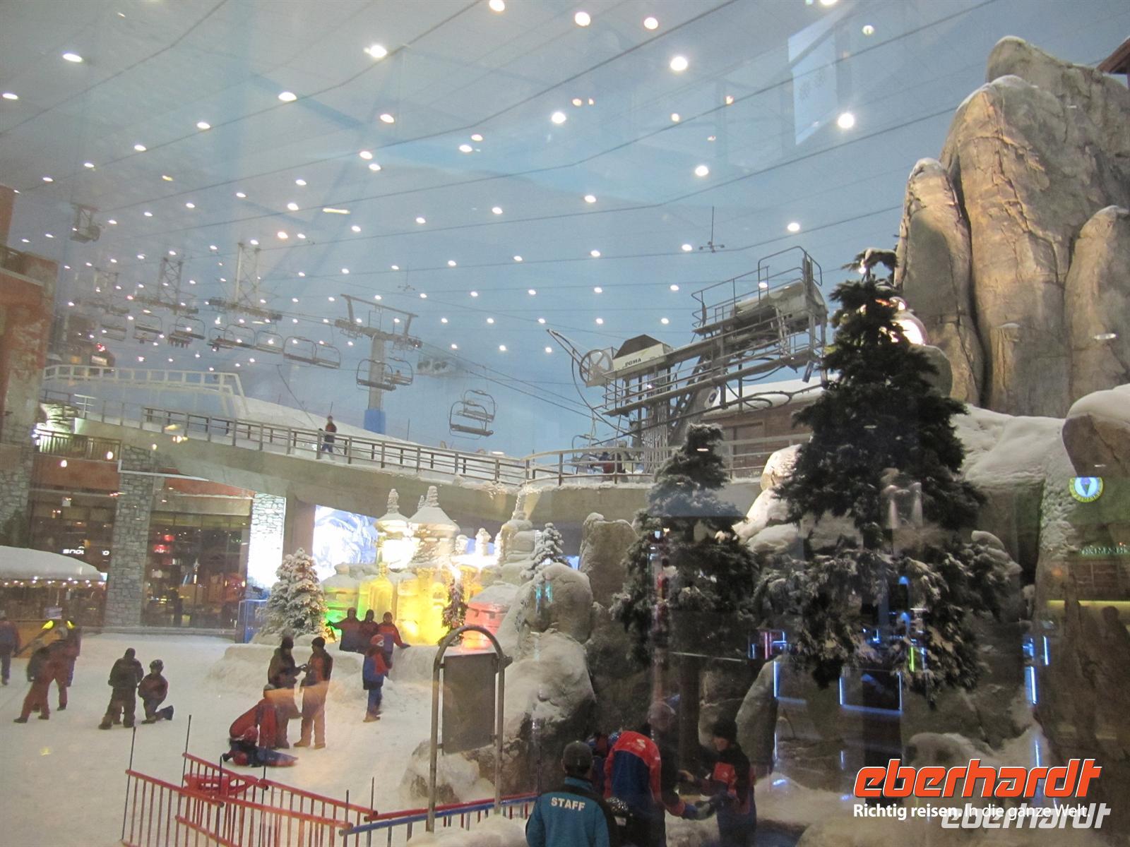 künstlich aufgeschüttete Insel „The Palm“. Wir fuhren den gesamten Stamm hinauf vorbei an tollen Appartement-Häusern, Am Ende ging es in einem Tunnel durch das Meer zum Außenring. Hier sahen wir das Hotel Atlantis. Dieses 5-Sterne-Hotel ist eine Kopie des Originals, welches auf den Bahamas steht. Natürlich kamen auch hier die Fotografen voll auf ihre Kosten. Nun zeigte uns unsere örtliche Reiseleiterin noch die Marina Dubai. Zunächst fuhren wir den Außenring der Palme bis zum Ende. Hier sahen wir die Skyline der Marina. Anschließend ging es direkt in die Marina. Es ist gigantisch, was in den letzten zehn Jahren erbaut wurde und immer noch wird. Der Fantasie der Architekten wurde freien Lauf gelassen und es entstanden und entstehen wirklich futuristische Bauten. Anschließend beusuchten wir die Mall of Emirates. Dies ist eine der großen Einkaufszentren von Dubai. Hier gibt es ein riesiges Winterland mitten in der Wüste - die Skihalle Dubai. Eine Piste von 400 Meter Länge mit Sessellift, Rodelbahn und Schneespielplatz lässt die Herzen besonders der Kinder höher Schlagen. Das ist schon ein ungewöhnliches Bild. Wir nutzten die Zeit zum Geldumtausch und zu einem kleinen