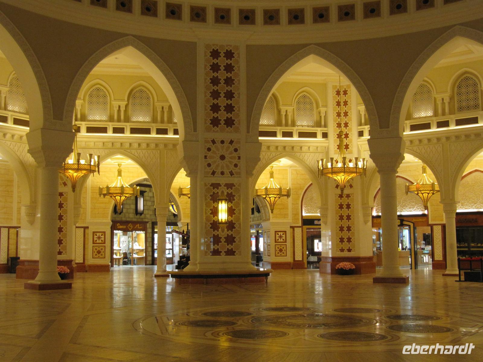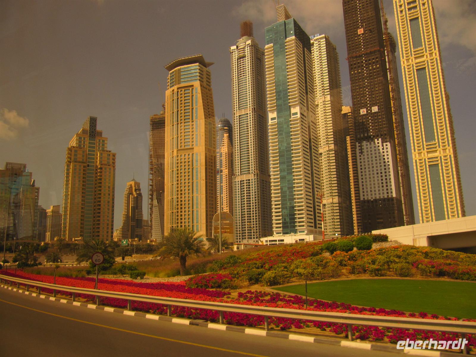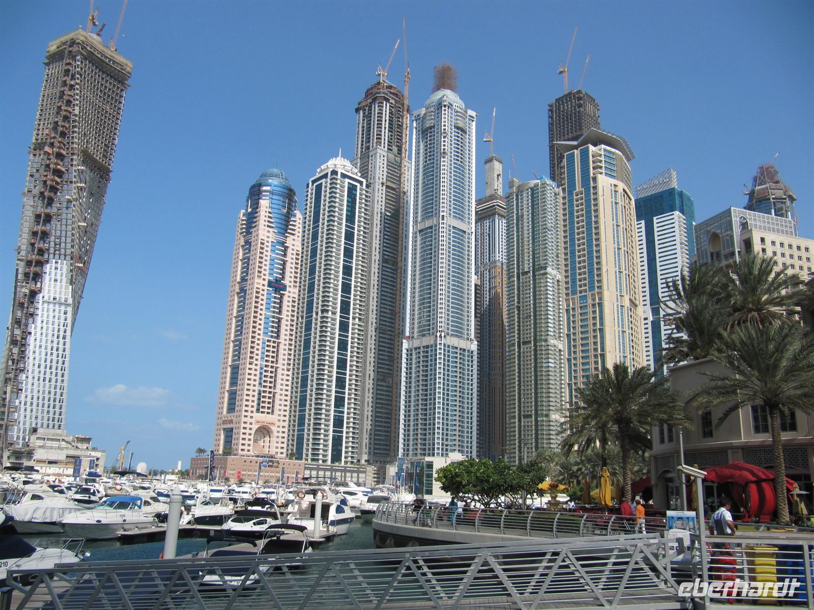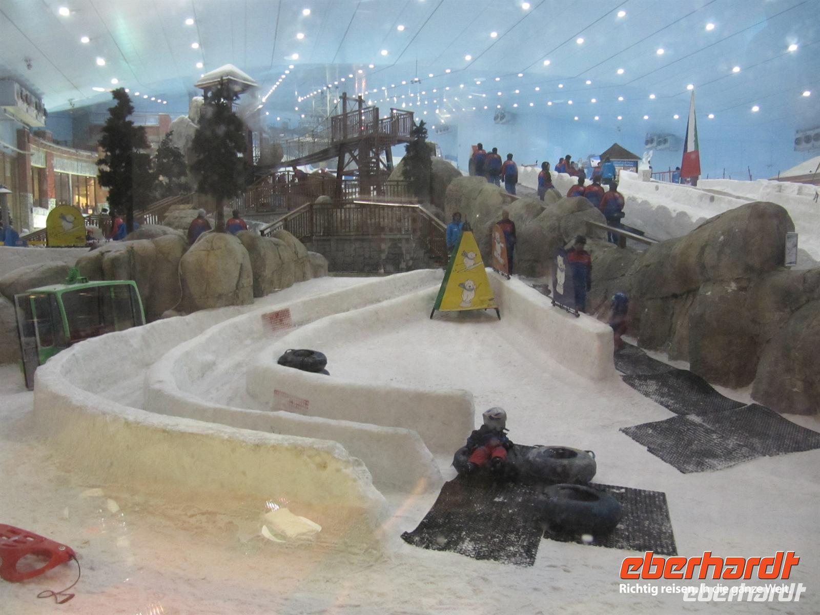 künstlich aufgeschüttete Insel „The Palm“. Wir fuhren den gesamten Stamm hinauf vorbei an tollen Appartement-Häusern, Am Ende ging es in einem Tunnel durch das Meer zum Außenring. Hier sahen wir das Hotel Atlantis. Dieses 5-Sterne-Hotel ist eine Kopie des Originals, welches auf den Bahamas steht. Natürlich kamen auch hier die Fotografen voll auf ihre Kosten. Nun zeigte uns unsere örtliche Reiseleiterin noch die Marina Dubai. Zunächst fuhren wir den Außenring der Palme bis zum Ende. Hier sahen wir die Skyline der Marina. Anschließend ging es direkt in die Marina. Es ist gigantisch, was in den letzten zehn Jahren erbaut wurde und immer noch wird. Der Fantasie der Architekten wurde freien Lauf gelassen und es entstanden und entstehen wirklich futuristische Bauten. Anschließend beusuchten wir die Mall of Emirates. Dies ist eine der großen Einkaufszentren von Dubai. Hier gibt es ein riesiges Winterland mitten in der Wüste - die Skihalle Dubai. Eine Piste von 400 Meter Länge mit Sessellift, Rodelbahn und Schneespielplatz lässt die Herzen besonders der Kinder höher Schlagen. Das ist schon ein ungewöhnliches Bild. Wir nutzten die Zeit zum Geldumtausch und zu einem kleinen