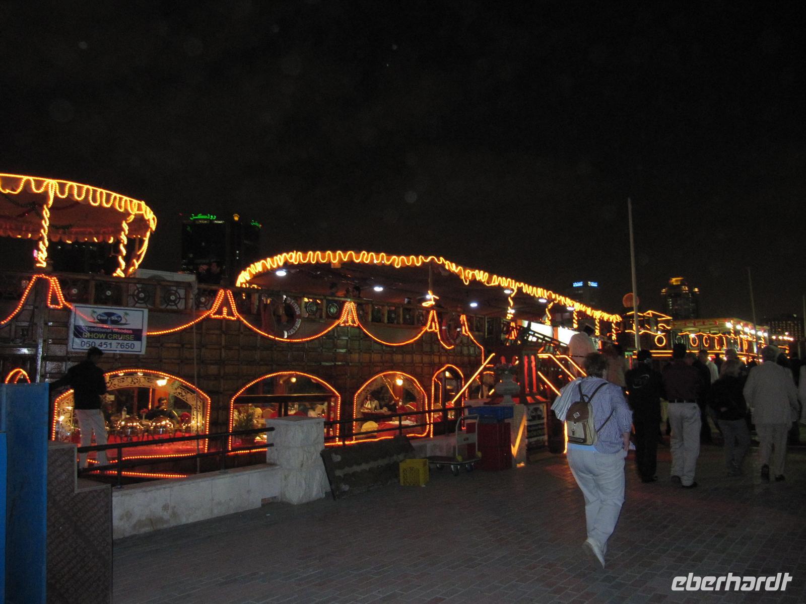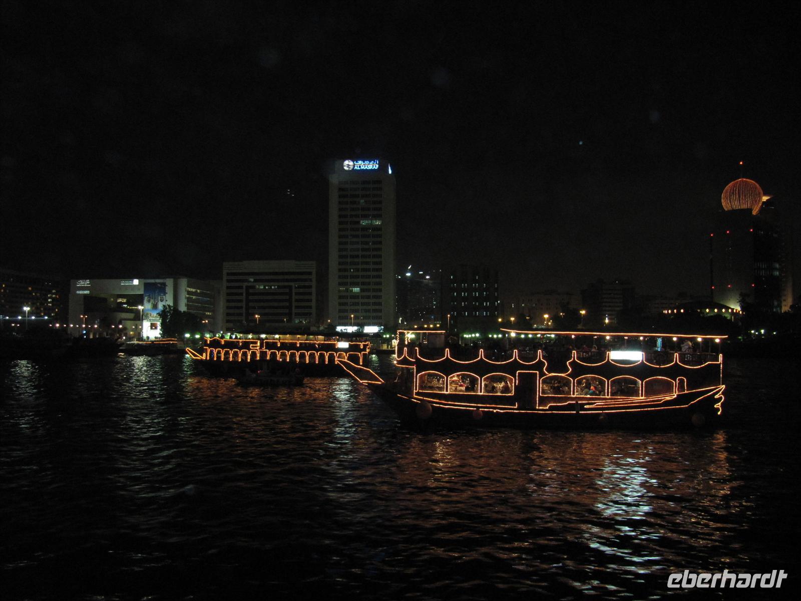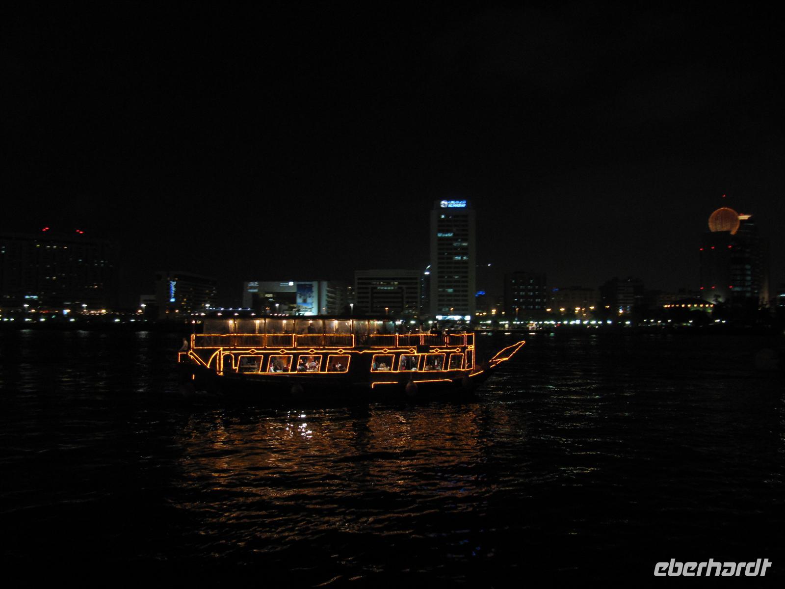 Am Abend spazierten wir zum Creek und unternahmen eine romantische Fahrt mit einer Dauh auf dem Creek. Wir erlebten das abendliche Dubai. Uns wurde ein schmackhaftes arabisches Buffet gereicht, während wir an den beleuchteten Hochhäusern vorbei glitten. Leider blies der Wind sehr stark und wir mussten uns dick anziehen, um nicht zu frieren. Aber dennoch genossen wir die Fahrt und ließen den erlebnisreichen Tag ausklingen.
