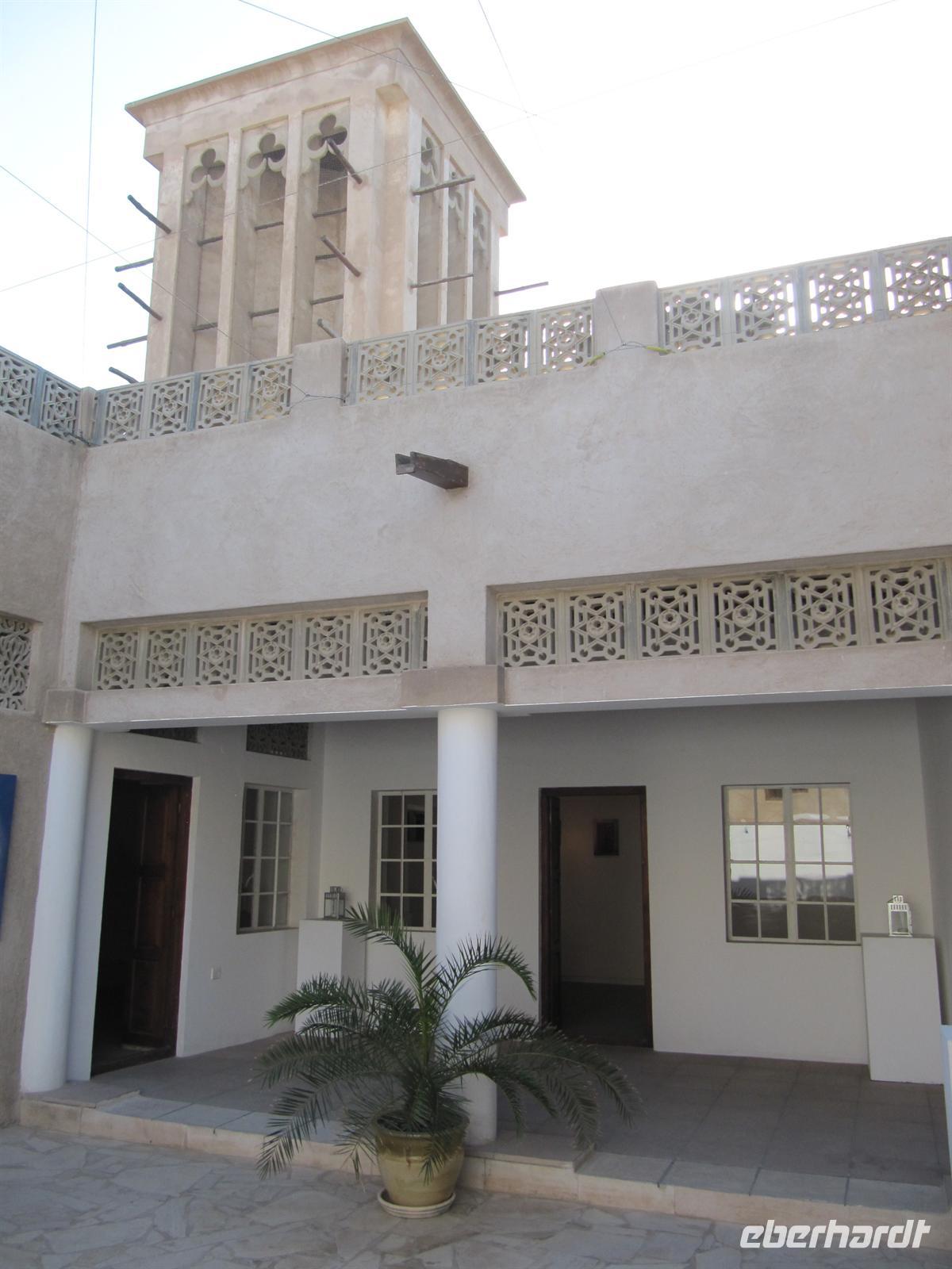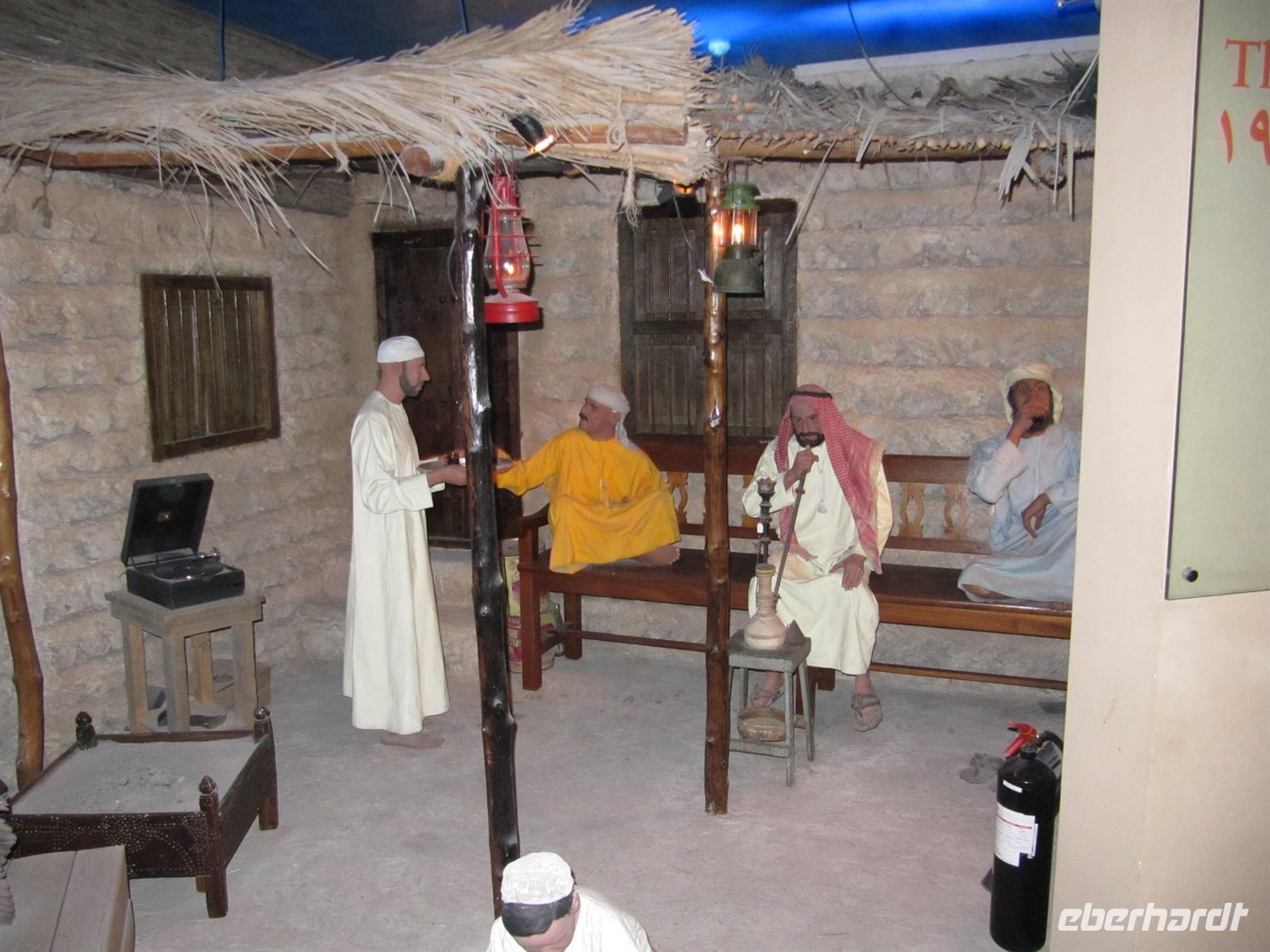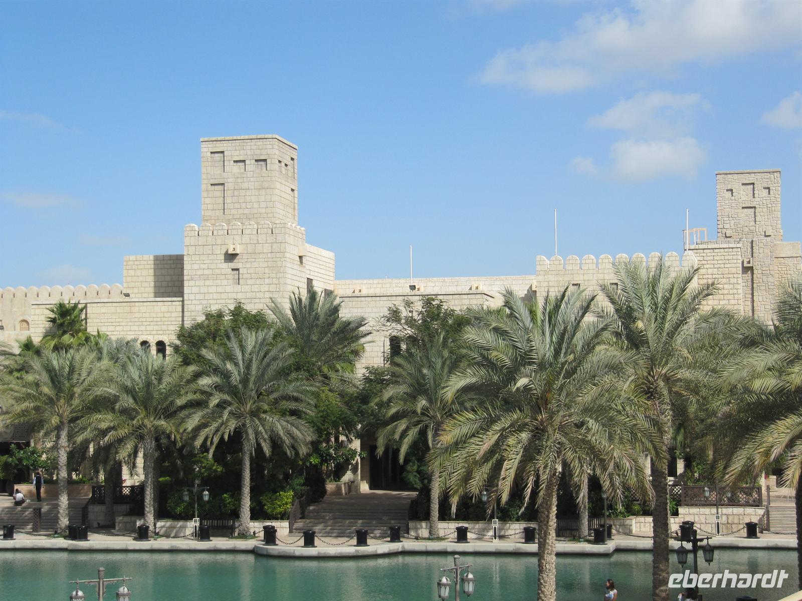 uns vorzügliches Büffet, welches keine Wünsche offen ließ. Natürlich spazierten wir durch die großzügige Lobby des Hotels und fuhren mit dem gläsernen Fahrstuhl in die 27. Etage. Leider konnten wir ganz oben nicht ins Restaurant oder in die Bar. Dennoch war die Aussicht atemberaubend. Das Hotel ist mit viel Gold verziert und in der Lobby gibt es einen Wasserfall und Wasserspiele. Viel zu schnell verging die Zeit und wir bummelten über die Brücke zurück zum Bus. Nun statteten wir dem Madinat Souk noch einen Besuch ab. Dieser im alten Stil erbaute Souk ist wunderschön. Die verschiedensten Waren werden angeboten und hübsche Restaurants am Wasser laden zum Verweilen ein. Am Nachmittag kehrten wir zum Hotel zurück. Wir besuchten das Dubai Museum, welches sich genau gegenüber von unserem Hotel befand. Hier ist sehr eindrucksvoll die Geschichte von Dubai seit Beginn der Ölfunde dargestellt. Vom kleinen Beduinendorf hat sich die Stadt innerhalb von nur 50 Jahren zur Weltmetropole der Superlative entwickelt.