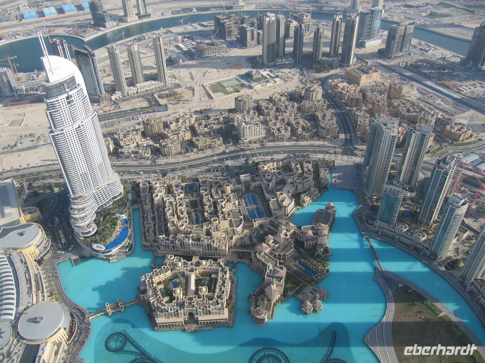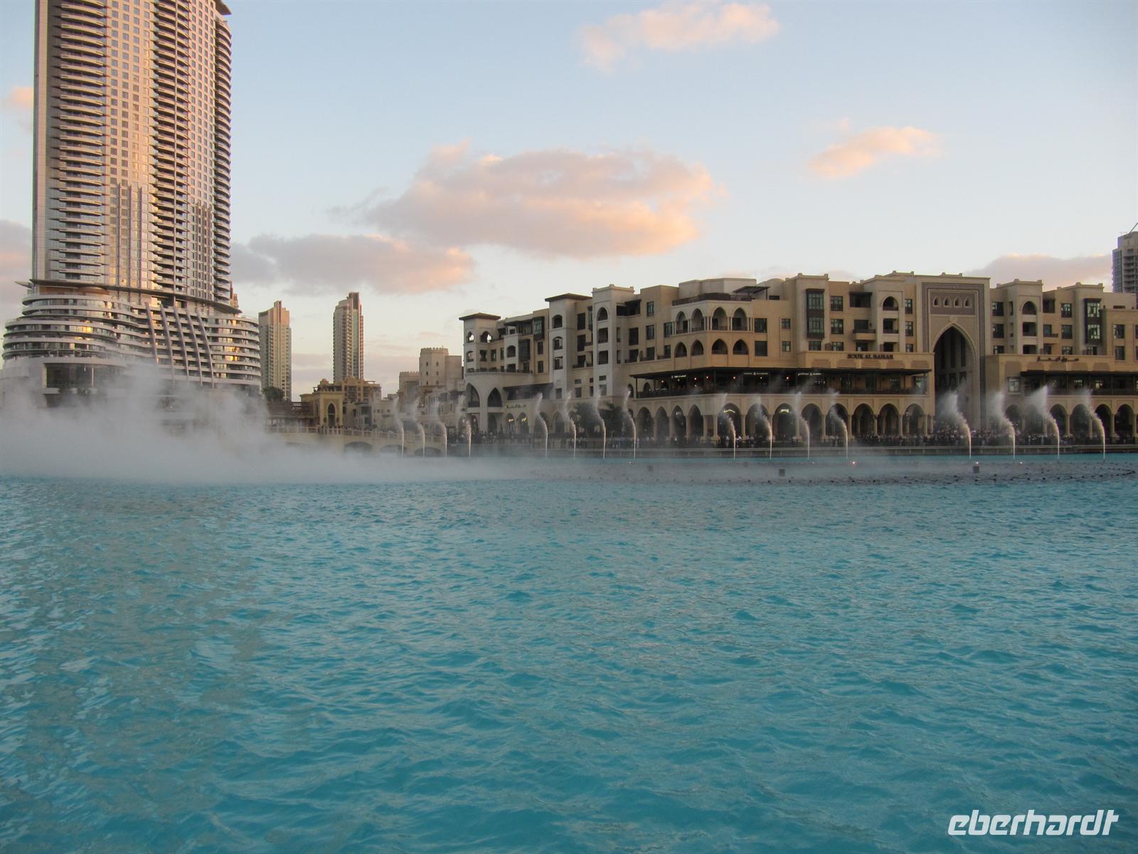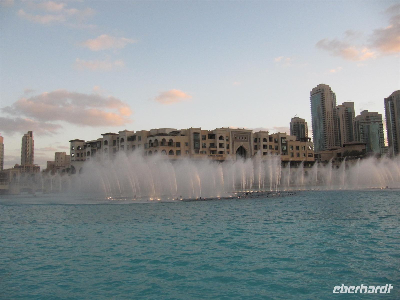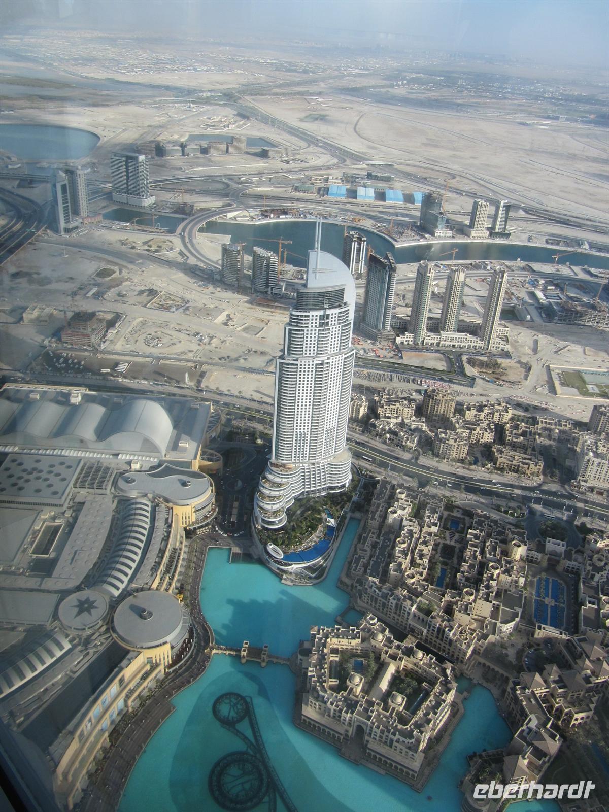 Gebäude der Welt, den Burj Kalifa. Dieses Gebäude ist 828 Meter hoch. Innerhalb von nur einer Minute brachte uns der Lift in das 124. Stockwerk in 452 Metern Höhe. Hier eröffnete sich uns ein einmaliger Blick über Dubai und weit in die Wüste. Von dieser Höhe ist uns erst so richtig bewusst geworden, wie Dubai in nur 50 Jahren entstanden ist. Eigentlich aus dem Nichts mitten in der Wüste. Wir waren alle überwältigt von diesen Eindrücken. Der Lift brachte uns wieder sicher auf den Boden. Nun schautemn wir uns die Wasserspiele vor dem Burj Kalifa an. Leider wurden diese aber im wahrsten Sinne des Wortes etwas vom Winde verweht. Mit vielen neuen Eindrücken kehrten wir zum Hotel zurück. Ein erlebnisreicher Tag ging mit dem Abendessen zu Ende.