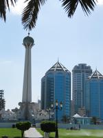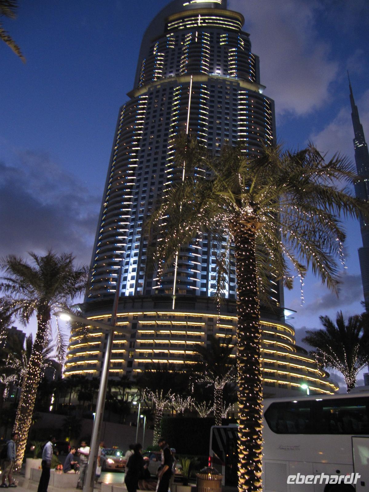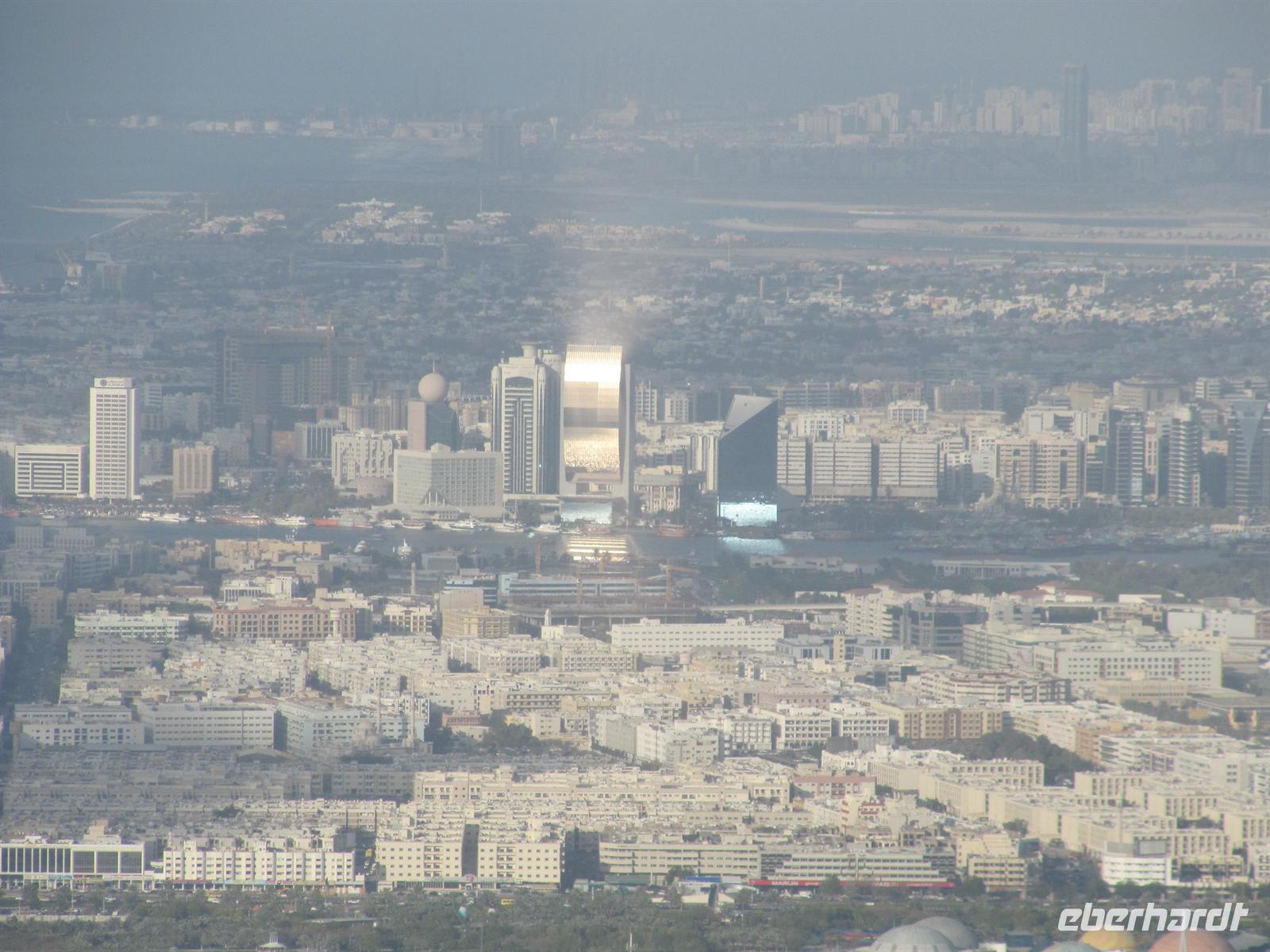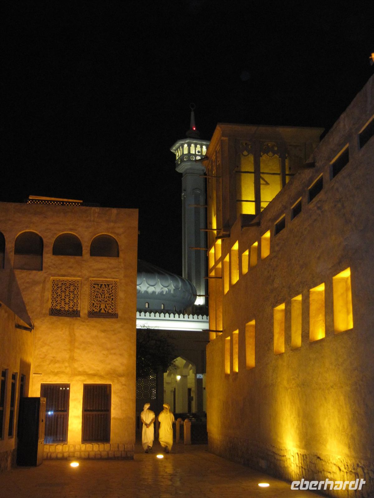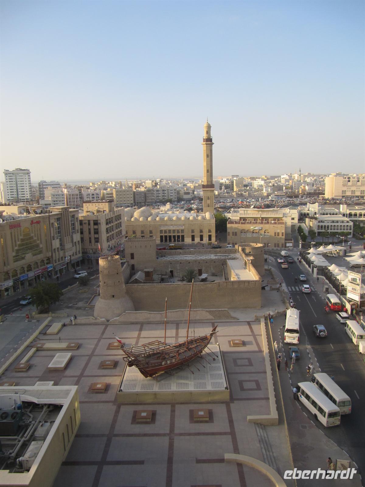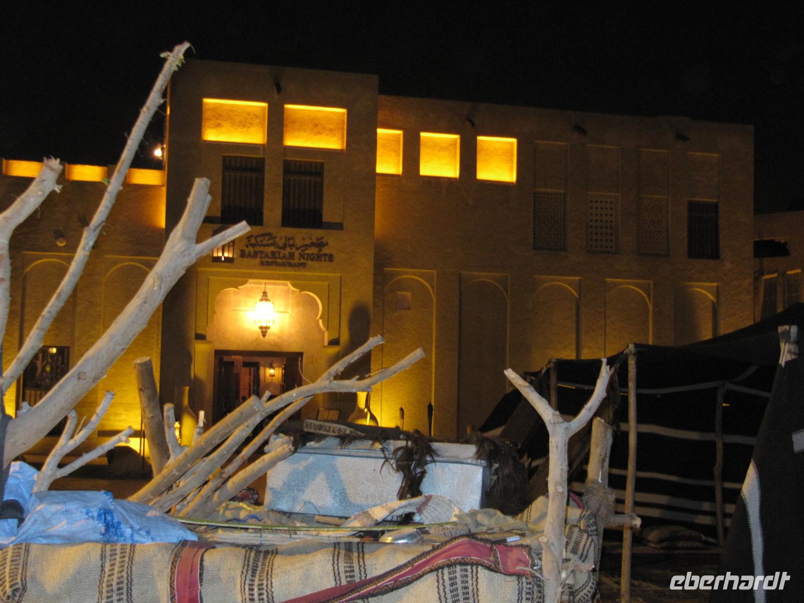 Imbiss. Nun waren wir aber alle recht müde. Wir kehrten zum Hotel zurück und bezogen unsere Zimmer. Jeder ruhte sich erstmal aus. Schließlich waren wir nun schon recht lange unterwegs und die vielen Eindrücke mussten wir erstmal verarbeiten. Allerdings wurde die Nachmittagsruhe etwas „gestört“- genau gegenüber von unserem Hotel befand sich eine Moschee und der laute Ruf des Muhezin zu den Gebetszeiten drang sogar durch die Schallschutzfenster. Auch das gehört zu Dubai. Am Abend trafen wir uns wieder und fuhren mit dem Bus zum Creek. In den Twin Towers erwartete uns in einem Restaurant ein sehr gutes arabisches Buffet zum Abendessen. Wir genossen die arabischen Köstlichkeiten und von der Terrasse aus den Blick auf die abendlich beleuchtete Stadt. Gestärkt aber auch müde kehrten wir zum Hotel zurück.