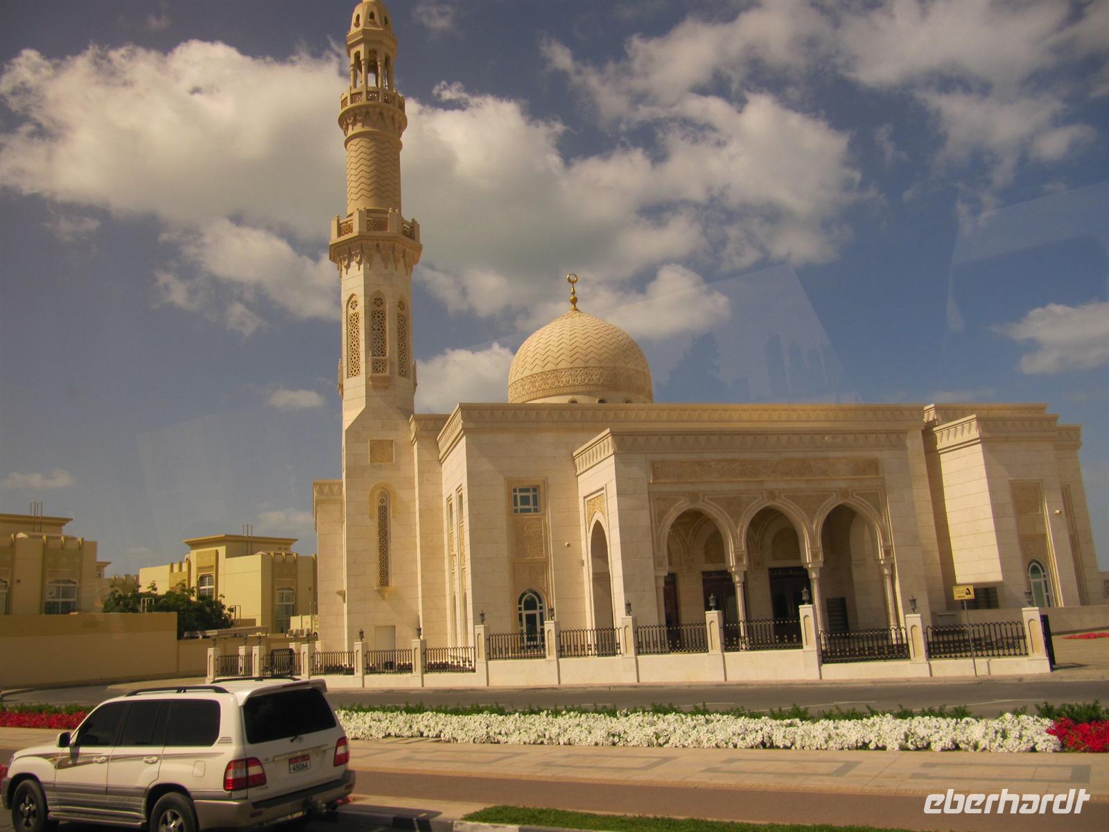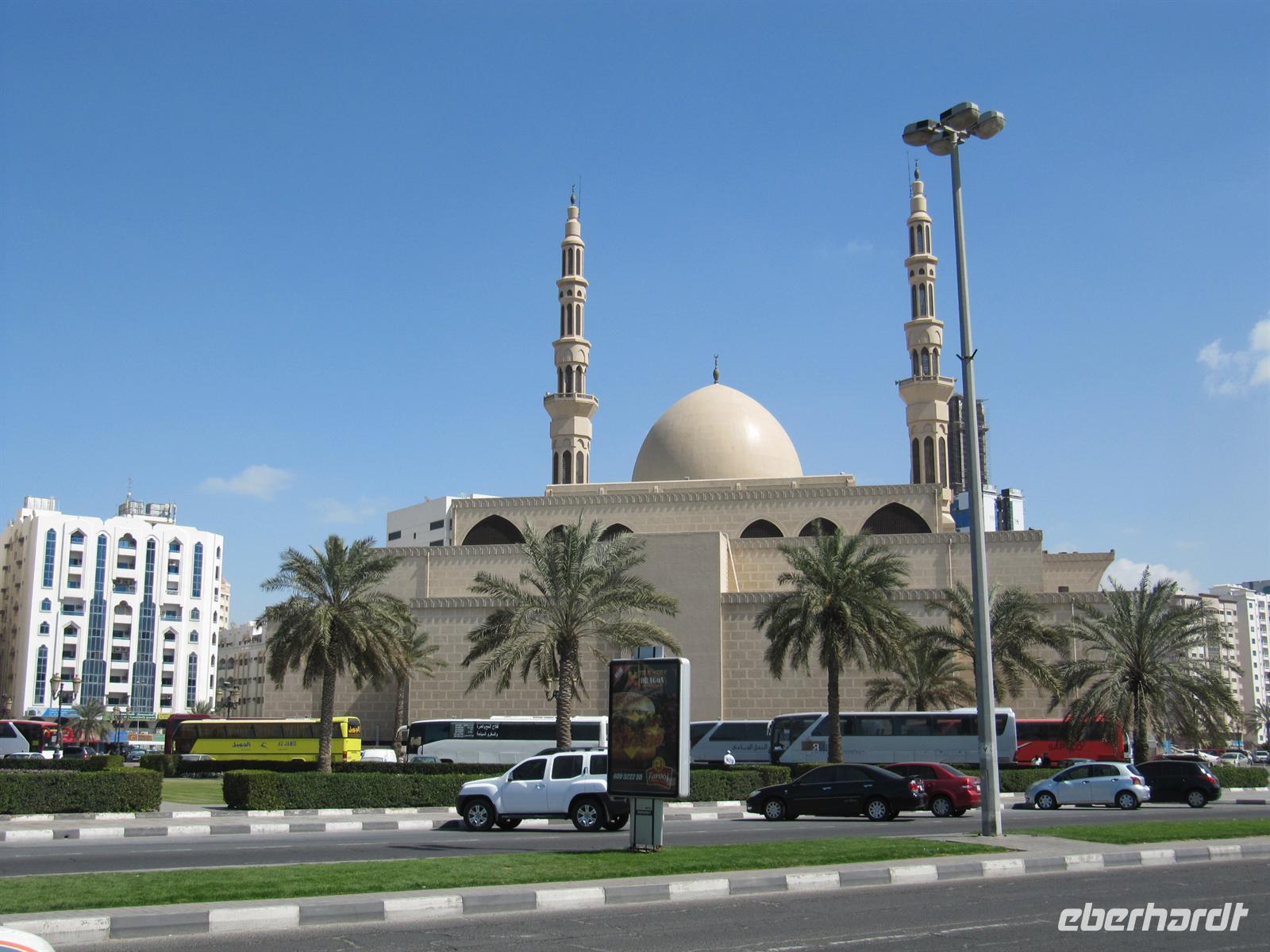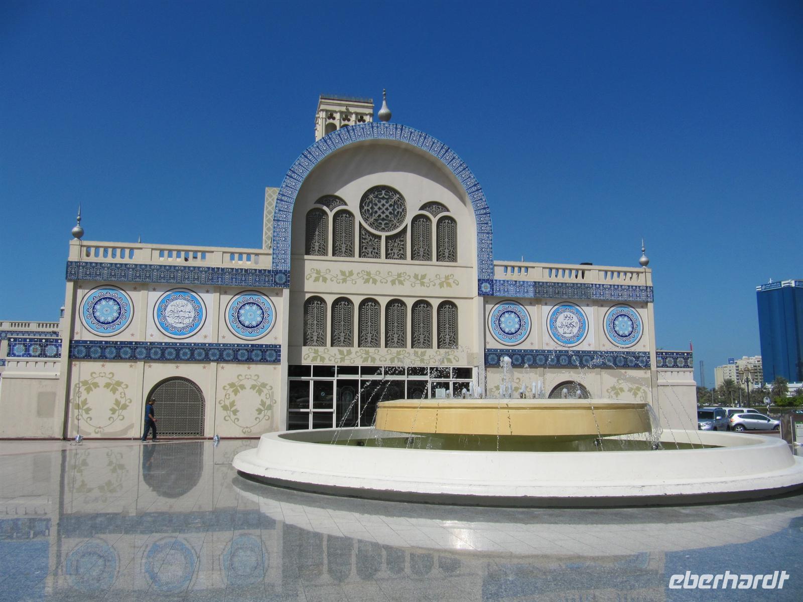 Heute stand zunächst der Besuch des Nachbaremirates Sharjah auf unserem Programm. Martina hatte einen Behördentermin und so kam Dr. Normen Ali für diesen Ausflug als Reiseleiter. Er brachte uns auf ganz eigene Art seinen Stolz auf seine Heimat mit vielen interessanten Informationen näher. Wir fuhren zunächst durch das Universitätsviertel, welches mit seinen weitläufigen Grünanlagen und weißen Universitätsgebäuden einem großen Garten gleicht. Dann fuhren wir zur King Faisahl Moschee und bummelten durch den alten Souk. Er ist der älteste Souk der Emirate. Anschließend spazierten wir über den Fischmarkt. Hier entdeckten wir so manch exotische Fische und Schalentiere, die wir nur aus Speisekarten guter Restaurants oder als