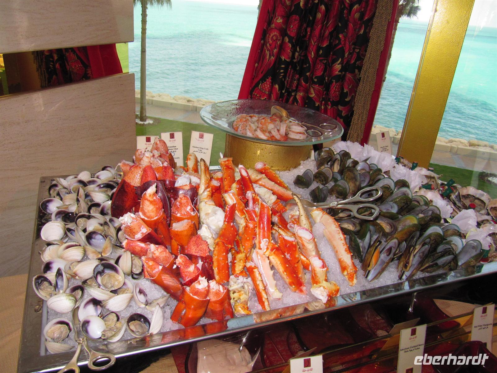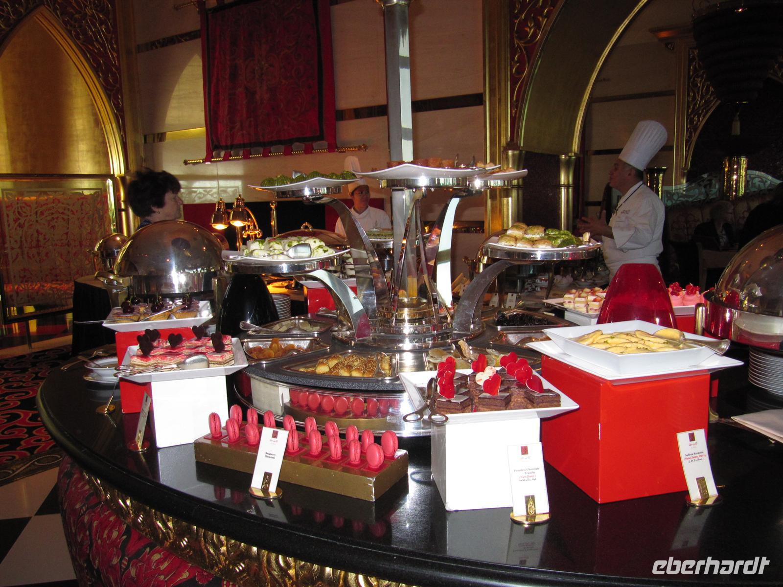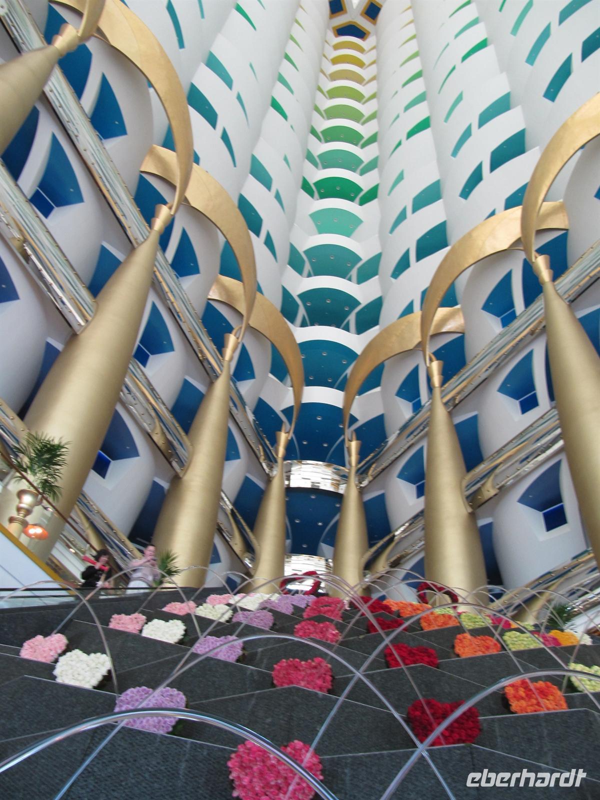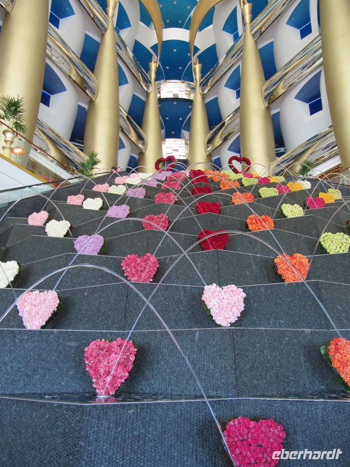 Den heutigen Tag konnten alle nach ihren Wünschen gestalten. Die meisten Gäste begleiteten mich auf einem zusätzlichen Ausflug in das Hotel Burj al Arab. In diesem weltberühmten Hotel und Wahrzeichen von Dubai nahmen wir ein sehr gutes Mittagessen ein. Es war Valentinstag und das Hotel ist entsprechend schön mit Herzen aus Rosen geschmückt. Im Restaurant Iwan erwartete