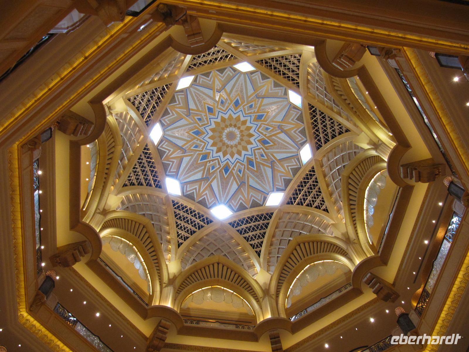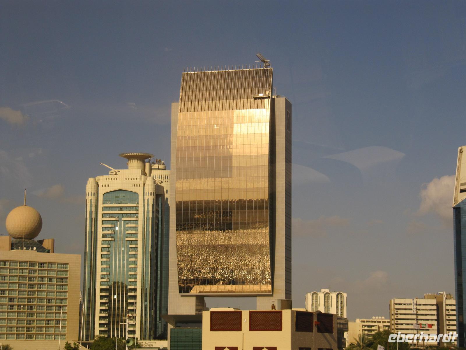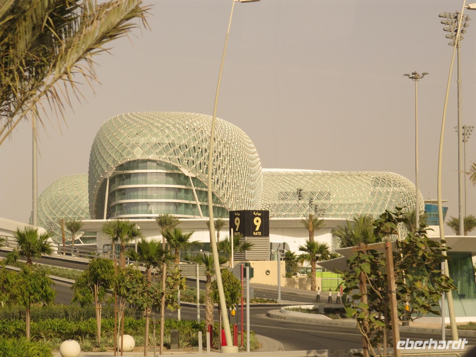 Wir sahen die Skyline der Stadt und die Marina-Mall. Nun erreichten wir das prachtvolle Emirates Palace Hotel. Wir sahen uns die Ausstellung über die neuen Bauprojekte auf der Insel vor Abu Dhabi an. Dort sollen mehrere Museen mit sehr moderner Architektur entstehen. Nun flanierten wir durch die prunkvolle Lobby des Hotels. Für uns war eine Teestunde im Café reserviert. In sehr gediegener Atmosphäre wurden uns Kleine Süßigkeiten und Sandwiches gereicht. Eine der Törtchen waren sogar mit Gold verziert.Wir genossen diese Stunde. Anschließend fuhren wir über die Insel Yasi Island und sahen die Formel 1 Rennstrecke. Nachdem wir alle Fotos geschossen hatten, kehrten wir nach Dubai zurück.