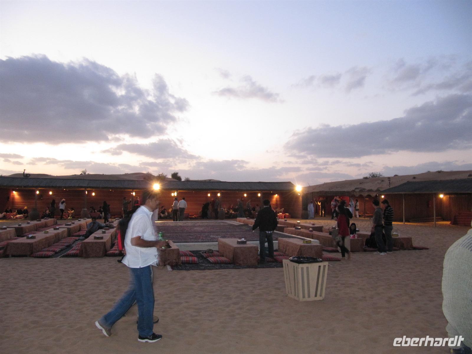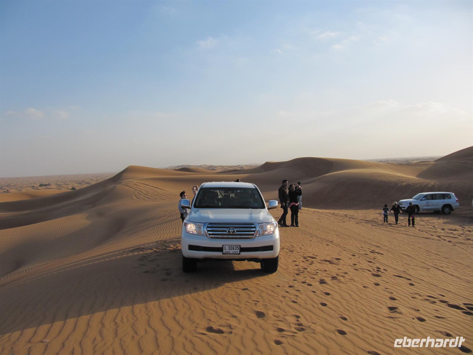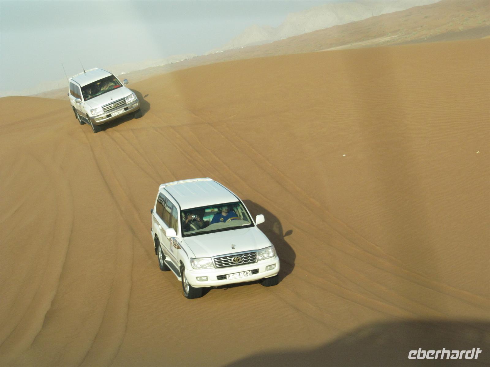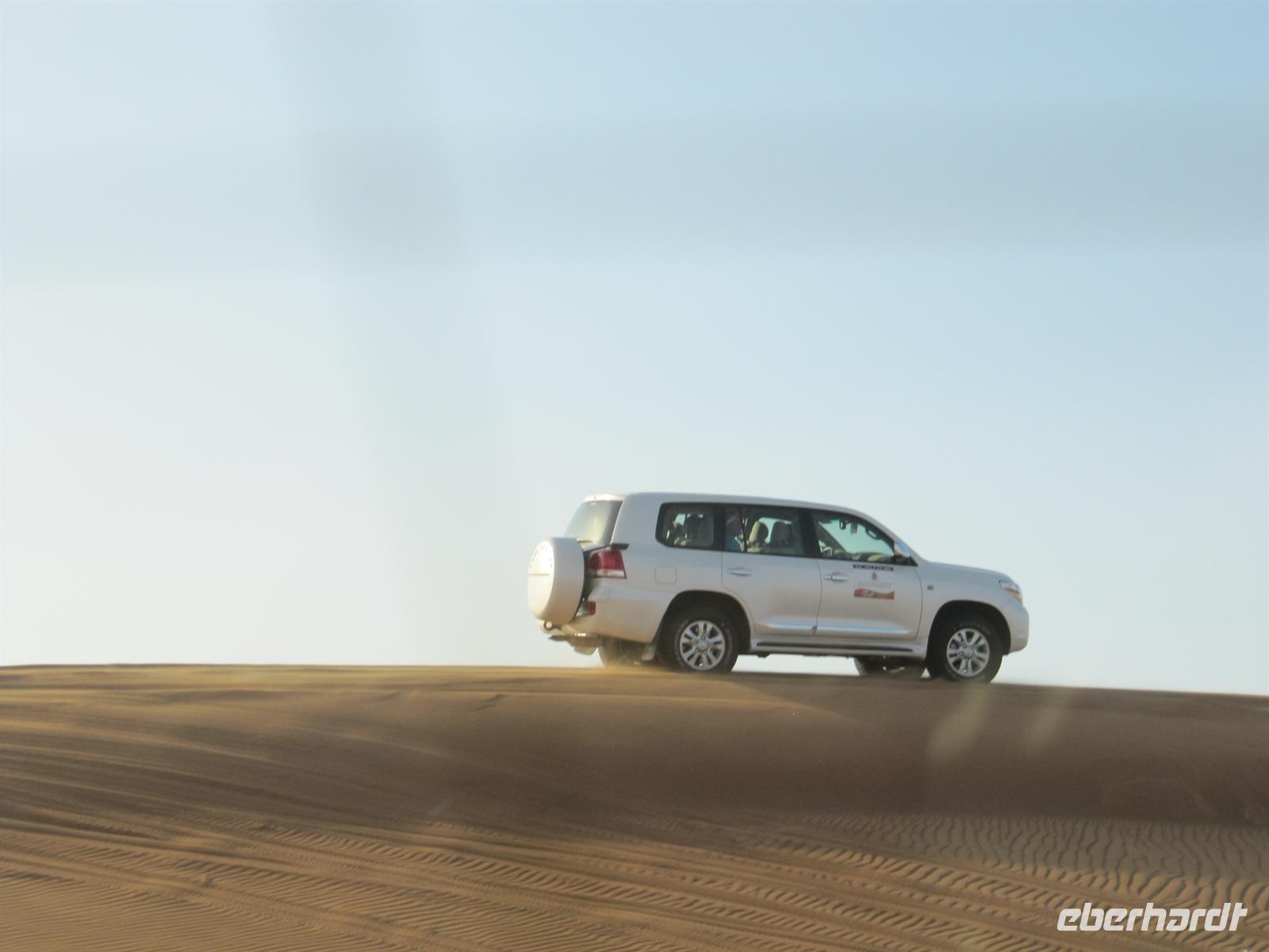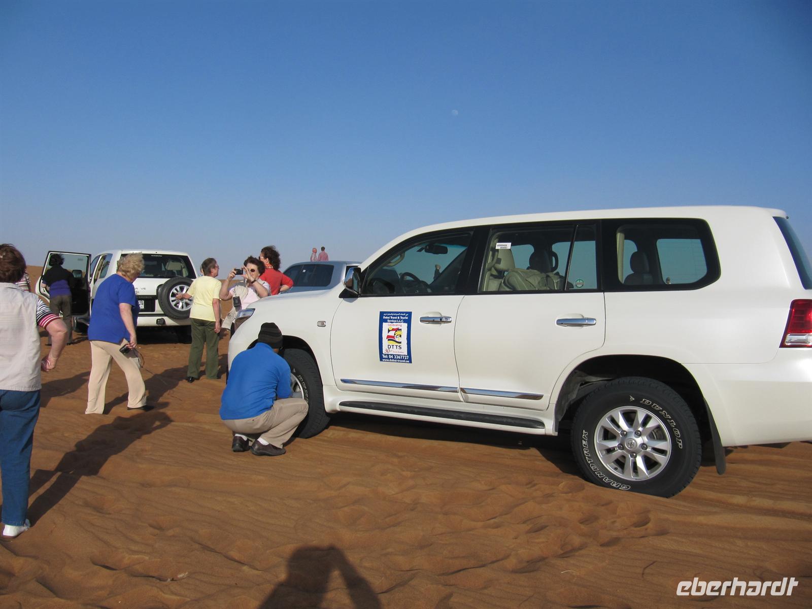 Tiefkühlware kennten. Auf dem Obst- und Gemüsemarkt kosteten wir Datteln und sahen viele herrliche frische Früchte und entdeckten manch Unbekanntes wie Palmensamen. Nun legten wir noch einen Fotostopp am Blauen Souk ein, bevor wir nach Dubai zum Hotel zurückkehrten. Nachdem wir uns beim Mittagessen gestärkt hatten, erwartete uns das Abenteuer Wüste. Mit Jeeps wurden wir abgeholt und es ging Richtung Osten zunächst auf der Straße in die Wüste. Nachdem die Fahrer einen Teil der Luft aus den Reifen gelassen hatten, fuhren wir in die Sanddünen. Achterbahngleich fuhren wir mit den Jeeps über die Dünen. Eine Fahrt, die sehr faszinierend war und uns auch bisschen durchschüttelte. Die Fahrt endete im Wüstencamp, wo uns schmackhaftes Abendessen und verschiedene typische arabische Traditionen erfreuten. Wir ließen uns von der Buchtänzerin verzaubern, probierten traditionelle Gewänder, wie die Dischda, ließen uns von einer Künstlerin mit Hennamalerei schmücken und sahen einem Falken in die Augen. Nach einem erlebnisreichen Aufenthalt kehrten wir zum Hotel zurück.
