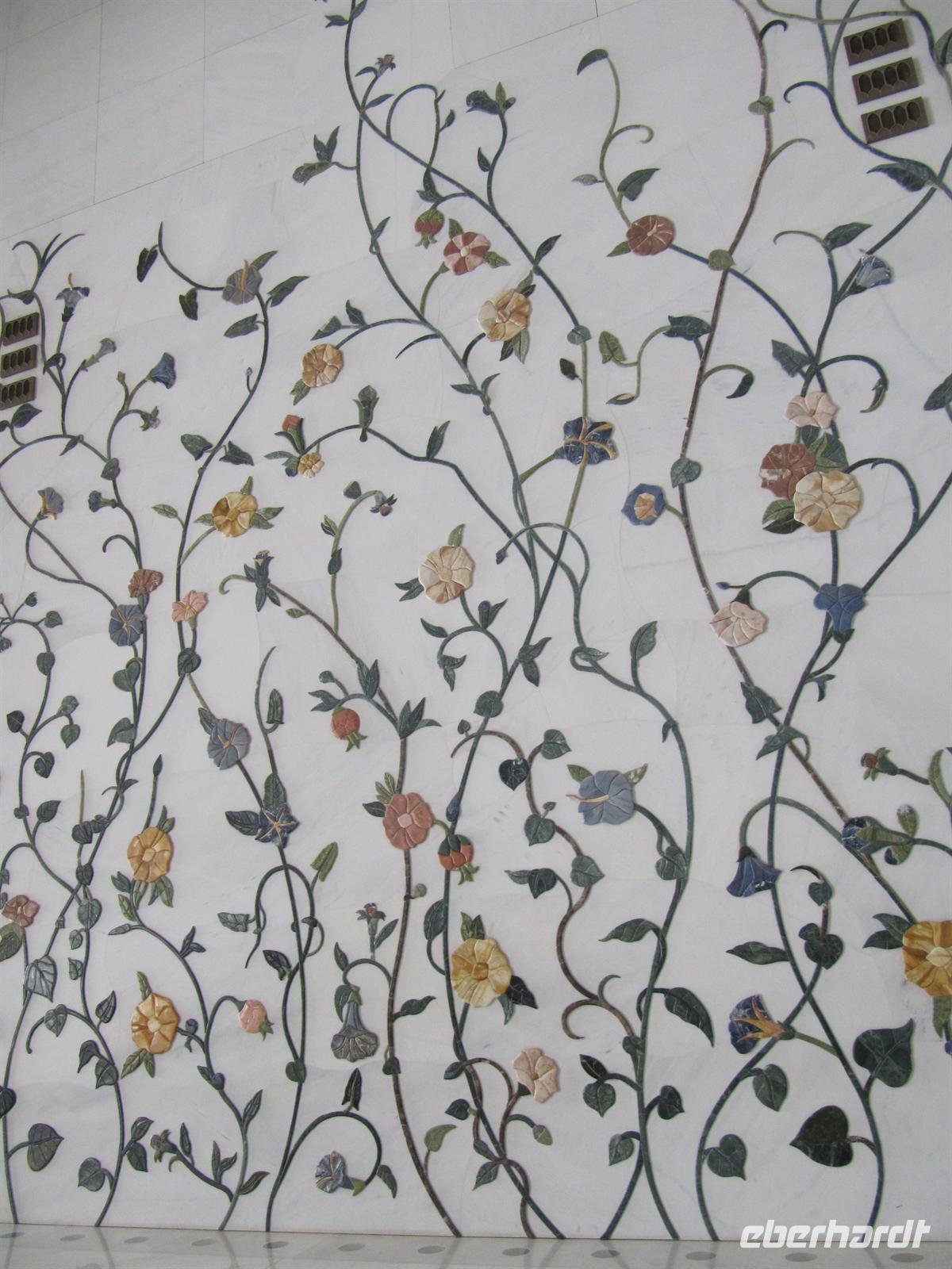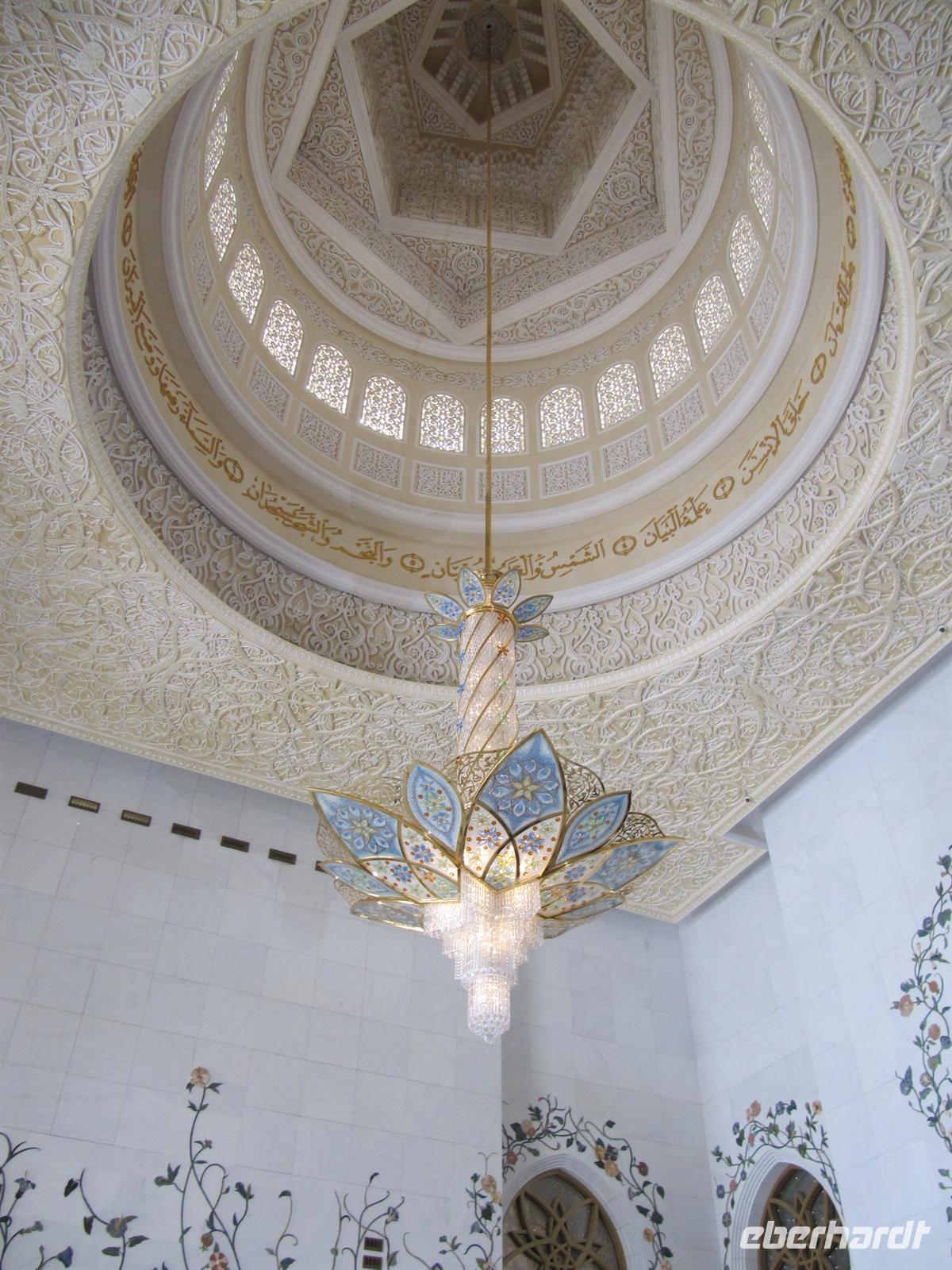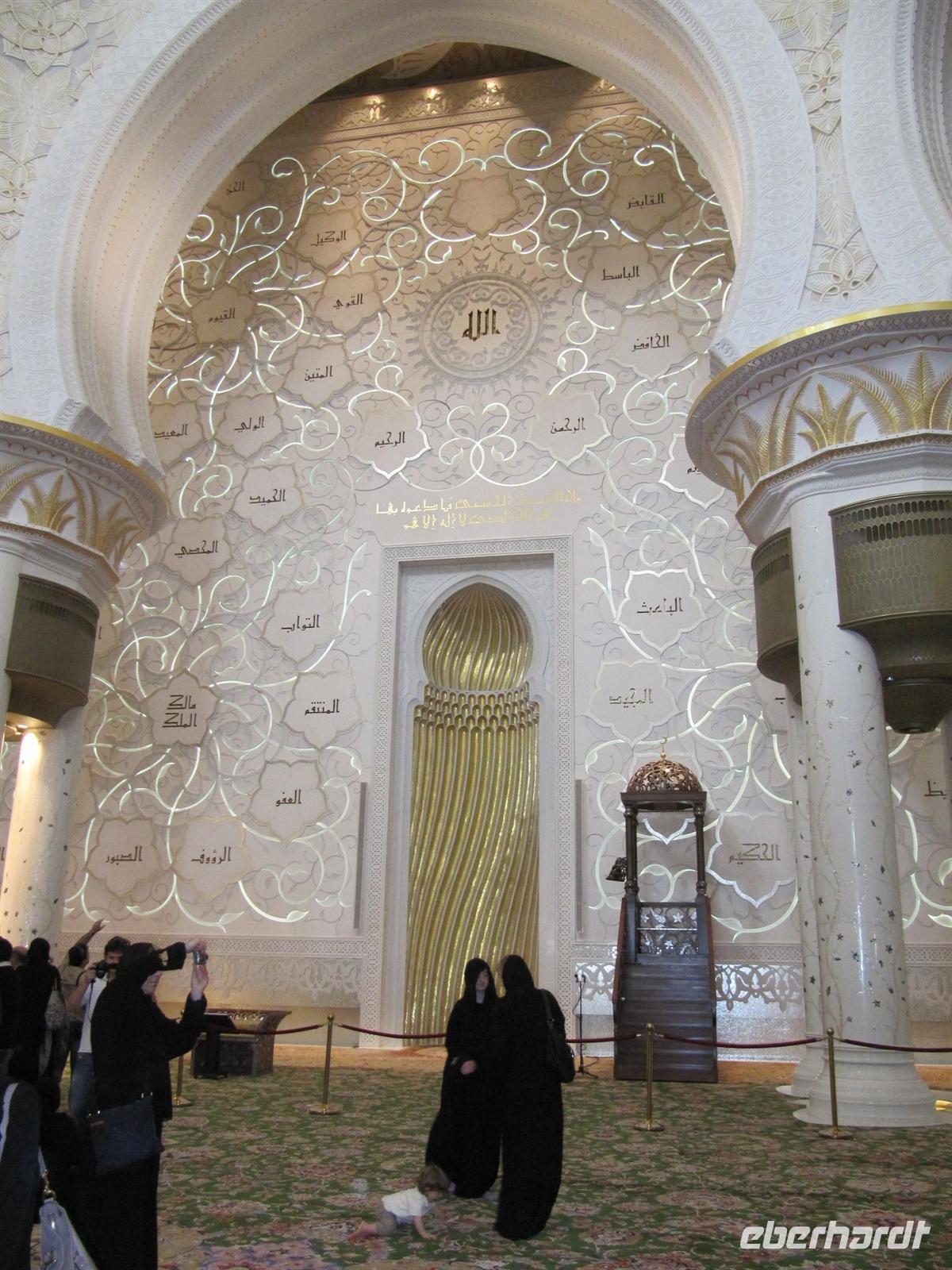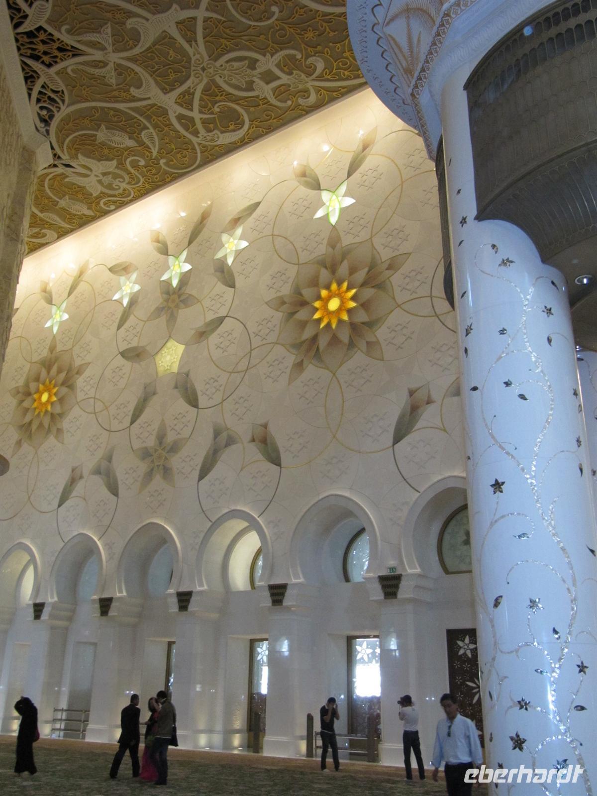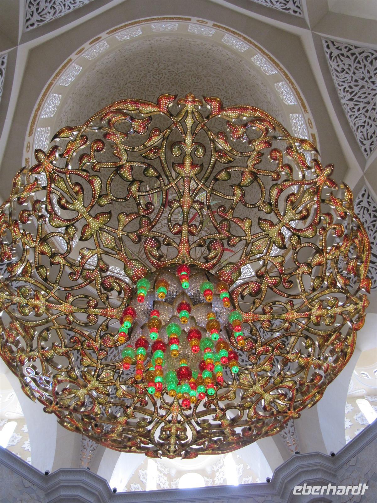 Abaja, dem traditionellen schwarzem Gewand der muslimischen Frauen und einem schwarzen Kopftuch einkleiden. Nur so durften wir die drittgrößte Moschee der Welt betreten. Der prunkvolle Bau aus schneeweißem Marmor wurde erst zu Beginn des 21. Jahrhunderts erbaut und bietet 40.000 Menschen Platz. Wir bestaunten den größten Kronleuchter der Welt aus Swarovski-Kristallen mit einem Gewicht von 90 Tonnen. Ehrfurchtsvoll schritten wir über den größten jemals per Hand geknüpften Teppich der Welt. 1.200 Teppichknüpferinnen haben daran gearbeitet. Die prachtvolle Architektur und Gestaltung der Moschee haben uns tief beeindruckt. Anschließend fuhren wir durch die Hauptstadt der Emirate.